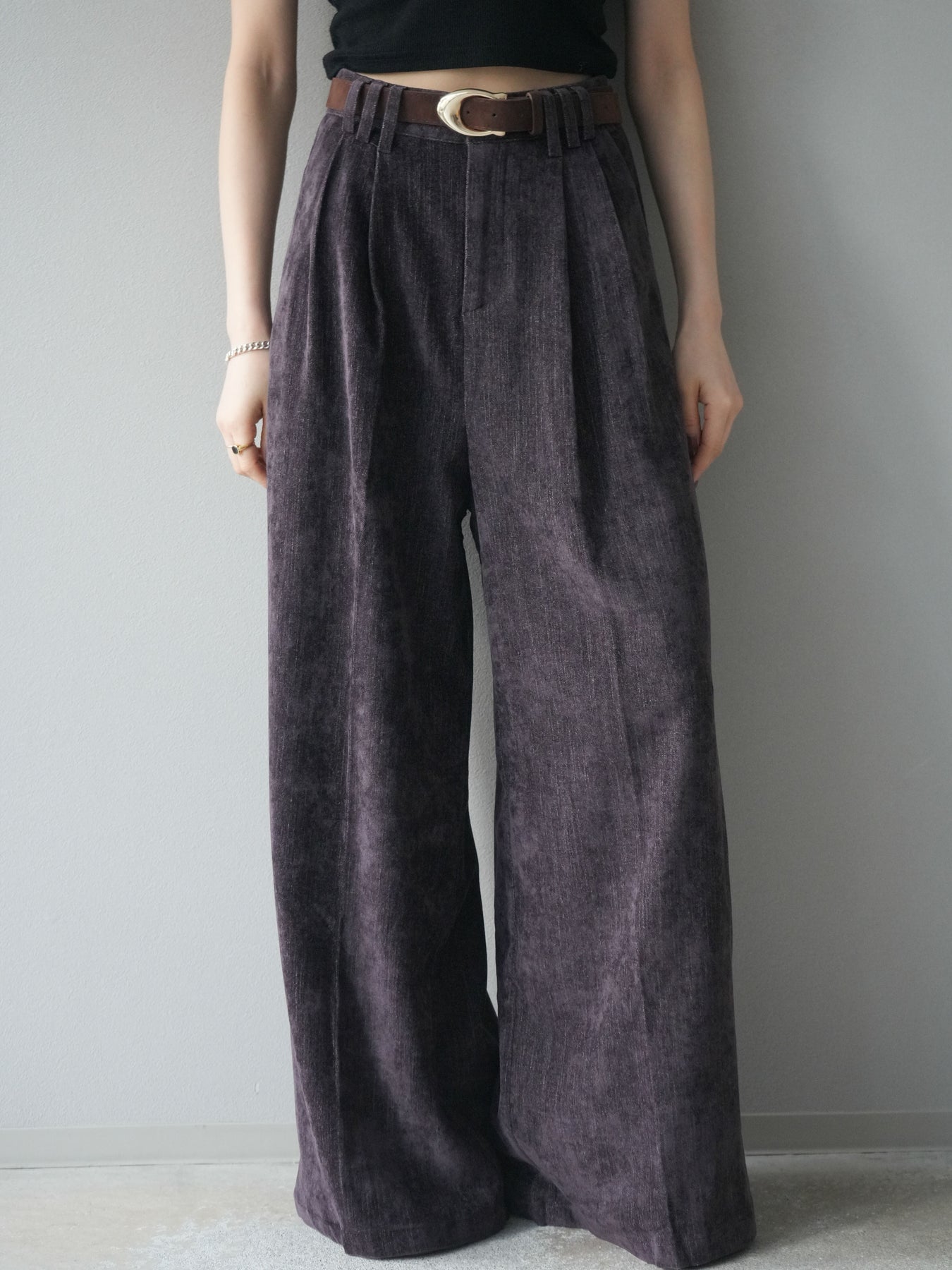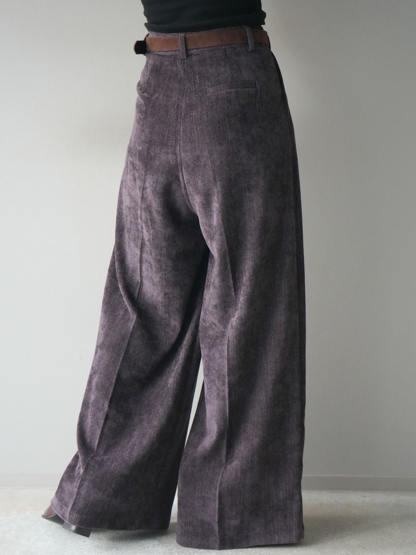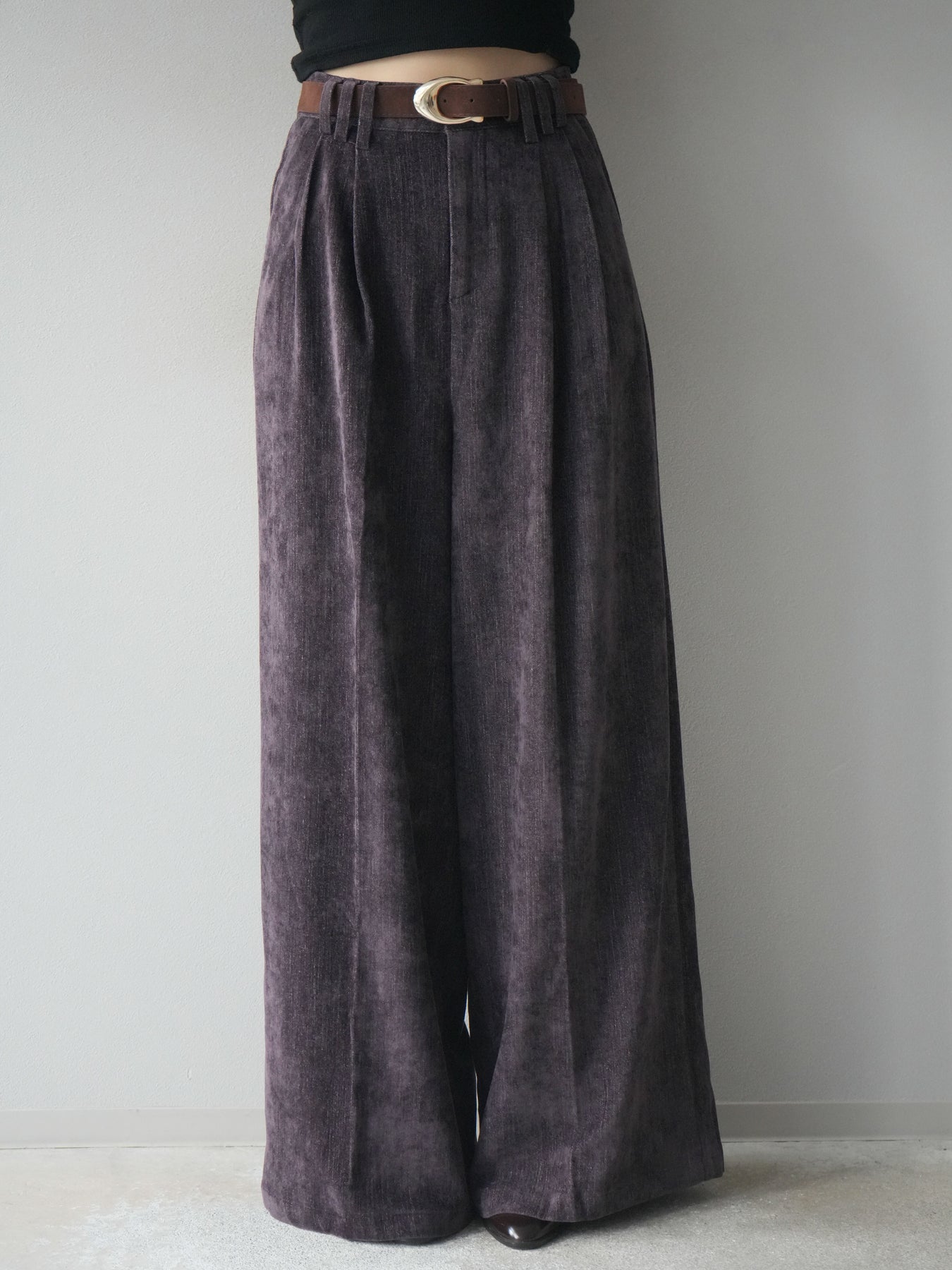 "上品な光沢感が魅力のベルベット素材を使用したワイドパンツ。しなやかで滑らかな質感が美しいドレープを生み、動くたびにエレガントな印象を与えます。付属のベルトがウエストラインを引き締め、スタイルアップ効果も抜群。ゆったりとしたシルエットながらも、落ち感のある素材で脚をすっきり見せてくれます。ブラウスやニットなど、合わせるトップス次第でカジュアルにもきれいめにも着こなせる万能な1本です。"