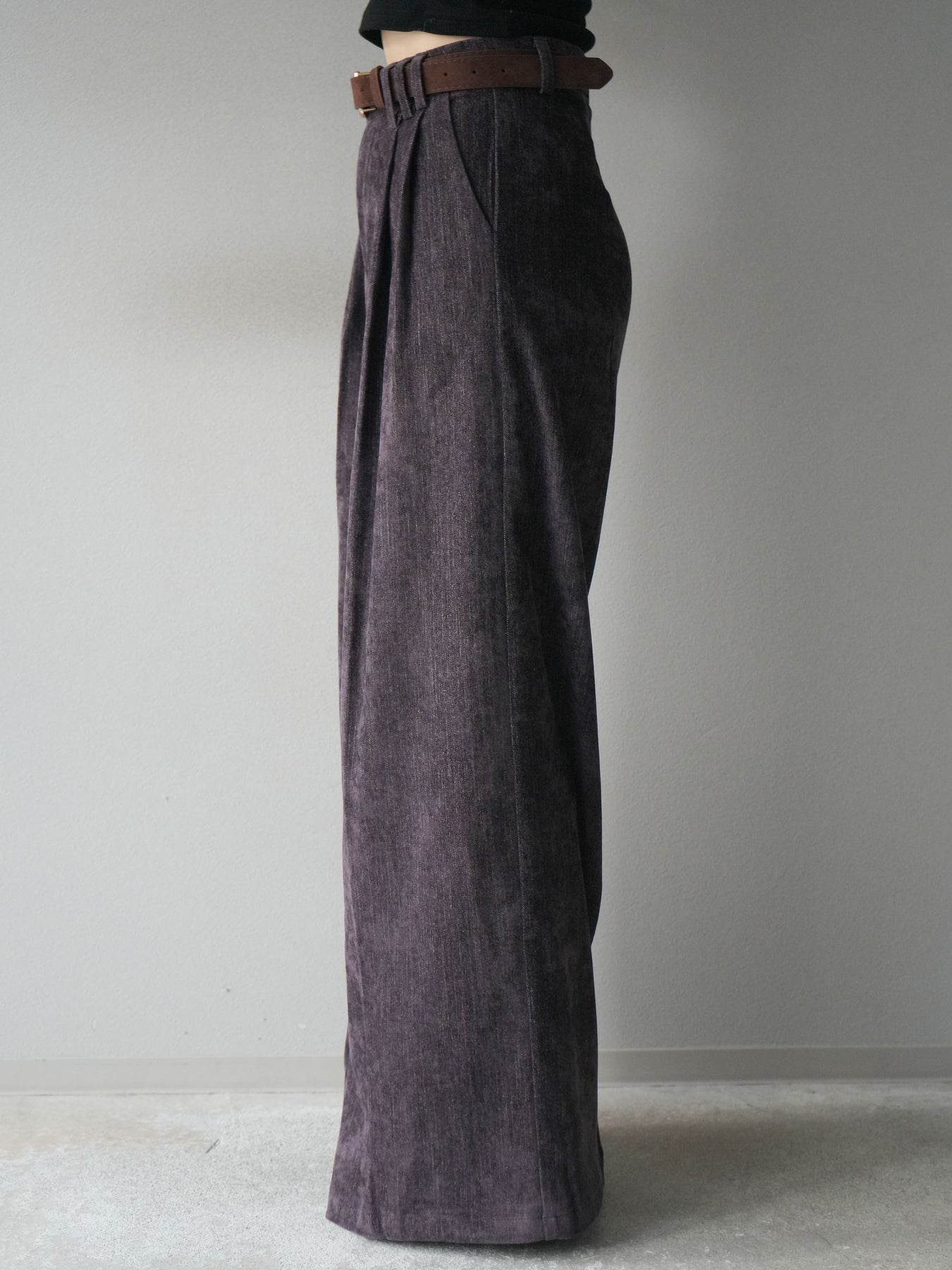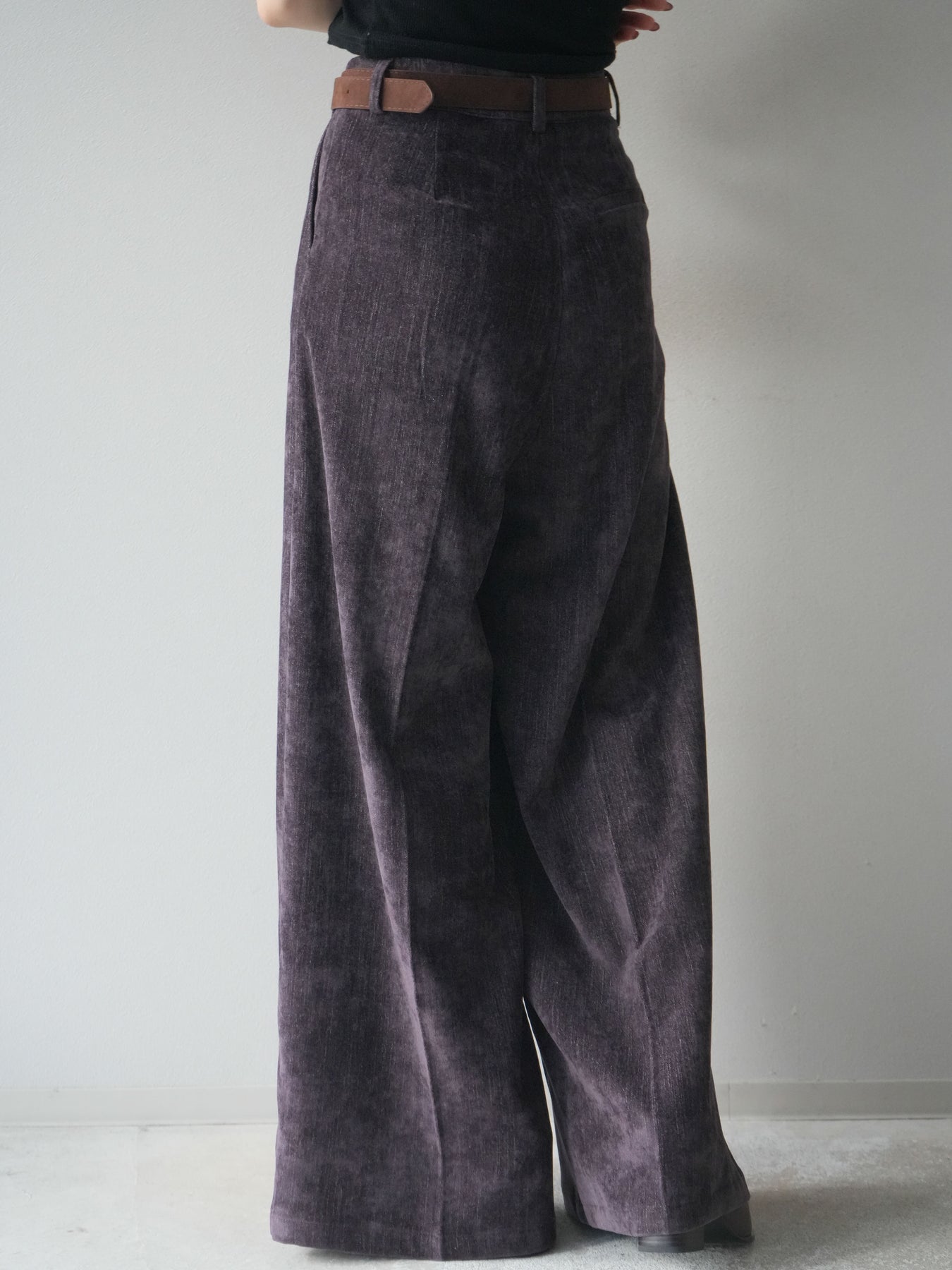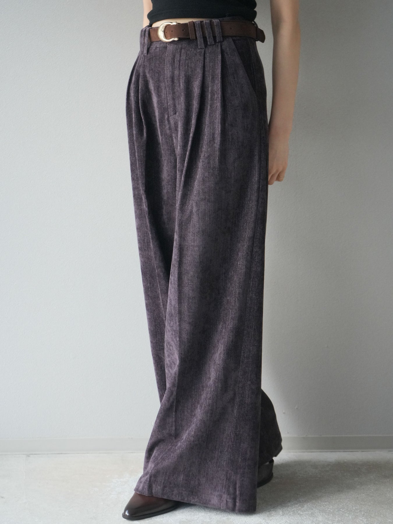 "上品な光沢感が魅力のベルベット素材を使用したワイドパンツ。しなやかで滑らかな質感が美しいドレープを生み、動くたびにエレガントな印象を与えます。付属のベルトがウエストラインを引き締め、スタイルアップ効果も抜群。ゆったりとしたシルエットながらも、落ち感のある素材で脚をすっきり見せてくれます。ブラウスやニットなど、合わせるトップス次第でカジュアルにもきれいめにも着こなせる万能な1本です。"