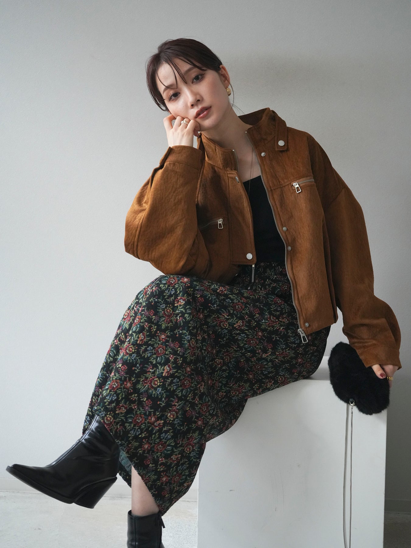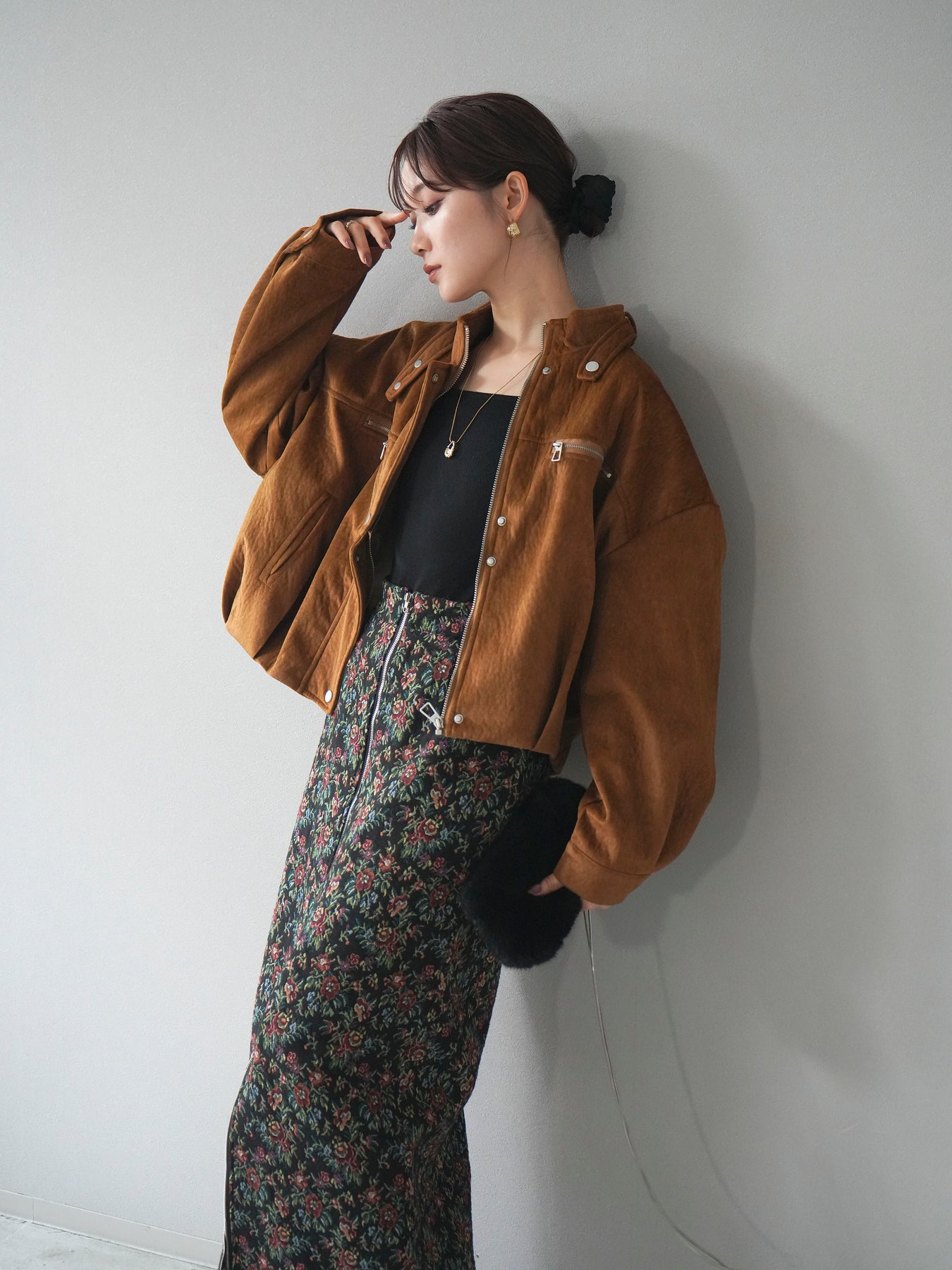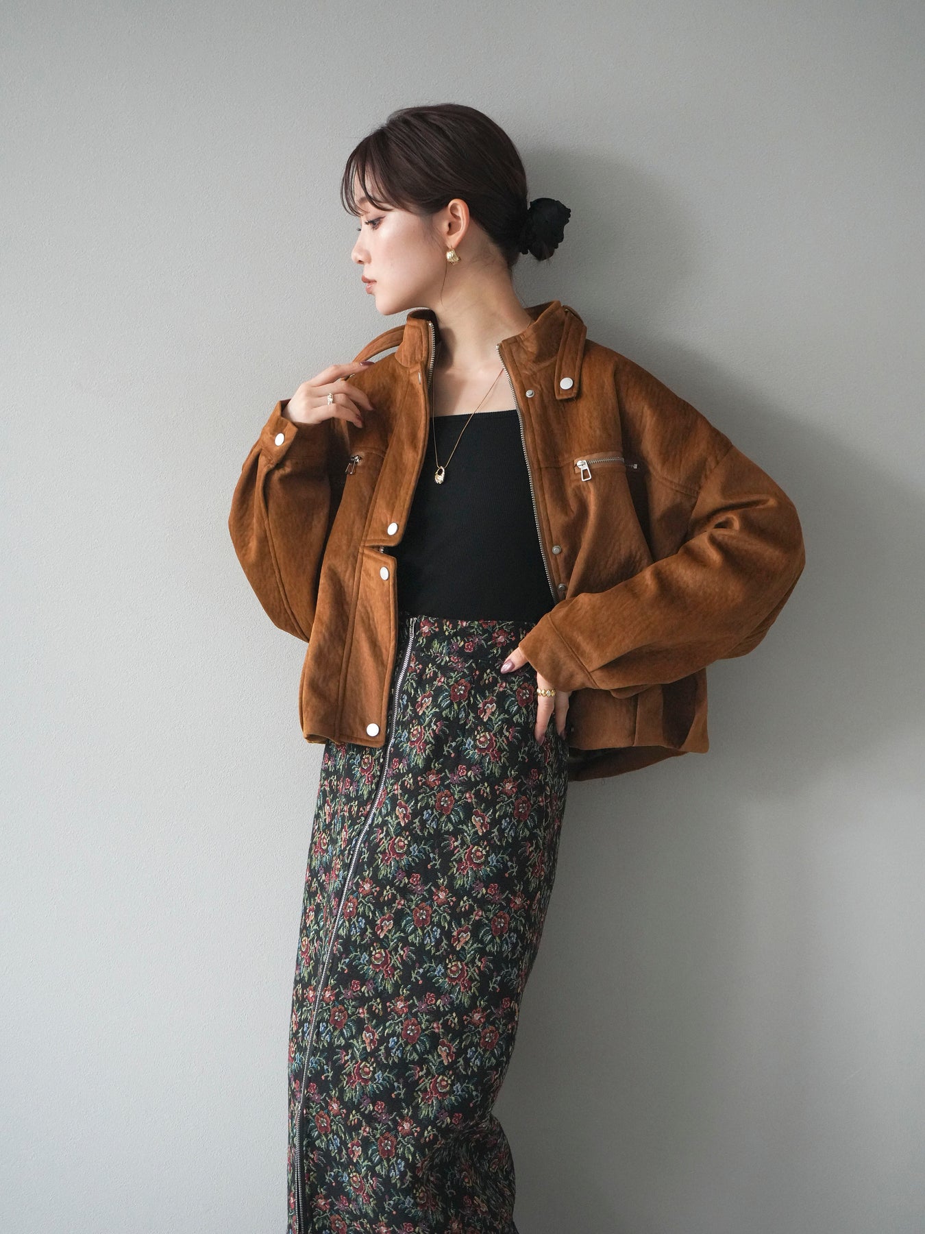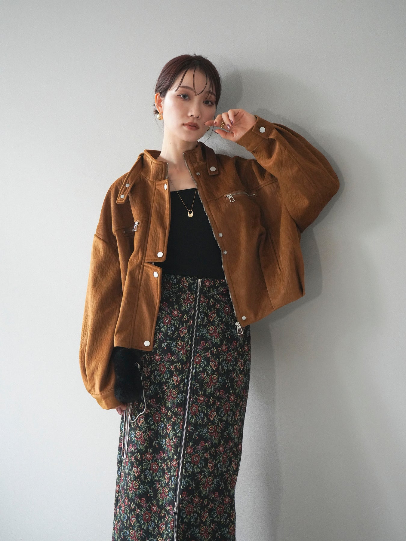 柔らかなスエード調素材を使用した、ジップディテールが印象的なブルゾン。 立ち上がりのあるスタンドカラーとメタルジップが、モードな雰囲気を漂わせます。 ゆったりとしたシルエットで抜け感があり、軽やかな着心地ながらも存在感のある仕上がりに。 フロントの切り替えやジップポケットがデザインアクセントとなり、羽織るだけでスタイリッシュな印象を与えます。 パンツにもスカートにも合わせやすく、季節の変わり目に活躍する万能アウターです。 ※ボトムス、キャミソール(インナー)以外の商品は一律でインナーは付属していません。