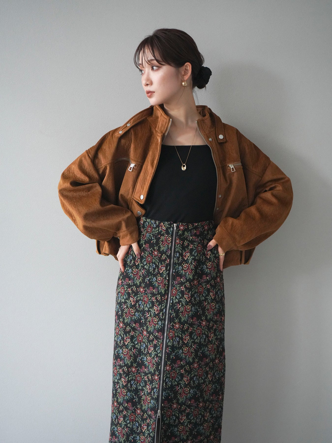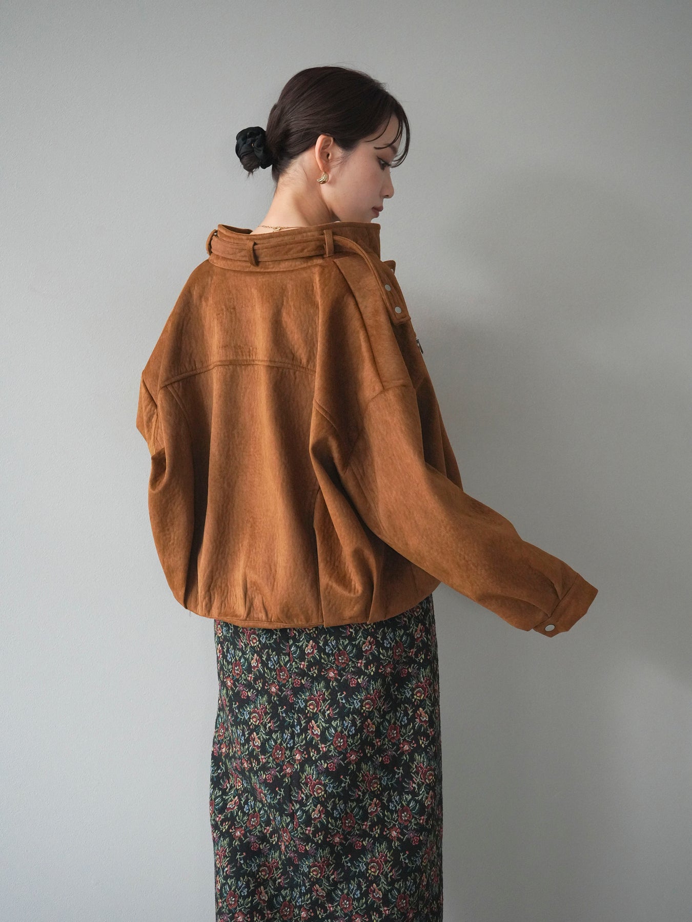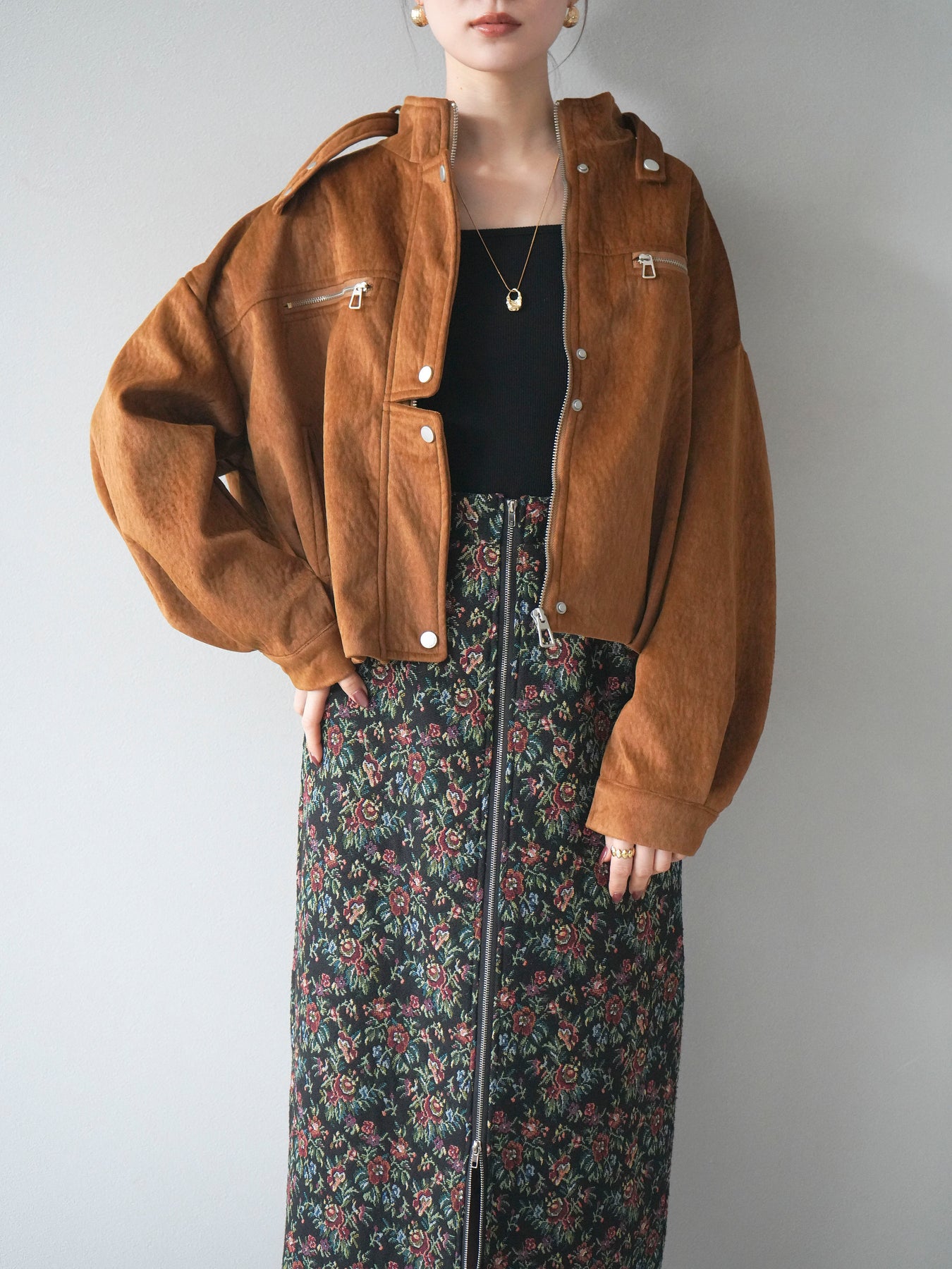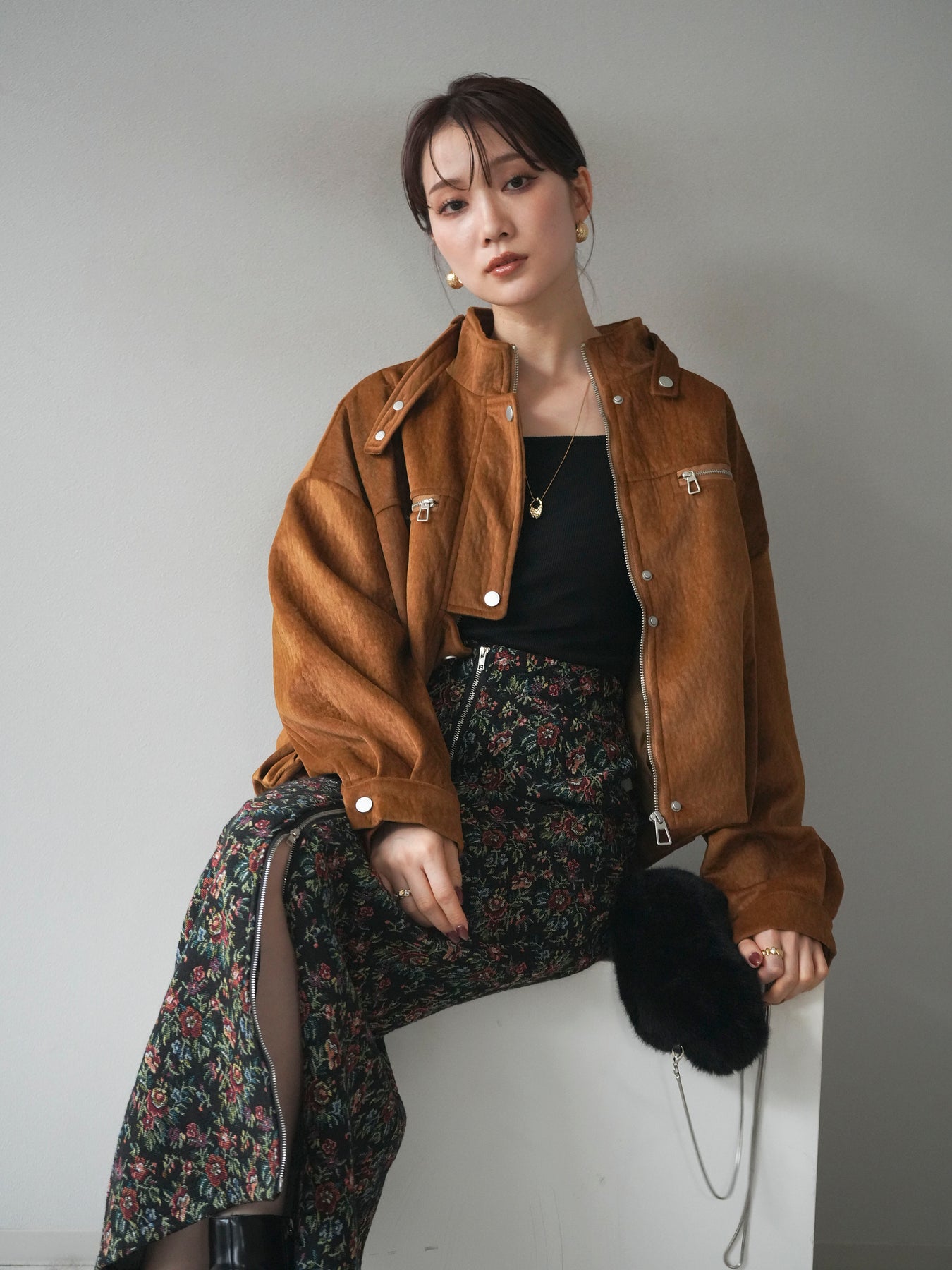 柔らかなスエード調素材を使用した、ジップディテールが印象的なブルゾン。 立ち上がりのあるスタンドカラーとメタルジップが、モードな雰囲気を漂わせます。 ゆったりとしたシルエットで抜け感があり、軽やかな着心地ながらも存在感のある仕上がりに。 フロントの切り替えやジップポケットがデザインアクセントとなり、羽織るだけでスタイリッシュな印象を与えます。 パンツにもスカートにも合わせやすく、季節の変わり目に活躍する万能アウターです。 ※ボトムス、キャミソール(インナー)以外の商品は一律でインナーは付属していません。