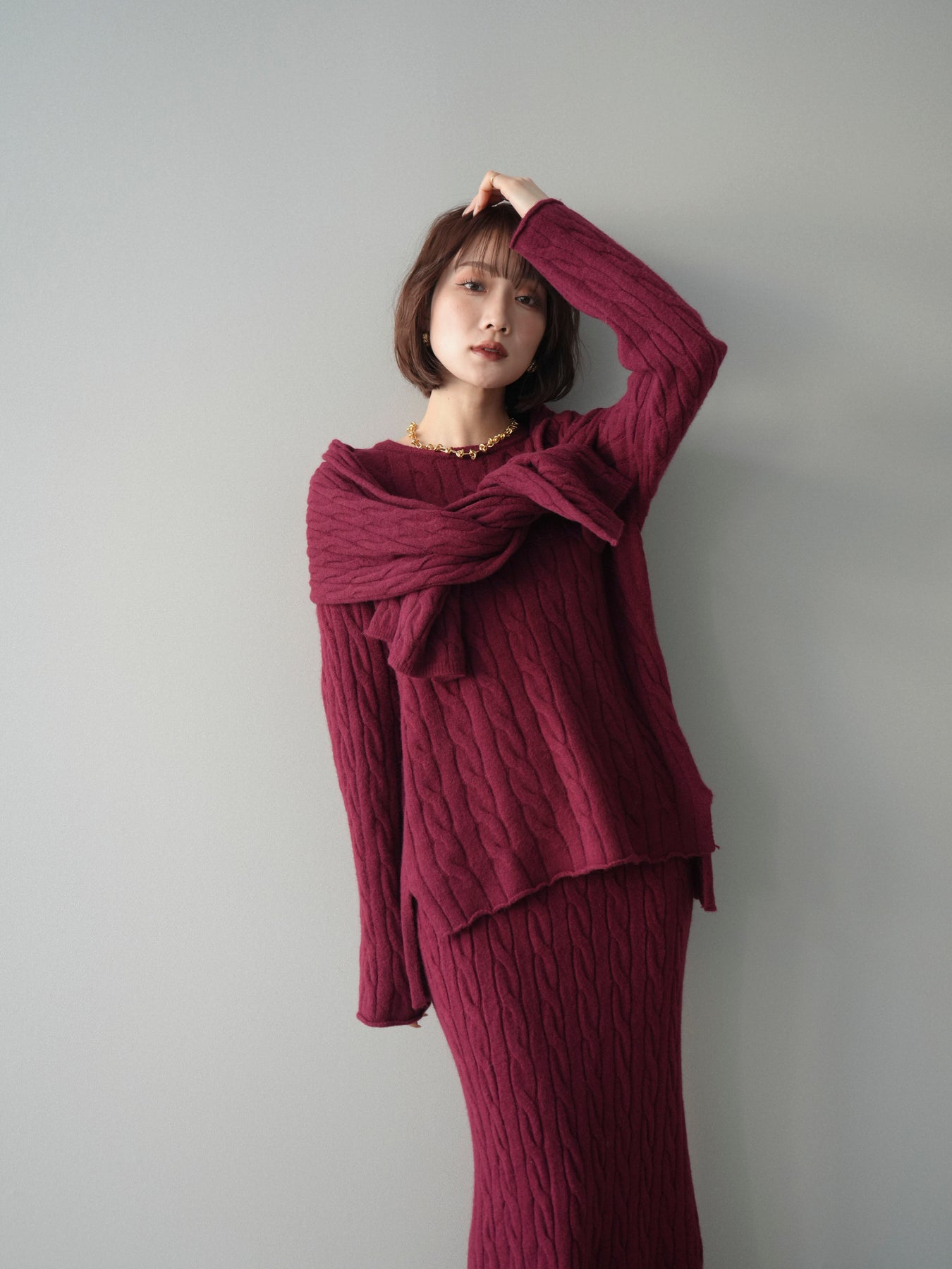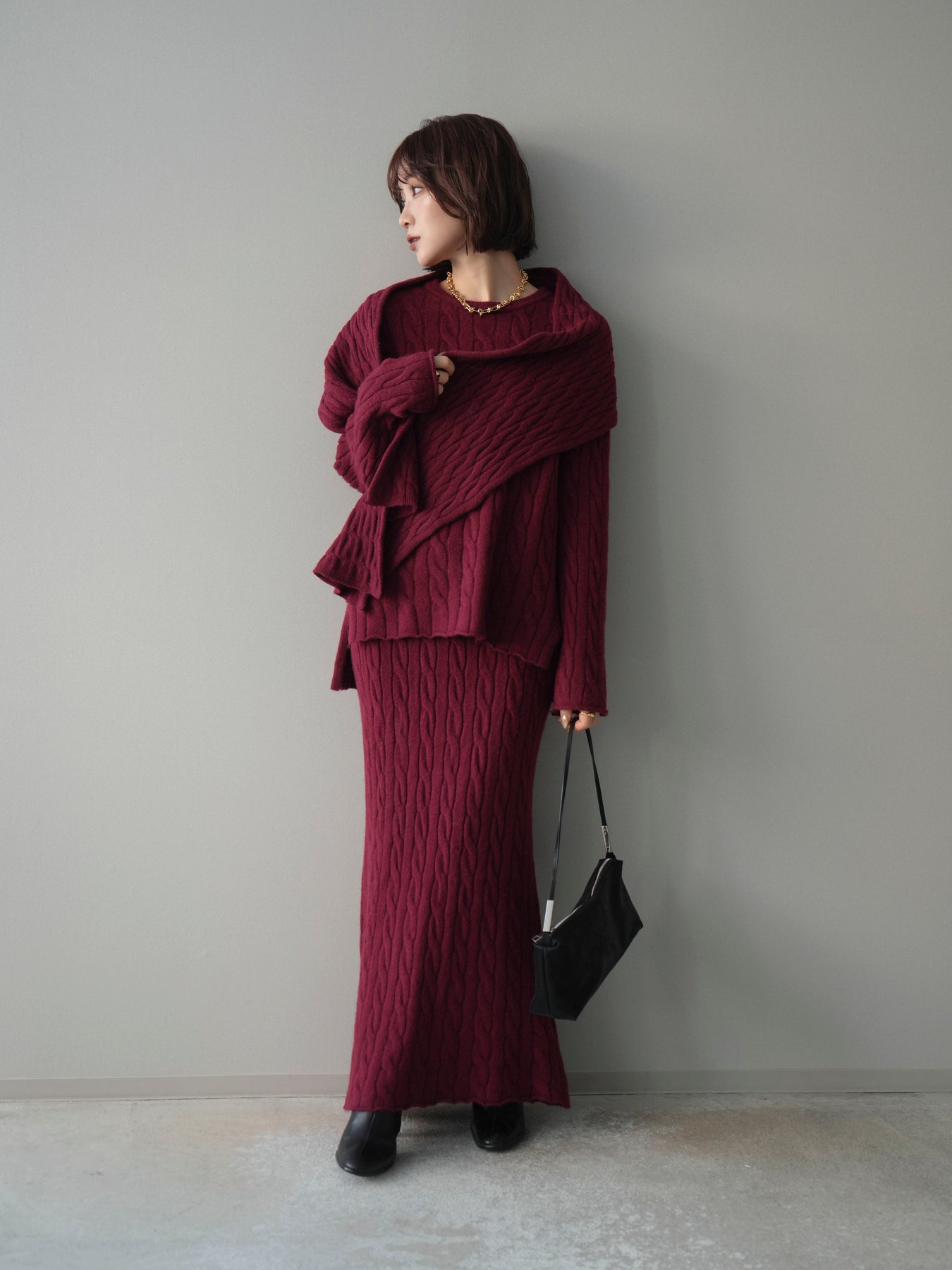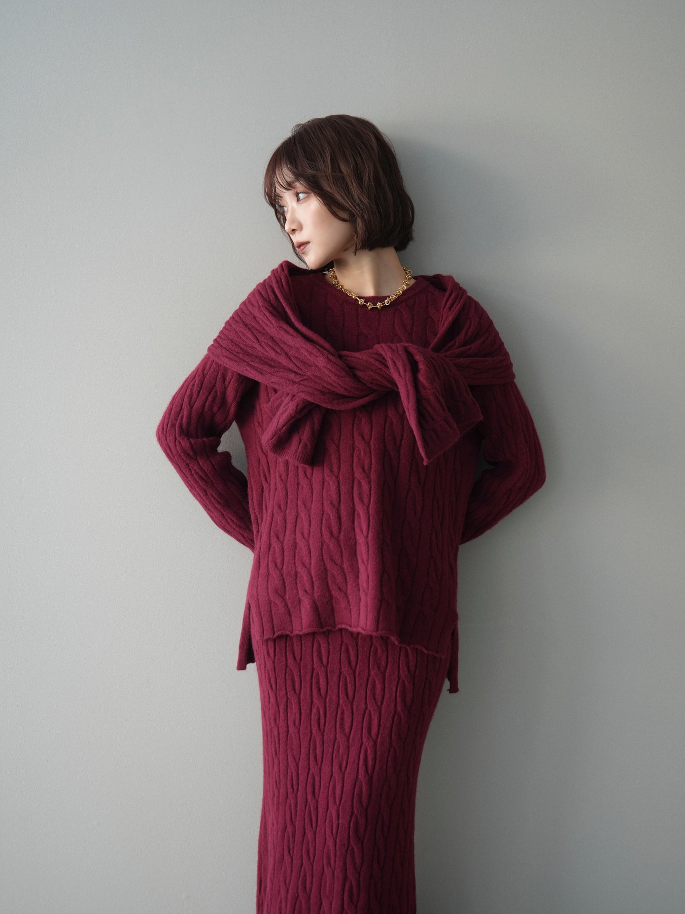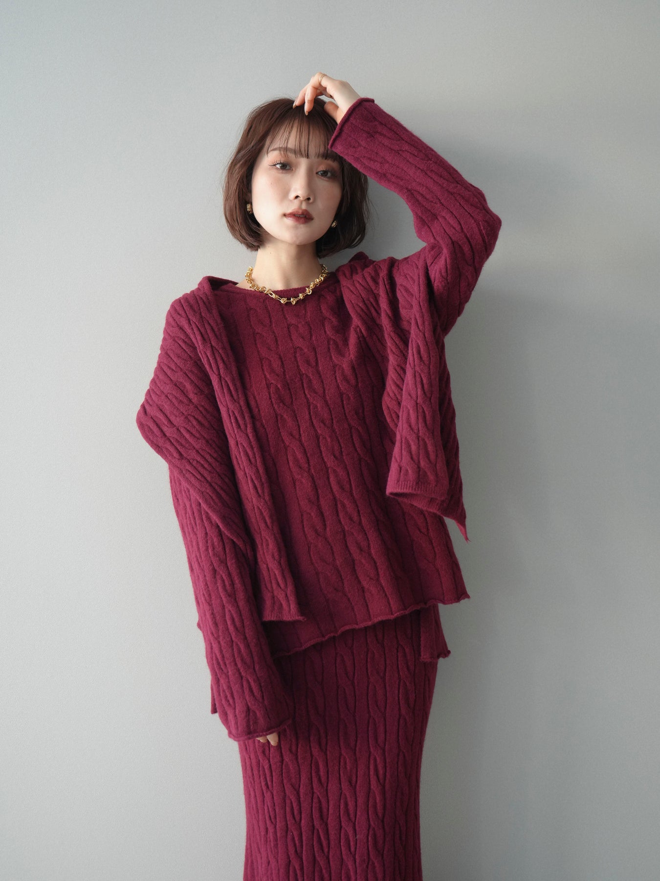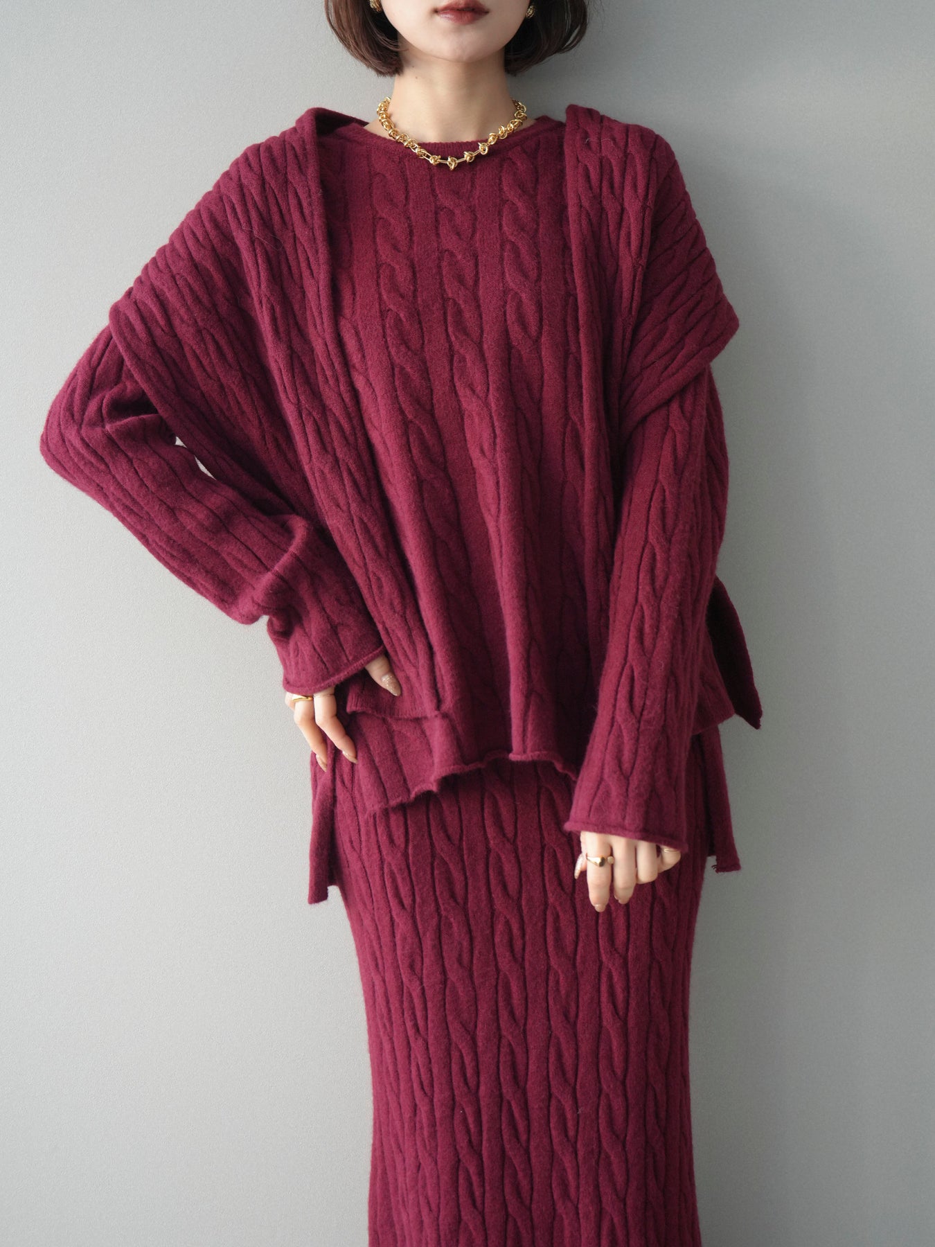 ケーブル編みが印象的なニットプルオーバーとロングスカートに、ストールを組み合わせたセットアップ。統一感のあるデザインで、セットで着用するだけでシーズンムードのあるスタイリングが完成します。単品使いもしやすく、着こなしの幅が広がる一着です。