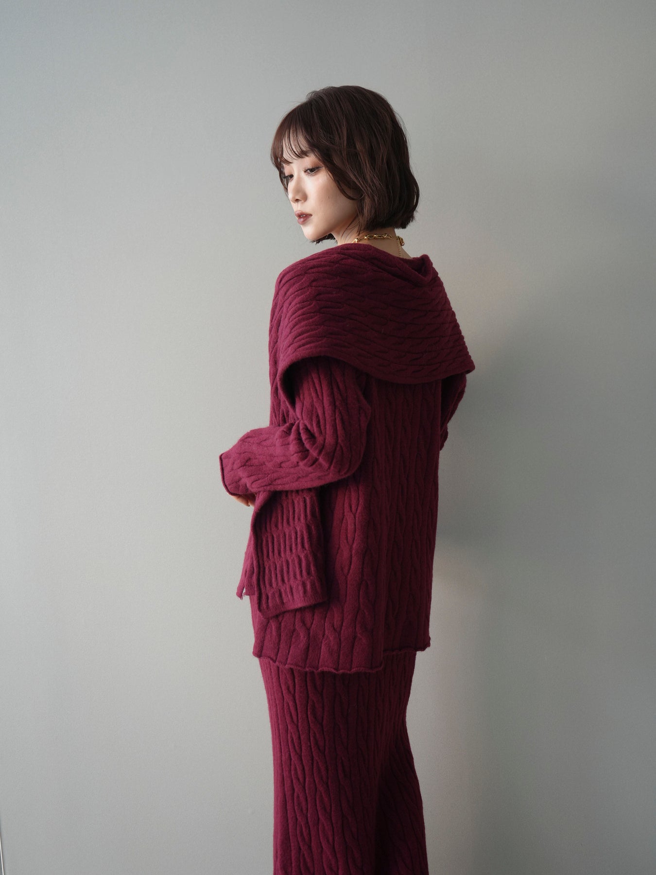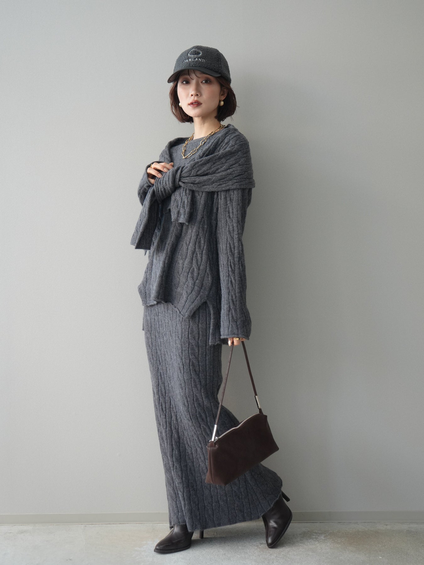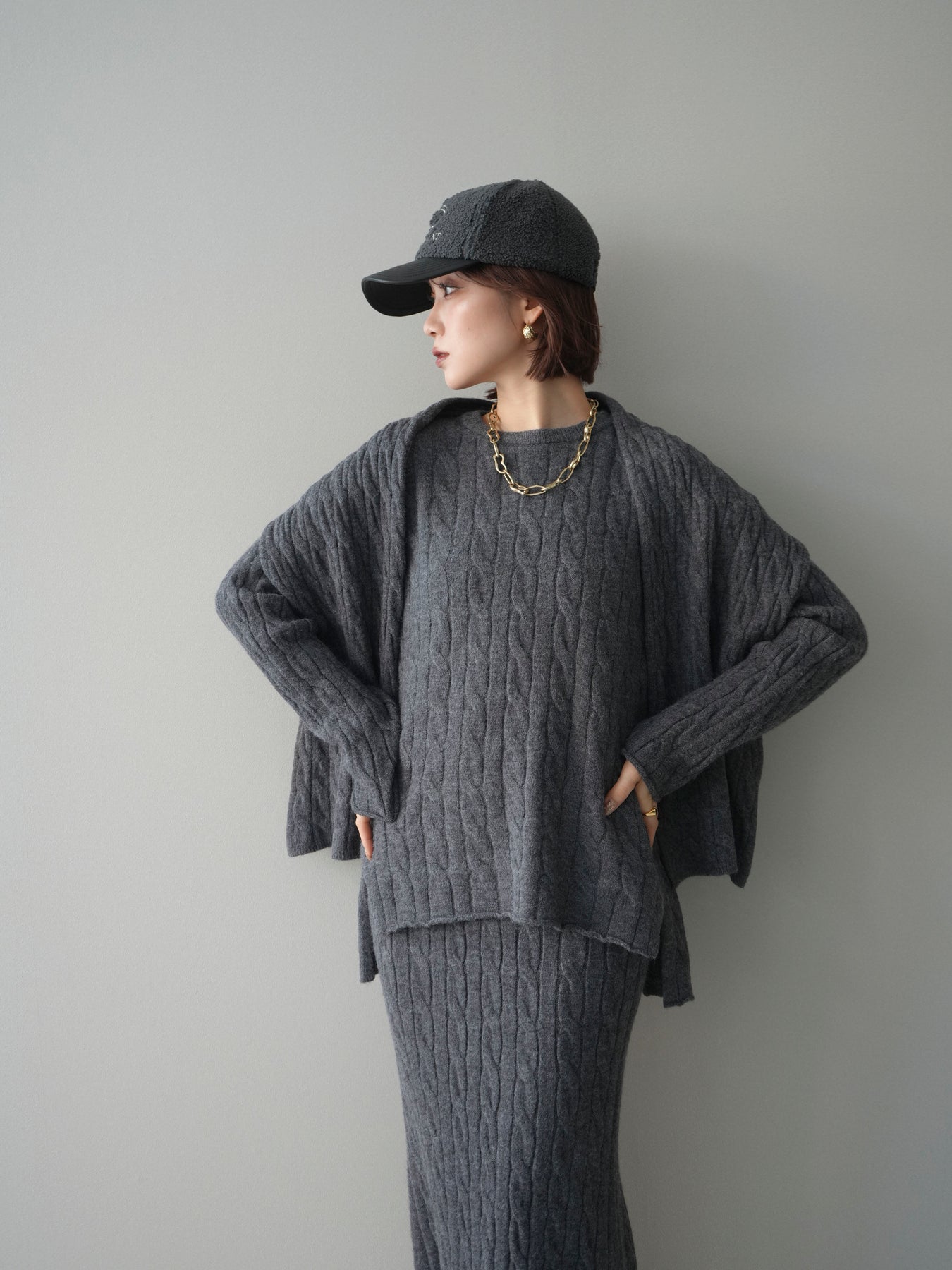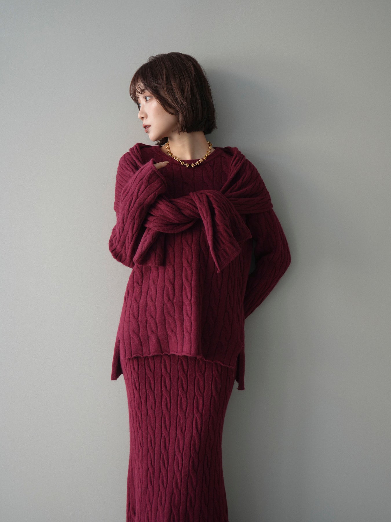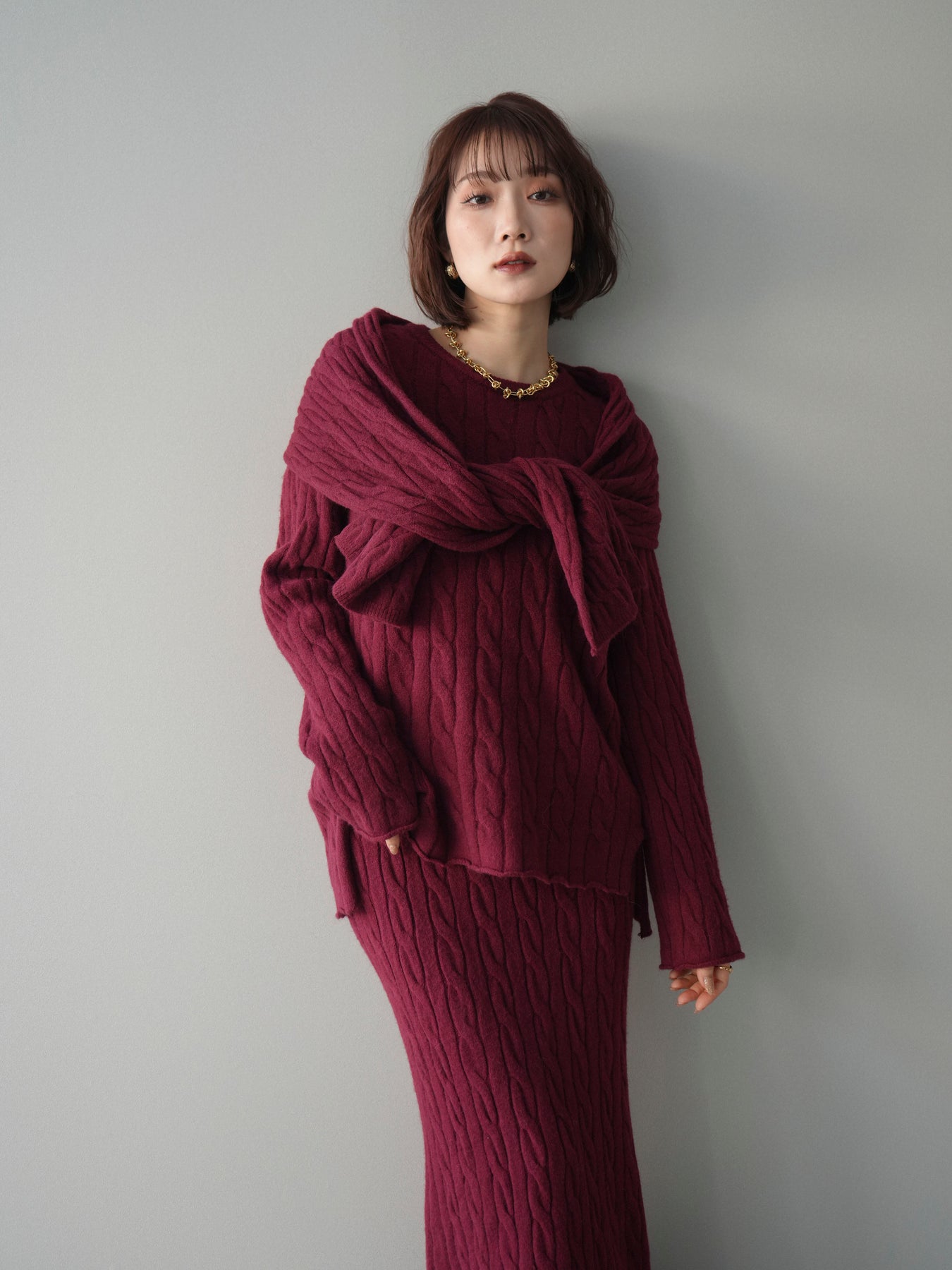 ケーブル編みが印象的なニットプルオーバーとロングスカートに、ストールを組み合わせたセットアップ。統一感のあるデザインで、セットで着用するだけでシーズンムードのあるスタイリングが完成します。単品使いもしやすく、着こなしの幅が広がる一着です。