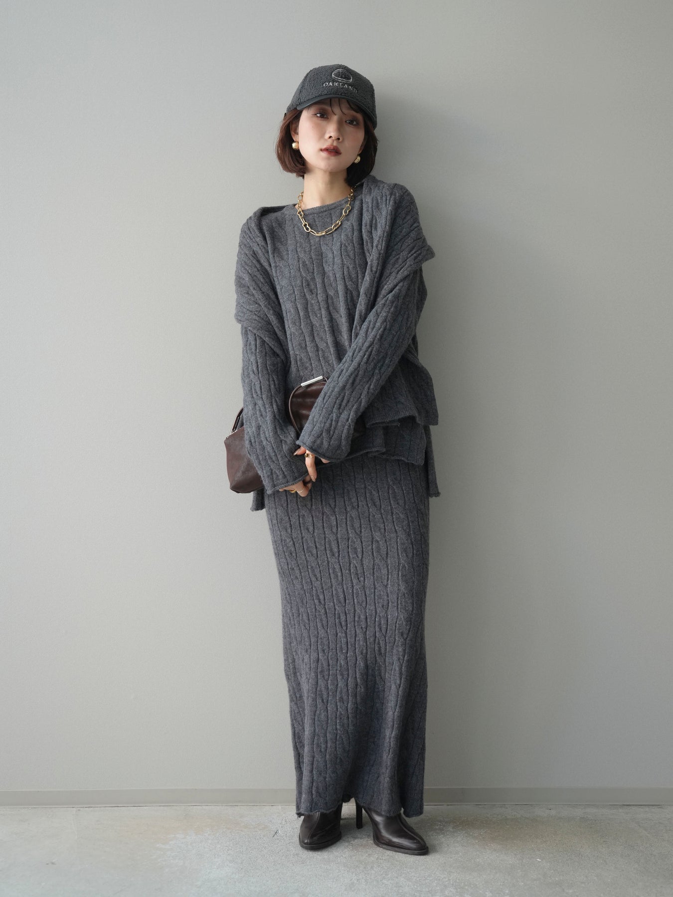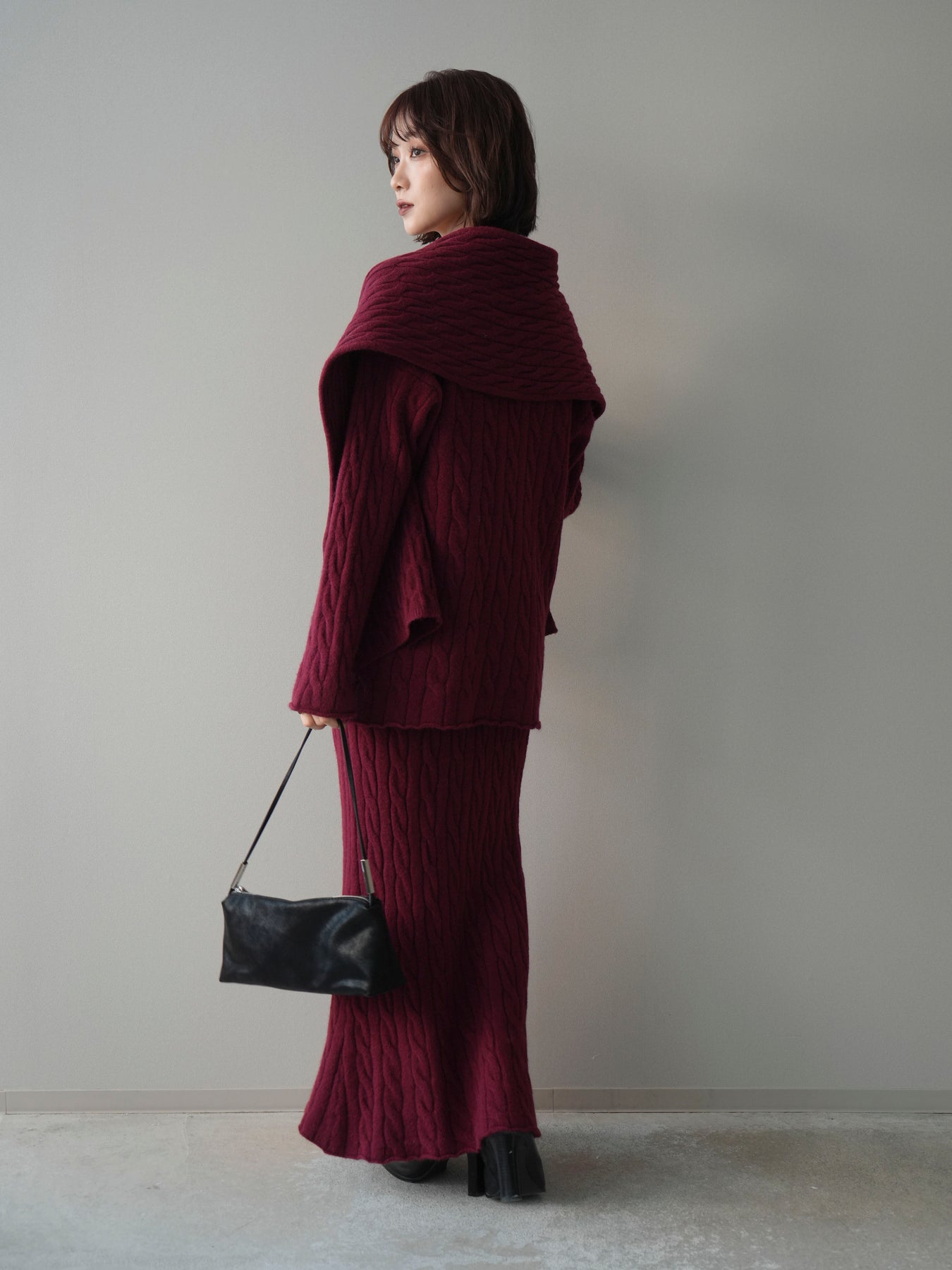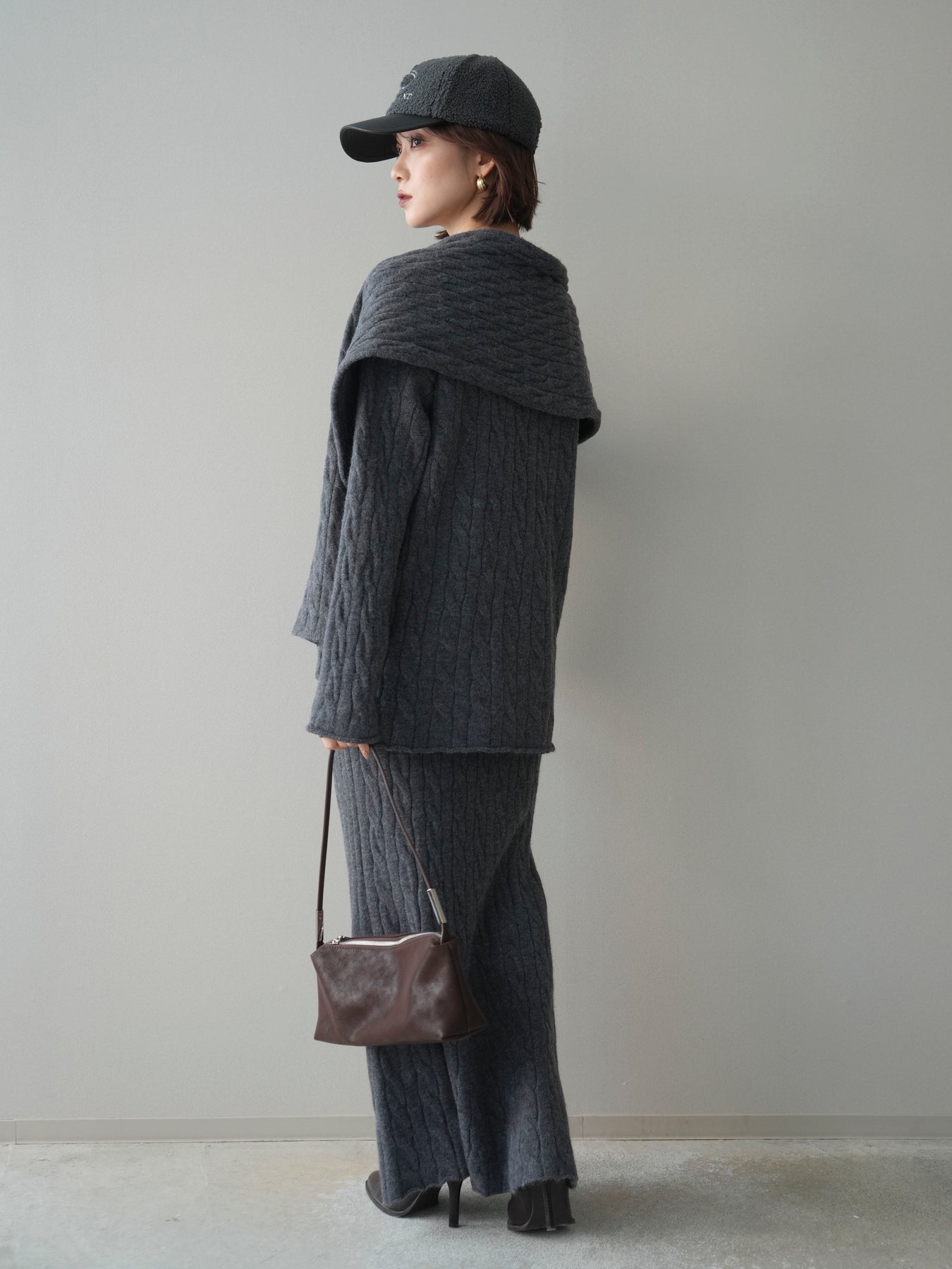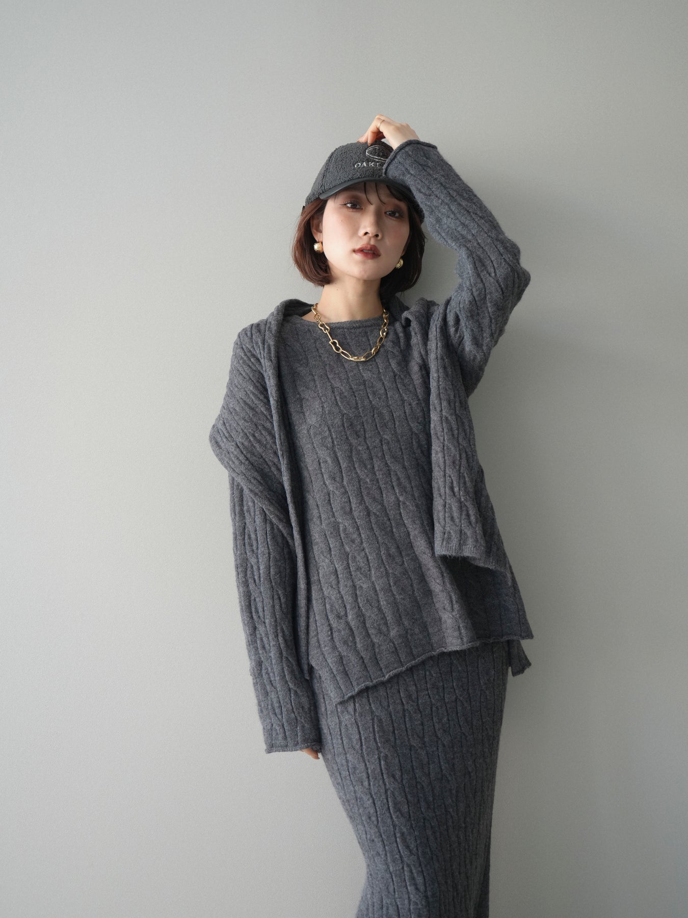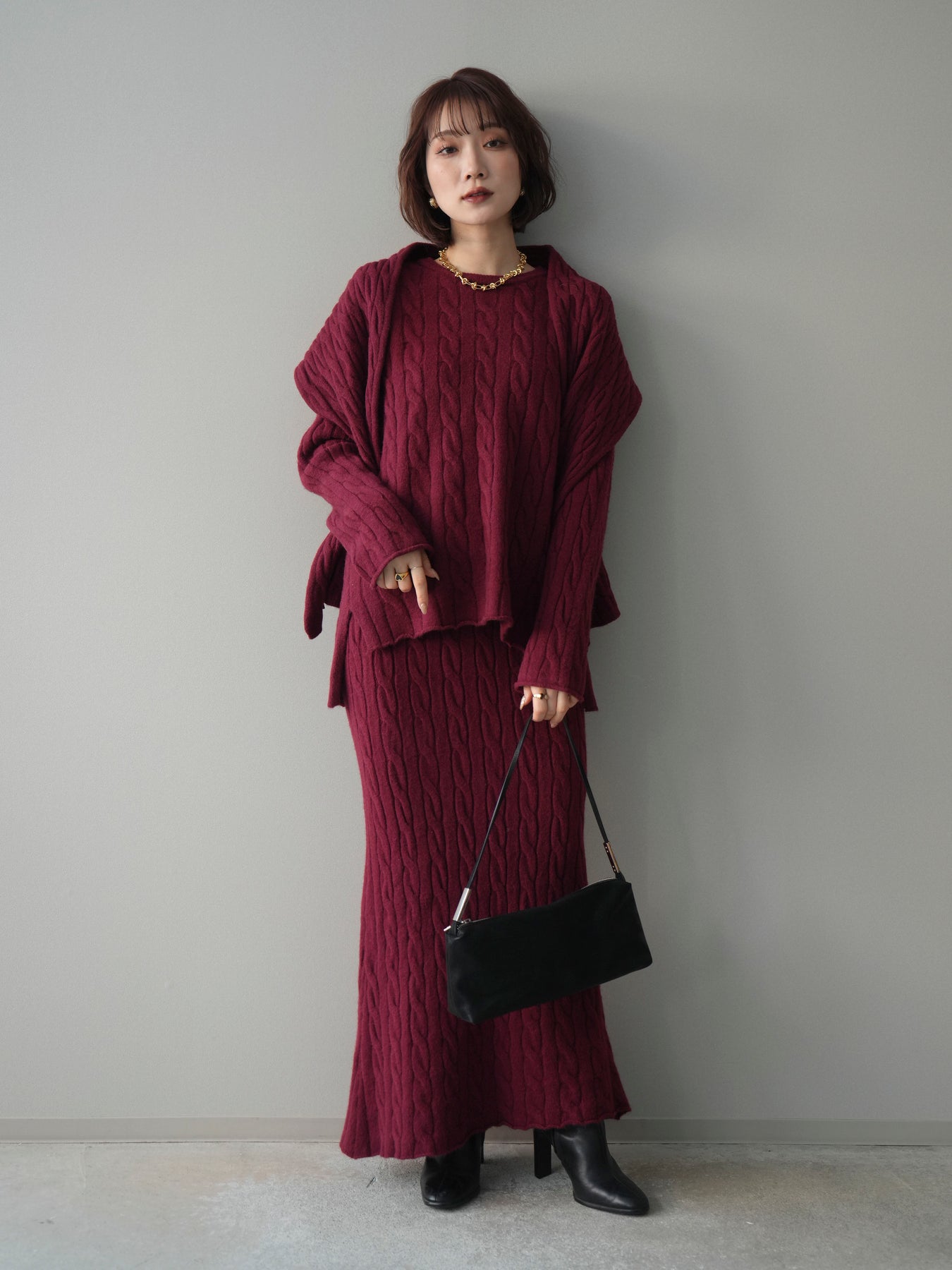 ケーブル編みが印象的なニットプルオーバーとロングスカートに、ストールを組み合わせたセットアップ。統一感のあるデザインで、セットで着用するだけでシーズンムードのあるスタイリングが完成します。単品使いもしやすく、着こなしの幅が広がる一着です。