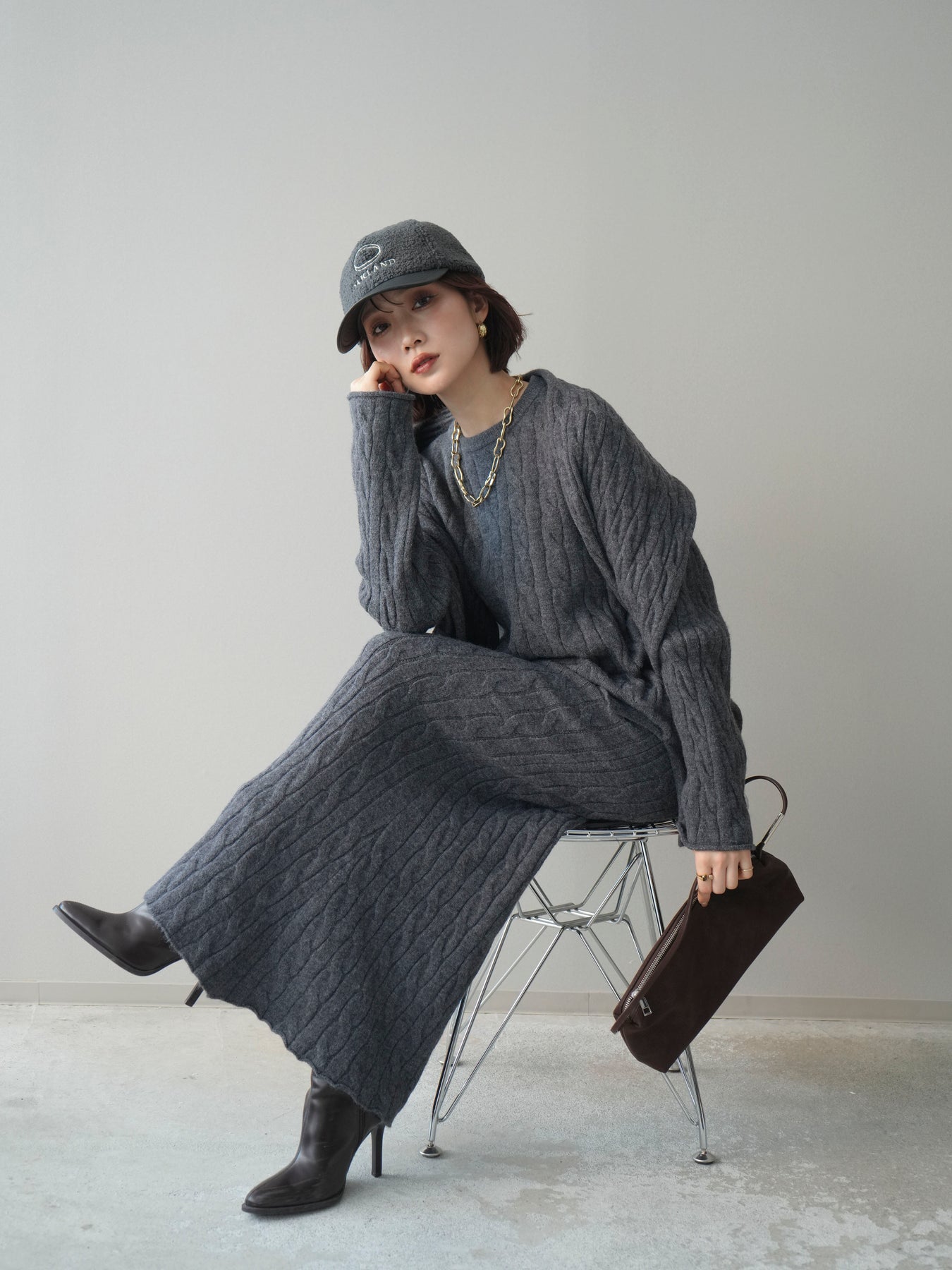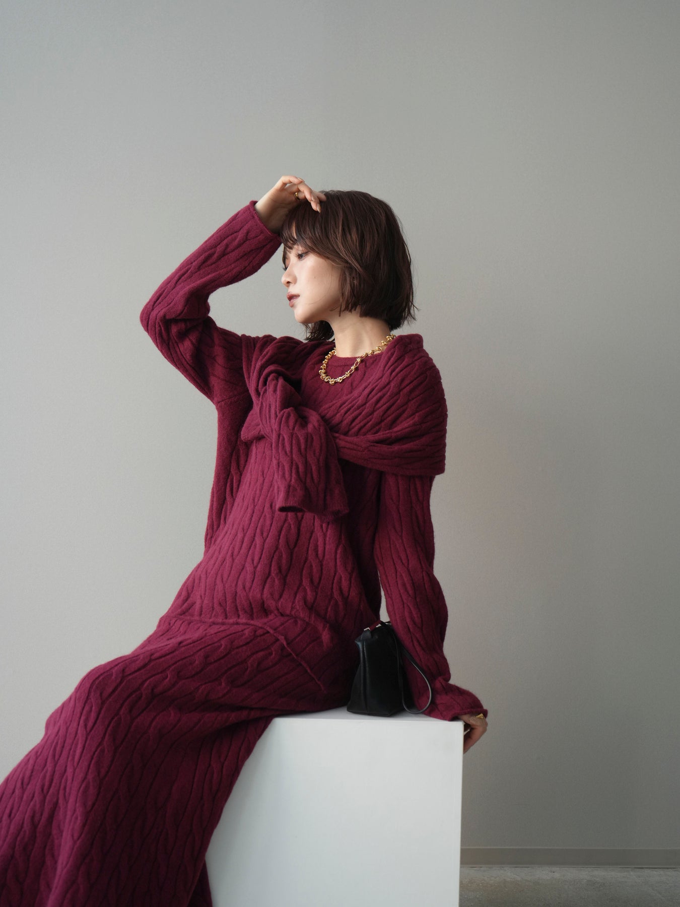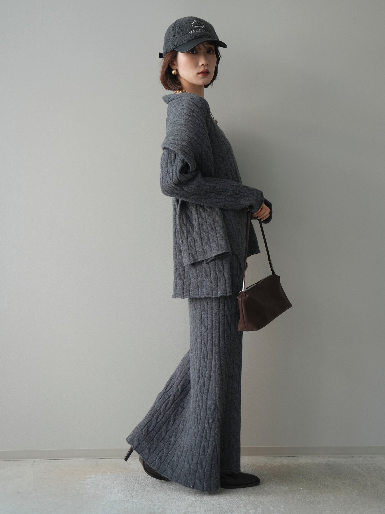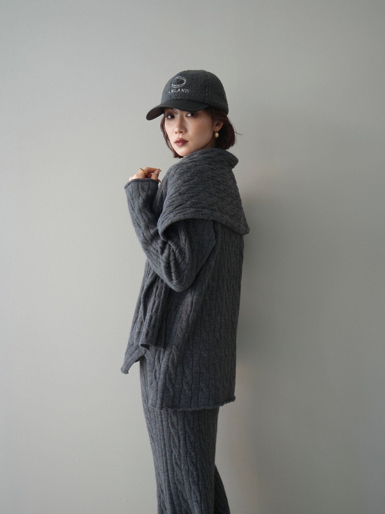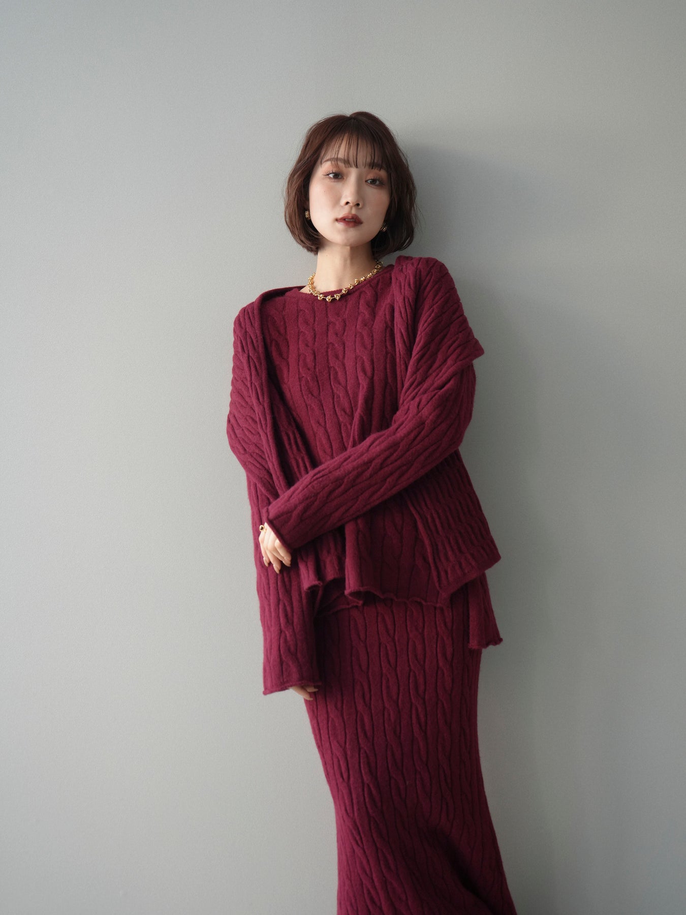 ケーブル編みが印象的なニットプルオーバーとロングスカートに、ストールを組み合わせたセットアップ。統一感のあるデザインで、セットで着用するだけでシーズンムードのあるスタイリングが完成します。単品使いもしやすく、着こなしの幅が広がる一着です。