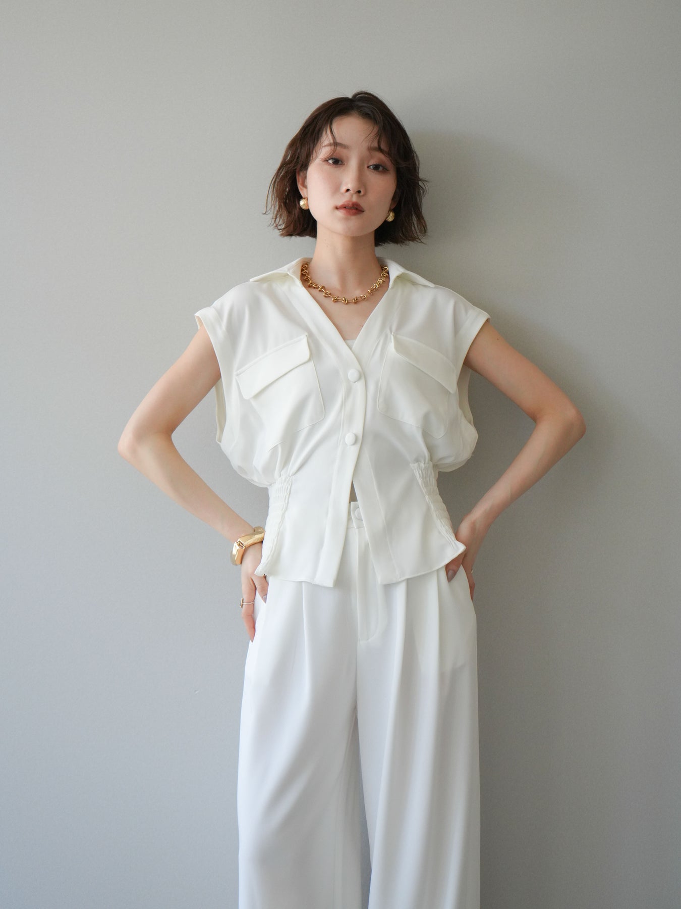 尋找與【套裝】腰部褶皺法式襯衫和寬腿褲套裝(2套)相關的產品↓