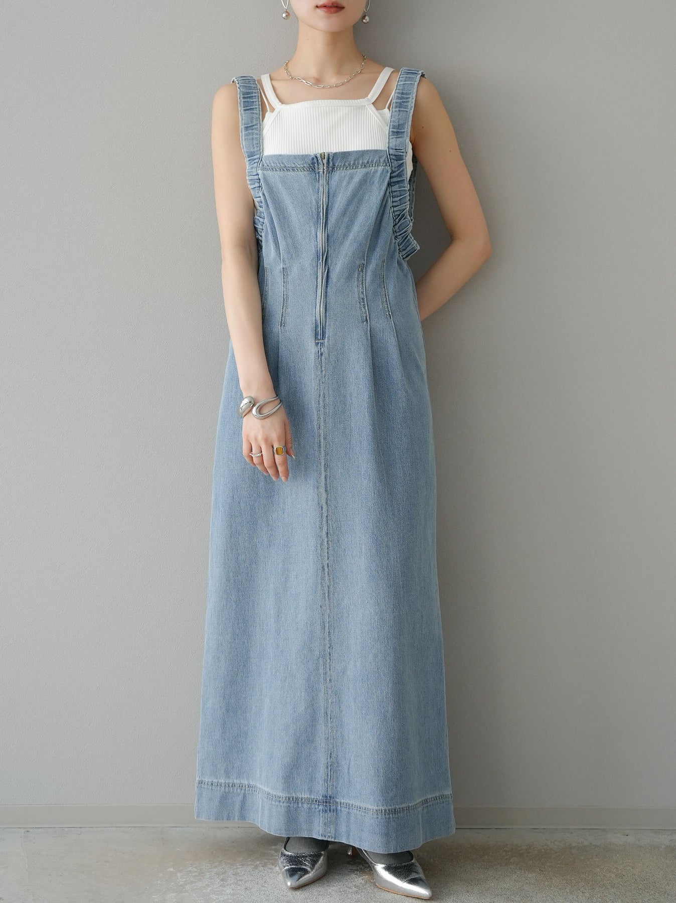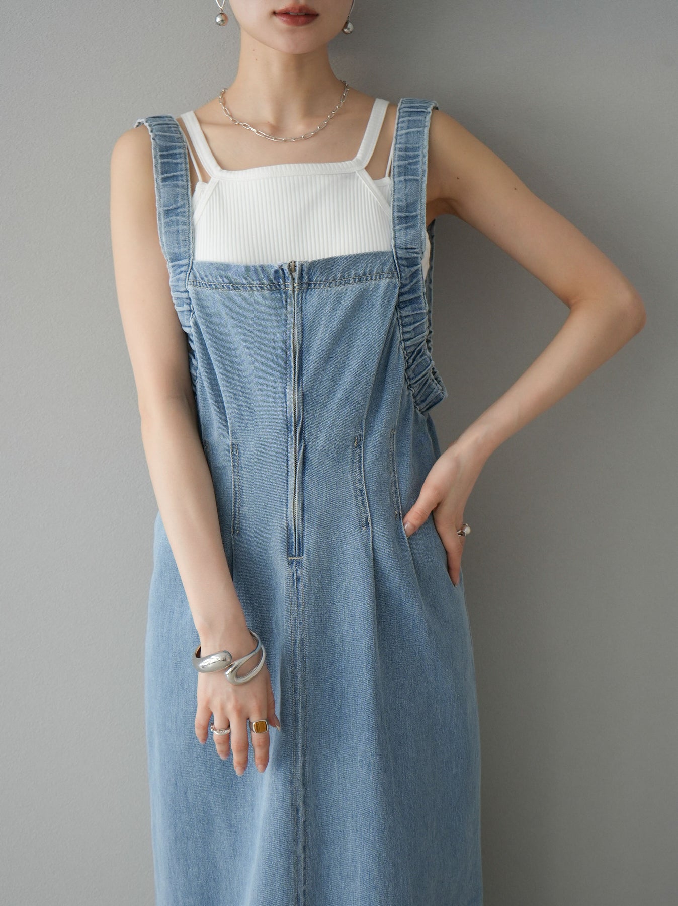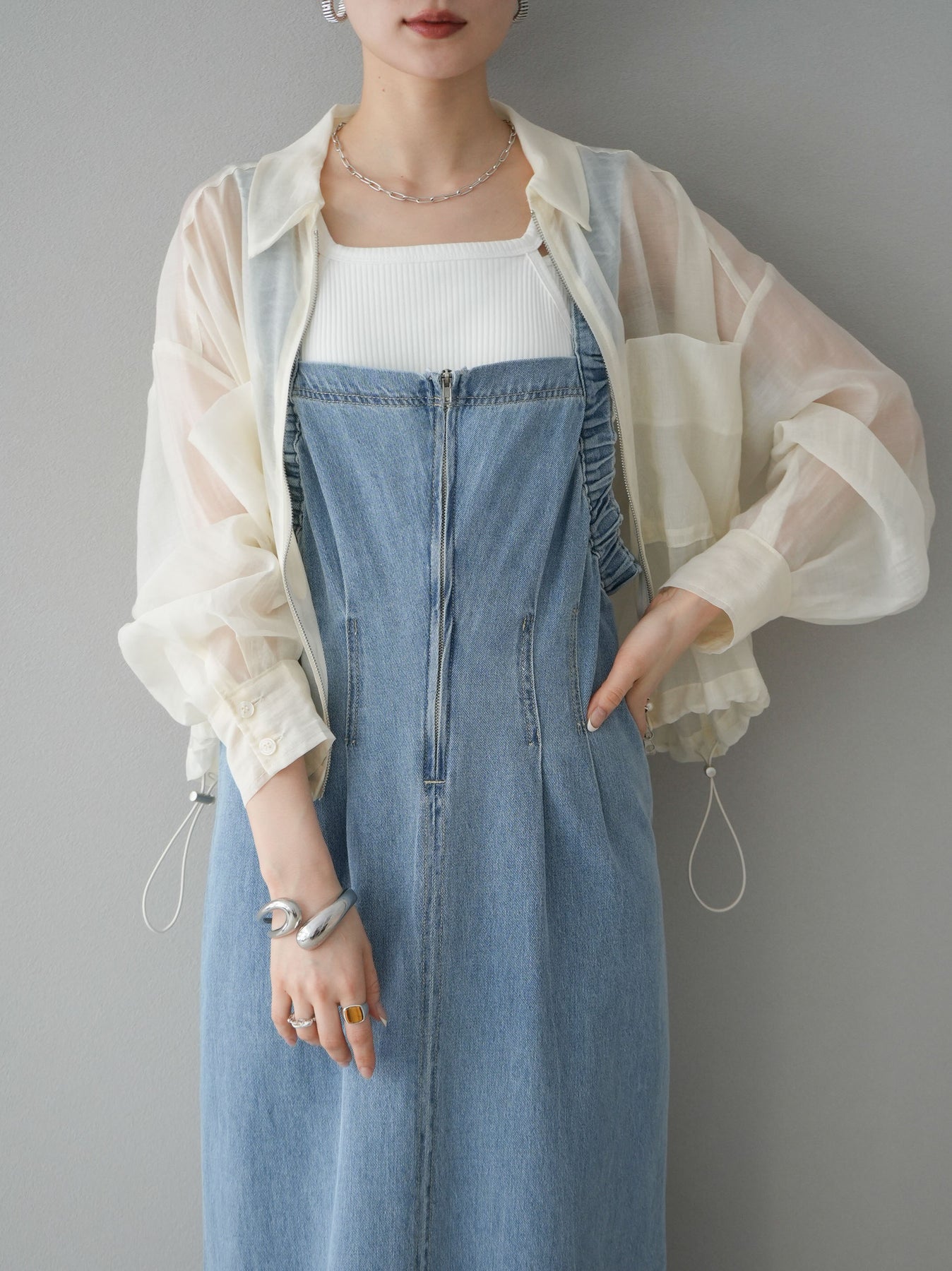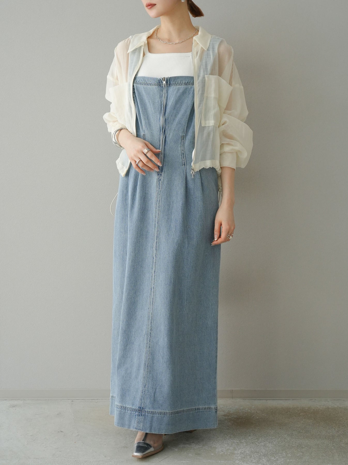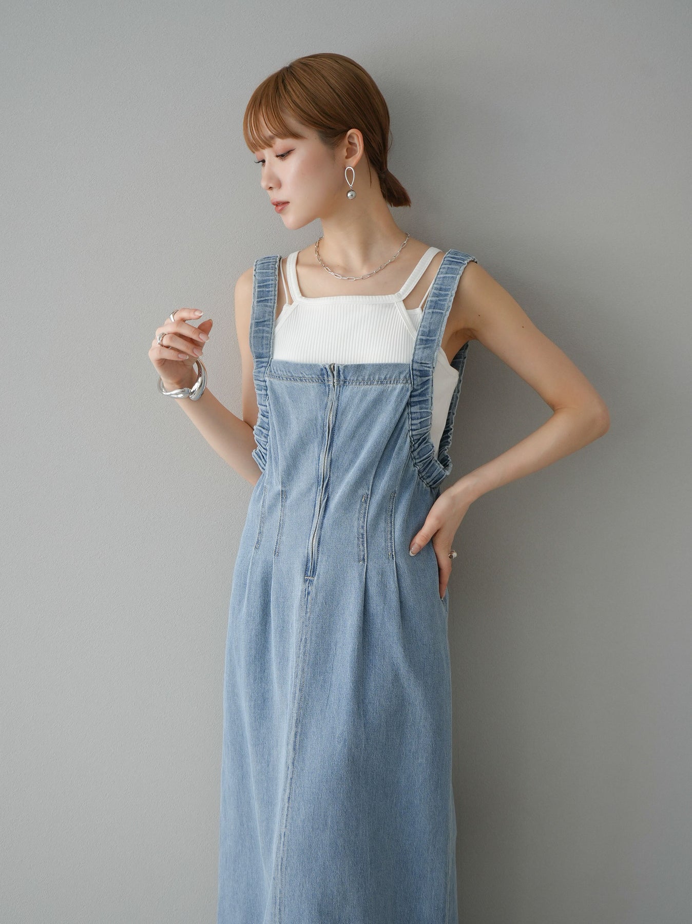 採用流行牛仔布材質製成的套頭裙。正面的拉鍊是亮點,根據拉開或拉上的狀態,設計也會改變。肩膀的褶皺設計增添了女性氣息,營造出休閒又迷人的印象。它具有簡潔的輪廓,可根據內衣一年四季穿著。將其與 T 卹或透明上衣搭配,營造出精緻的分層外觀。 ※除下裝、吊帶背心(內衣)以外的商品均為標準品,不含內衣。