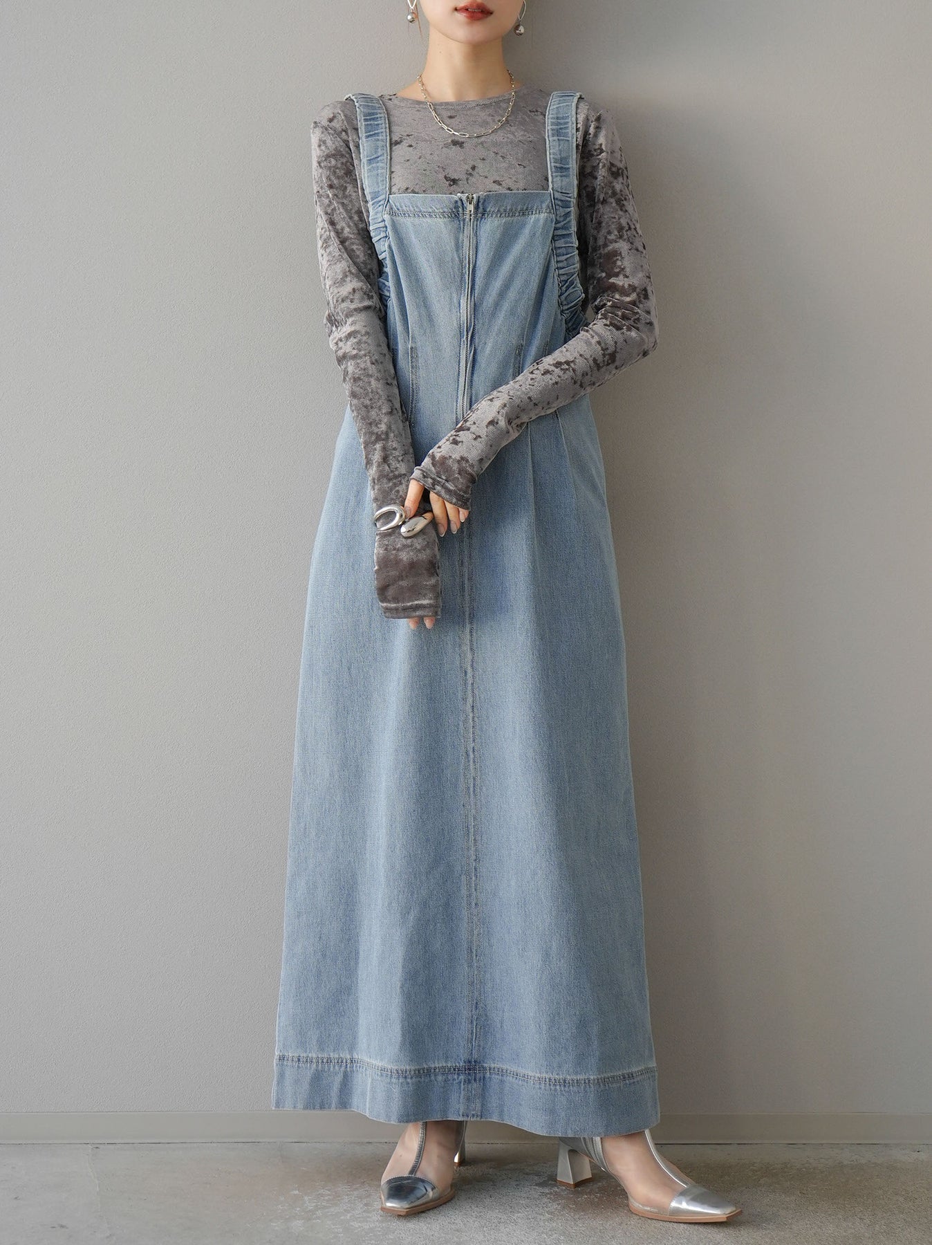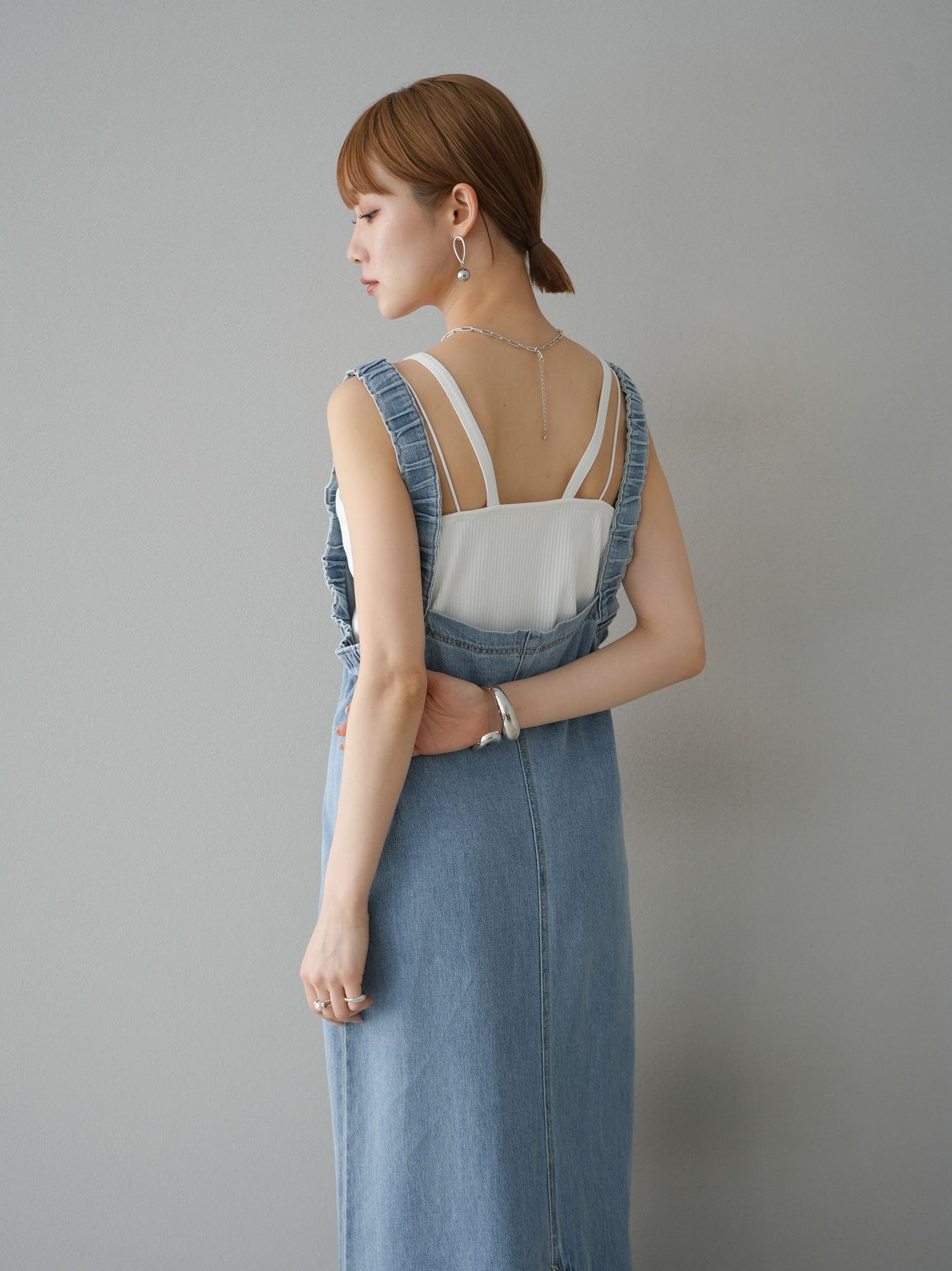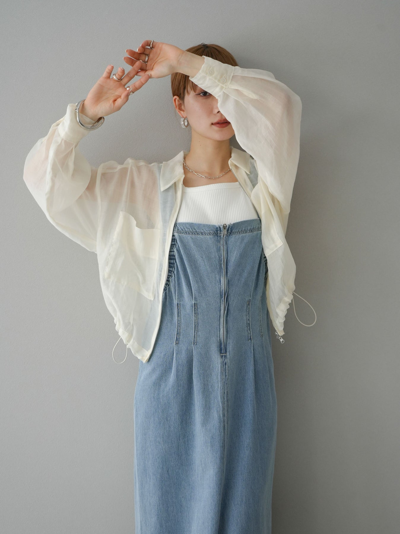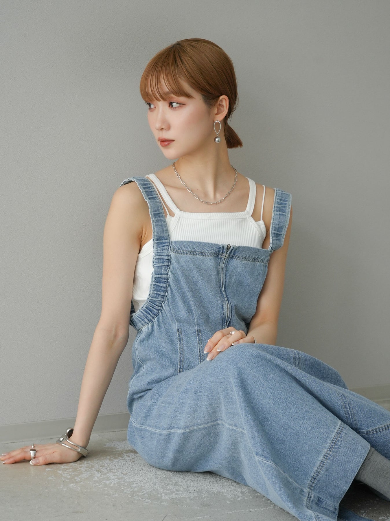 採用流行牛仔布材質製成的套頭裙。正面的拉鍊是亮點,根據拉開或拉上的狀態,設計也會改變。肩膀的褶皺設計增添了女性氣息,營造出休閒又迷人的印象。它具有簡潔的輪廓,可根據內衣一年四季穿著。將其與 T 卹或透明上衣搭配,營造出精緻的分層外觀。 ※除下裝、吊帶背心(內衣)以外的商品均為標準品,不含內衣。