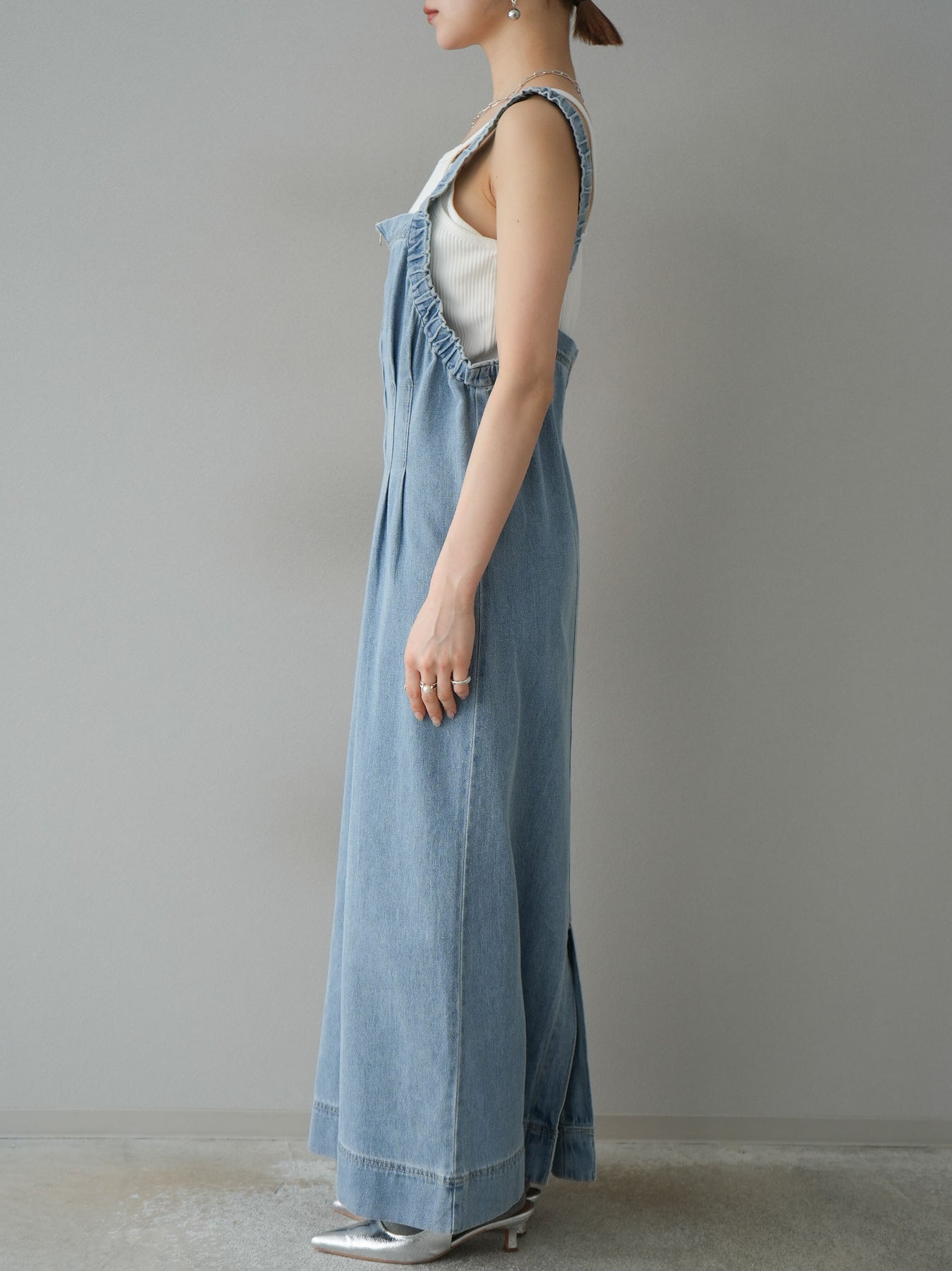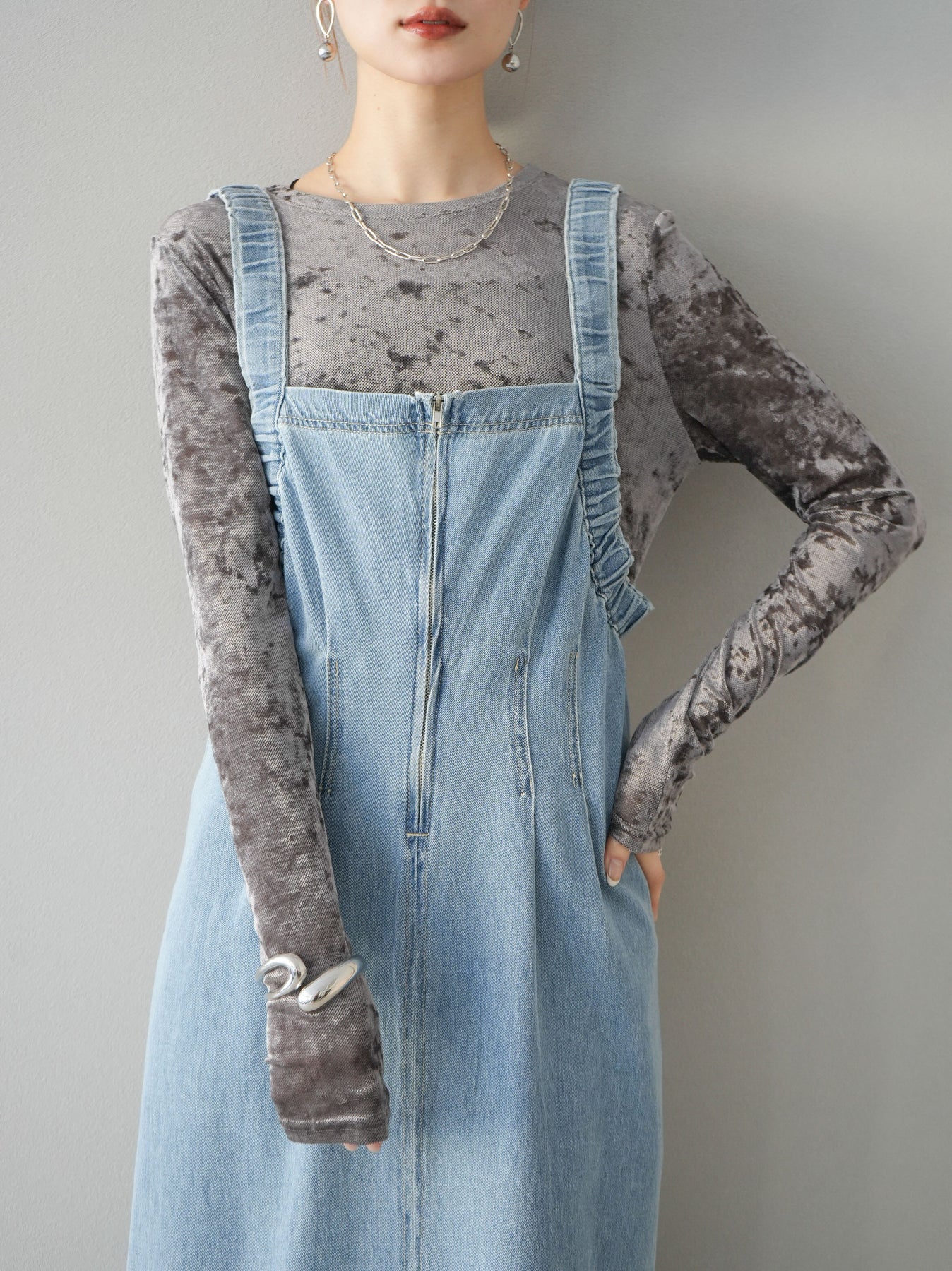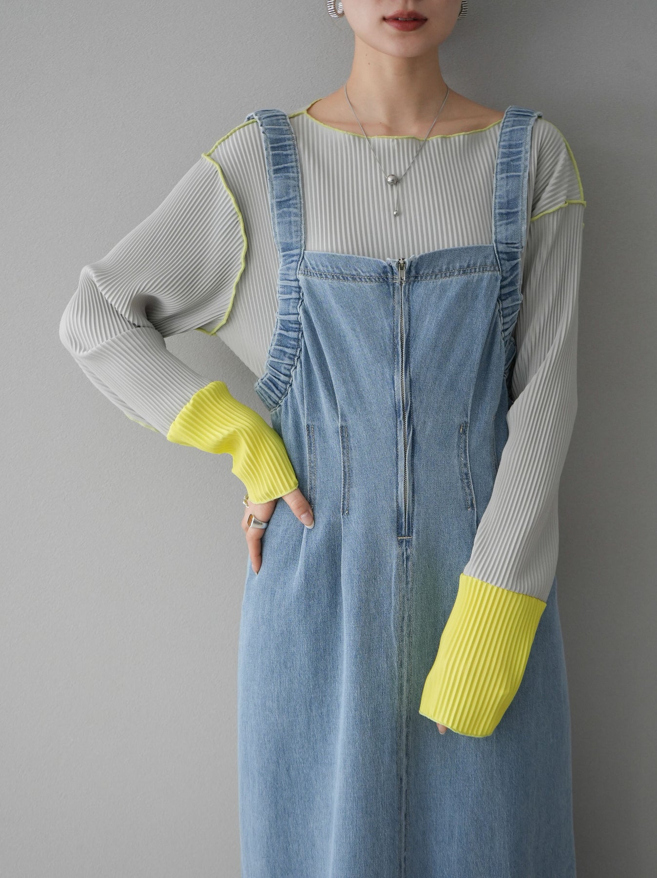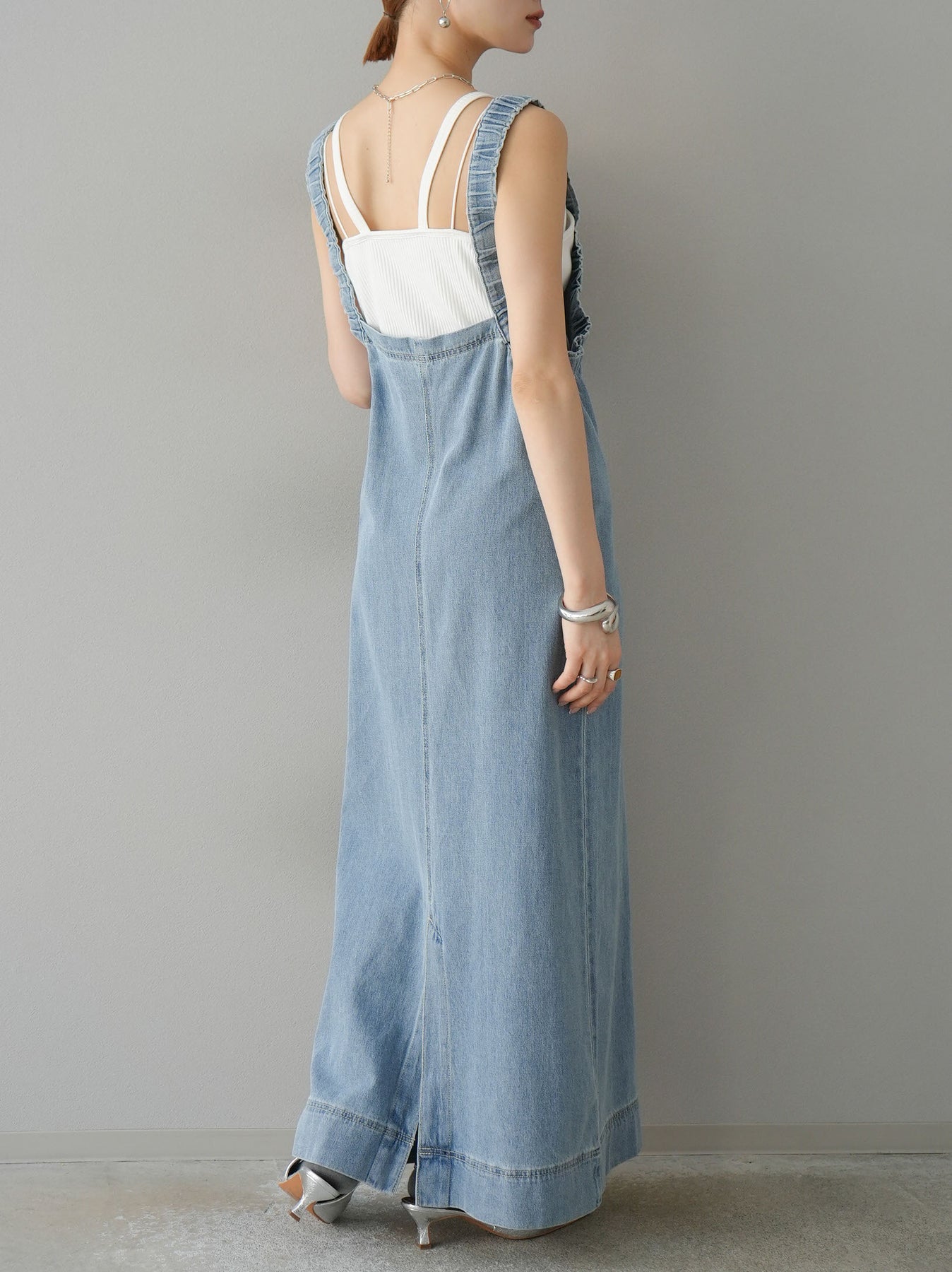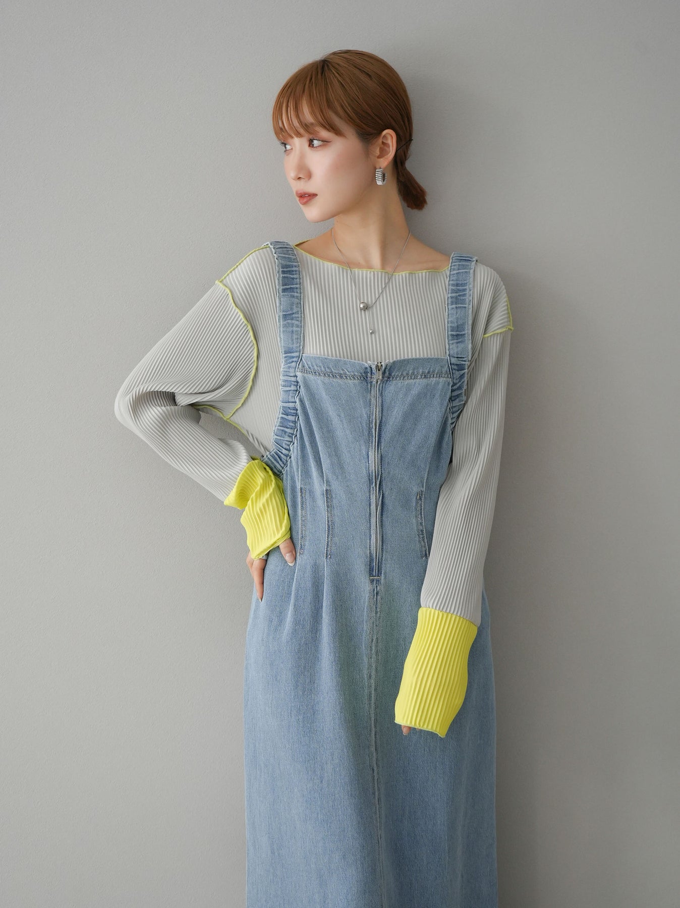採用流行牛仔布材質製成的套頭裙。正面的拉鍊是亮點,根據拉開或拉上的狀態,設計也會改變。肩膀的褶皺設計增添了女性氣息,營造出休閒又迷人的印象。它具有簡潔的輪廓,可根據內衣一年四季穿著。將其與 T 卹或透明上衣搭配,營造出精緻的分層外觀。 ※除下裝、吊帶背心(內衣)以外的商品均為標準品,不含內衣。