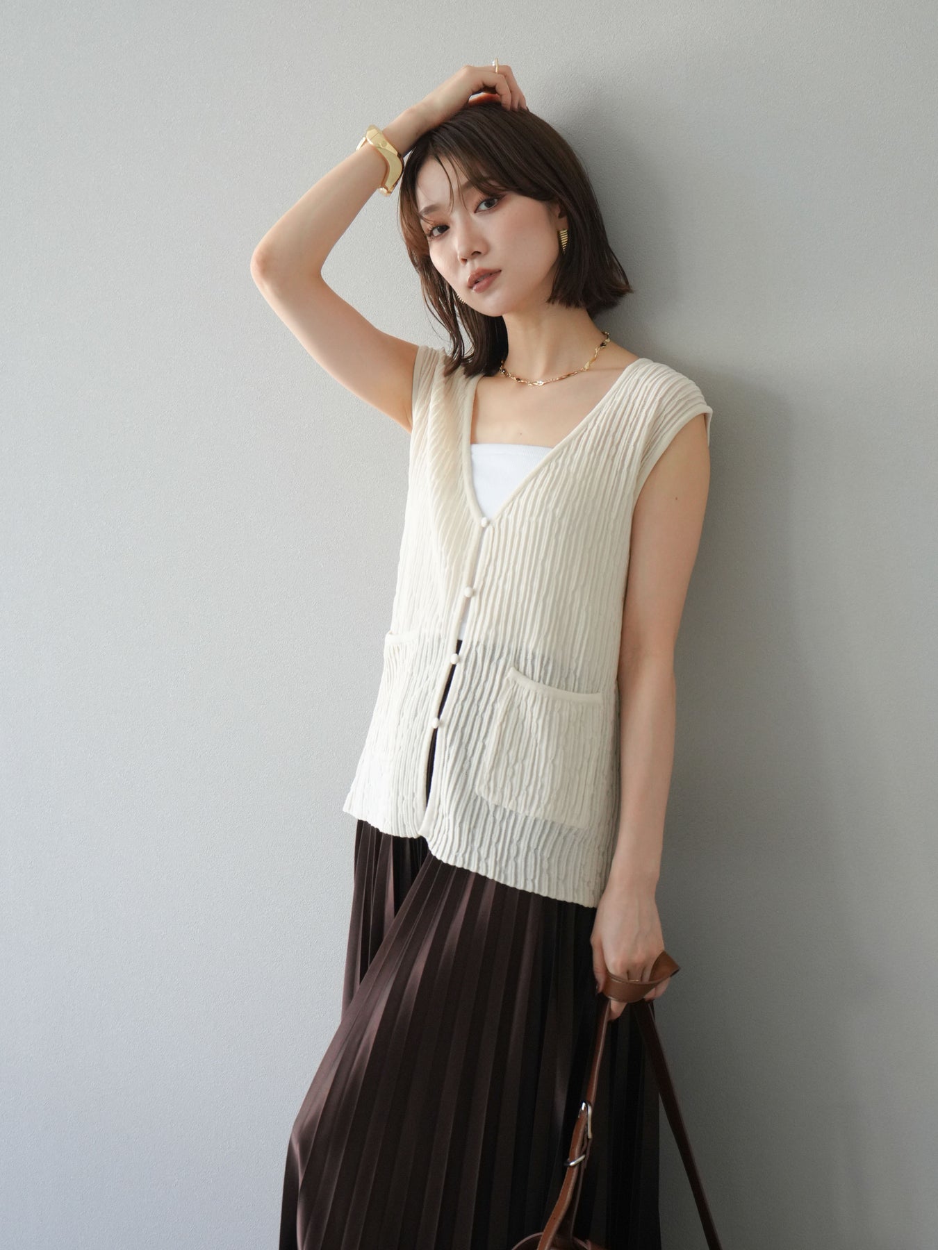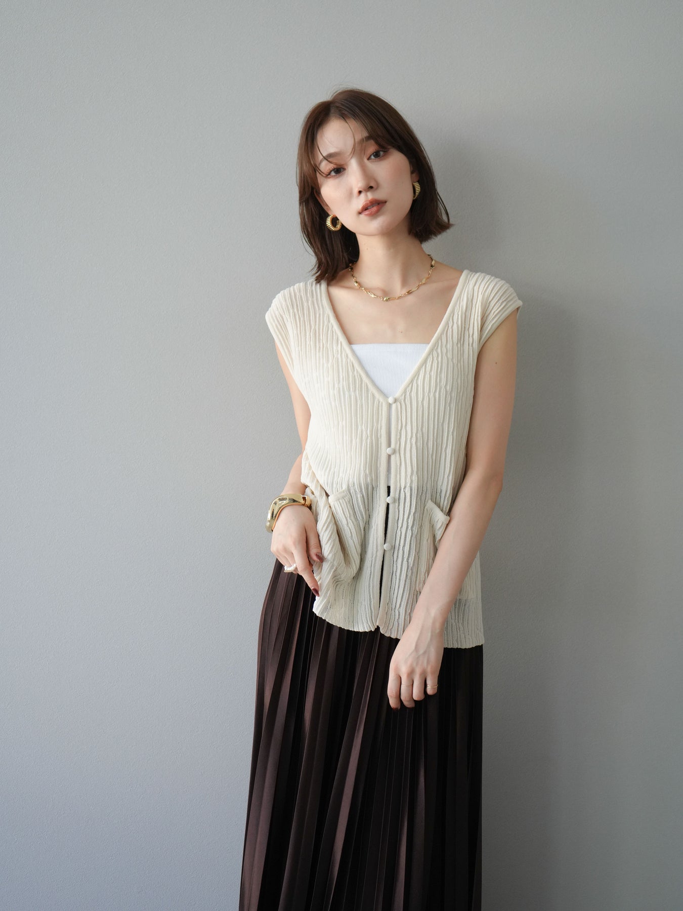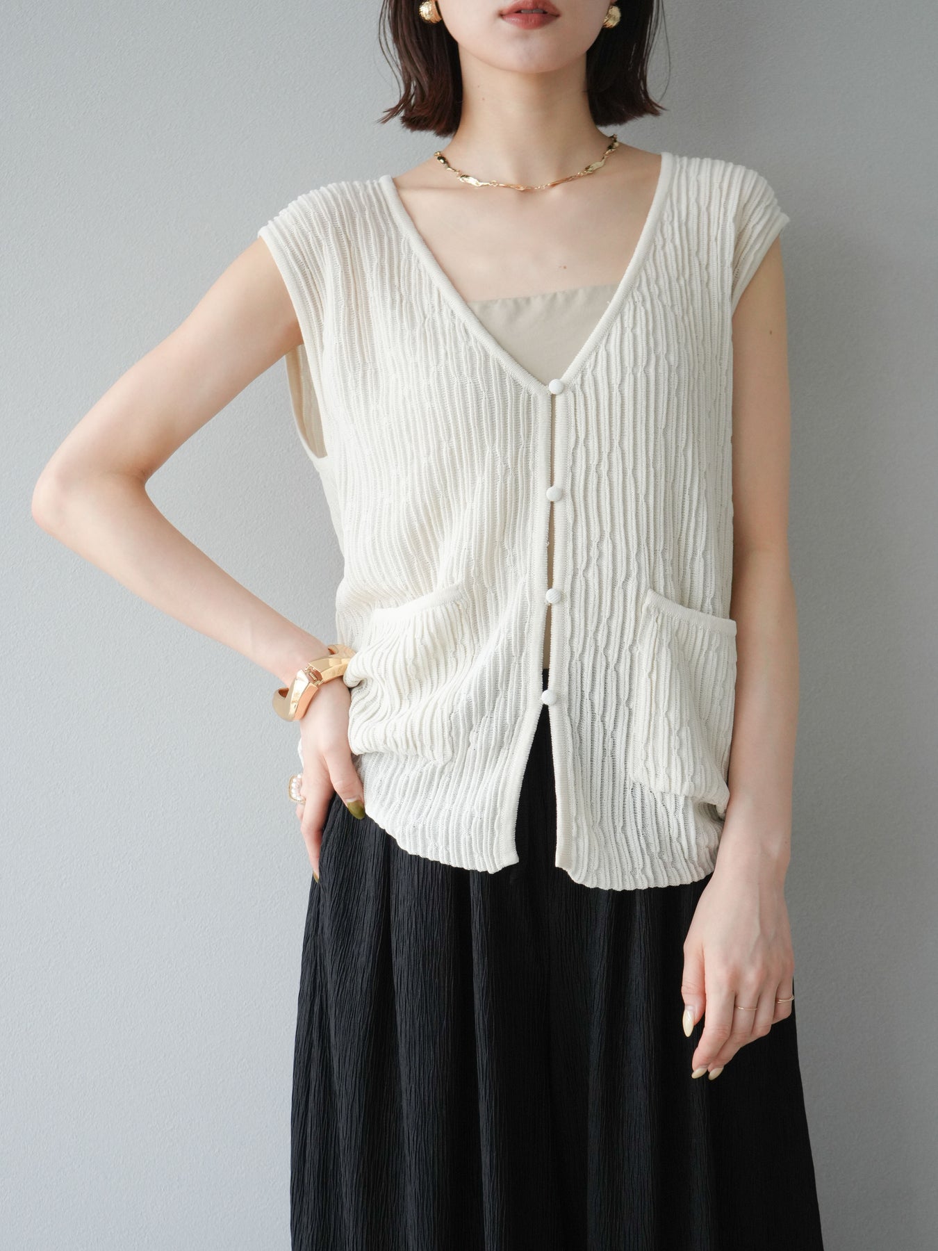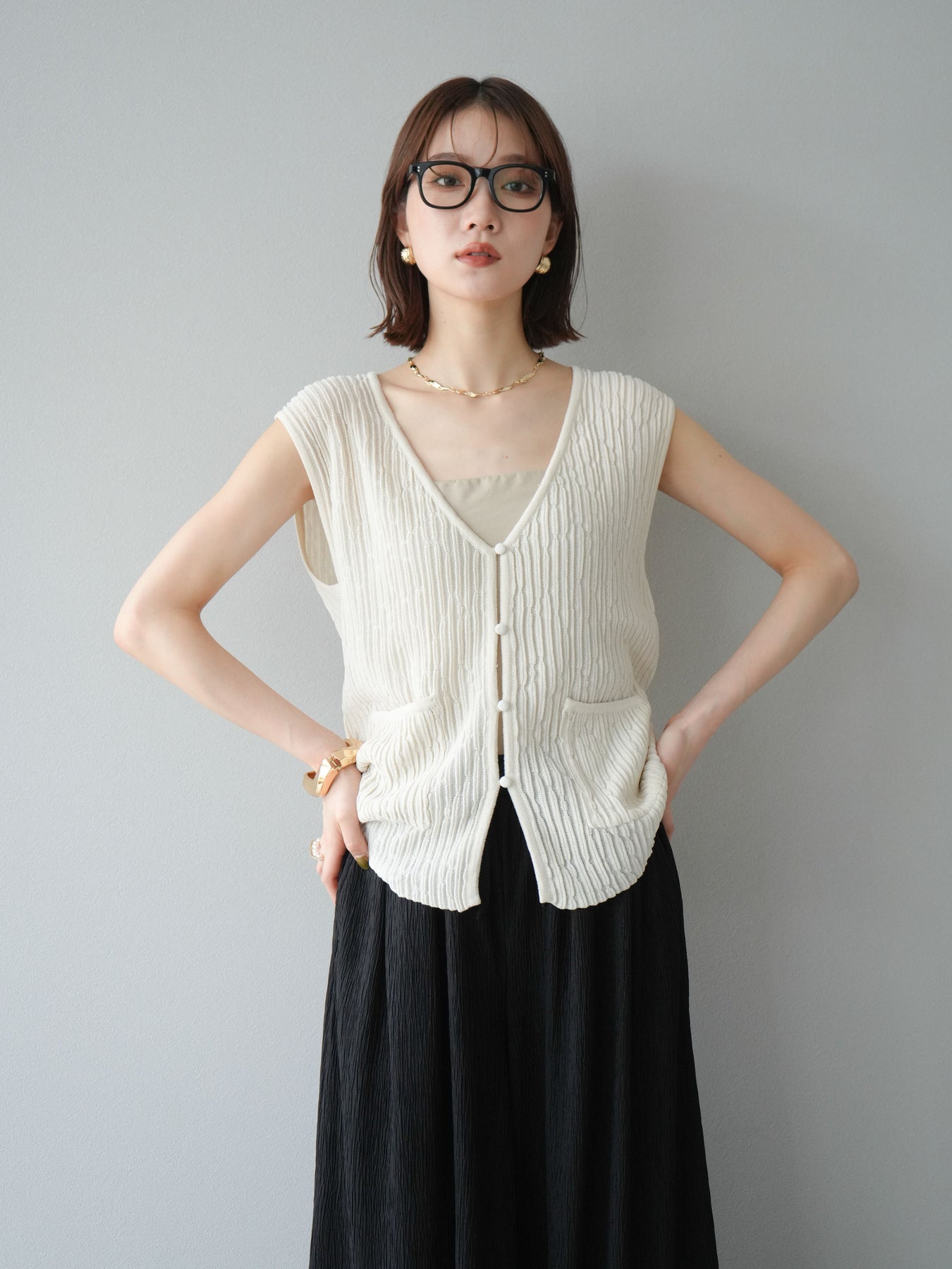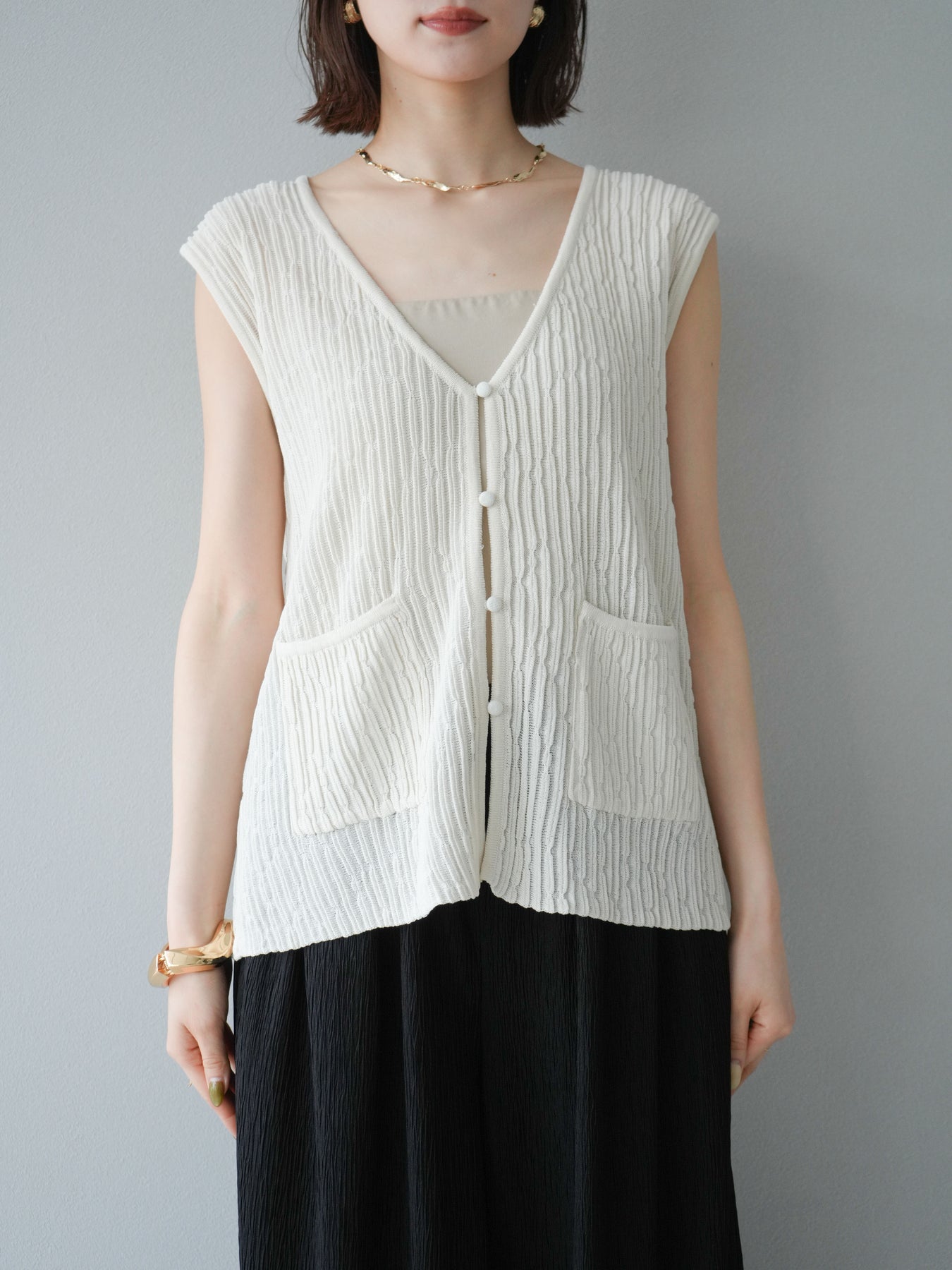 清涼夏日針織背心,飾有精緻的波浪針織圖案。輕薄的材質,營造出春夏氣息,簡約卻不失精緻。 正面飾有包扣和口袋,細節展現精緻。只需內搭T卹或吊帶背心,即可打造層次感十足的造型。 這是您想要添加到夏季衣櫃中的物品,因為它可以在工作時和下班時穿著。 ※除下裝、吊帶背心(內衣)以外的商品均不含內衣。