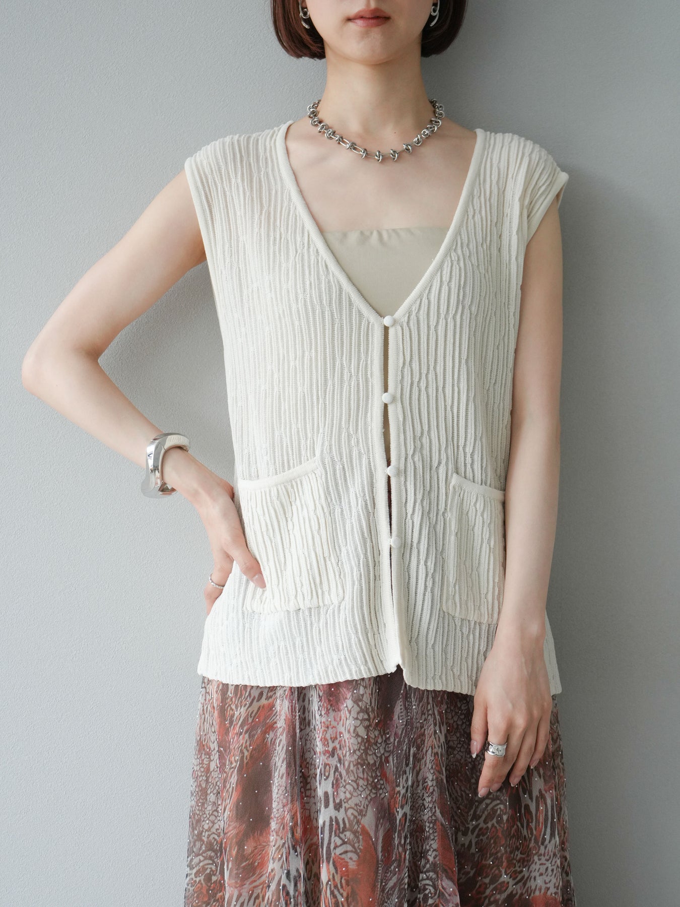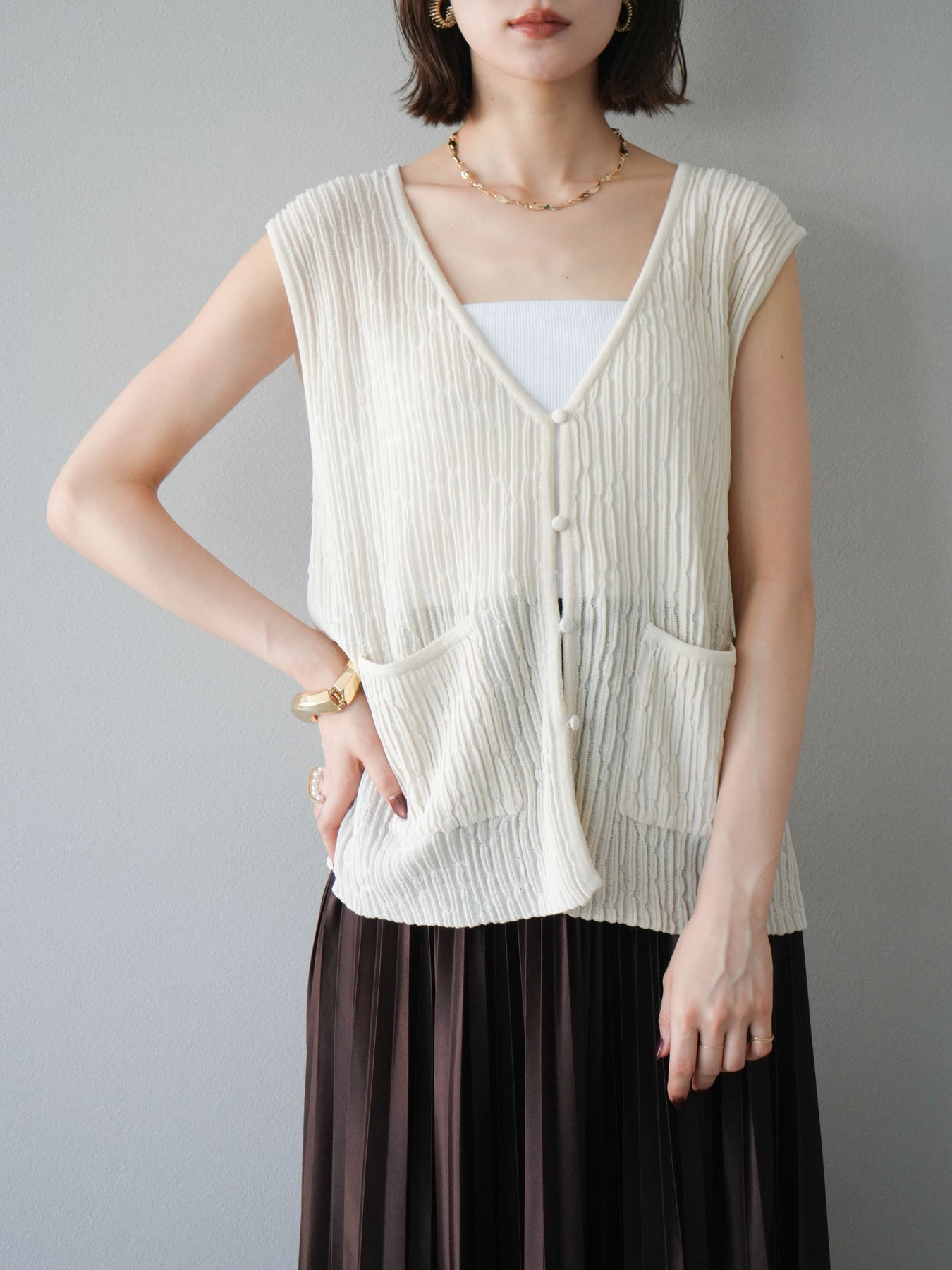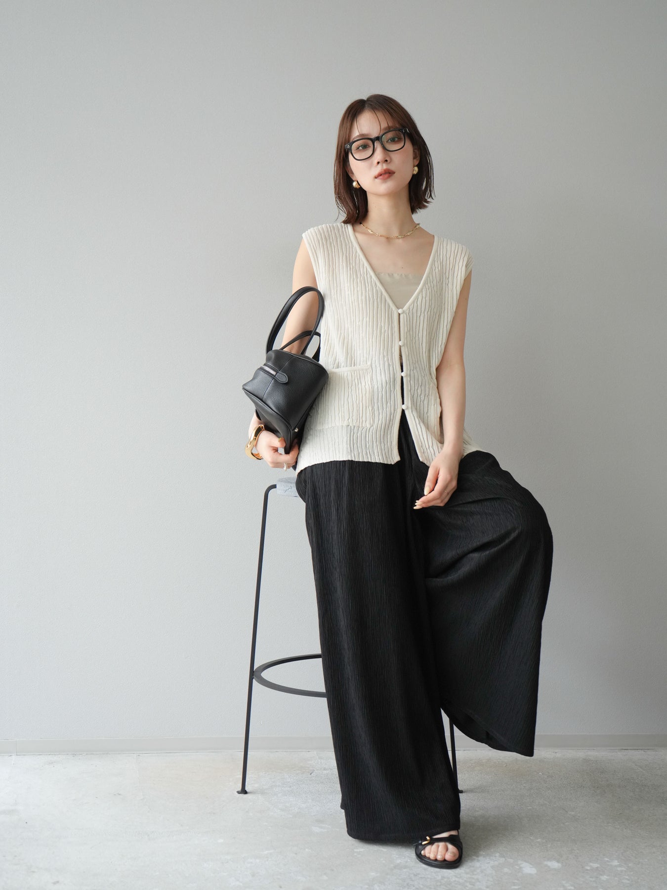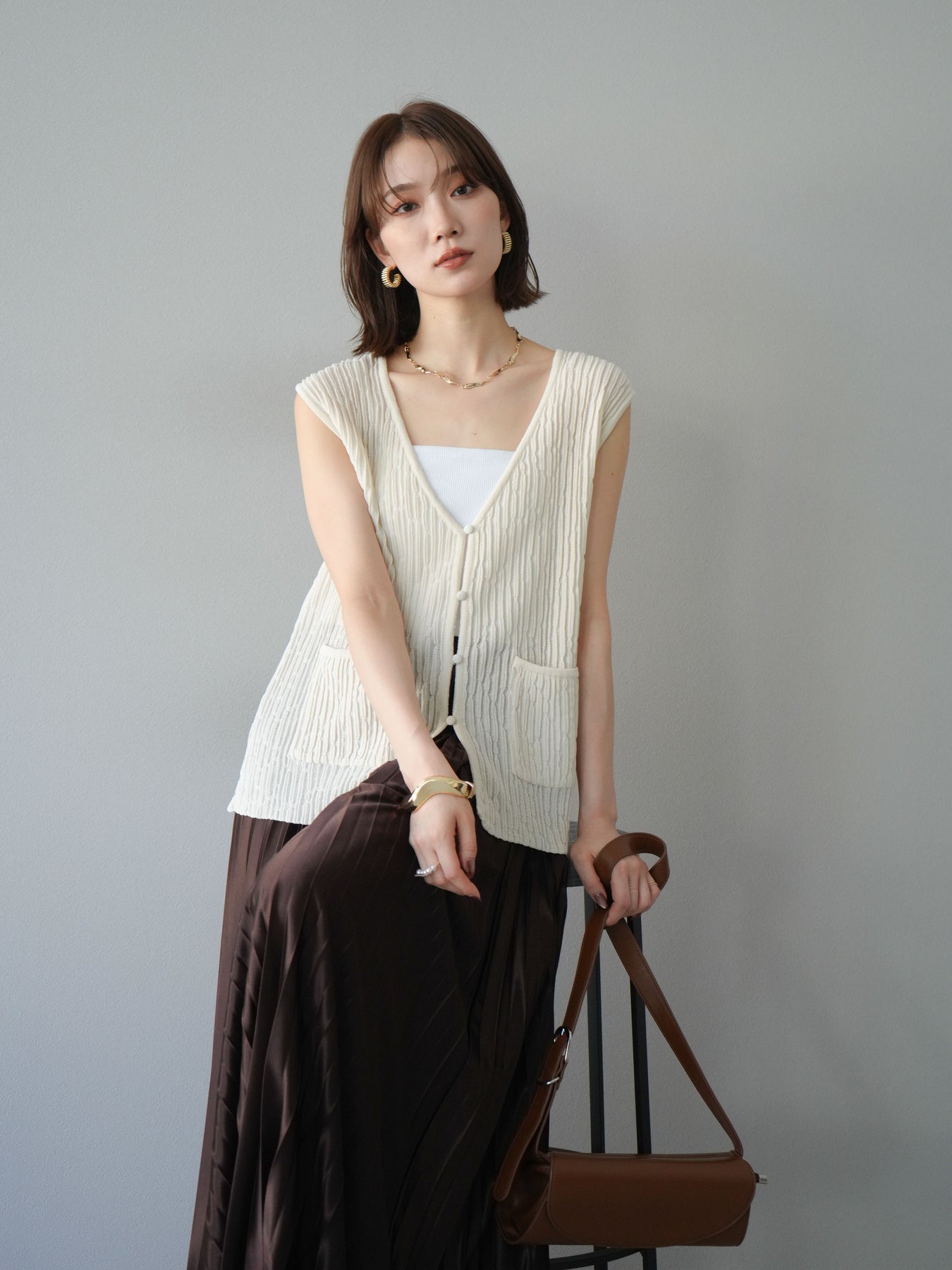 清涼夏日針織背心,飾有精緻的波浪針織圖案。輕薄的材質,營造出春夏氣息,簡約卻不失精緻。 正面飾有包扣和口袋,細節展現精緻。只需內搭T卹或吊帶背心,即可打造層次感十足的造型。 這是您想要添加到夏季衣櫃中的物品,因為它可以在工作時和下班時穿著。 ※除下裝、吊帶背心(內衣)以外的商品均不含內衣。