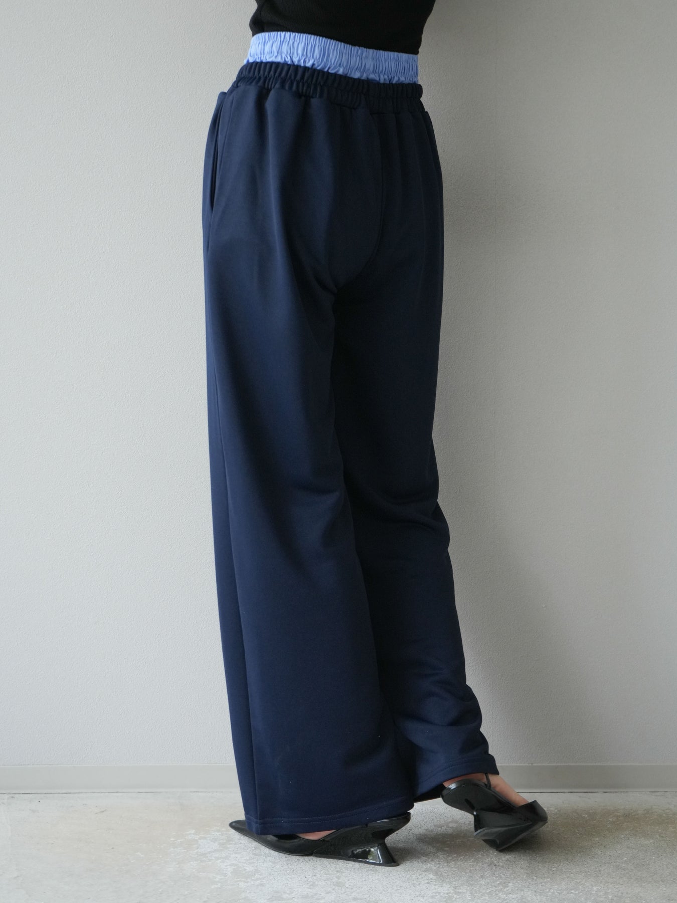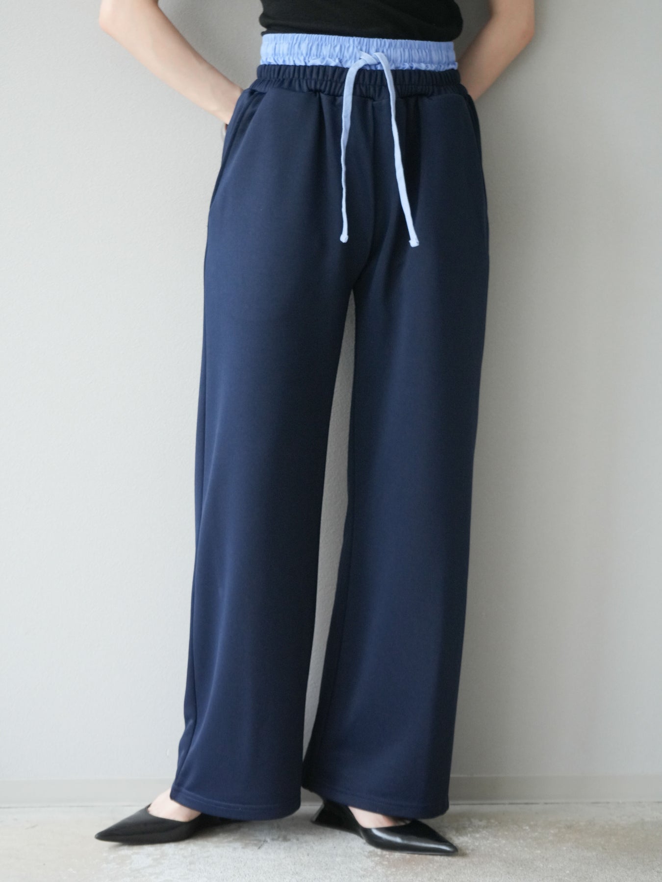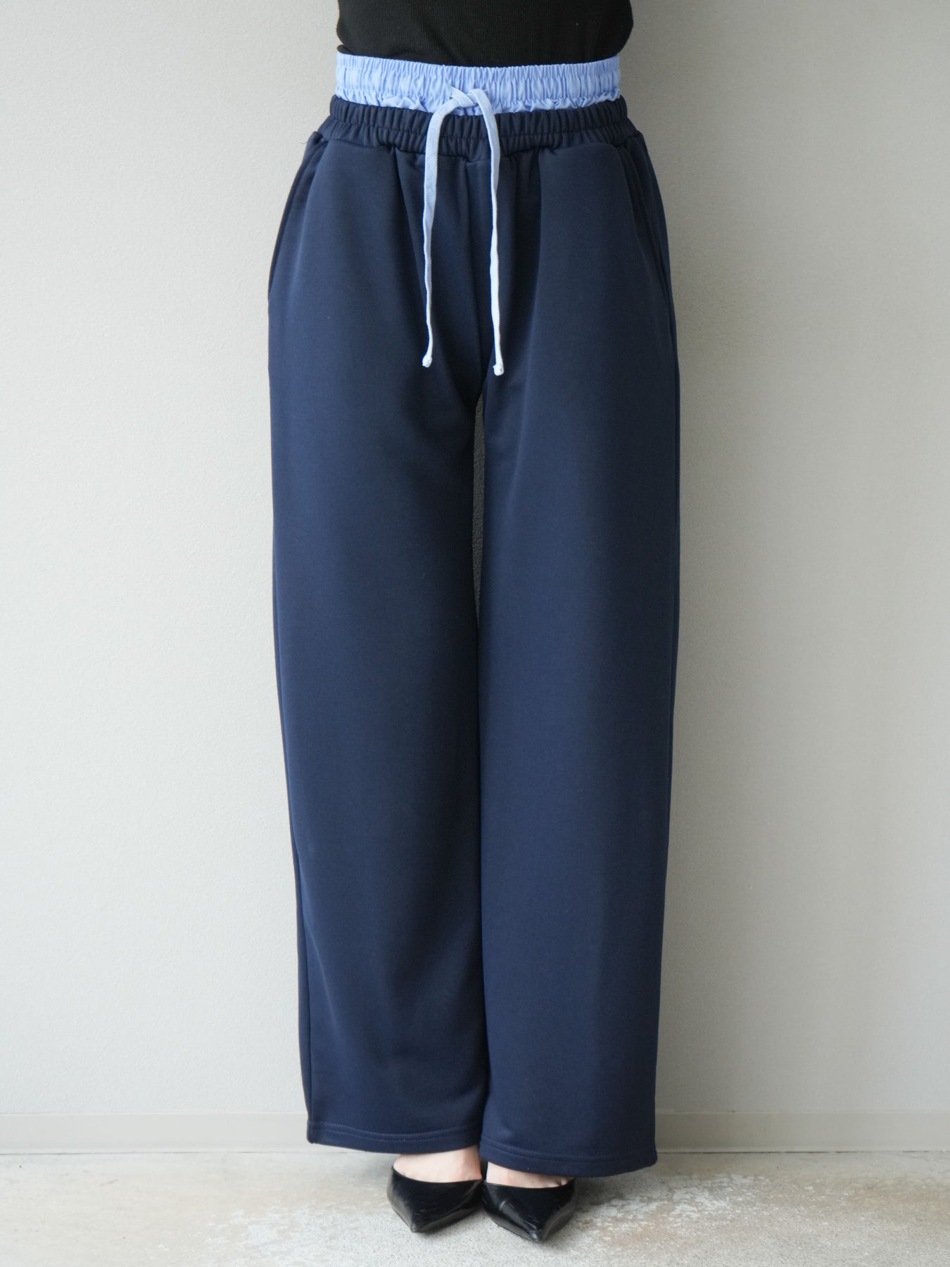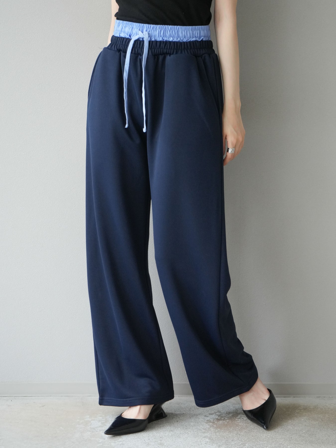 リラックス感漂うワイドシルエットのスウェットパンツに、ダブルウエストデザインを取り入れた一枚。ウエスト部分から覗くレイヤード風の仕様がスタイリングにアクセントを加え、シンプルなトップスと合わせるだけでこなれ感を演出します。柔らかなスウェット素材で快適な穿き心地を叶えつつ、落ち感のあるシルエットが脚のラインをすっきりと見せてくれるのも魅力。デイリーにはもちろん、トレンドを意識したカジュアルスタイルやリラックスシーンにも活躍する万能なアイテムです。