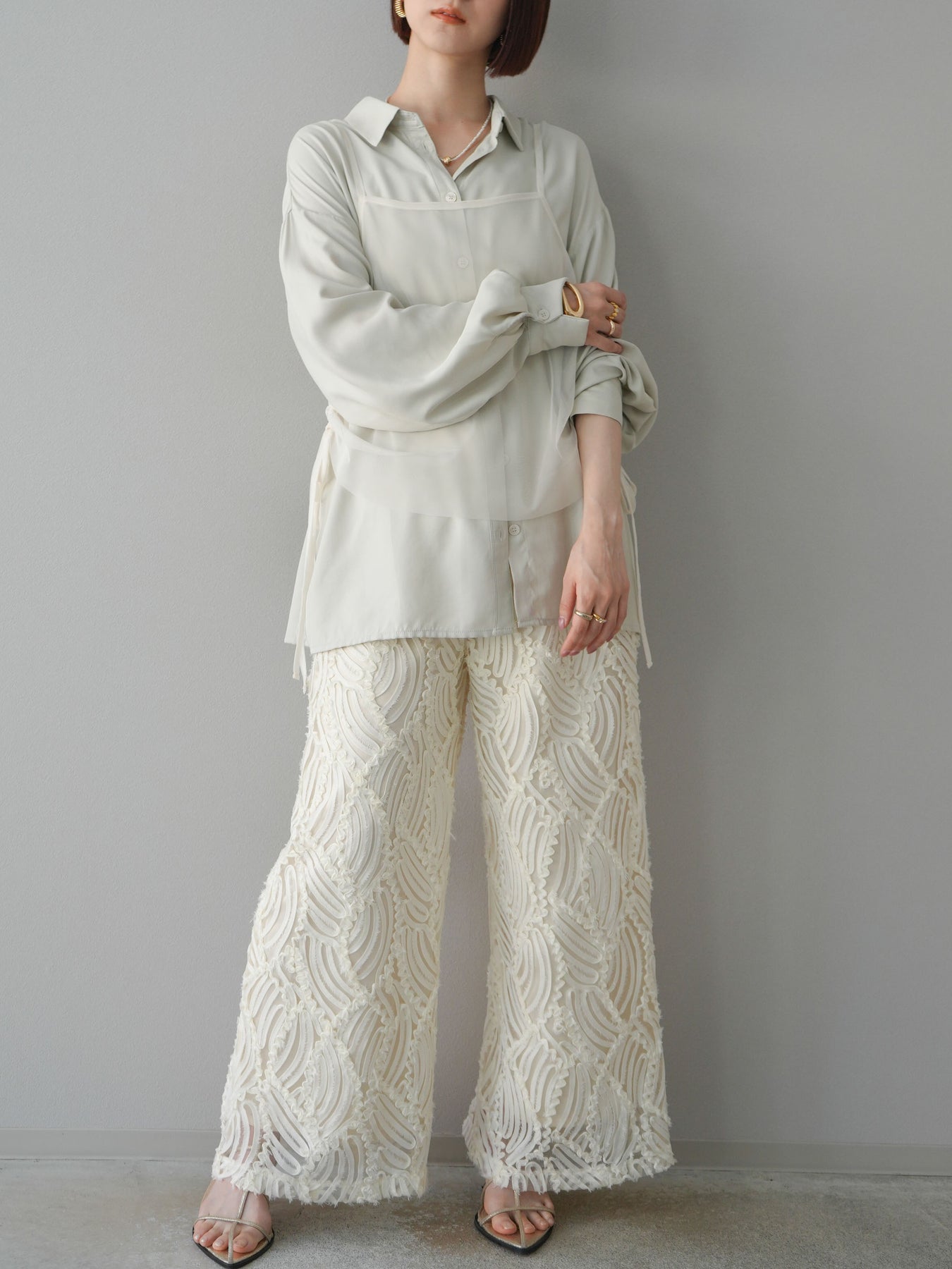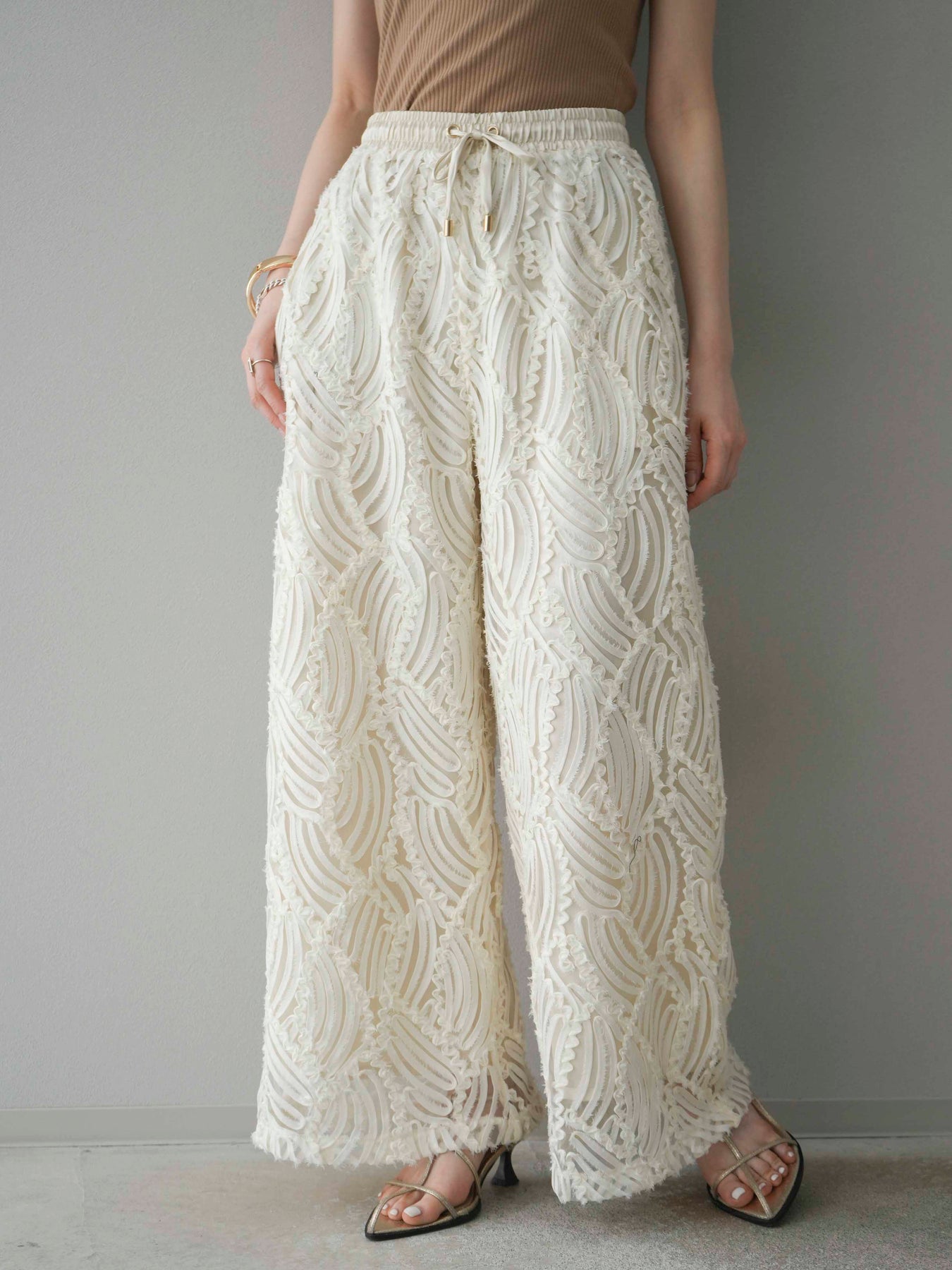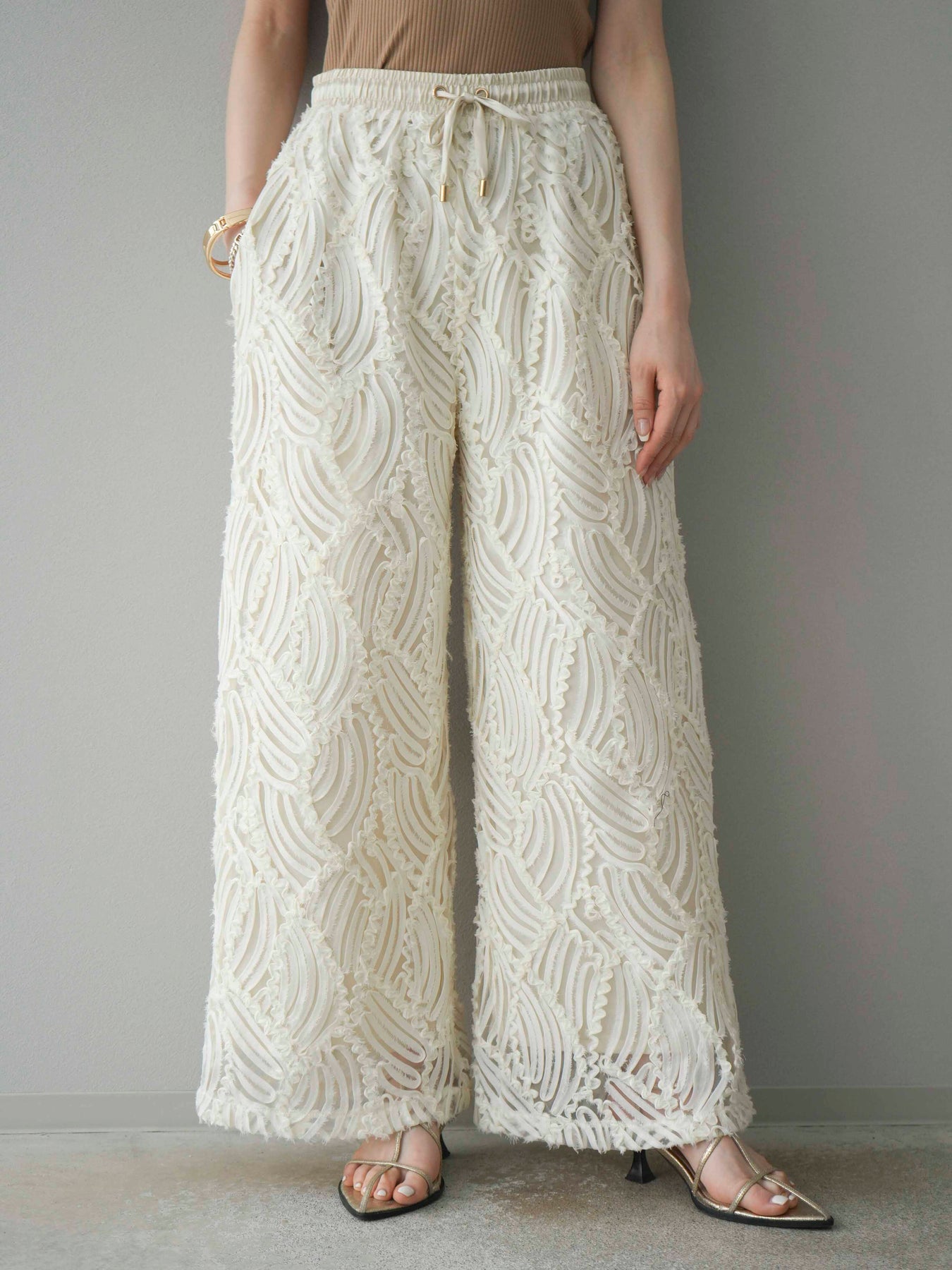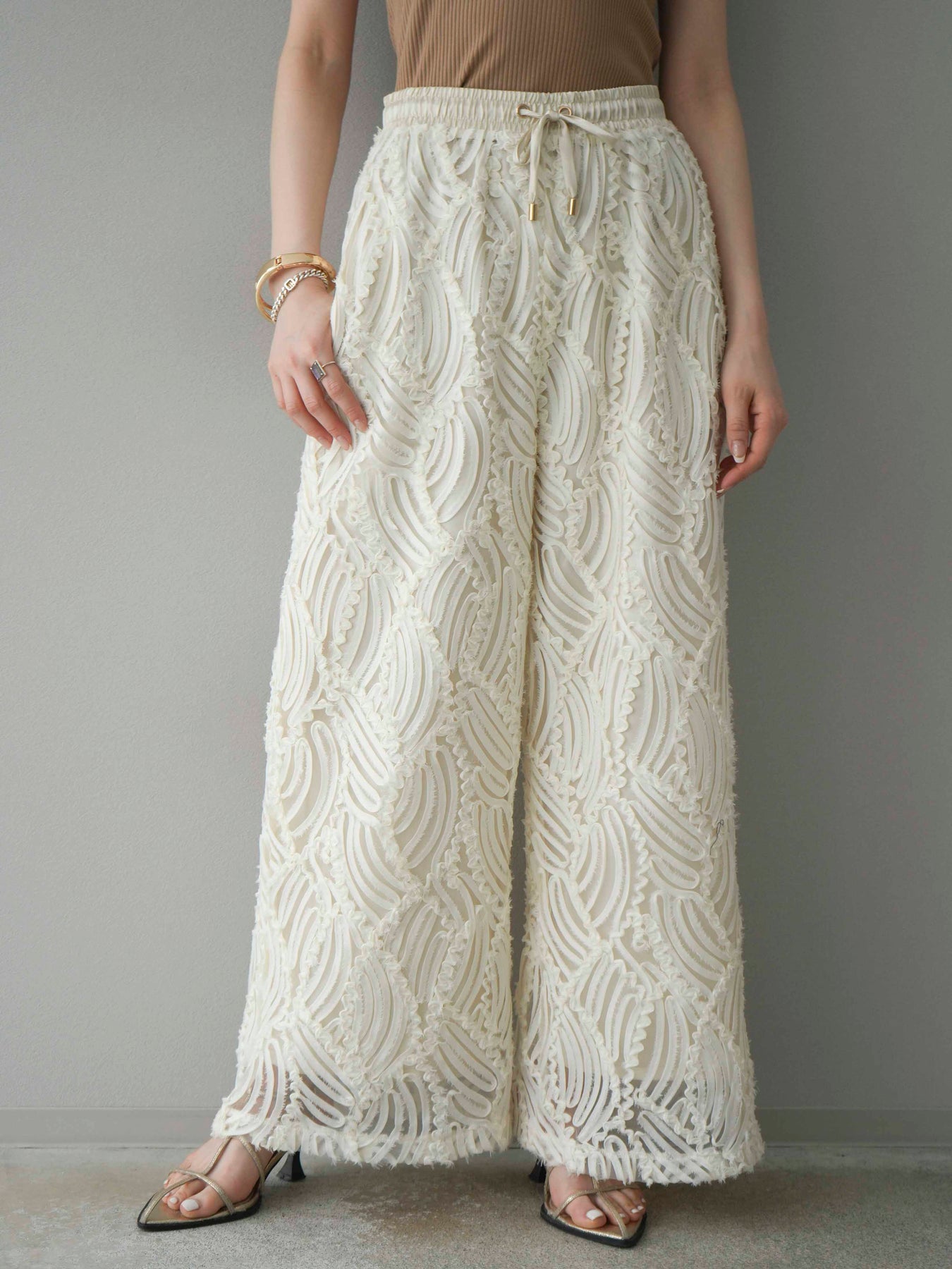 這款寬褲採用時尚的透明提花布料製成。它擁有精緻的透視感和立體感,營造出輕盈靈活的輪廓。抽繩腰帶設計帶來舒適貼合的穿搭體驗,打造輕鬆休閒的造型。搭配簡約上衣,即可打造精緻造型。我們也推薦成套穿著。 ※除下裝、吊帶背心(內衣)以外的商品均不含內衣。