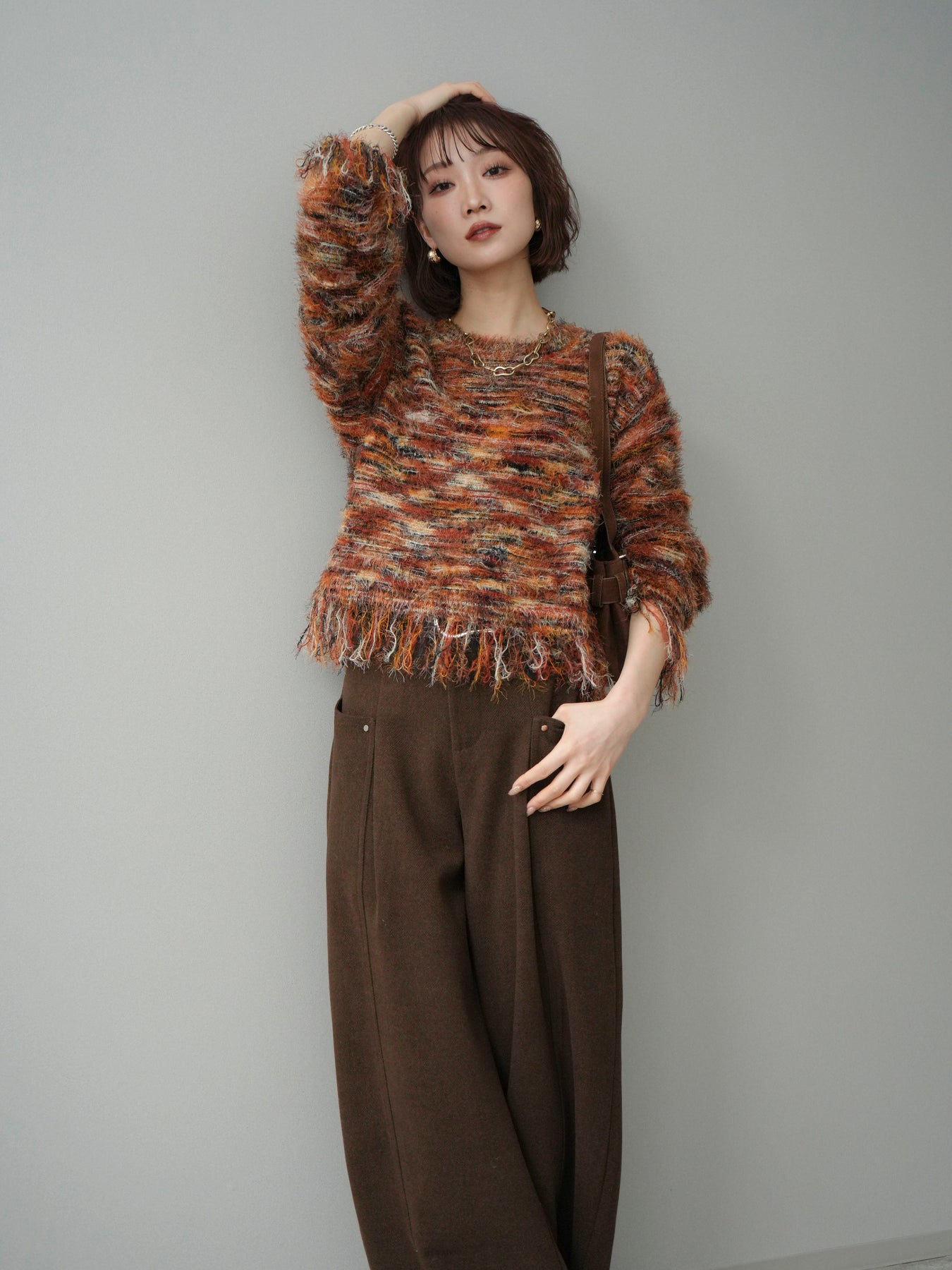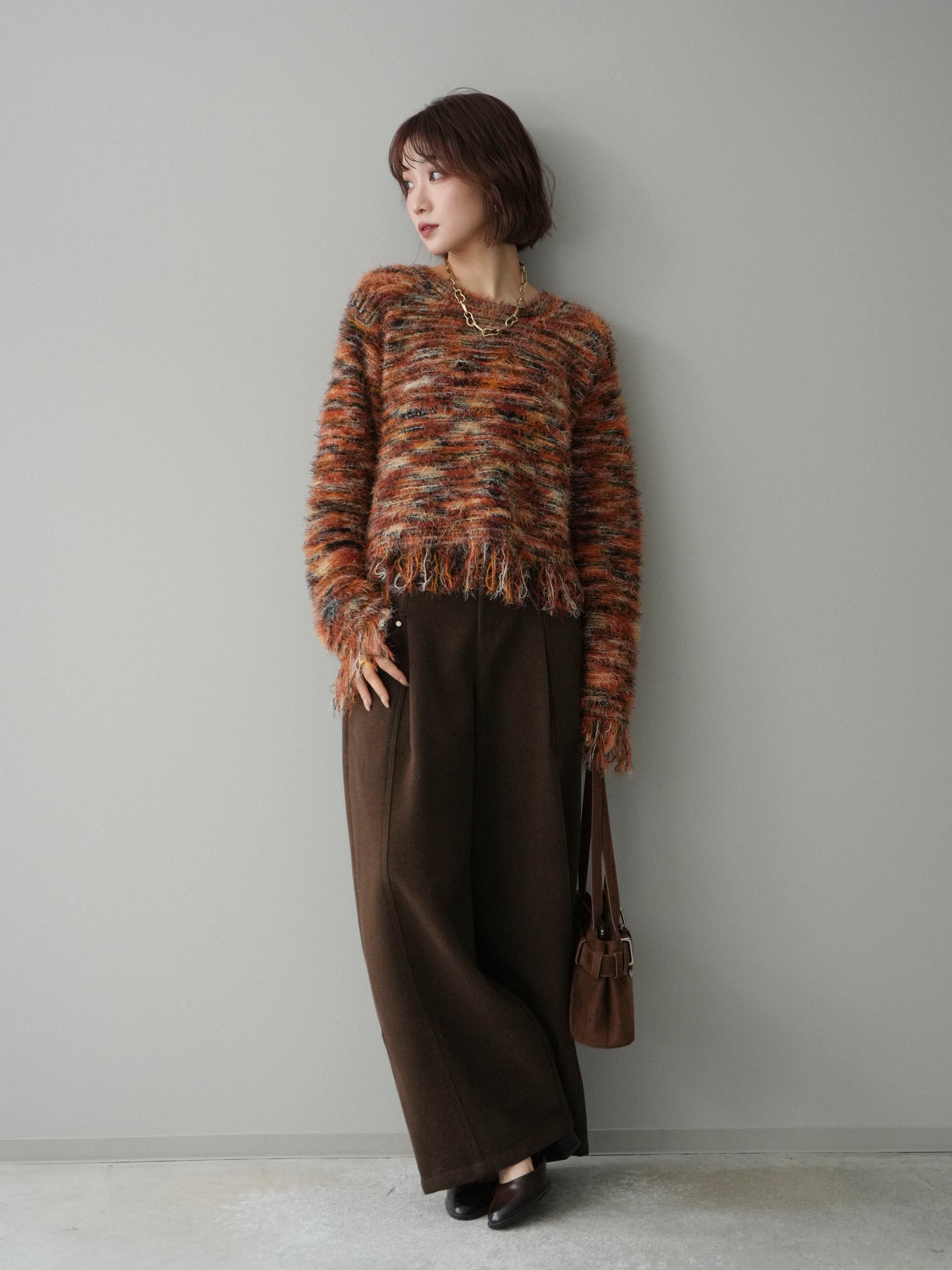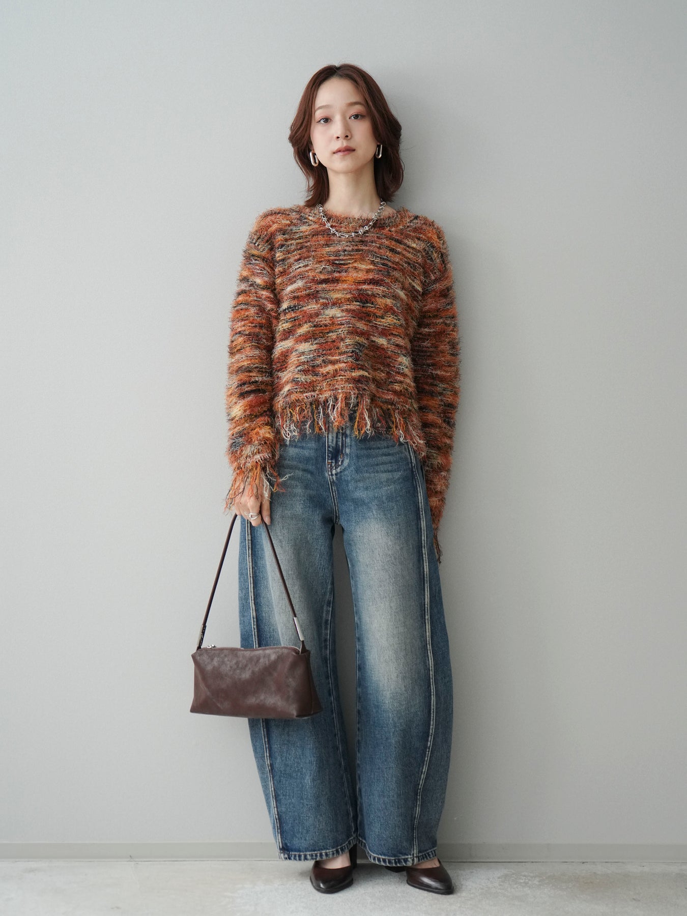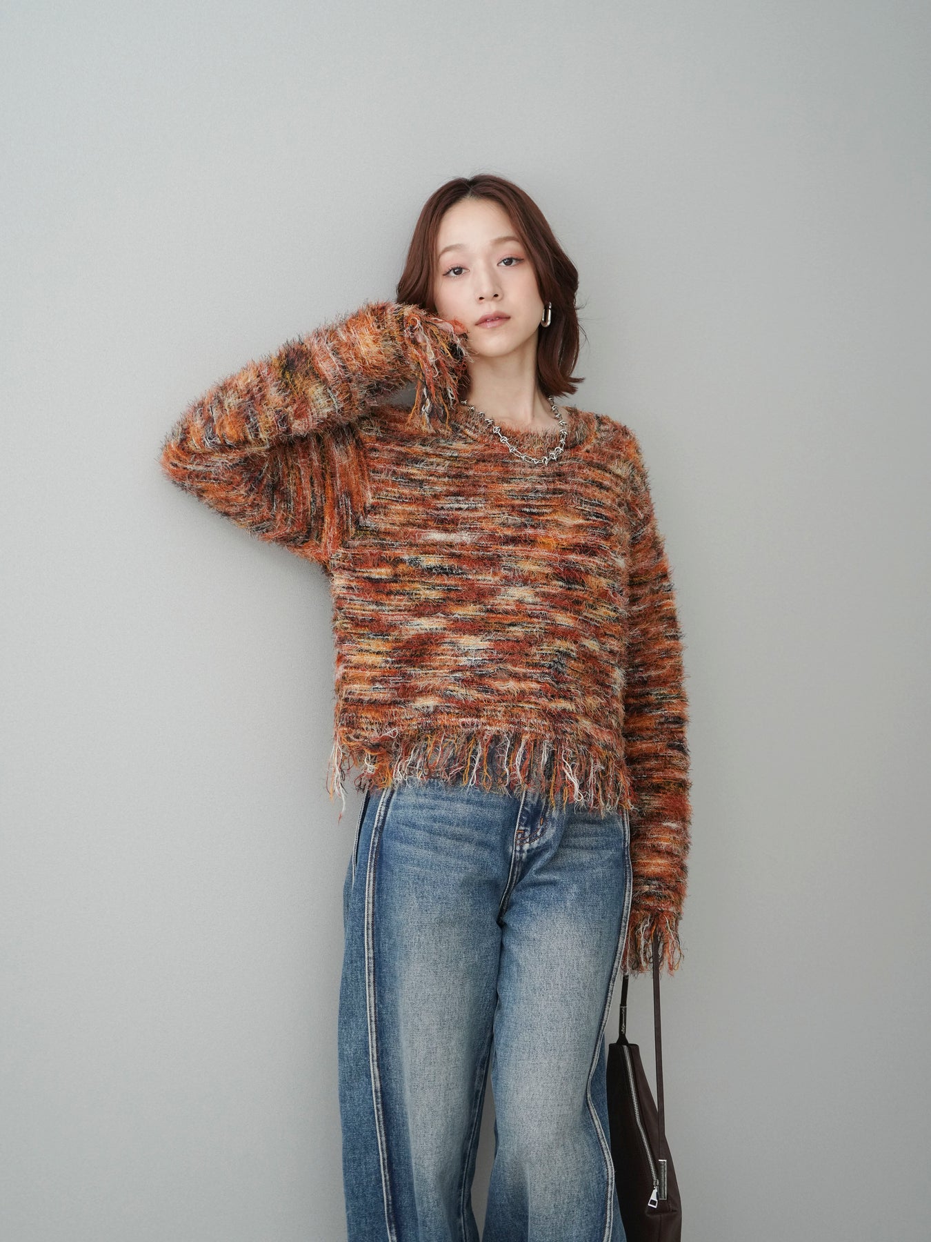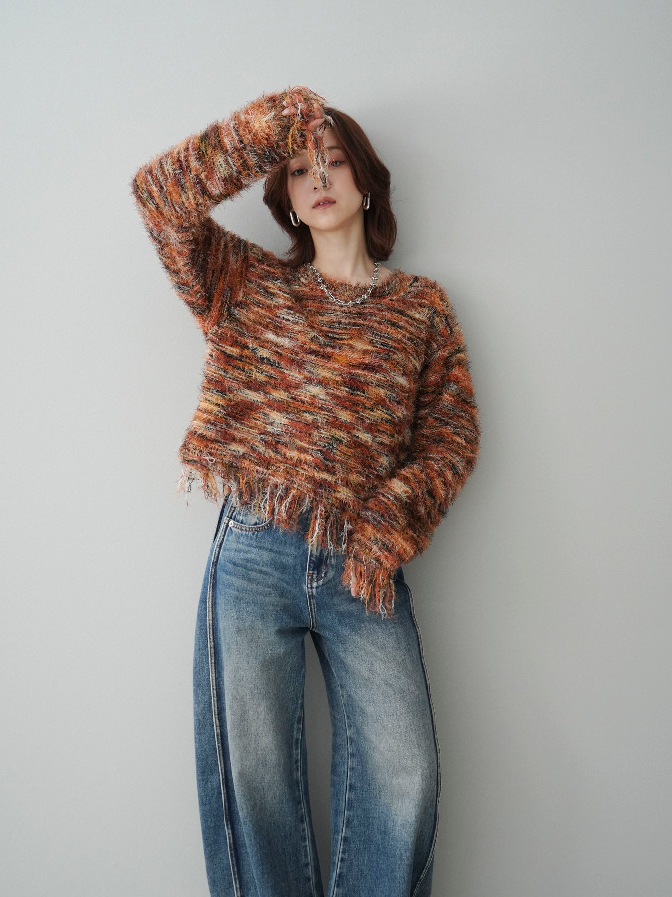 ざっくりと編まれたミックスヤーンが魅力的なシャギーニットプルオーバー。 ランダムな糸の色合いが立体感と表情をプラスし、着るだけでスタイリングが華やかに。 裾に施されたフリンジが軽やかな抜け感を演出し、トレンド感のあるリラックスシルエットでこなれた印象に。 デニムと合わせたカジュアルなスタイリングから、ロングスカートを合わせた女性らしい着こなしまで幅広く活躍します。