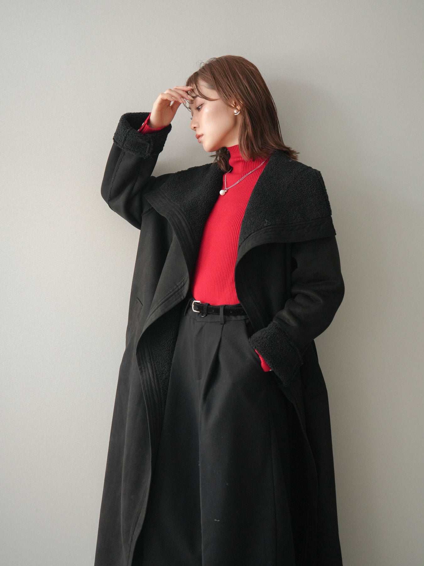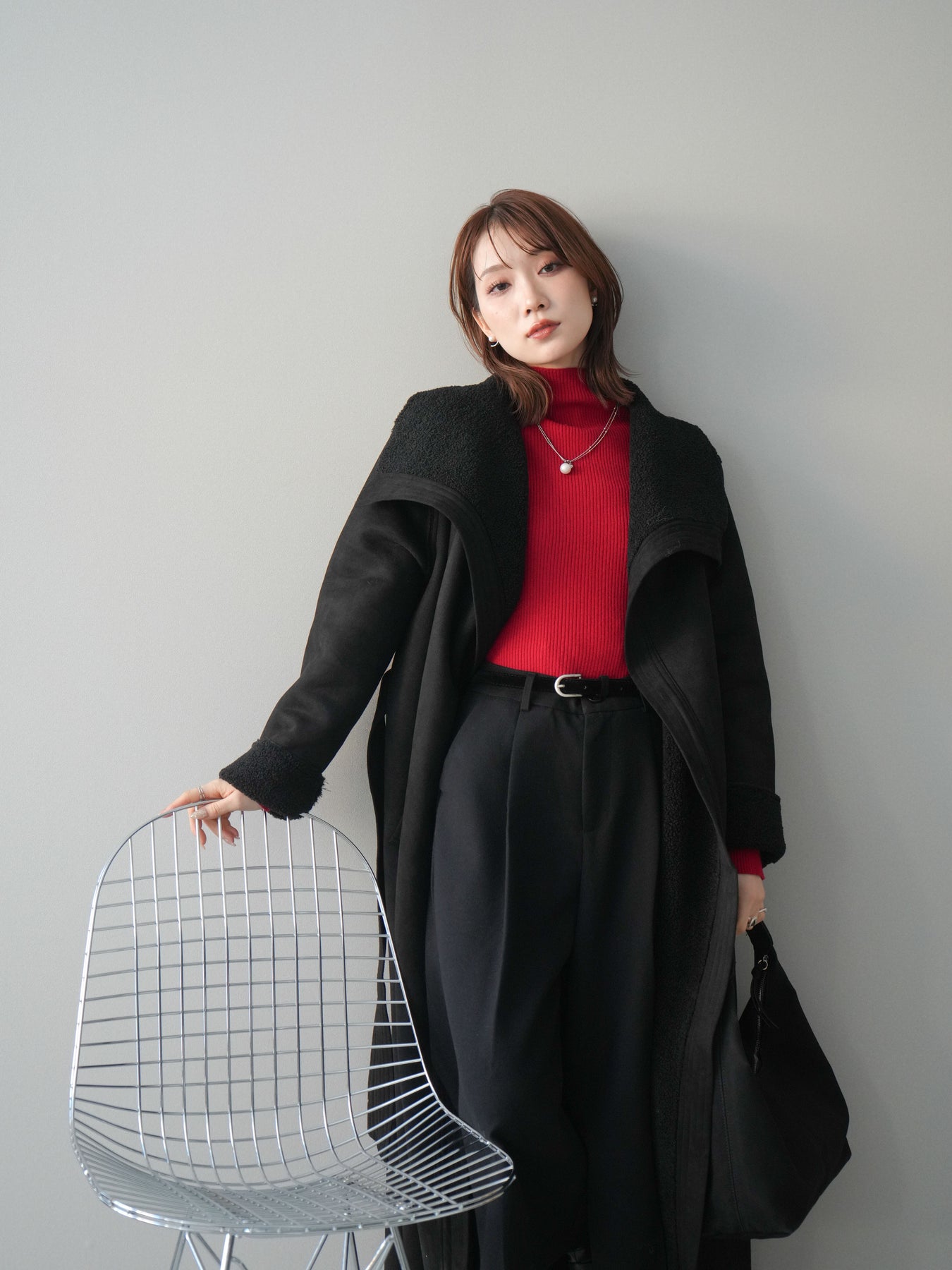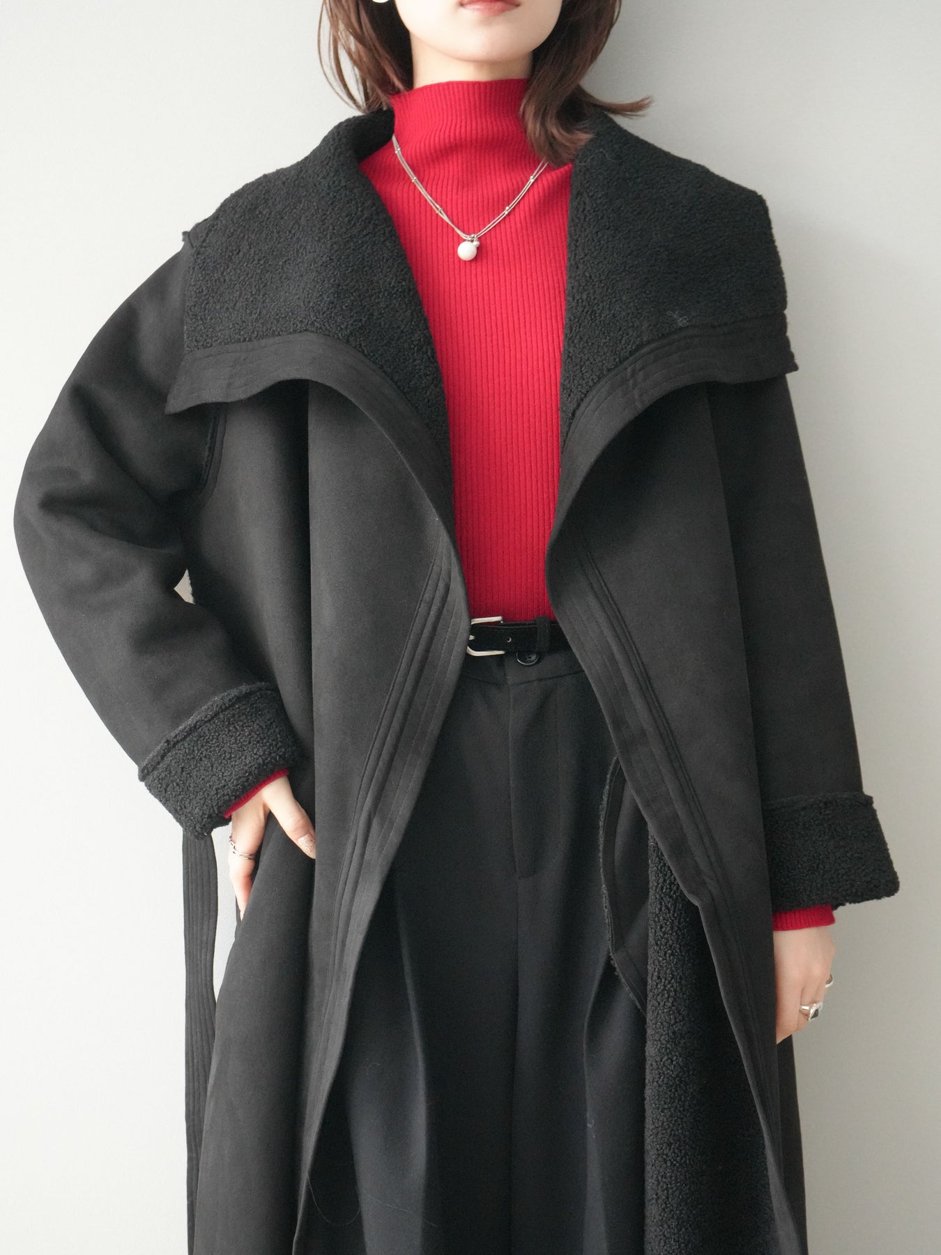 存在感のあるビッグカラーが視線を惹きつけるムートンコート。ふんわりと柔らかな肌ざわりと暖かな着心地が魅力で、羽織るだけで冬のスタイルを上品かつリラックスムードに仕上げてくれます。しっかりとした厚みがありながらも軽やかに着られるバランスに整え、付属のウエストベルトでシルエットの調整も可能。ラフに羽織って抜け感を出したり、ベルトを締めてフェミニンにまとめたりと、シーンに合わせた着こなしを楽しめる一枚です。存在感がありつつ合わせやすいデザインで、冬のワードローブにぜひ加えたい主役級アウターです。