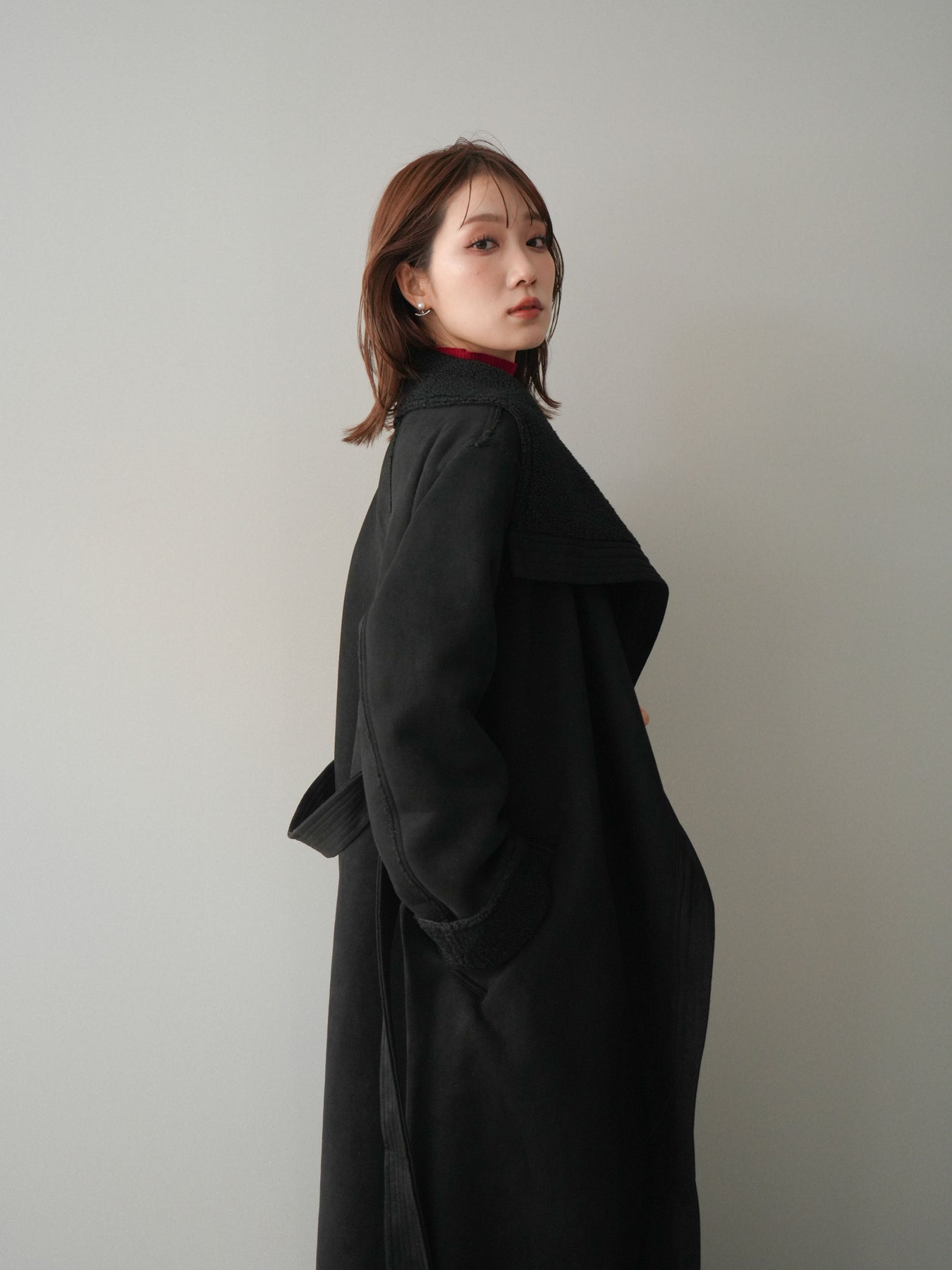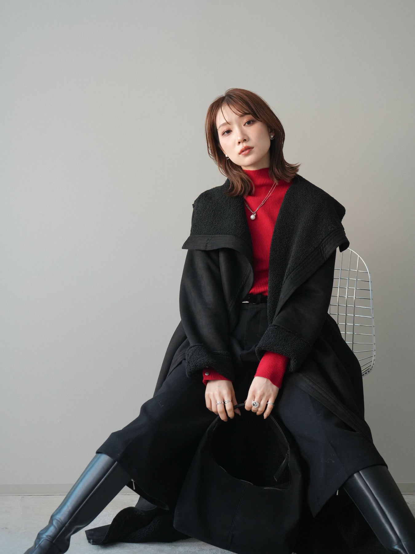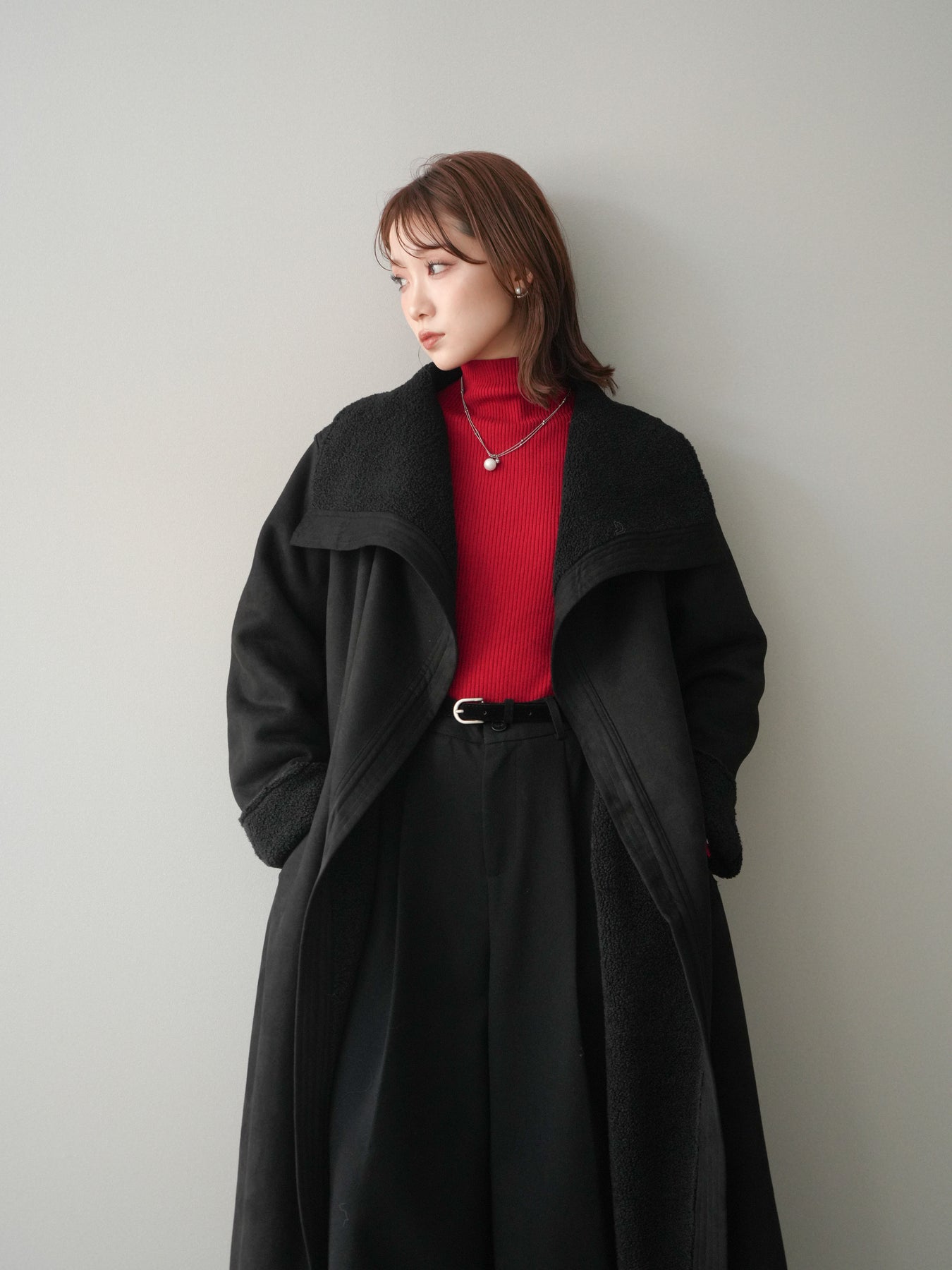 [SET]BIGカラームートンコート+袖ボタンボトルネックリブニットトップス+ベルト付ウールタッチミディアムパンツ(3set)