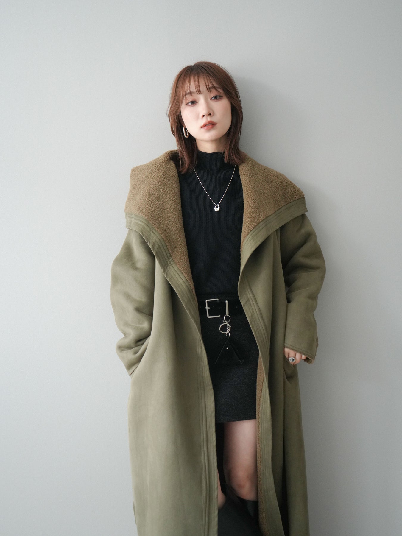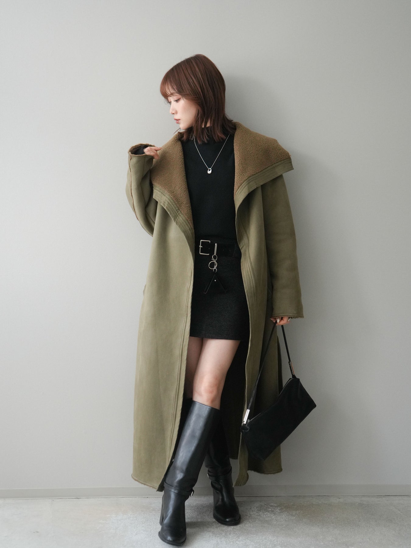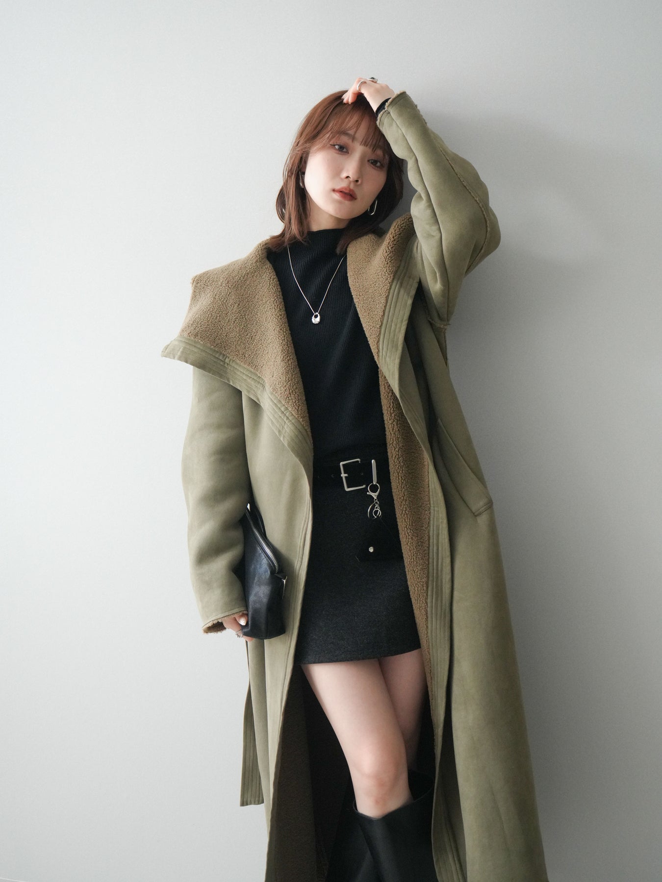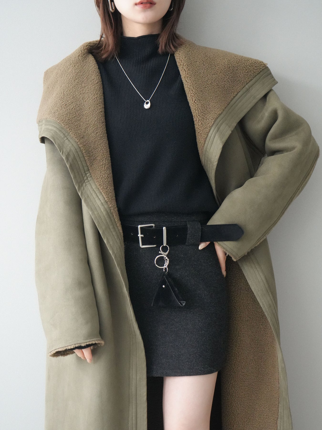 [SET]BIGカラームートンコート+ボトルネック裾カールリブニットトップス+ウールタッチベルト付ミニスカート(3set)