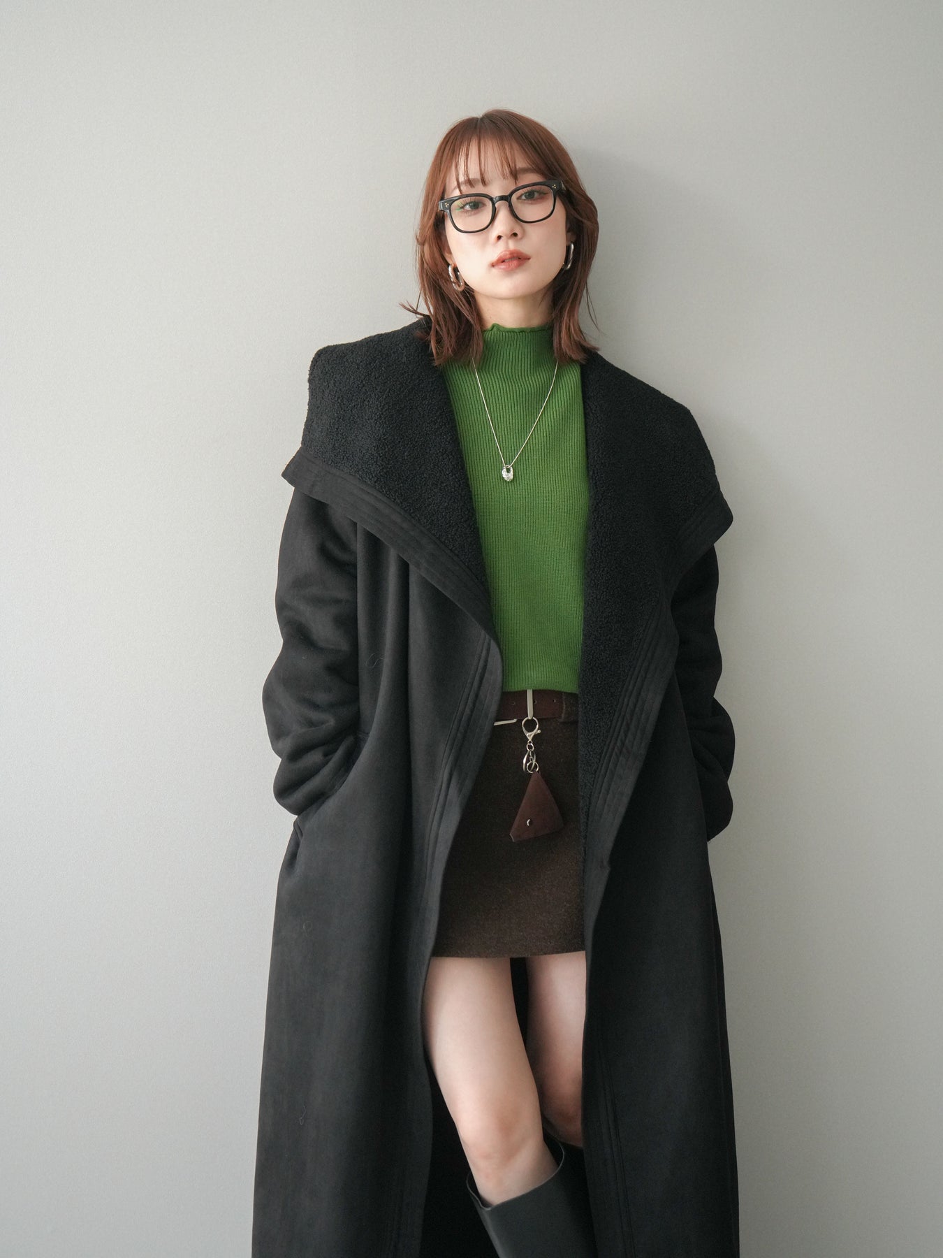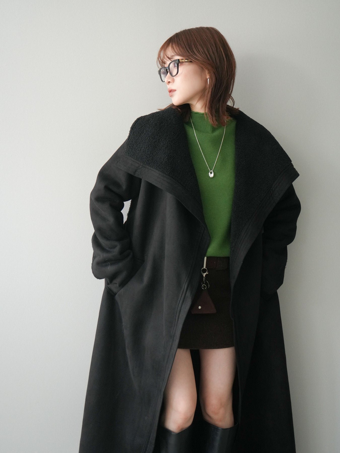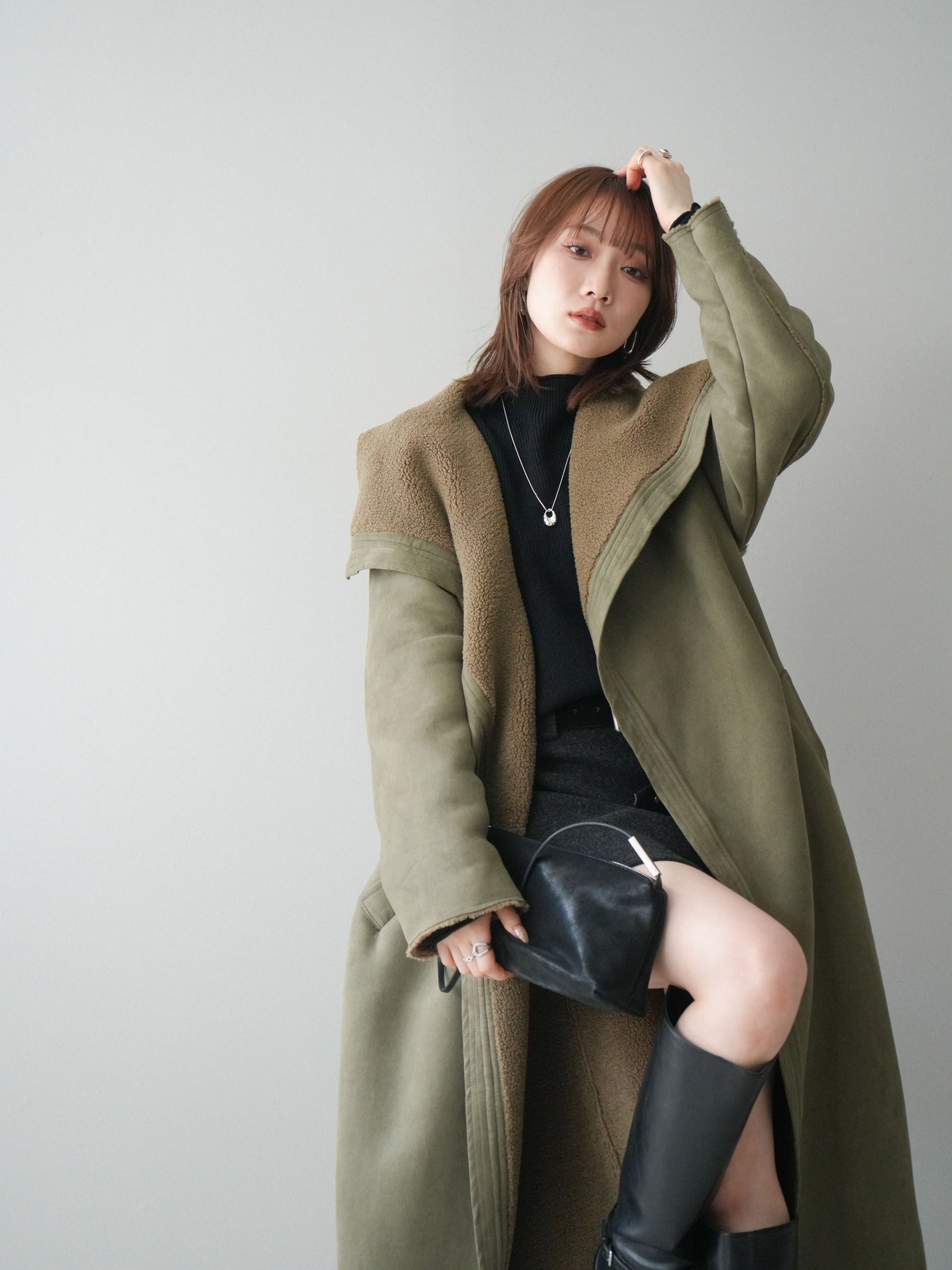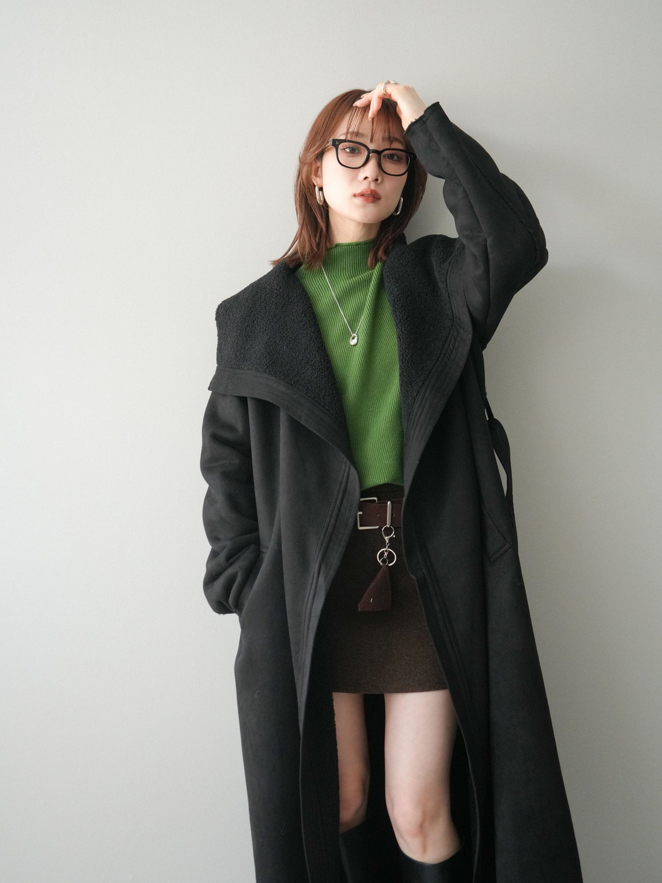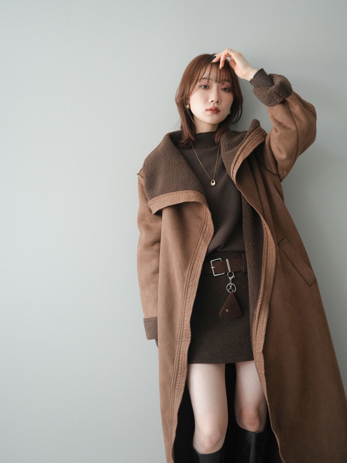 [SET]BIGカラームートンコート+ボトルネック裾カールリブニットトップス+ウールタッチベルト付ミニスカート(3set)