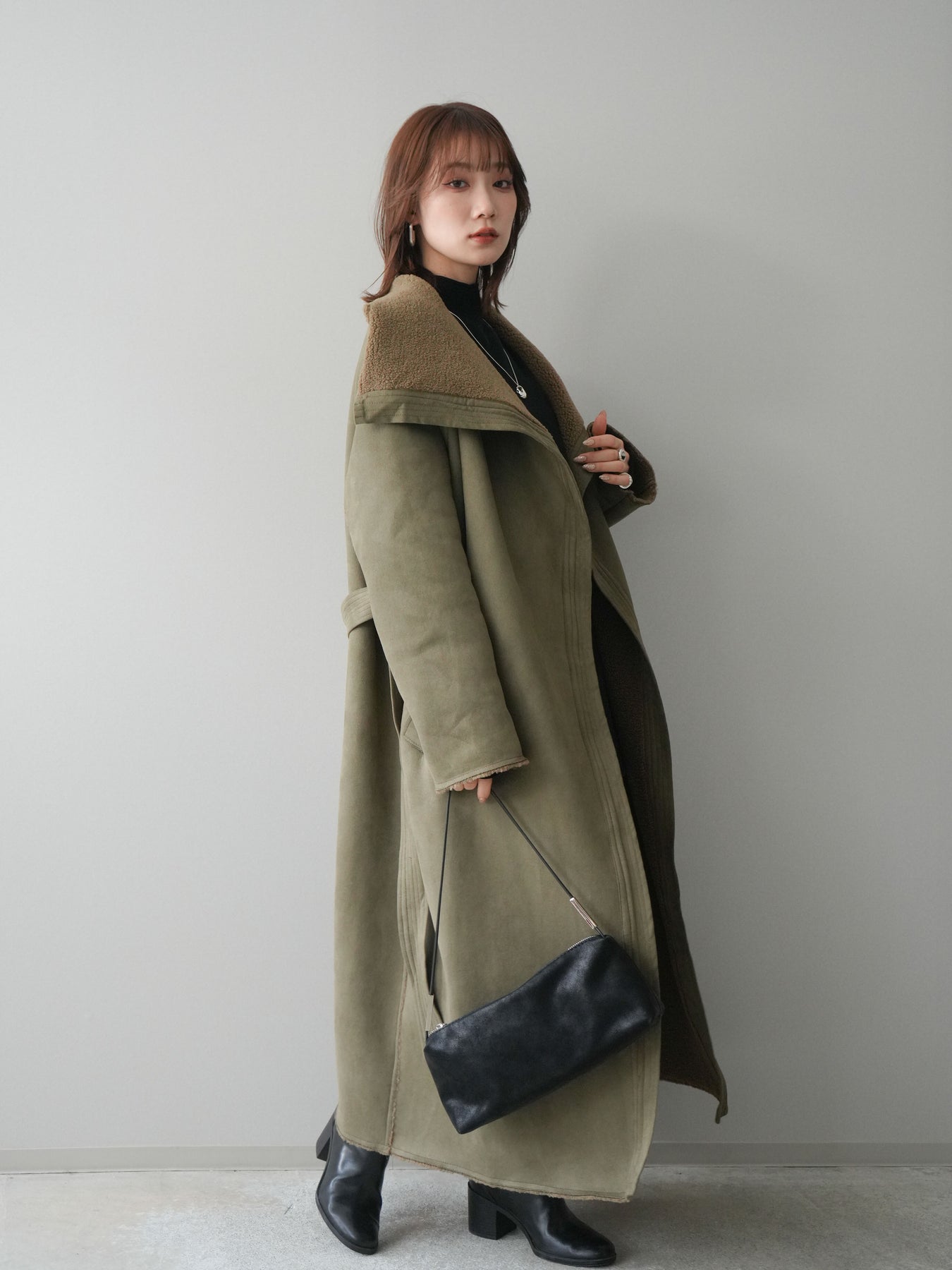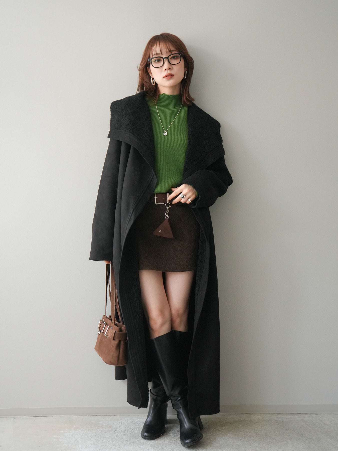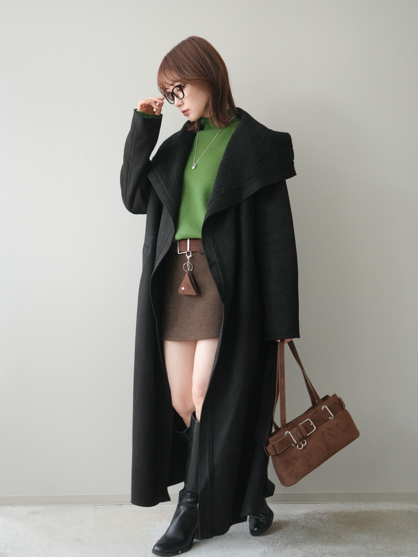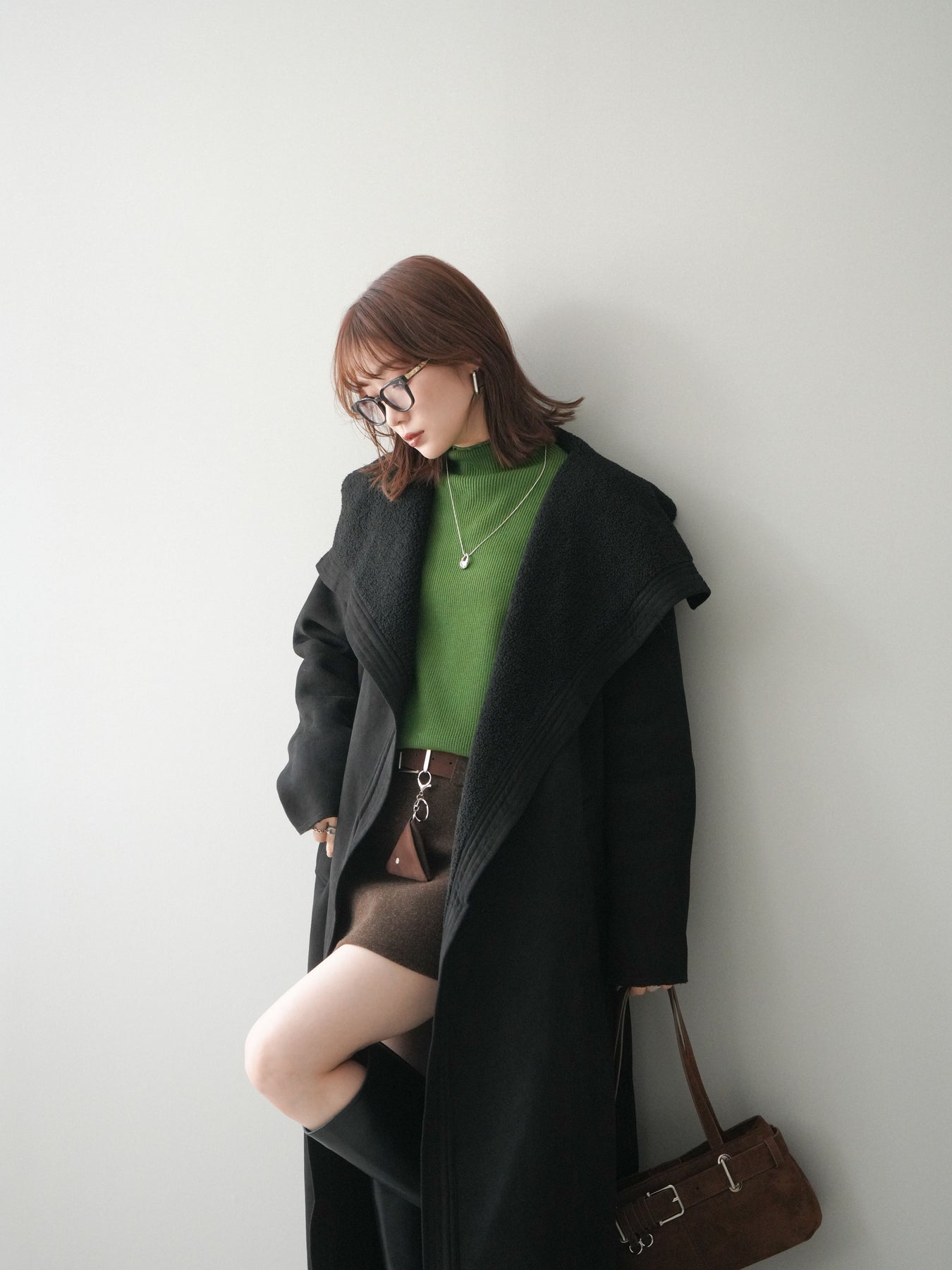 [SET]BIGカラームートンコート+ボトルネック裾カールリブニットトップス+ウールタッチベルト付ミニスカート(3set)