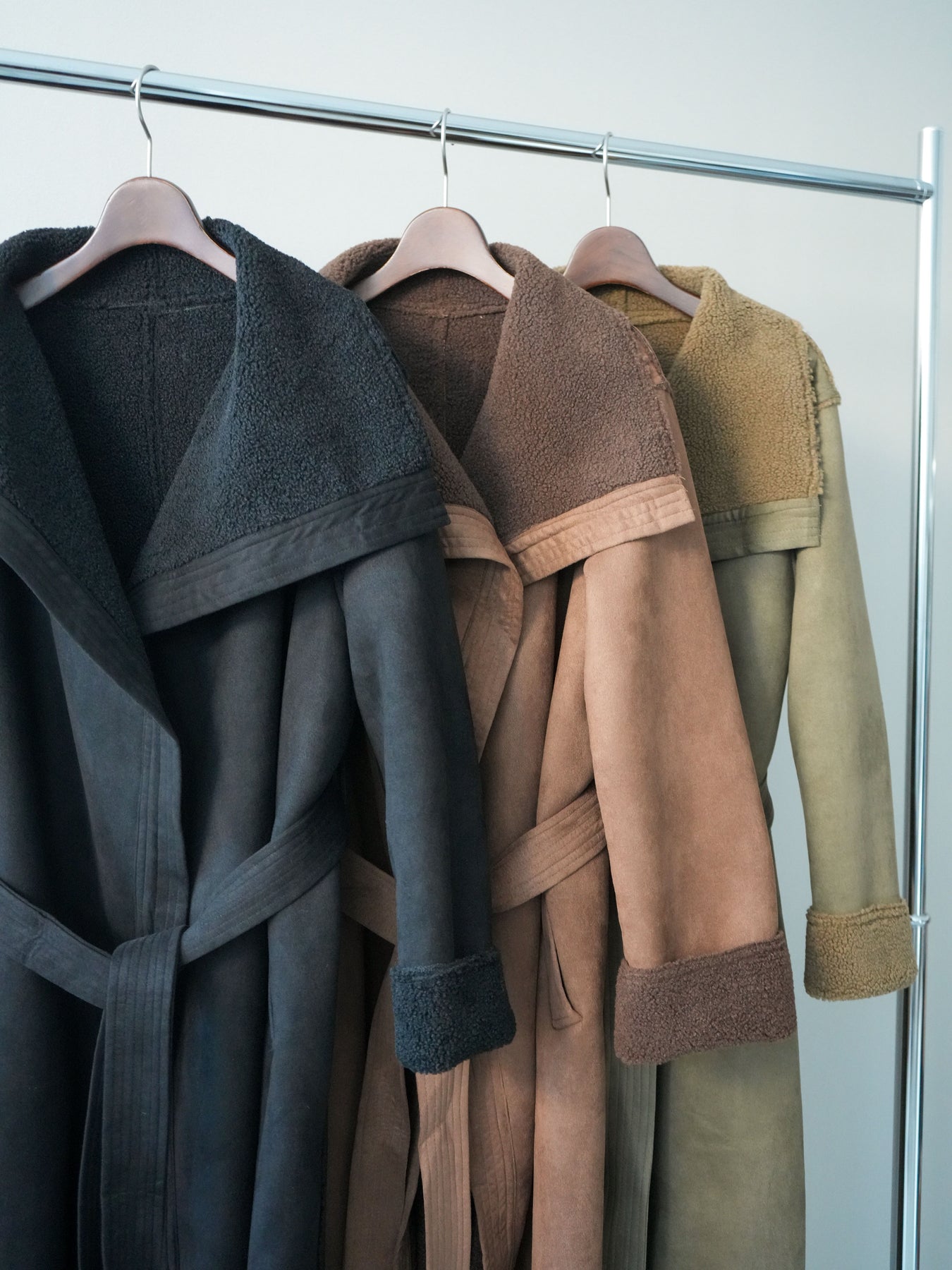 肩幅46cm バスト118cm アームホール50cm 袖丈61cm 袖口32cm 着丈124cm ベルト全長186cm 裏地あり 透け感なし 伸縮性なし サイドポケットあり