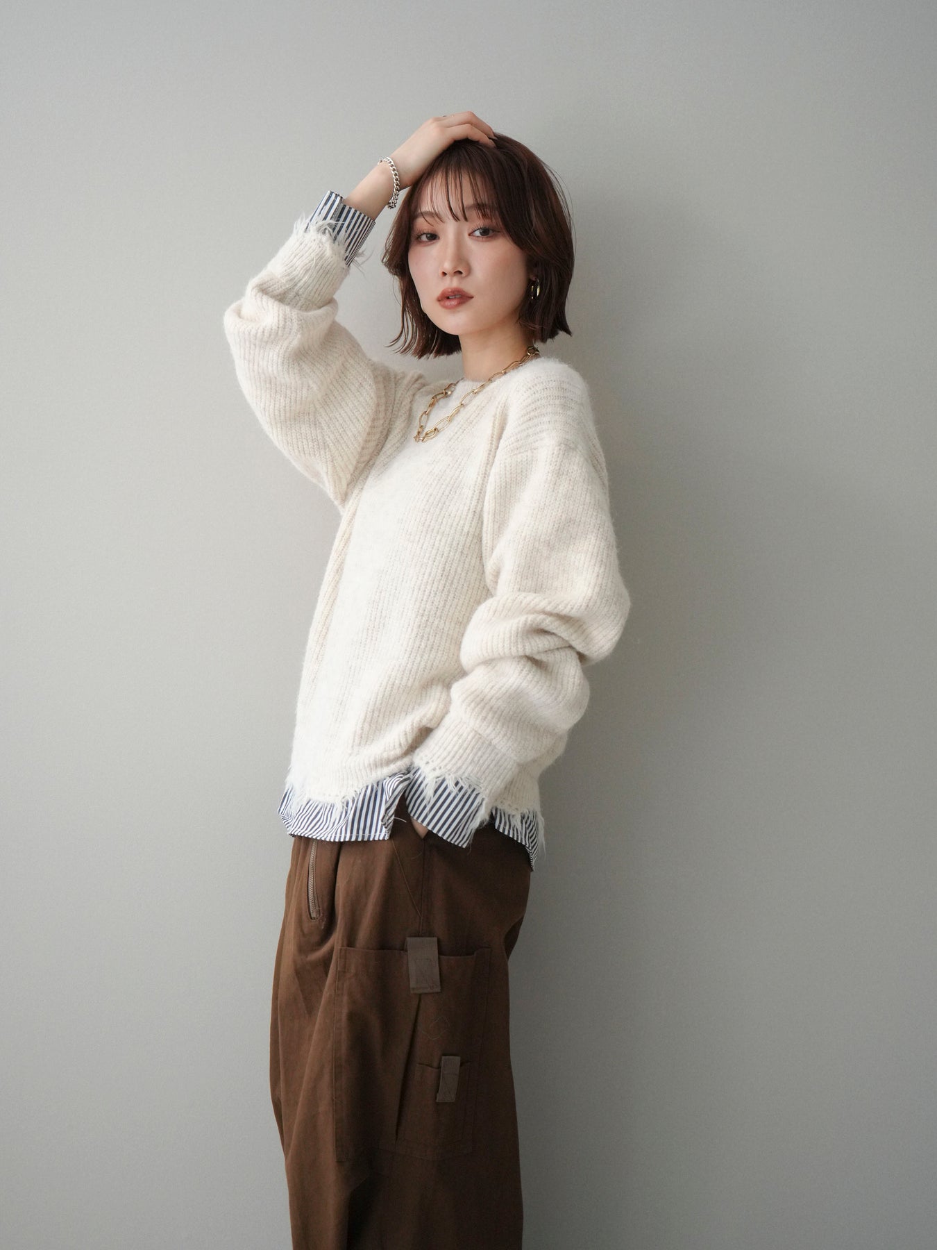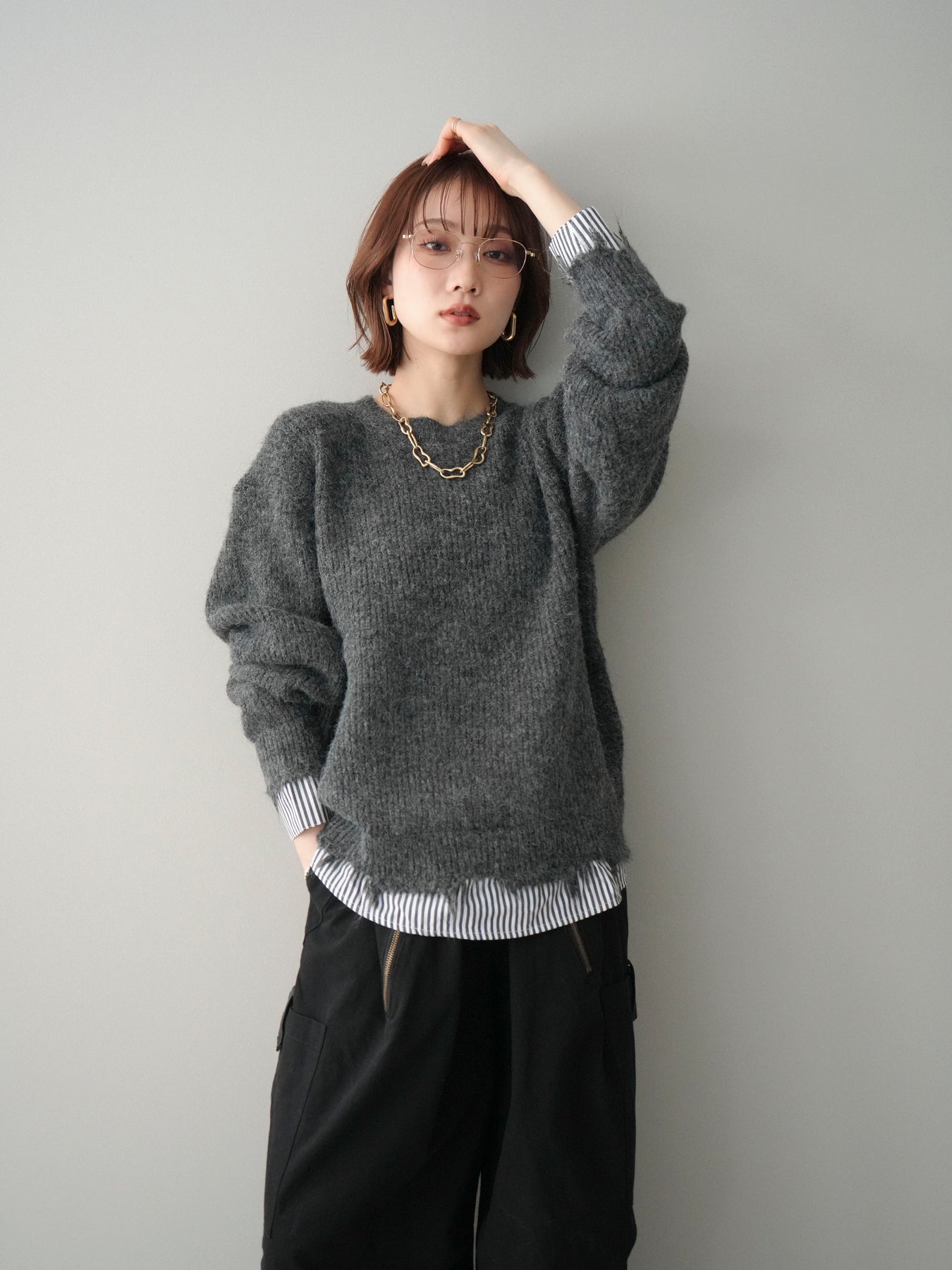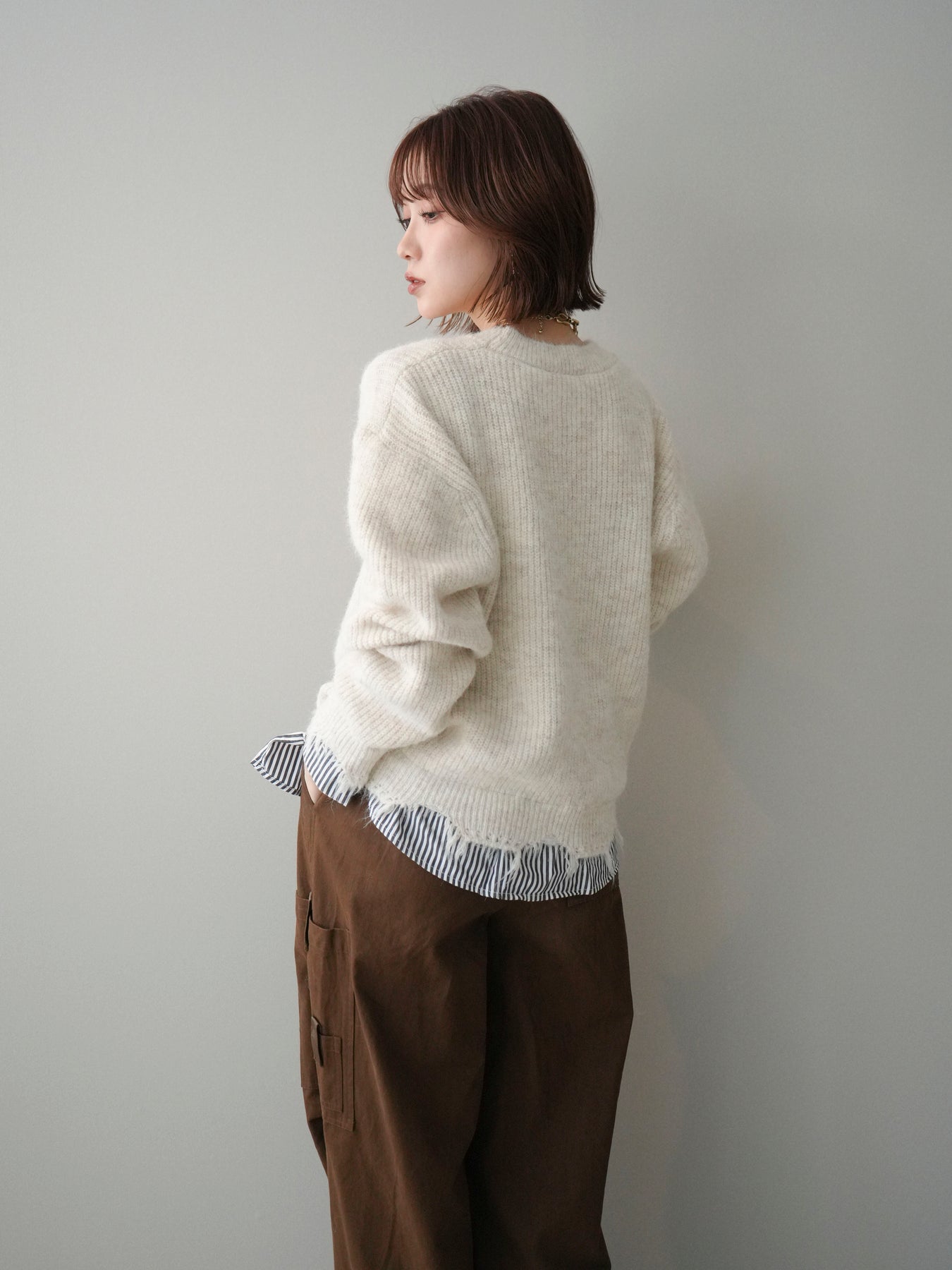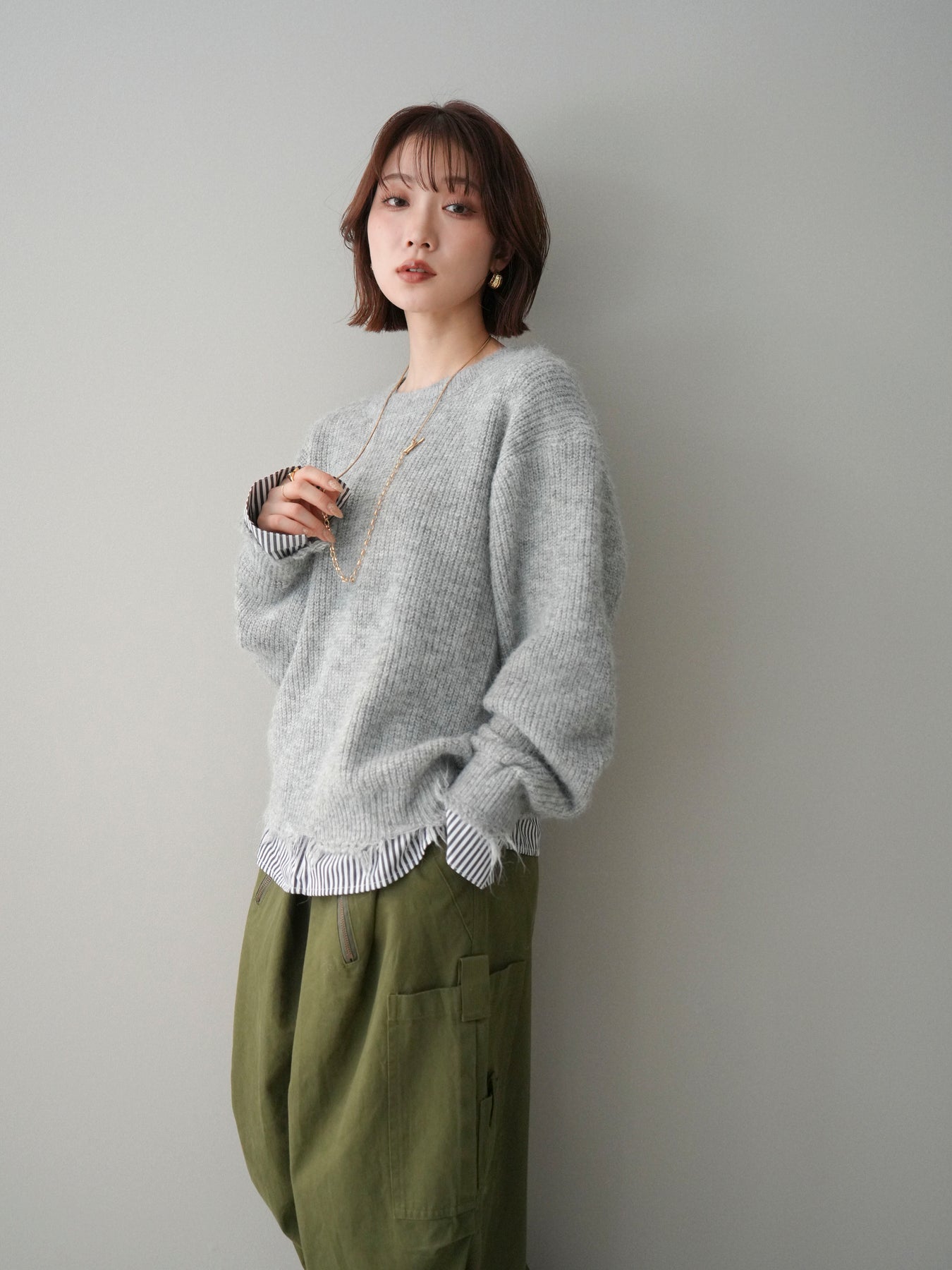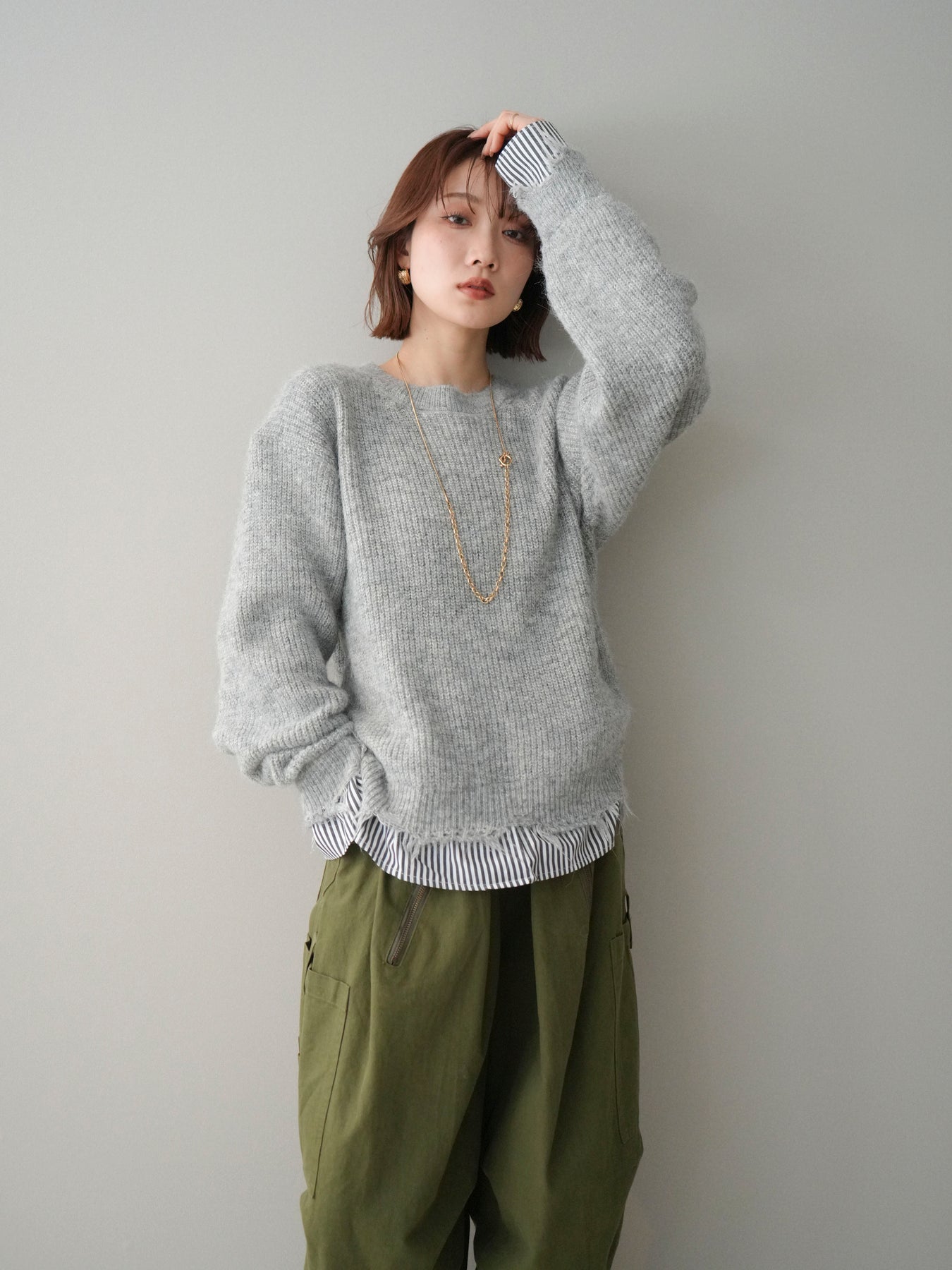 ニットとシャツを重ね着したようなデザインが一枚で完成するレイヤード風プルオーバー。 程よく施されたダメージ加工がこなれた印象を与え、シンプルながらもスタイリングに奥行きをプラスします。 ゆったりとしたシルエットでリラックス感があり、さっと着るだけでバランスの取れたコーディネートに。 ニットの柔らかな風合いと、裾から覗くシャツデザインのコントラストが大人カジュアルに映える一着です。 ※ボトムス、キャミソール(インナー)以外の商品は一律でインナーは付属していません。