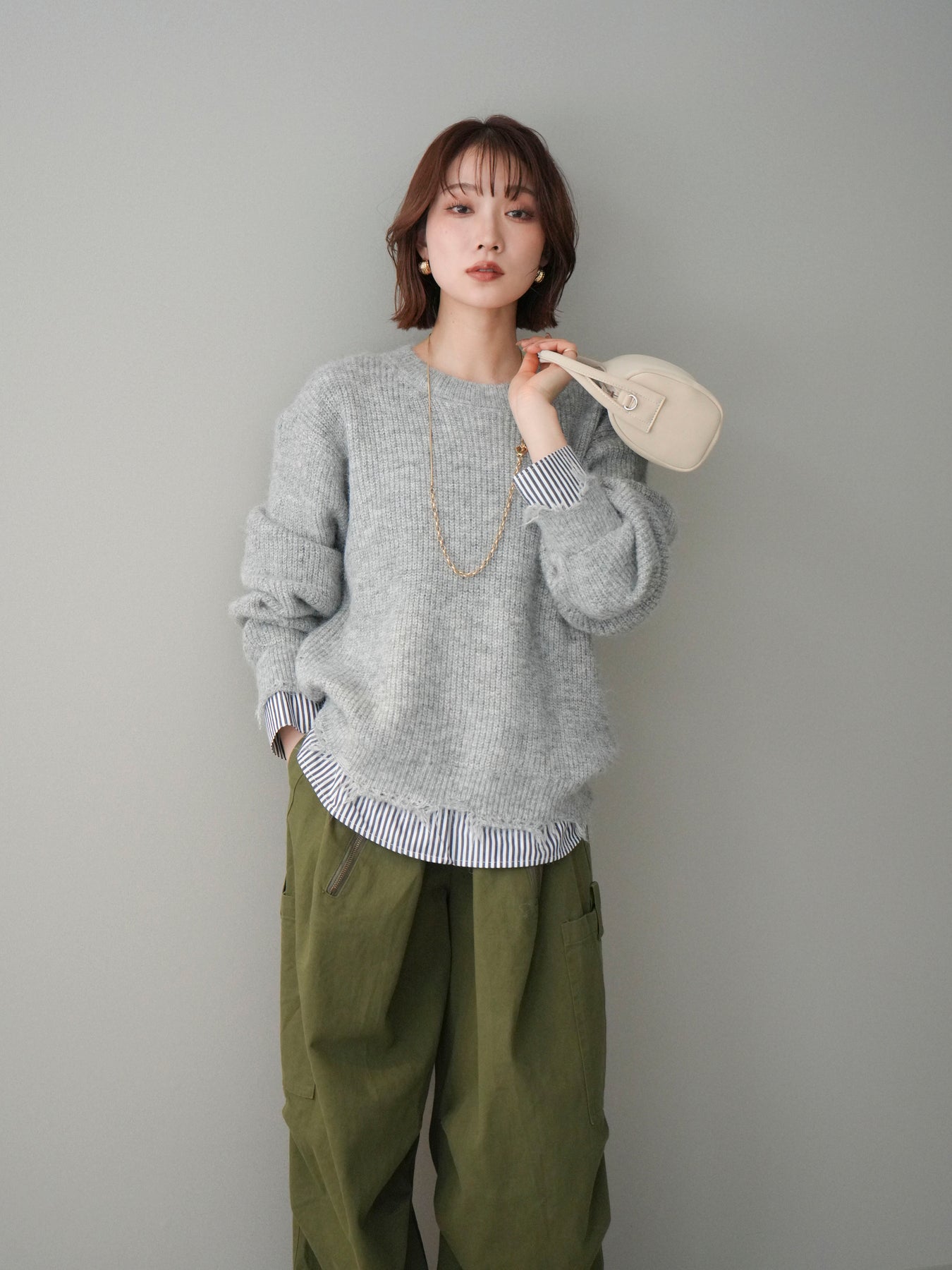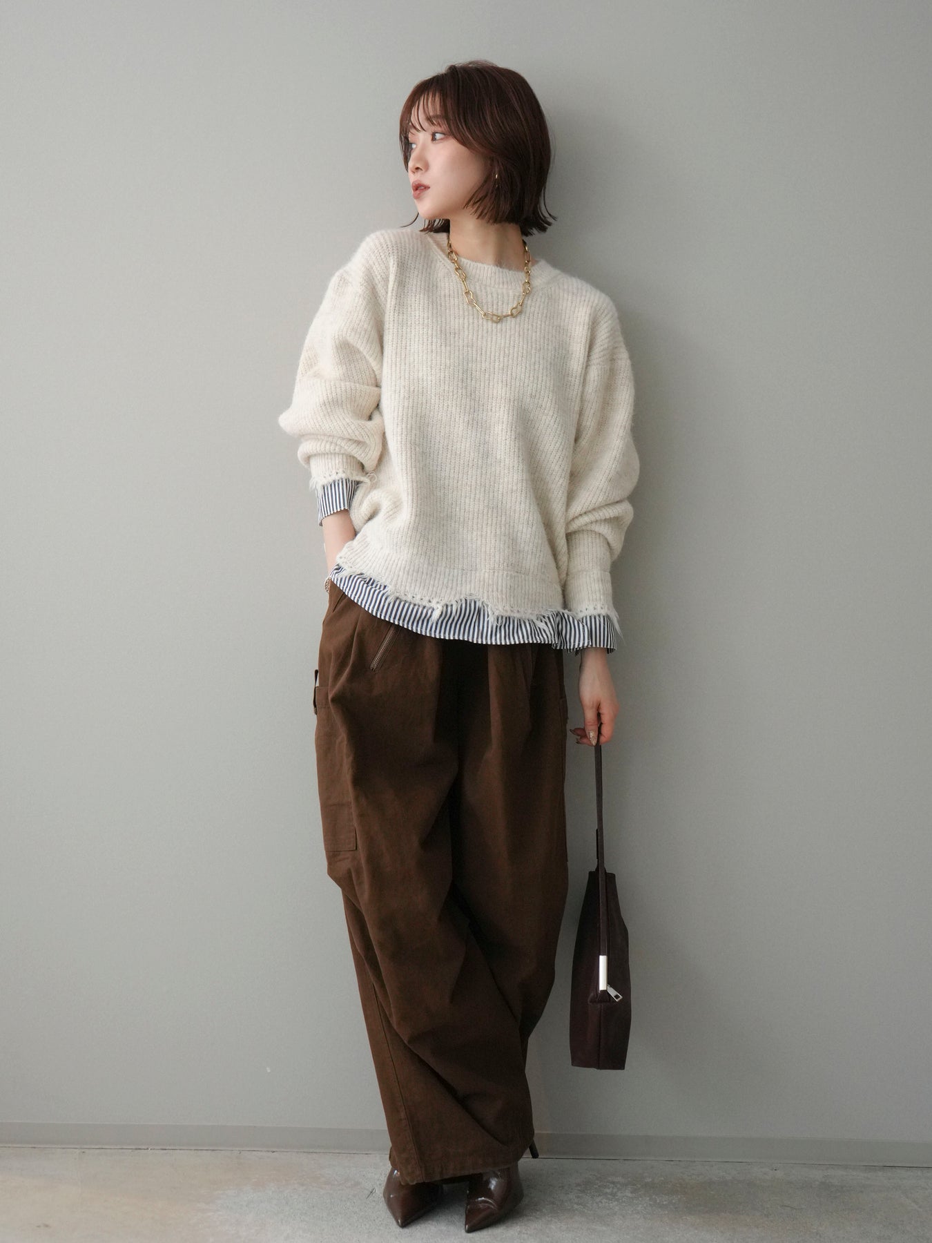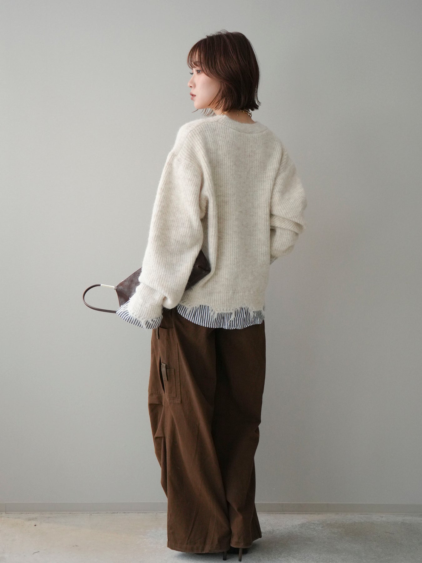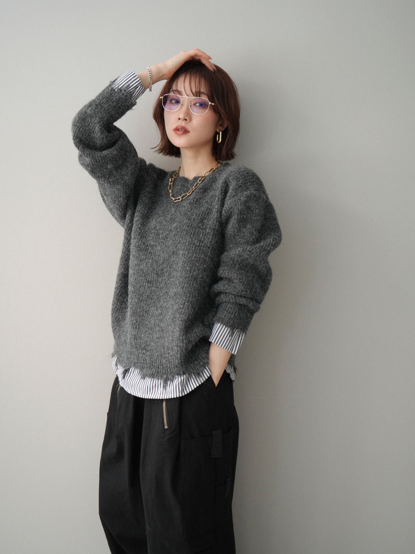 ニットとシャツを重ね着したようなデザインが一枚で完成するレイヤード風プルオーバー。 程よく施されたダメージ加工がこなれた印象を与え、シンプルながらもスタイリングに奥行きをプラスします。 ゆったりとしたシルエットでリラックス感があり、さっと着るだけでバランスの取れたコーディネートに。 ニットの柔らかな風合いと、裾から覗くシャツデザインのコントラストが大人カジュアルに映える一着です。 ※ボトムス、キャミソール(インナー)以外の商品は一律でインナーは付属していません。