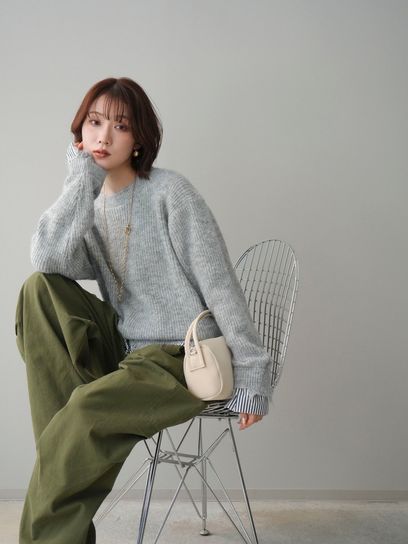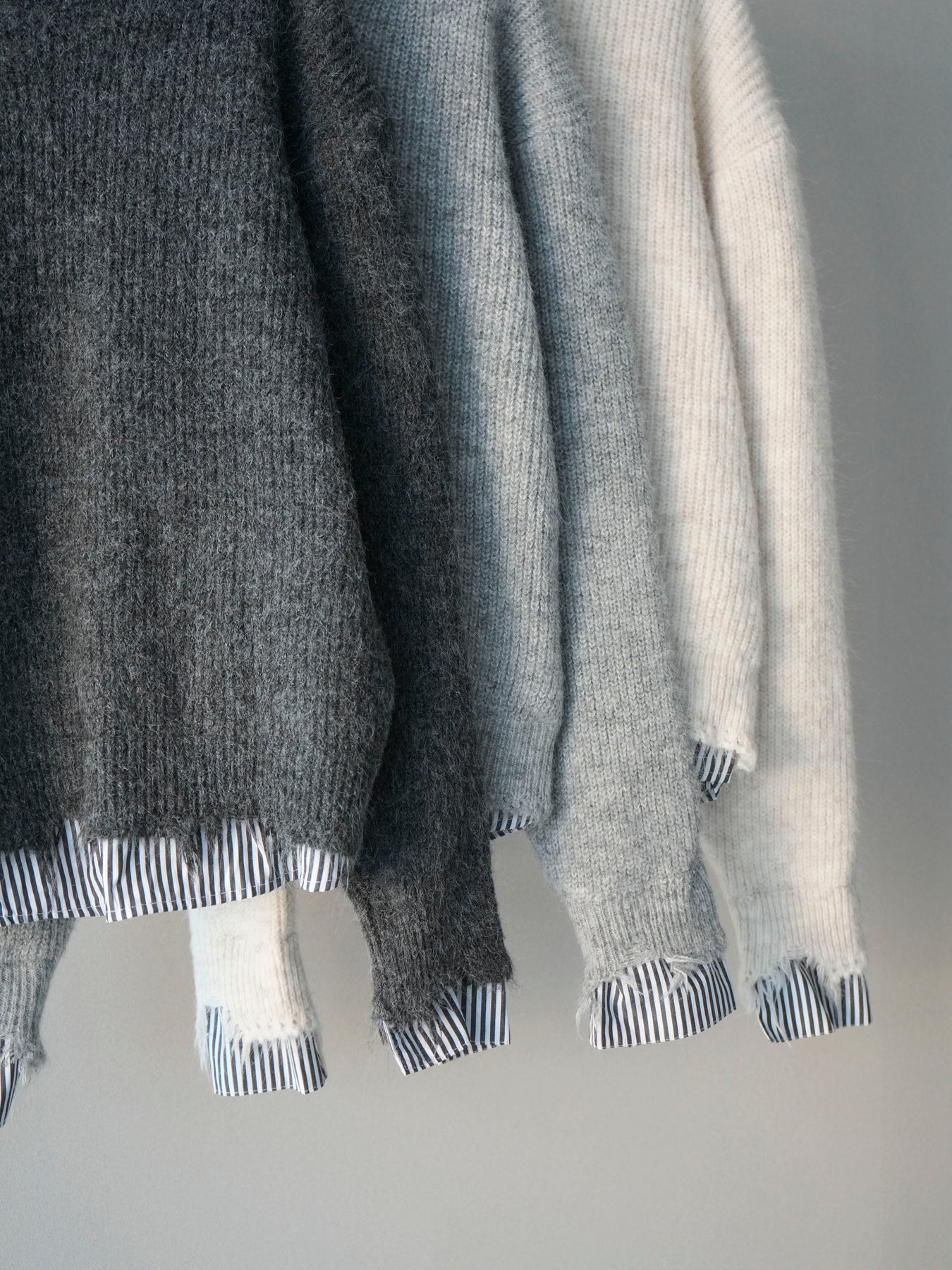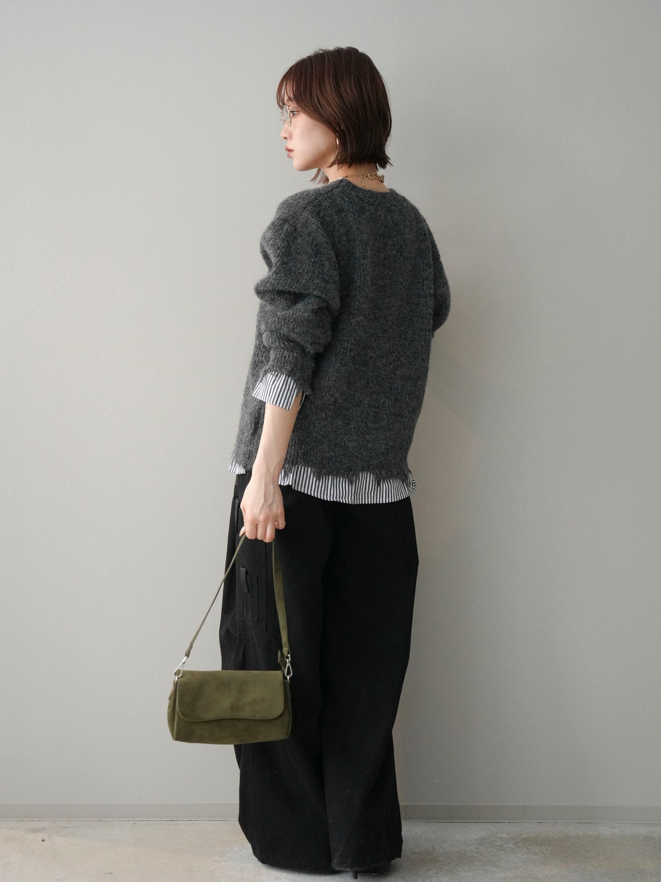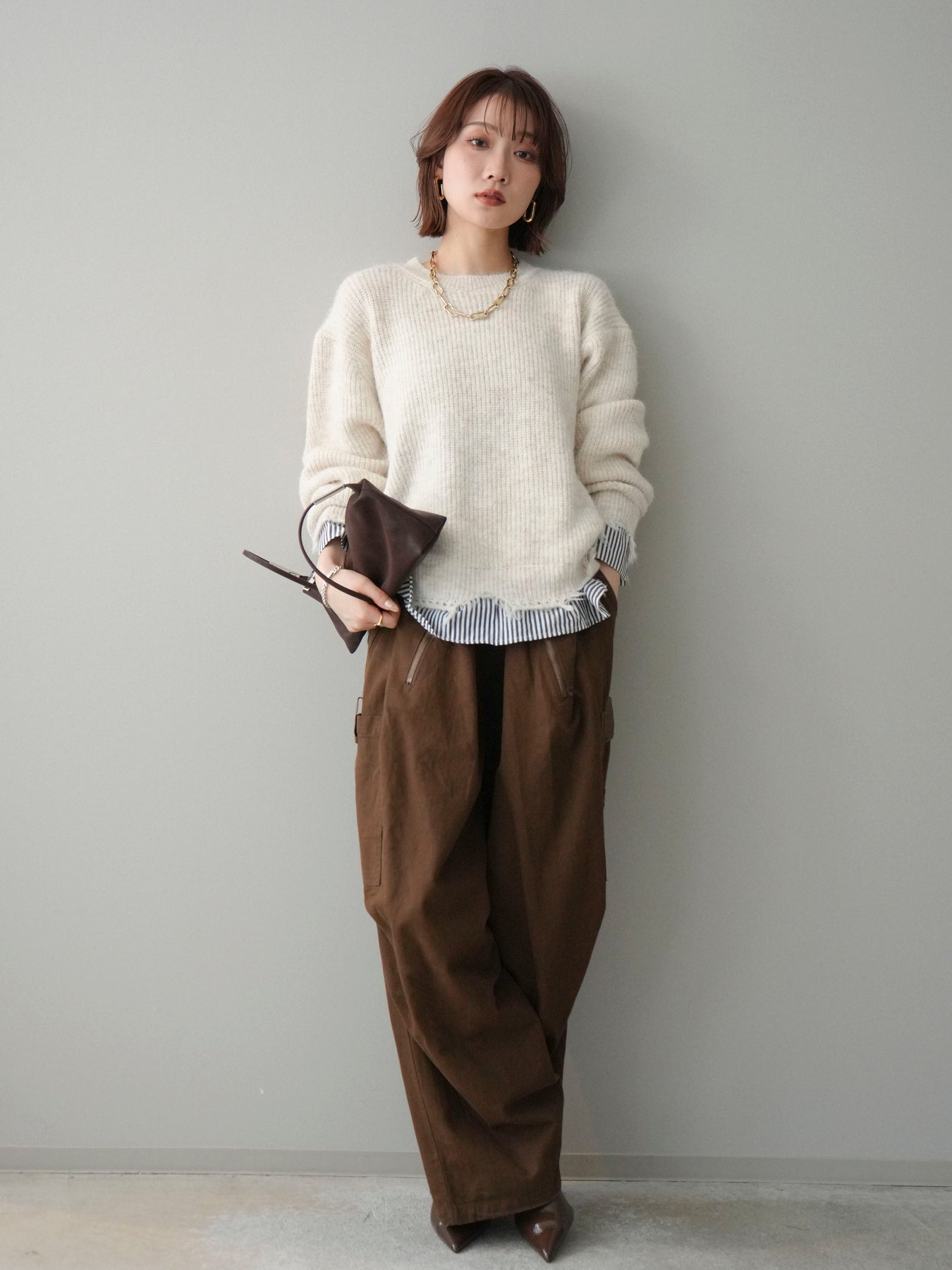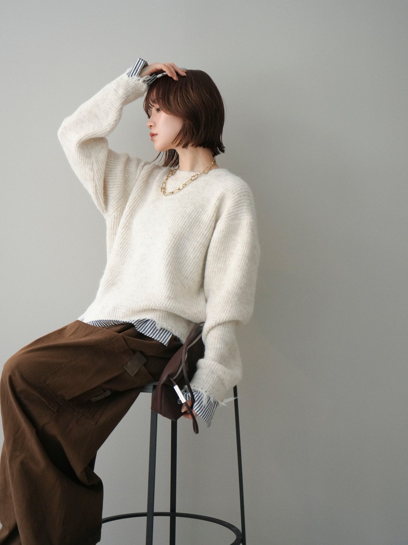 ニットとシャツを重ね着したようなデザインが一枚で完成するレイヤード風プルオーバー。 程よく施されたダメージ加工がこなれた印象を与え、シンプルながらもスタイリングに奥行きをプラスします。 ゆったりとしたシルエットでリラックス感があり、さっと着るだけでバランスの取れたコーディネートに。 ニットの柔らかな風合いと、裾から覗くシャツデザインのコントラストが大人カジュアルに映える一着です。 ※ボトムス、キャミソール(インナー)以外の商品は一律でインナーは付属していません。
