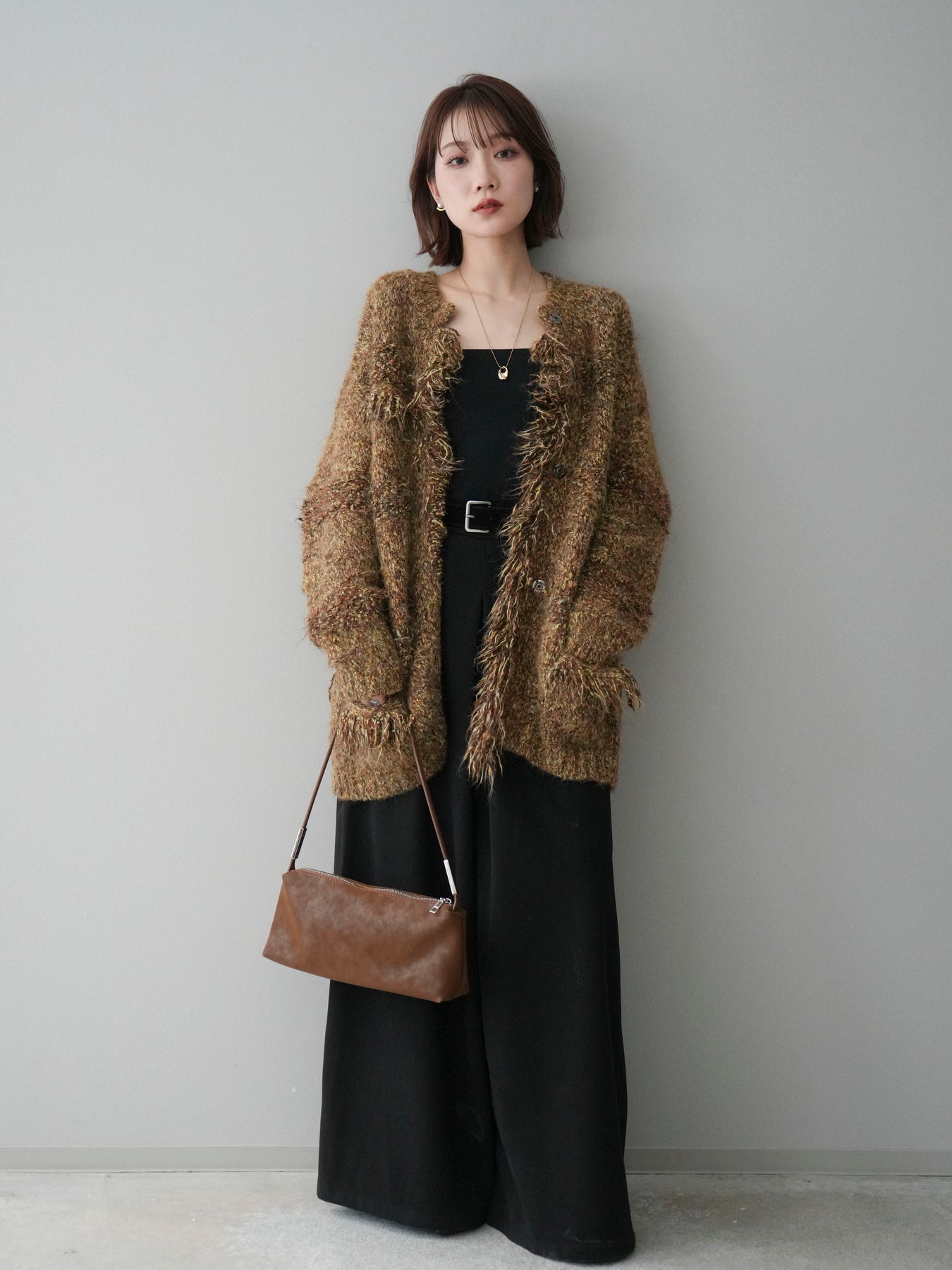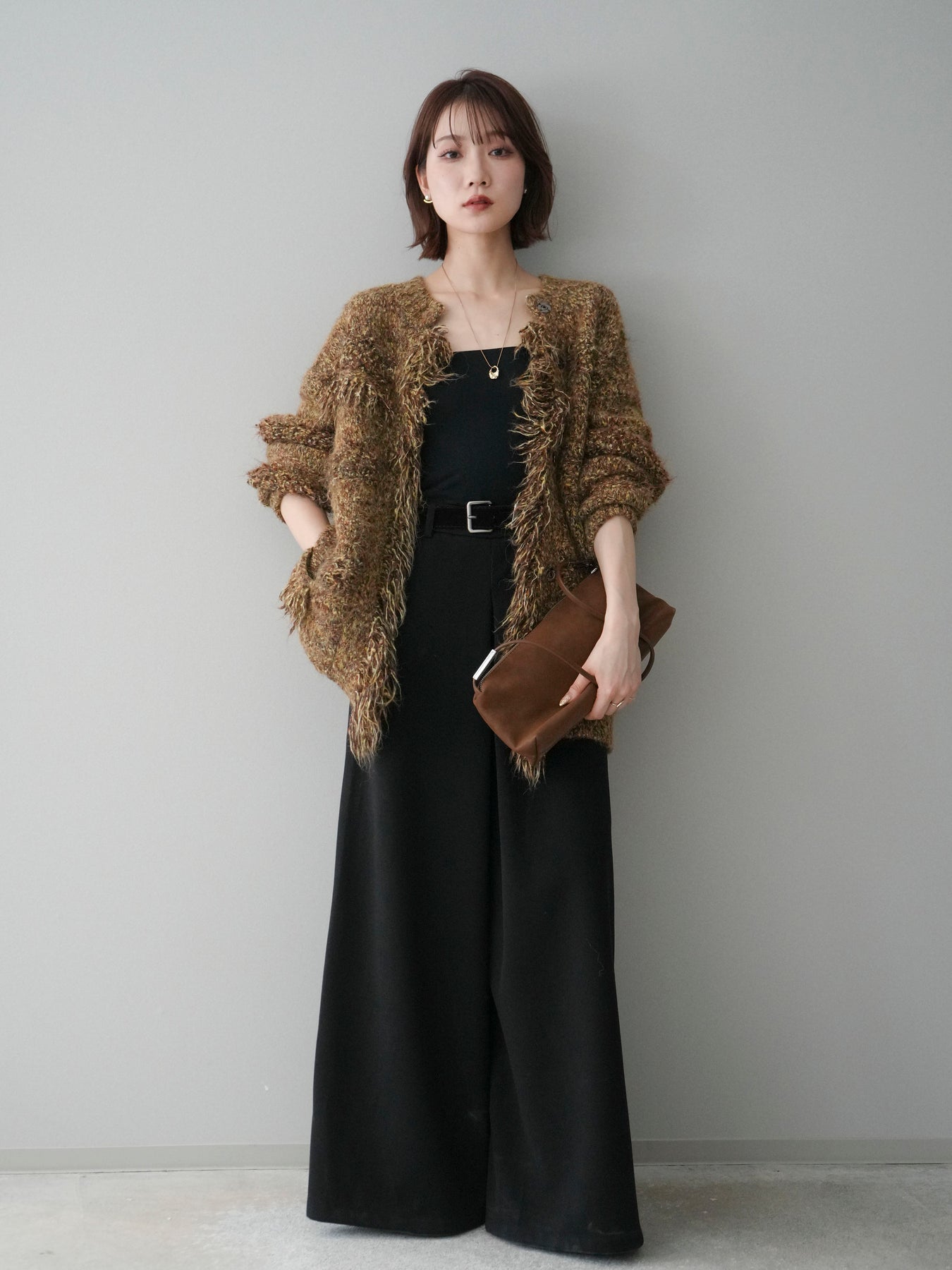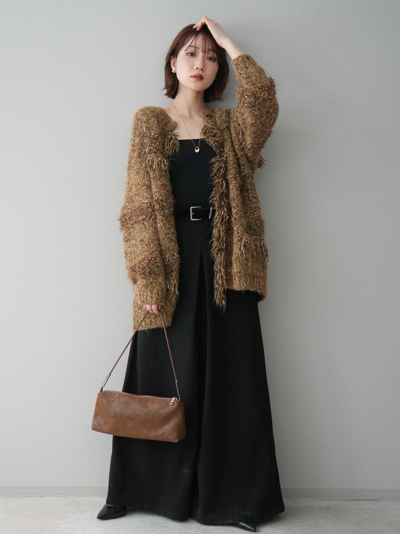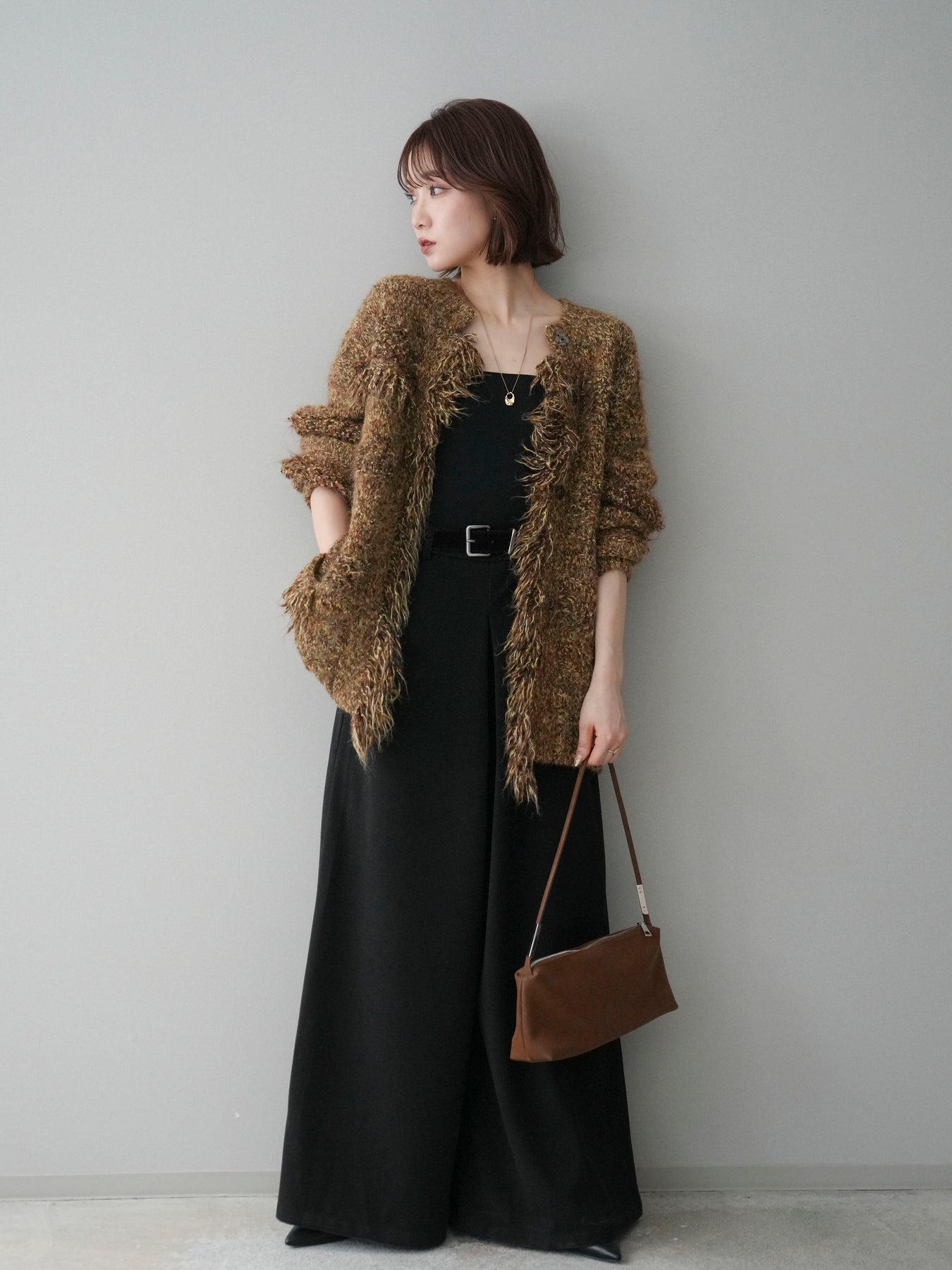 表情豊かなミックスヤーンを使用した、存在感のあるニットジャケット。 フロントや縁にあしらわれたフリンジデザインが、動きのある立体感とこなれた印象を演出します。 柔らかなニット素材で羽織りやすく、かっちりしすぎない程よいラフさが魅力。 シンプルなインナーに合わせるだけで、スタイリングに奥行きと華やかさをプラスしてくれる一着です。 デイリーからきれいめスタイルまで幅広く活躍する、シーズンライクなニットアウター。 ※ボトムス、キャミソール(インナー)以外の商品は一律でインナーは付属していません。
