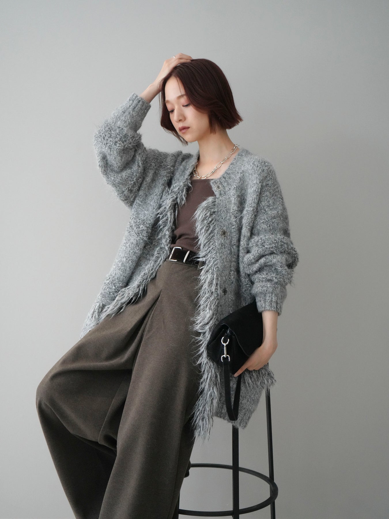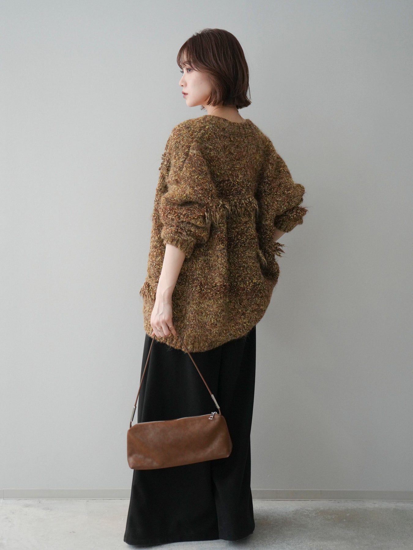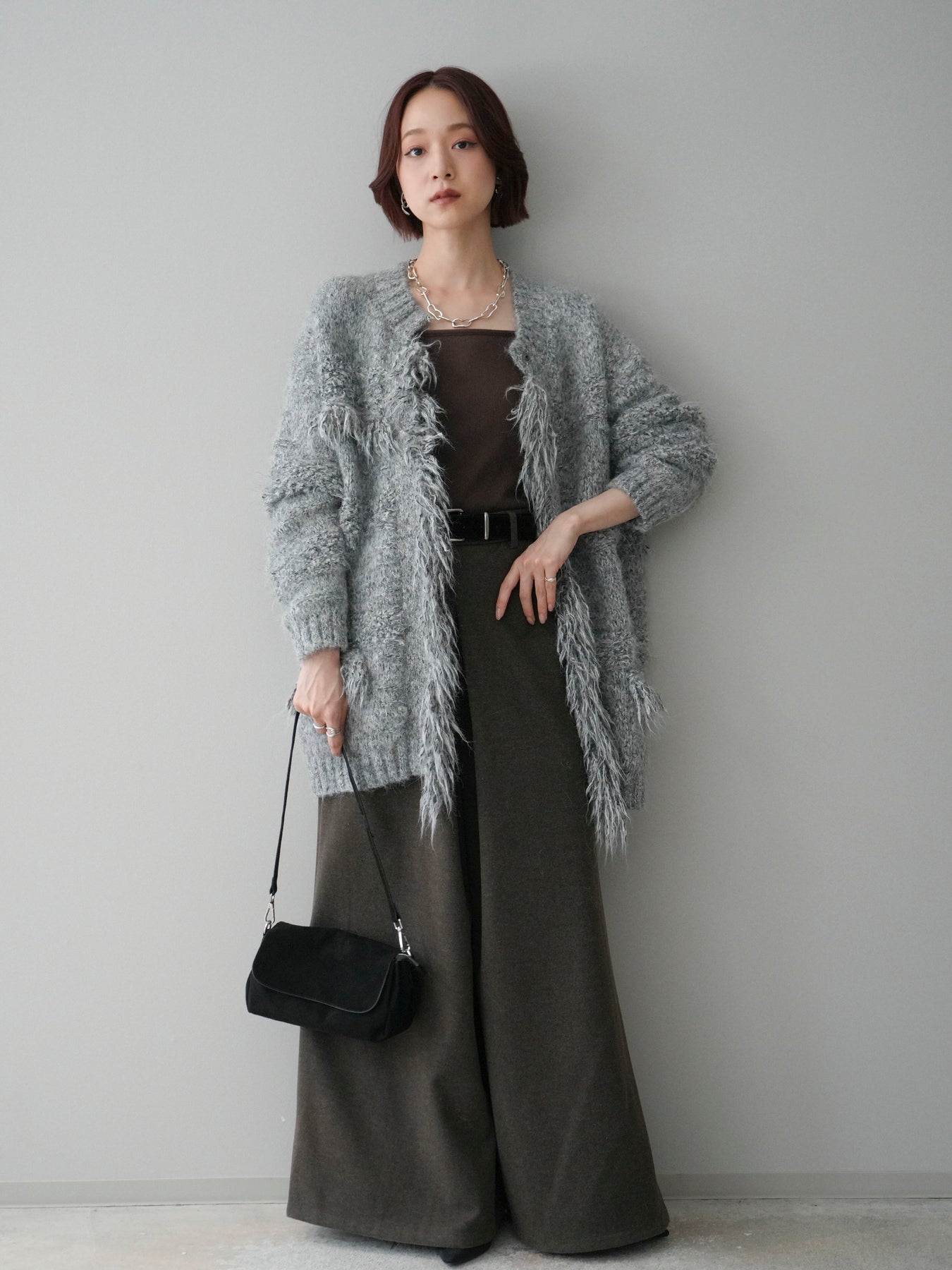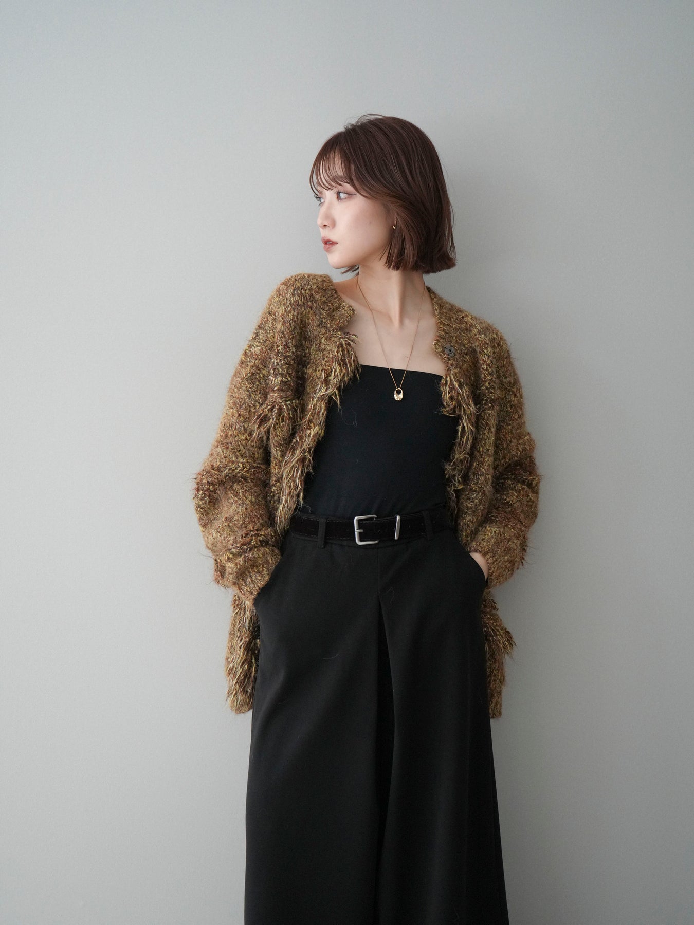 表情豊かなミックスヤーンを使用した、存在感のあるニットジャケット。 フロントや縁にあしらわれたフリンジデザインが、動きのある立体感とこなれた印象を演出します。 柔らかなニット素材で羽織りやすく、かっちりしすぎない程よいラフさが魅力。 シンプルなインナーに合わせるだけで、スタイリングに奥行きと華やかさをプラスしてくれる一着です。 デイリーからきれいめスタイルまで幅広く活躍する、シーズンライクなニットアウター。 ※ボトムス、キャミソール(インナー)以外の商品は一律でインナーは付属していません。