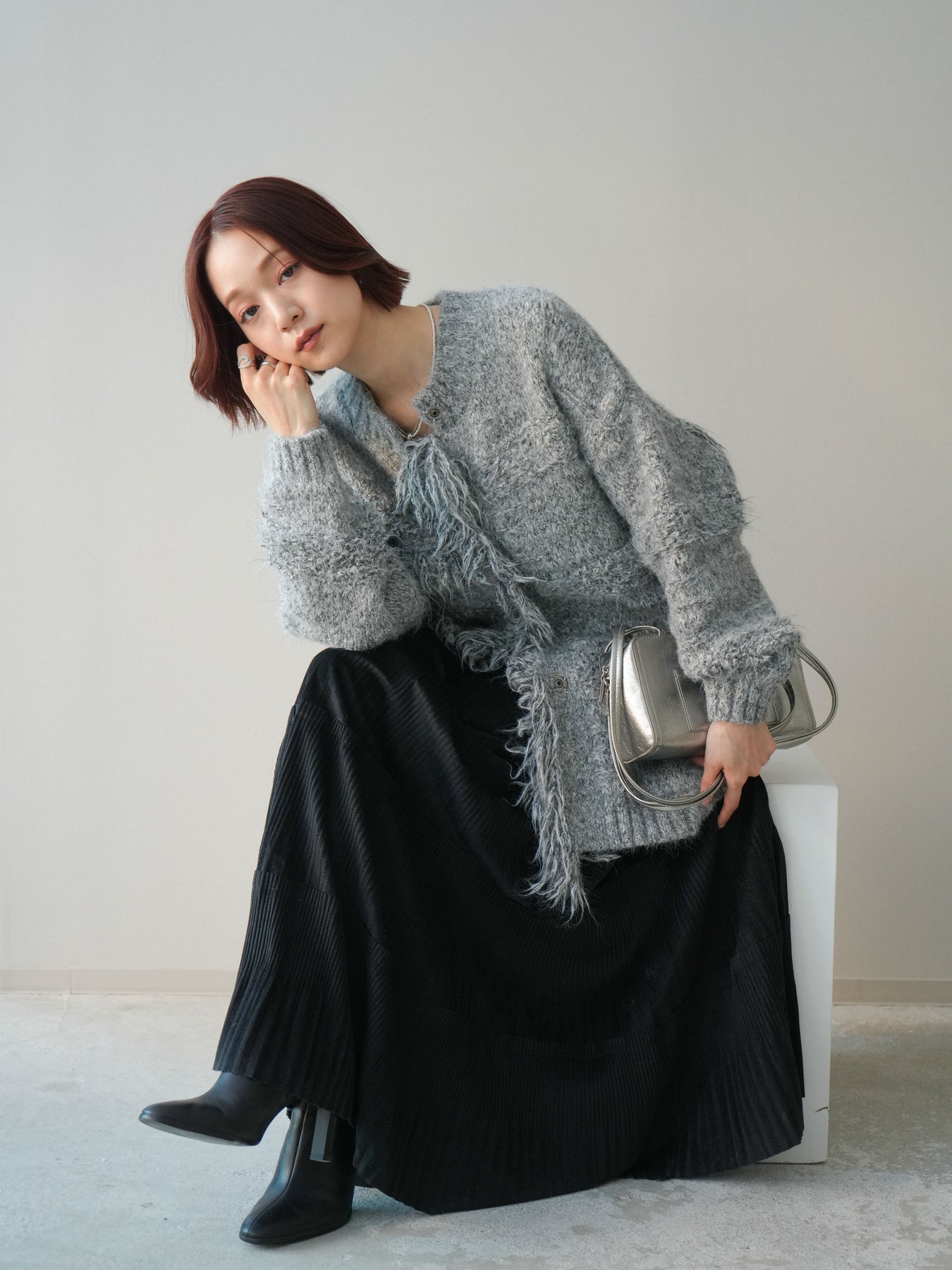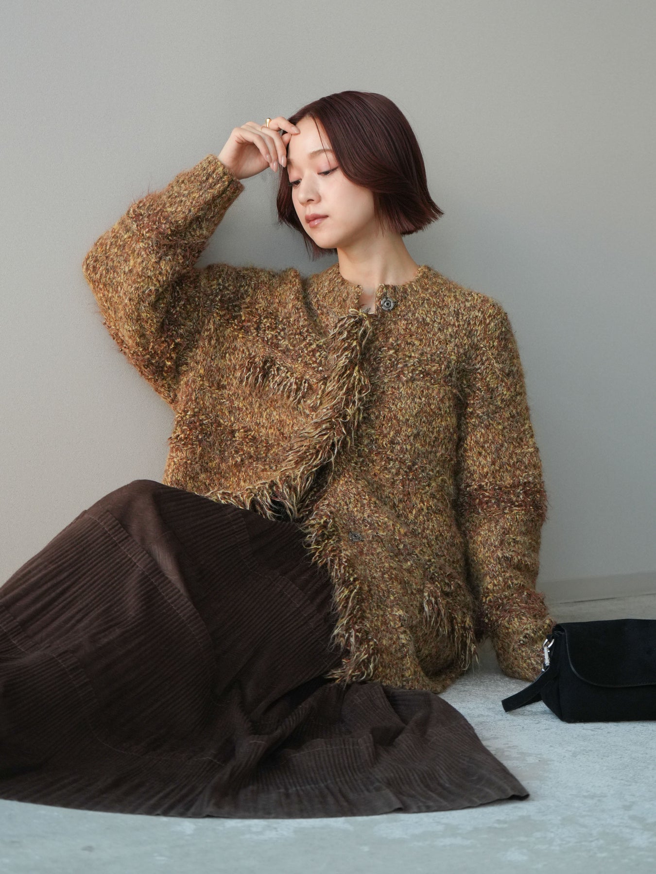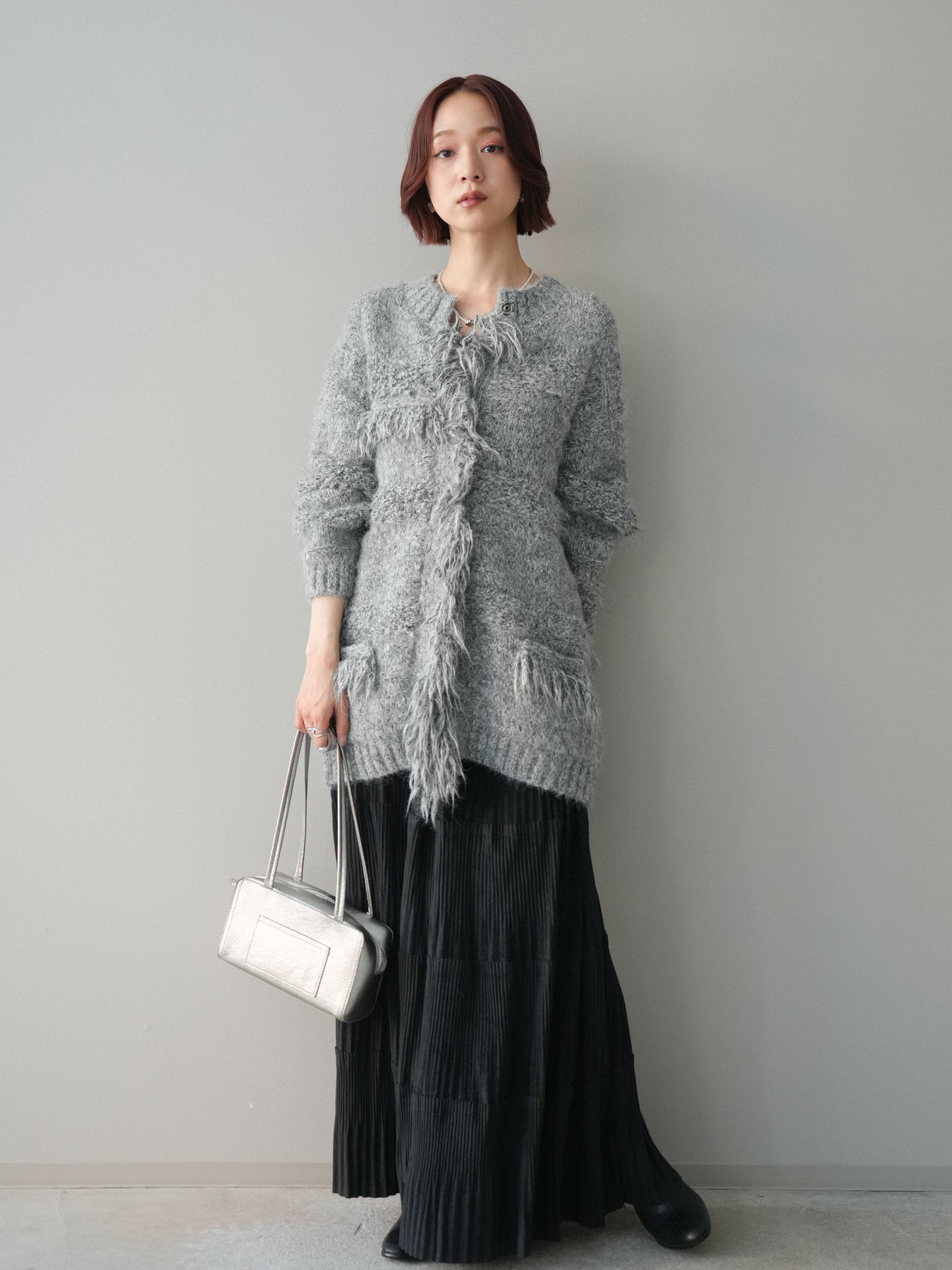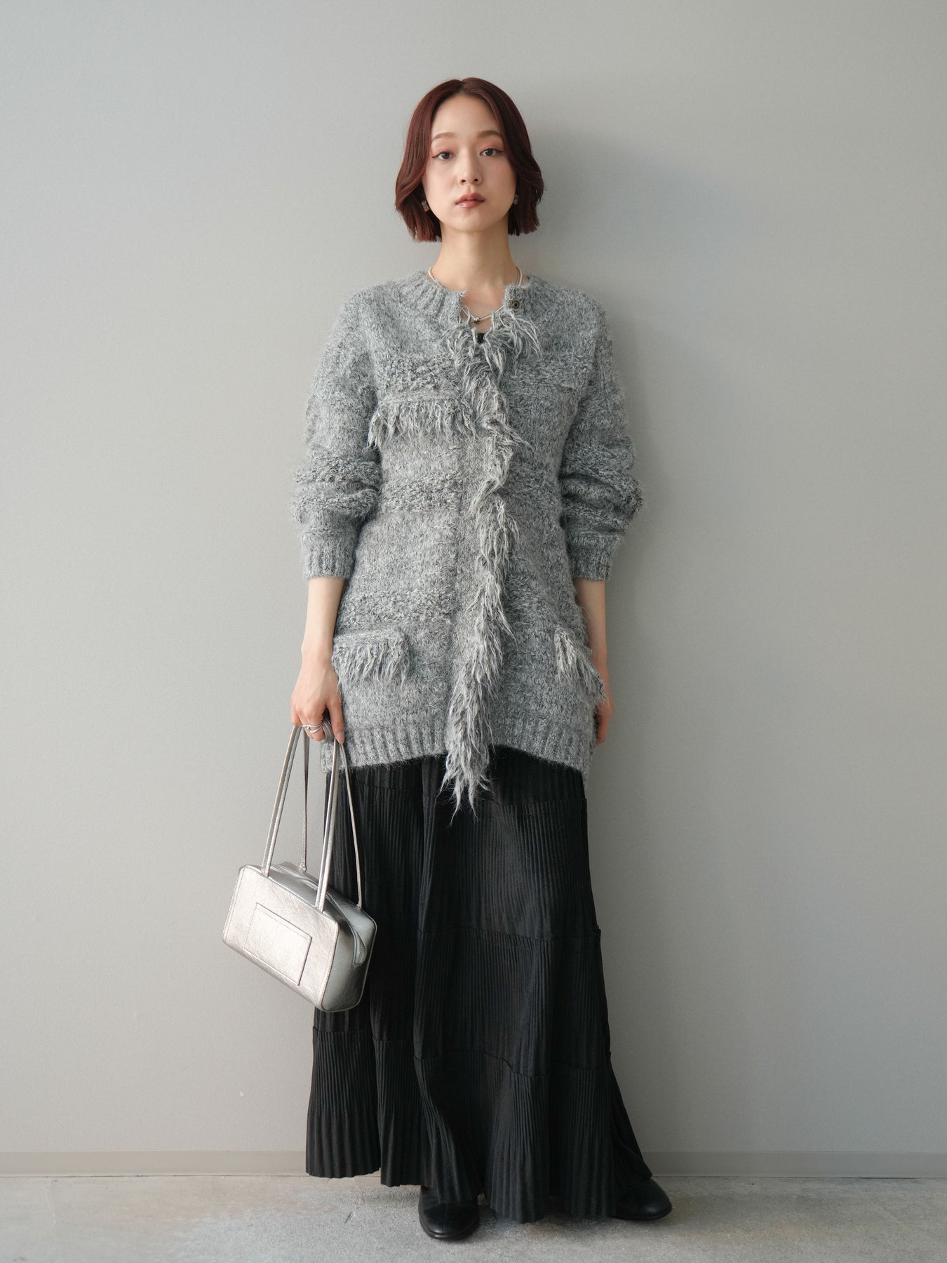 [SET]ミックスヤーンフリンジデザインニットジャケット+型押しスエードティアードプリーツスカート(2set)
