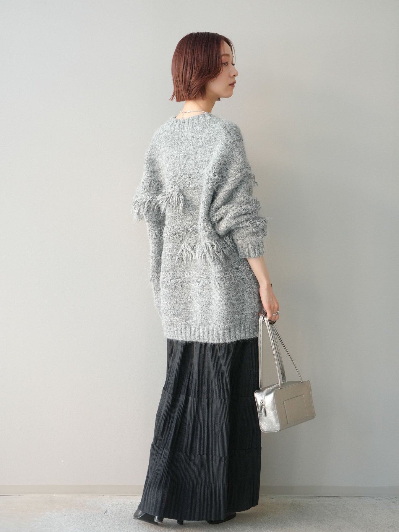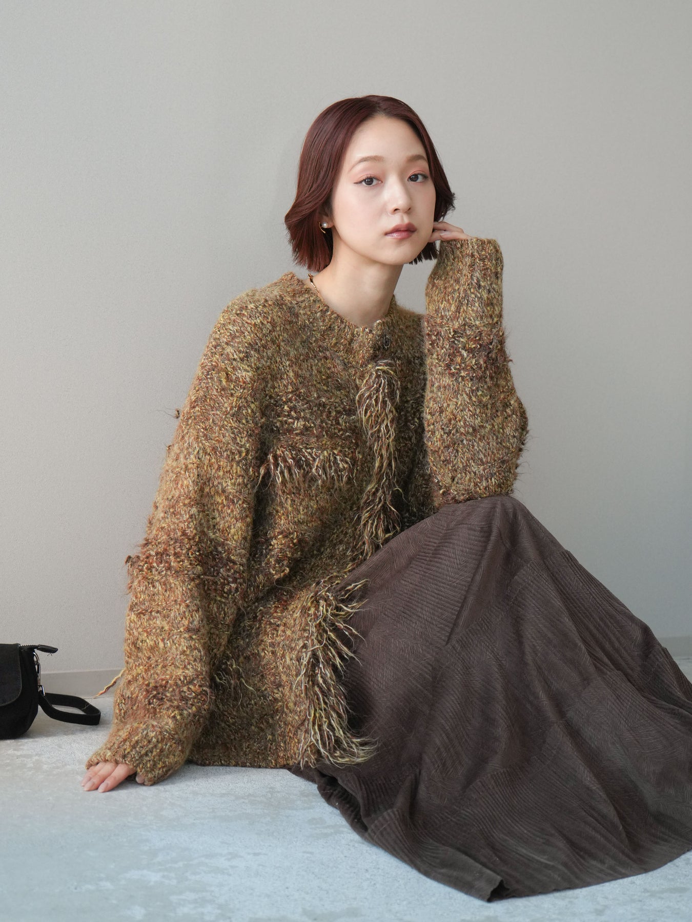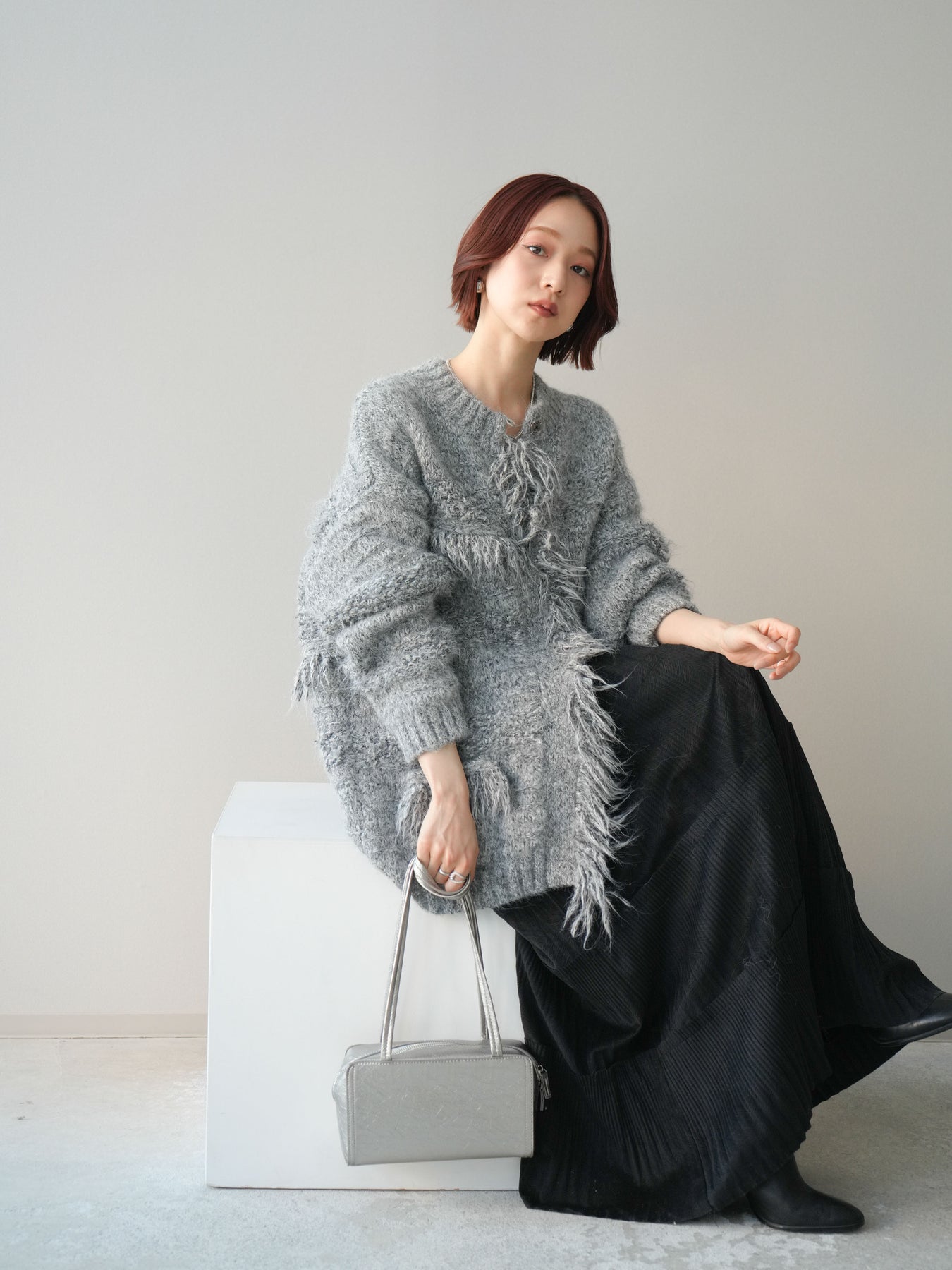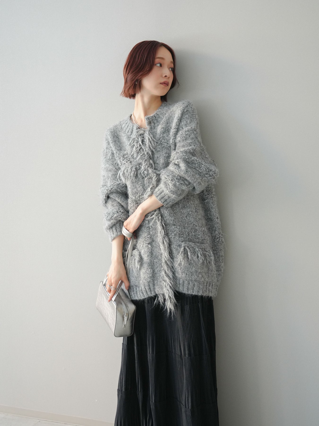 [SET]ミックスヤーンフリンジデザインニットジャケット+型押しスエードティアードプリーツスカート(2set)