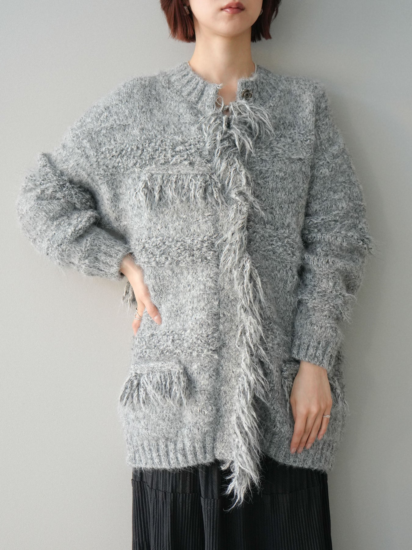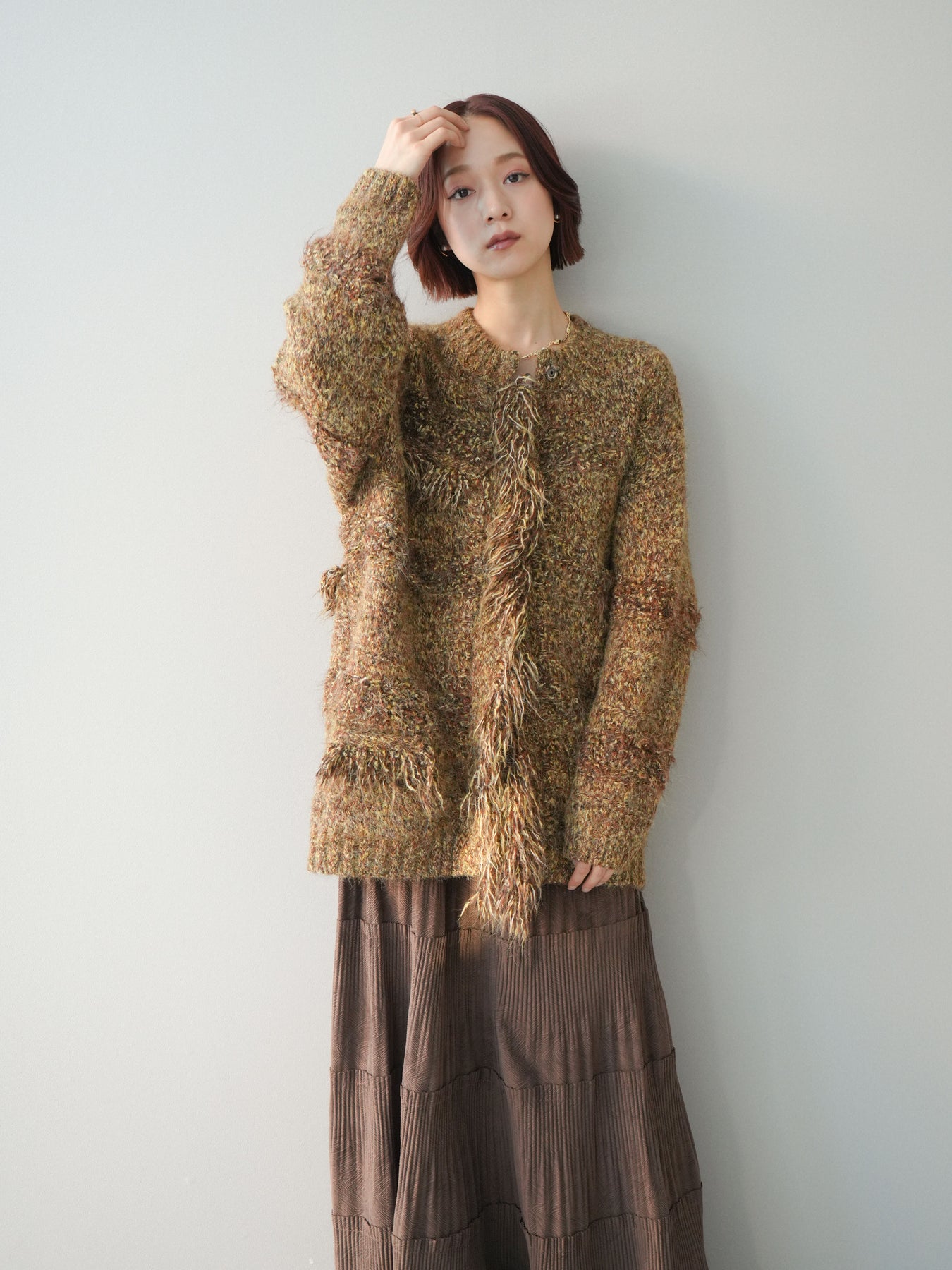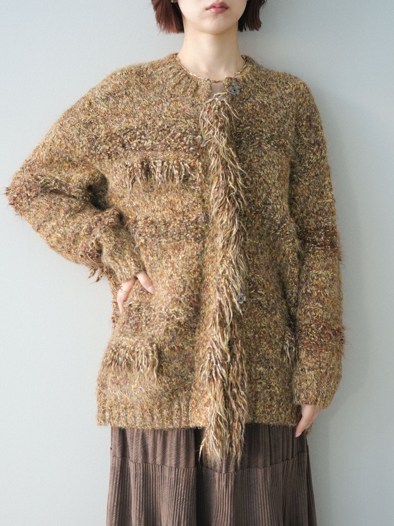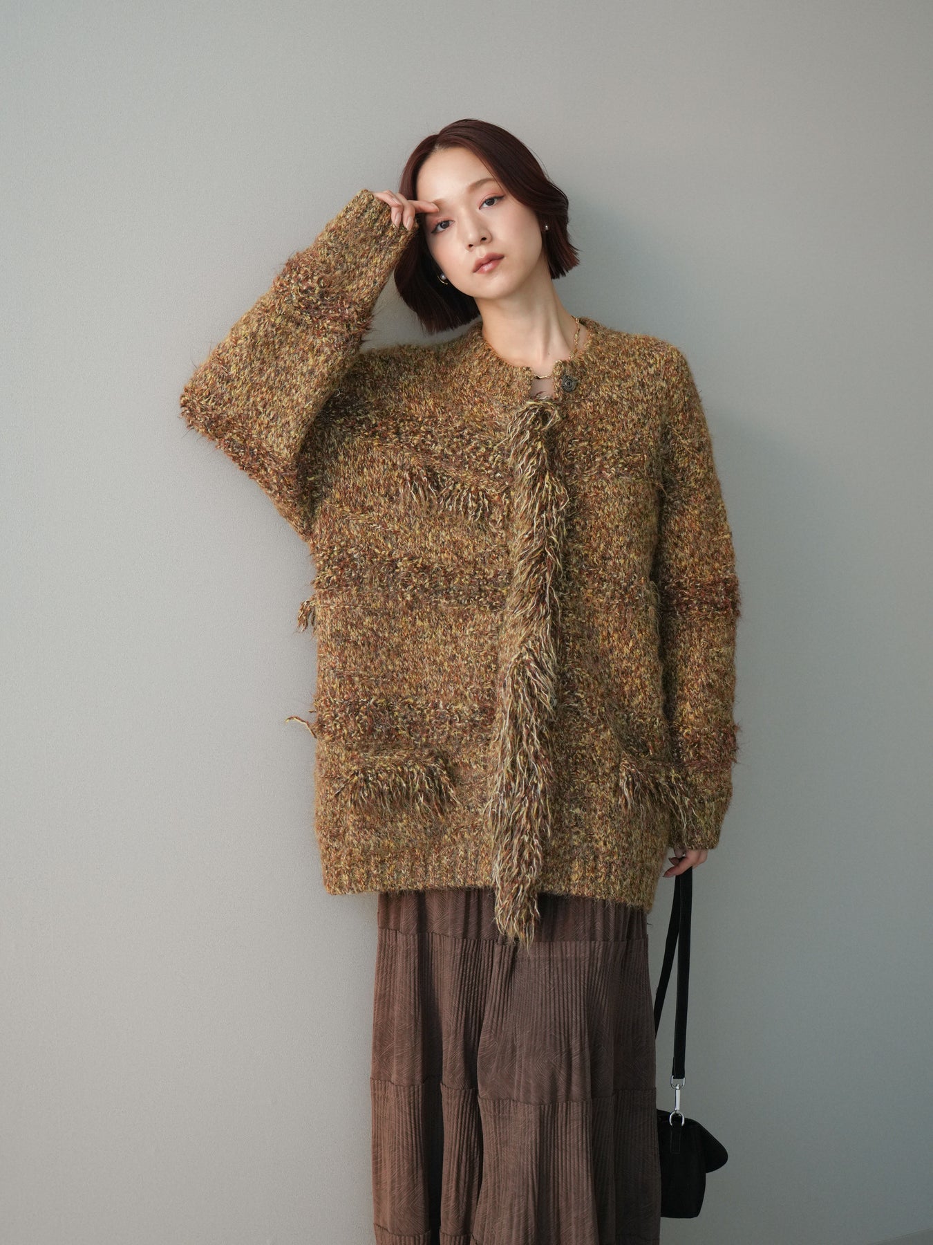 表情豊かなミックスヤーンを使用した、存在感のあるニットジャケット。 フロントや縁にあしらわれたフリンジデザインが、動きのある立体感とこなれた印象を演出します。 柔らかなニット素材で羽織りやすく、かっちりしすぎない程よいラフさが魅力。 シンプルなインナーに合わせるだけで、スタイリングに奥行きと華やかさをプラスしてくれる一着です。 デイリーからきれいめスタイルまで幅広く活躍する、シーズンライクなニットアウター。 ※ボトムス、キャミソール(インナー)以外の商品は一律でインナーは付属していません。