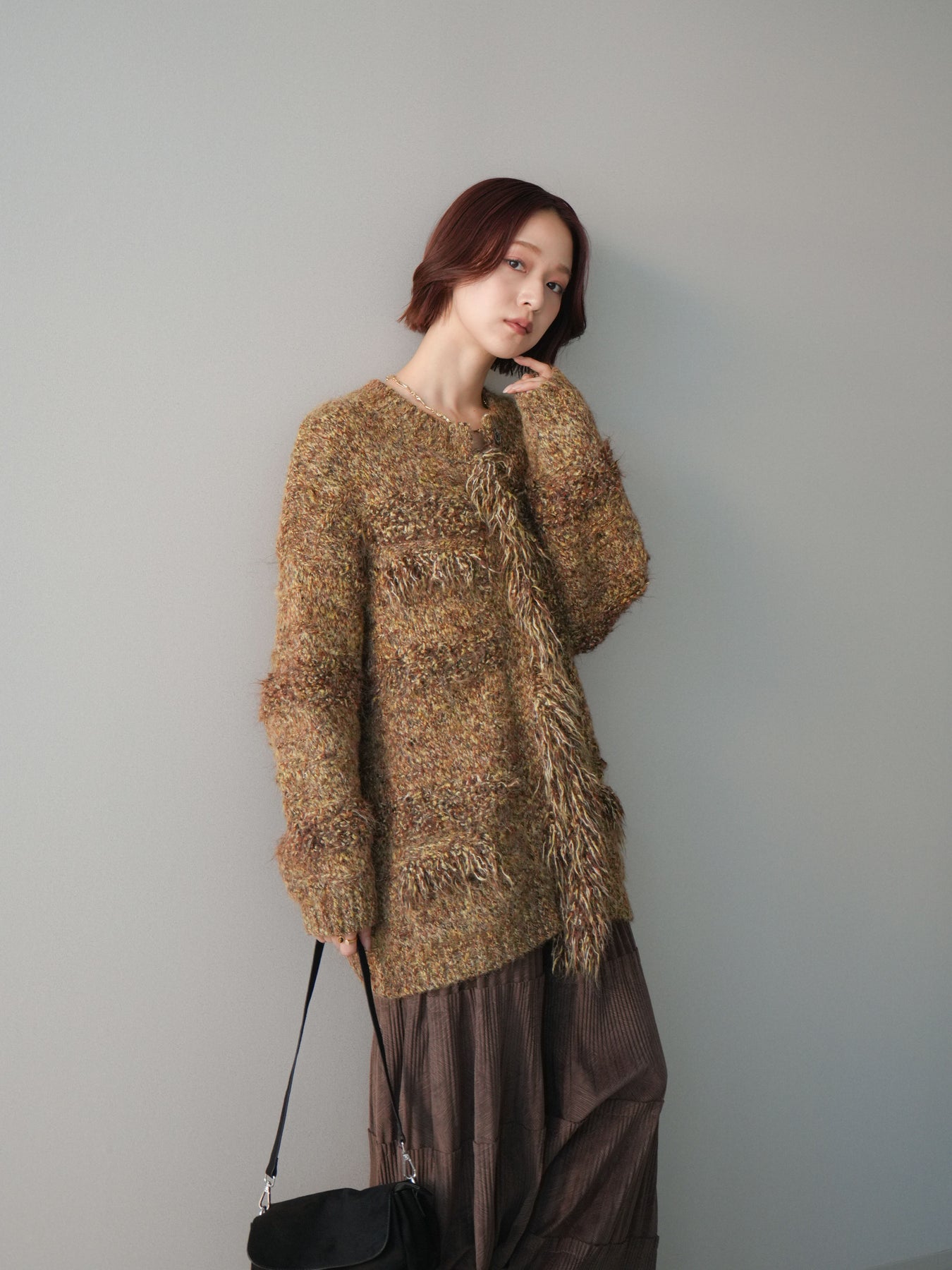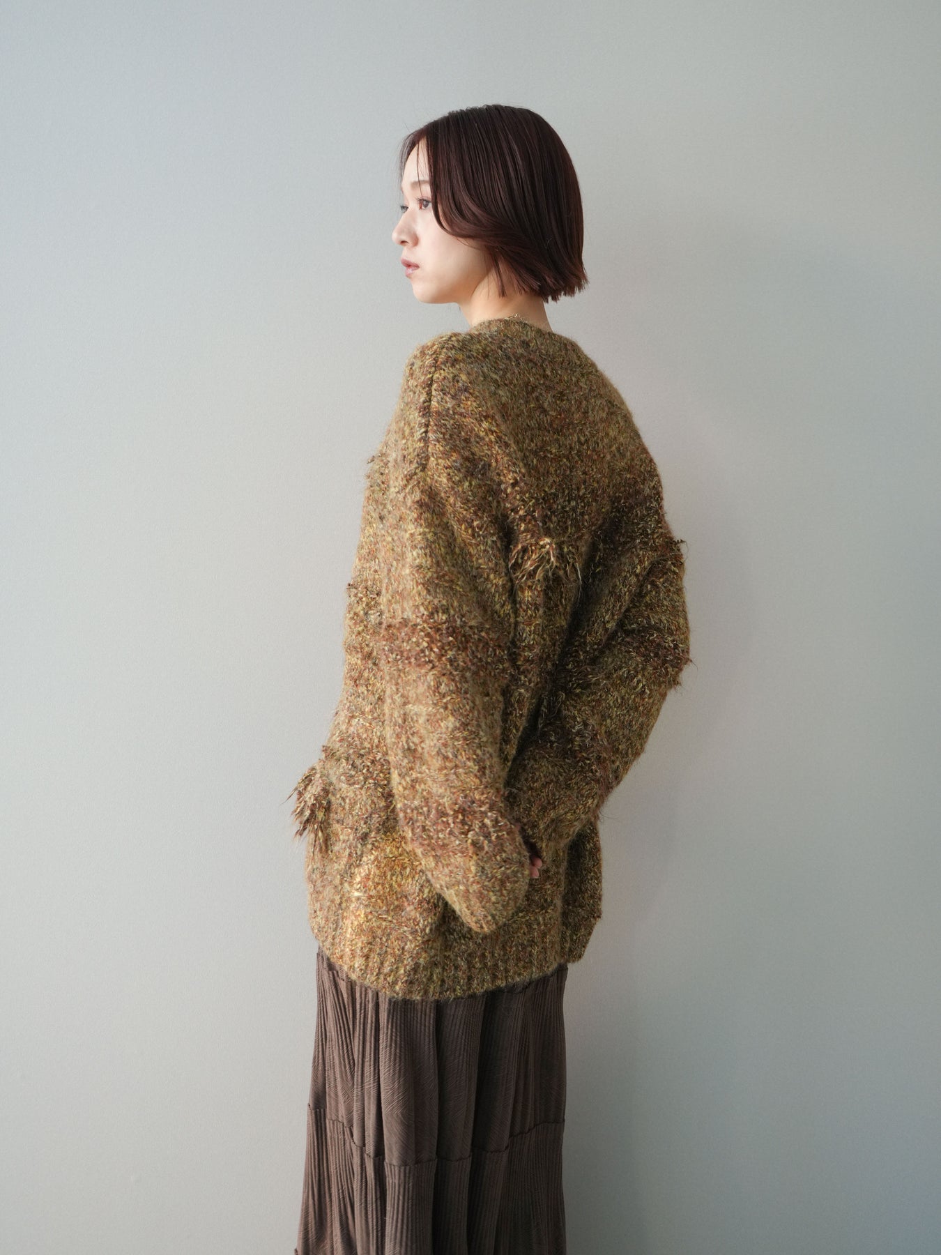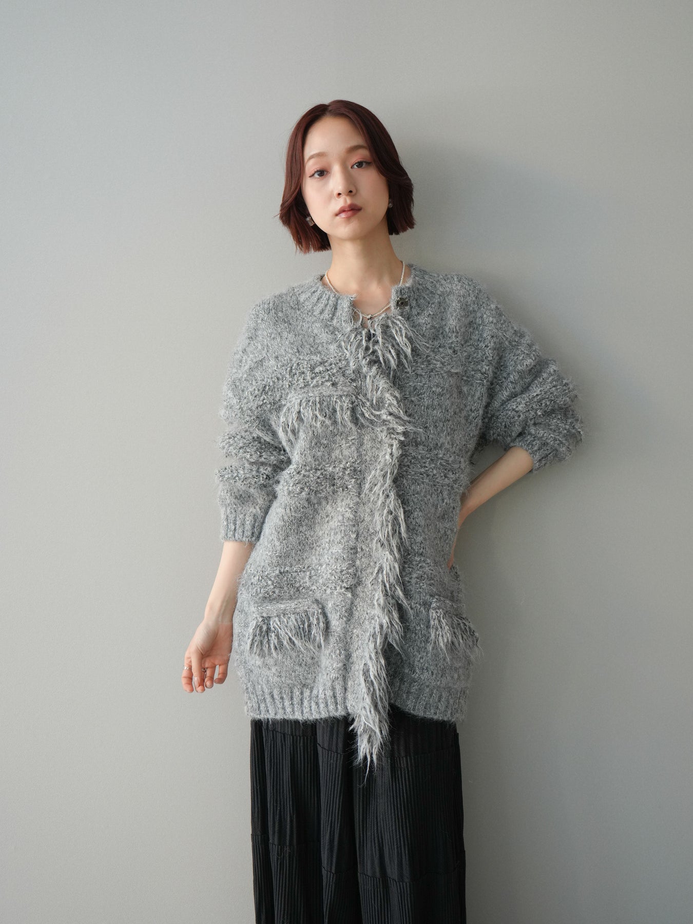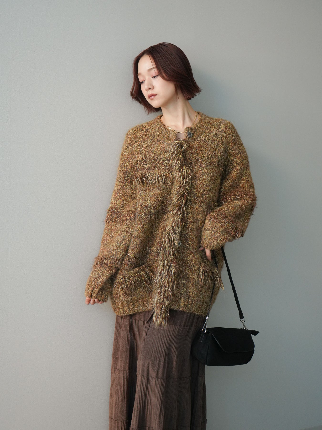 表情豊かなミックスヤーンを使用した、存在感のあるニットジャケット。 フロントや縁にあしらわれたフリンジデザインが、動きのある立体感とこなれた印象を演出します。 柔らかなニット素材で羽織りやすく、かっちりしすぎない程よいラフさが魅力。 シンプルなインナーに合わせるだけで、スタイリングに奥行きと華やかさをプラスしてくれる一着です。 デイリーからきれいめスタイルまで幅広く活躍する、シーズンライクなニットアウター。 ※ボトムス、キャミソール(インナー)以外の商品は一律でインナーは付属していません。