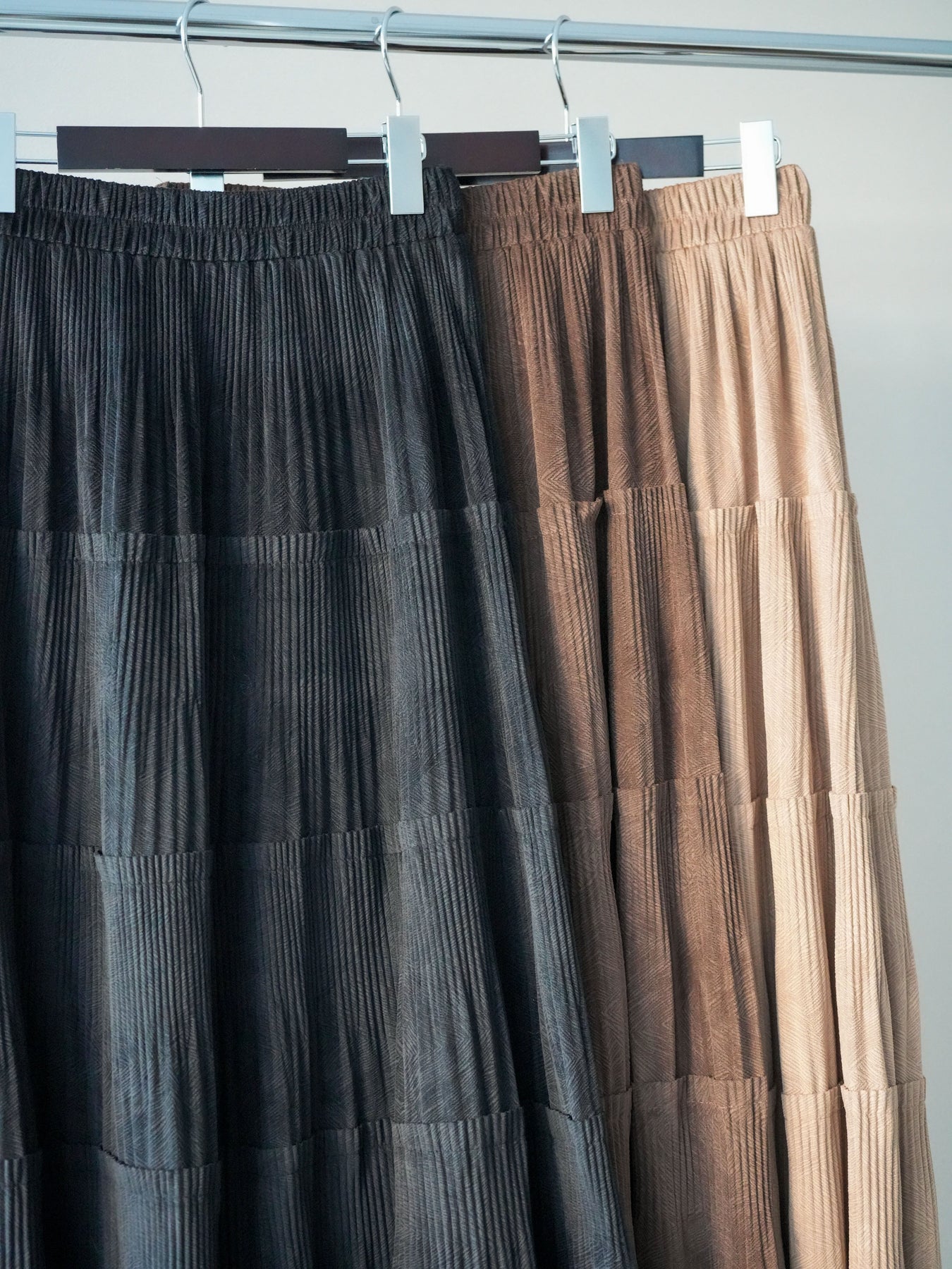 表情のある型押しスエード素材を使用した、ティアードデザインのプリーツスカート。 繊細なプリーツと段切り替えが生み出す立体感が、動くたびに美しい揺れを演出します。 スエード調の柔らかな質感がシーズンムードを高めつつ、上品で落ち着いた印象に。 ウエストはゴム仕様でリラックスした穿き心地ながら、広がりすぎないシルエットでバランス良く仕上げています。 シンプルなトップスと合わせるだけで、コーディネートに奥行きを与えてくれる主役級の一枚です。