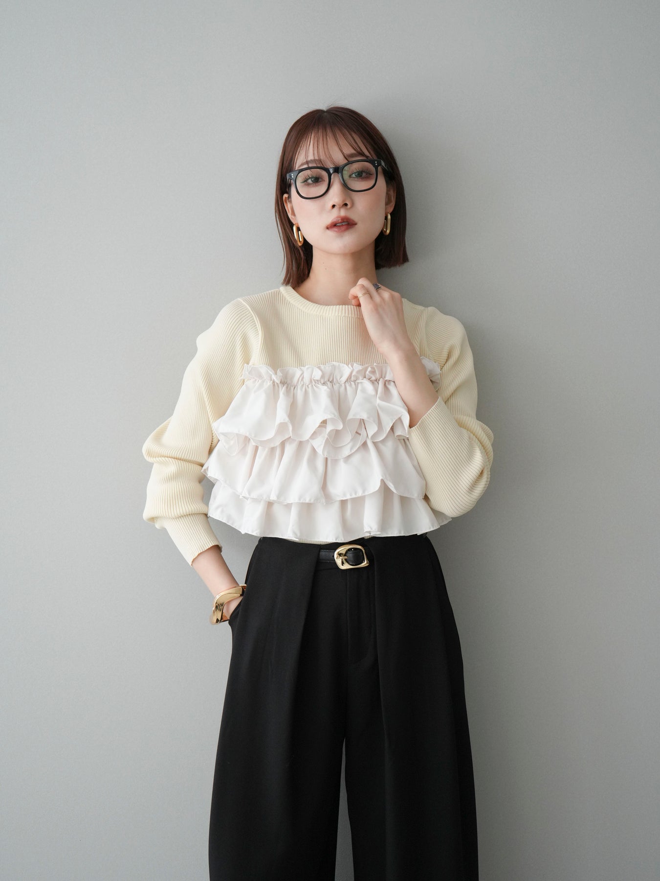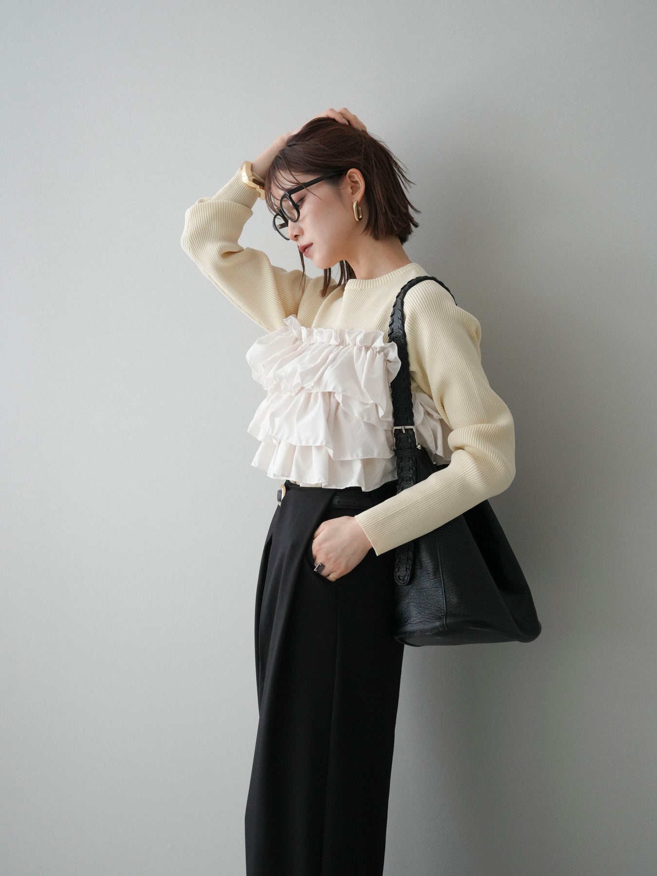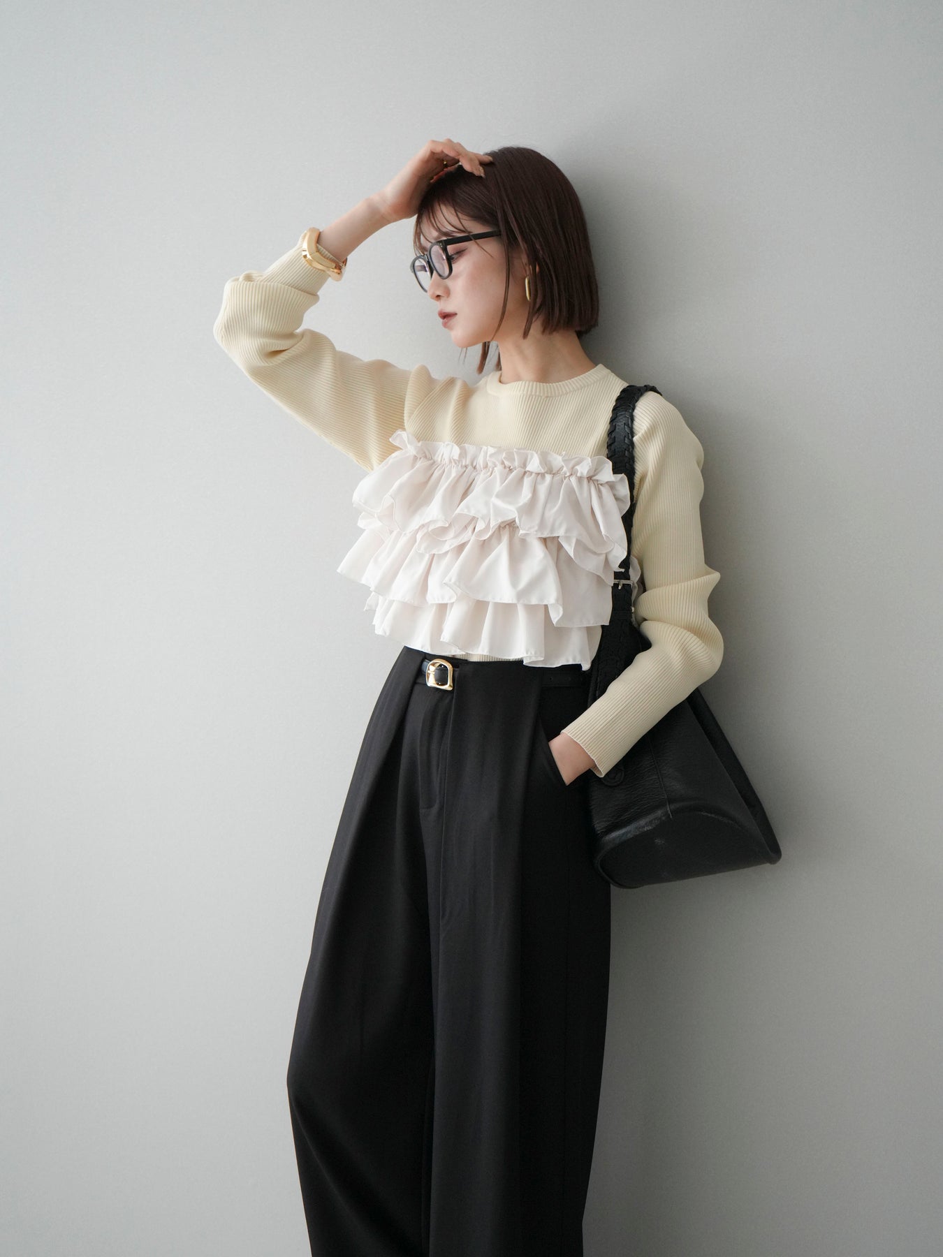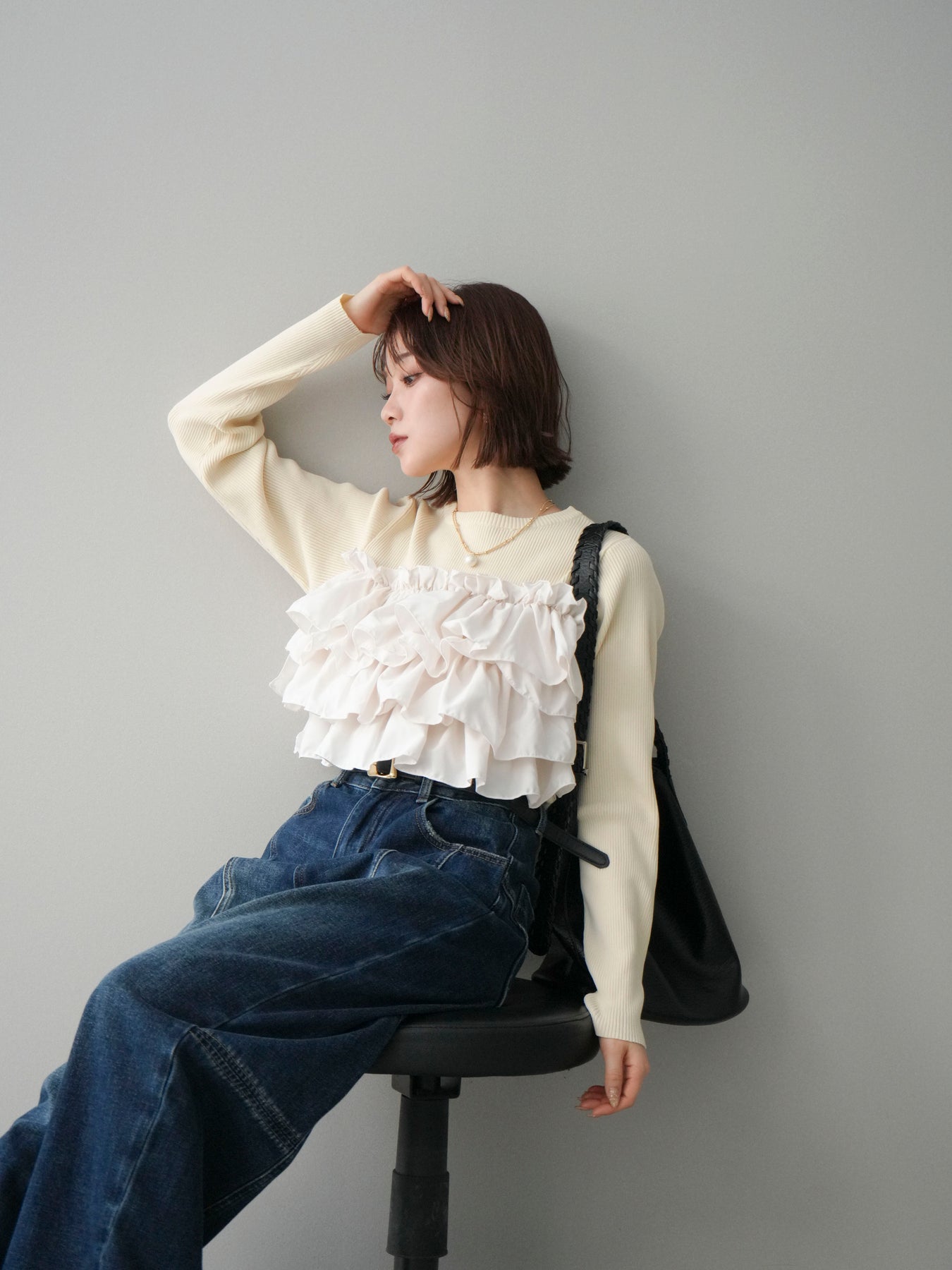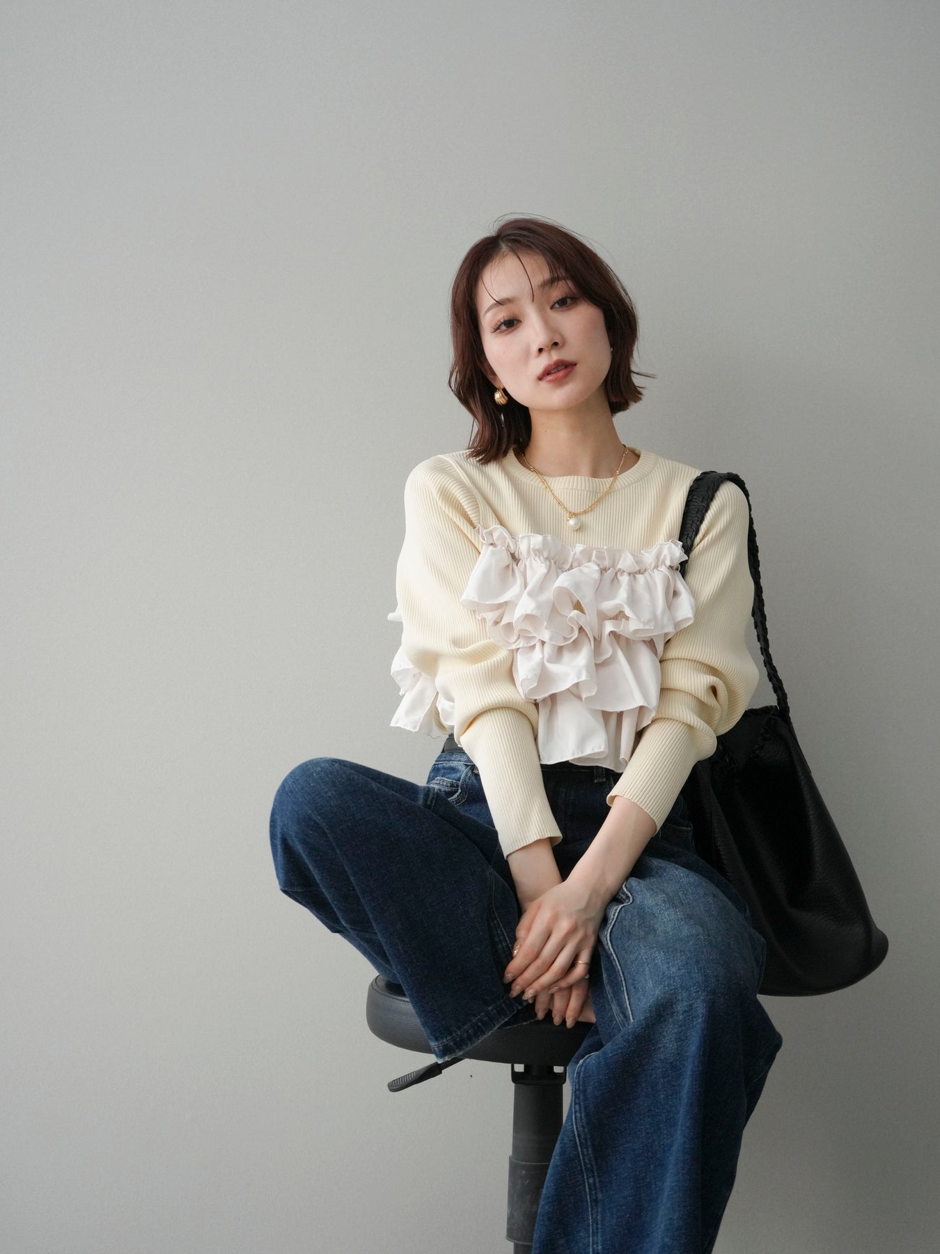 スポンジのように軽やかで弾力のあるニット素材に、フリルビスチェを重ねたようなドッキングデザインのプルオーバー。 一枚でレイヤードスタイルが完成し、立体感のあるフリルがコーディネートに華やかさを添えます。 ニット部分は程よくフィット感がありつつも柔らかな着心地で、デイリーに取り入れやすい仕上がり。 シンプルなボトムと合わせるだけで、女性らしさと存在感を兼ね備えたスタイリングが完成します。 きれいめにもカジュアルにも着回せる、主役級のトップスです。 ※ボトムス、キャミソール(インナー)以外の商品は一律でインナーは付属していません。