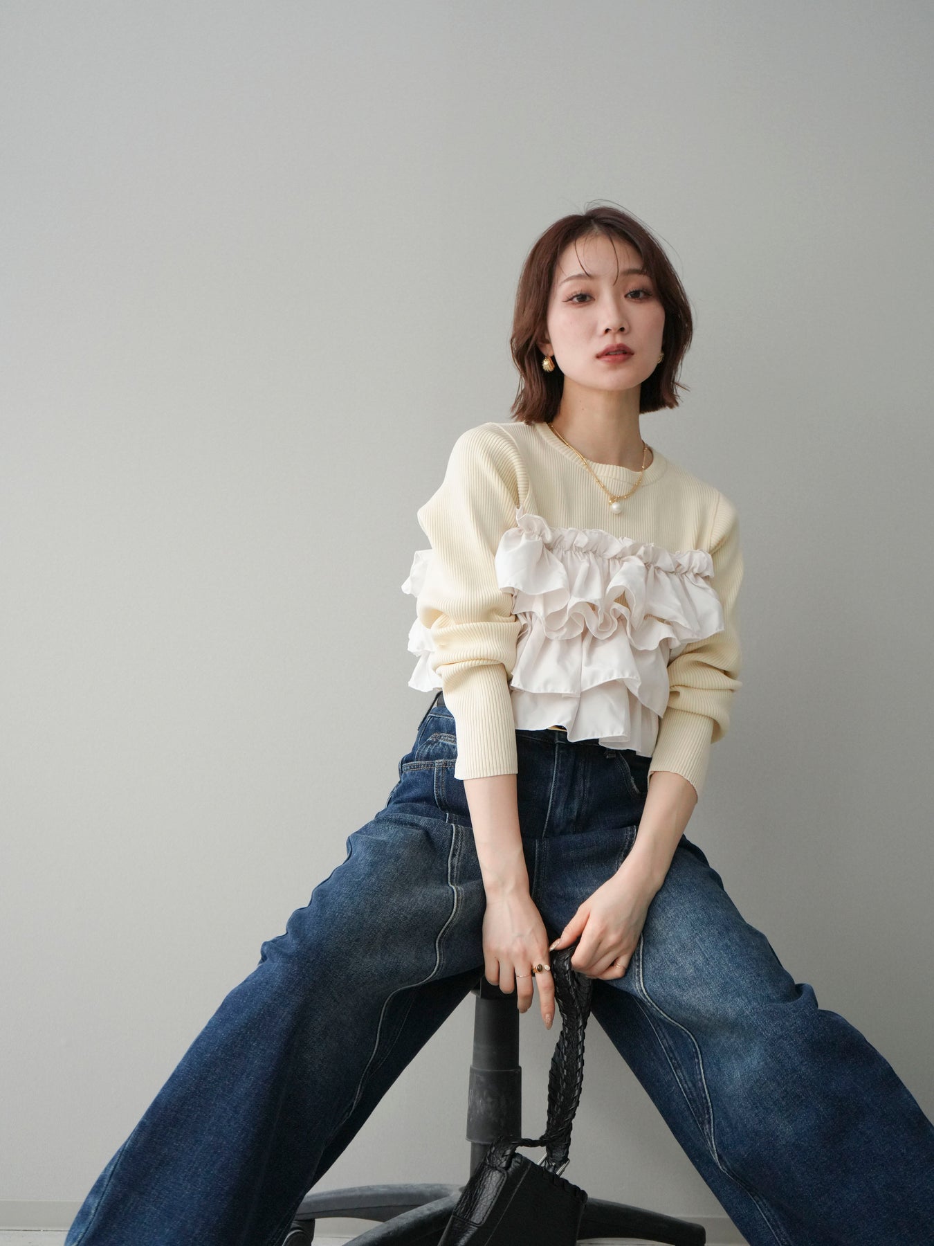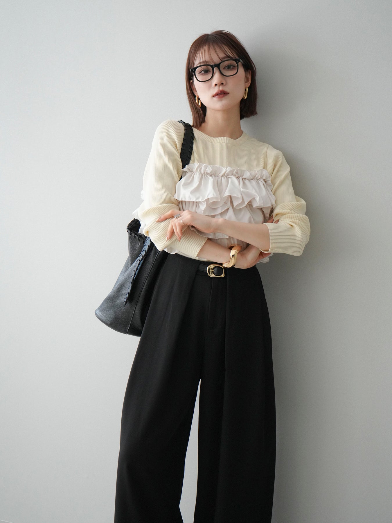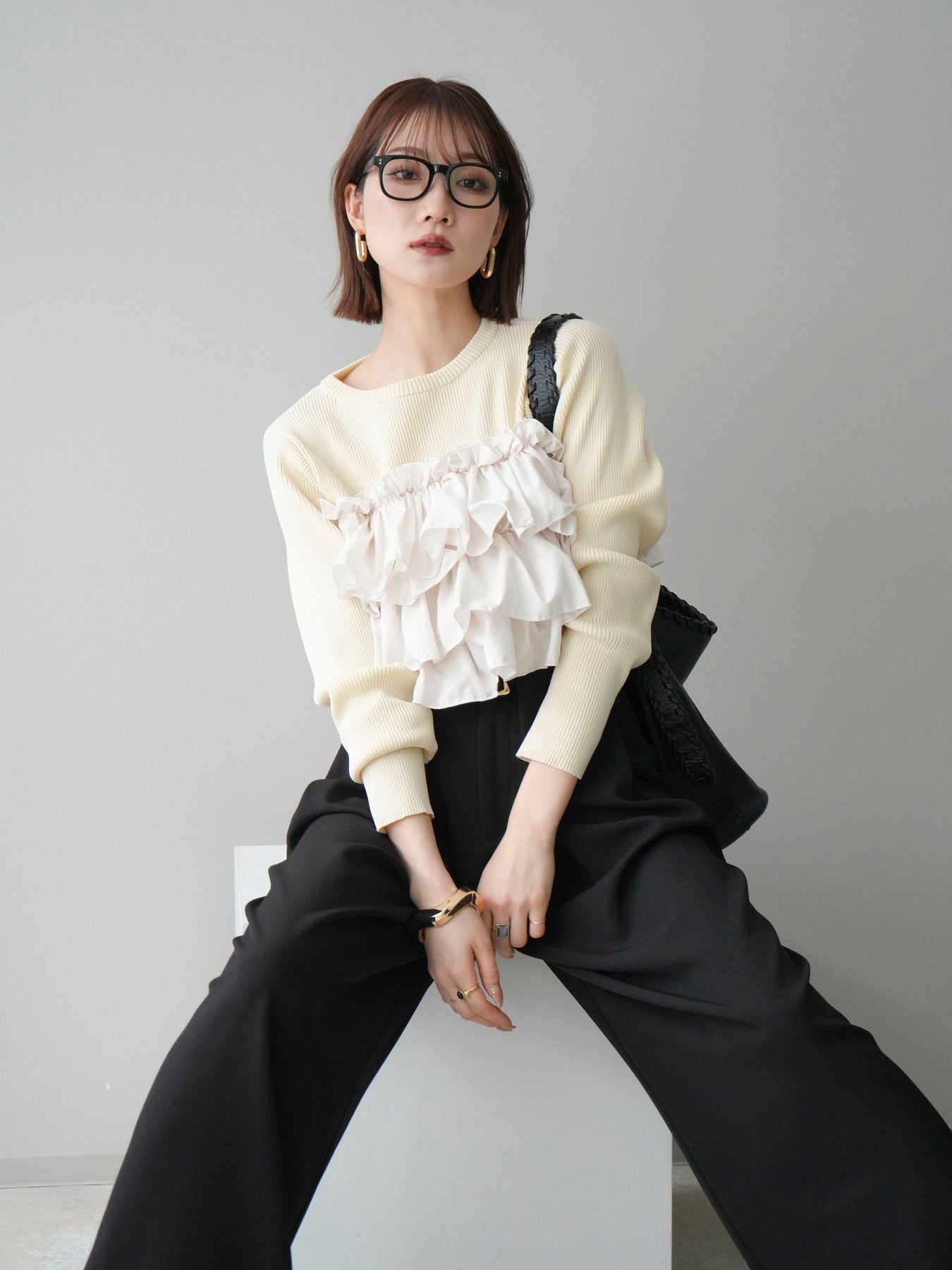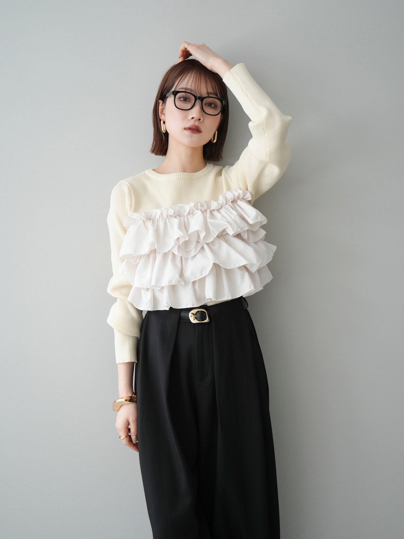 スポンジのように軽やかで弾力のあるニット素材に、フリルビスチェを重ねたようなドッキングデザインのプルオーバー。 一枚でレイヤードスタイルが完成し、立体感のあるフリルがコーディネートに華やかさを添えます。 ニット部分は程よくフィット感がありつつも柔らかな着心地で、デイリーに取り入れやすい仕上がり。 シンプルなボトムと合わせるだけで、女性らしさと存在感を兼ね備えたスタイリングが完成します。 きれいめにもカジュアルにも着回せる、主役級のトップスです。 ※ボトムス、キャミソール(インナー)以外の商品は一律でインナーは付属していません。
