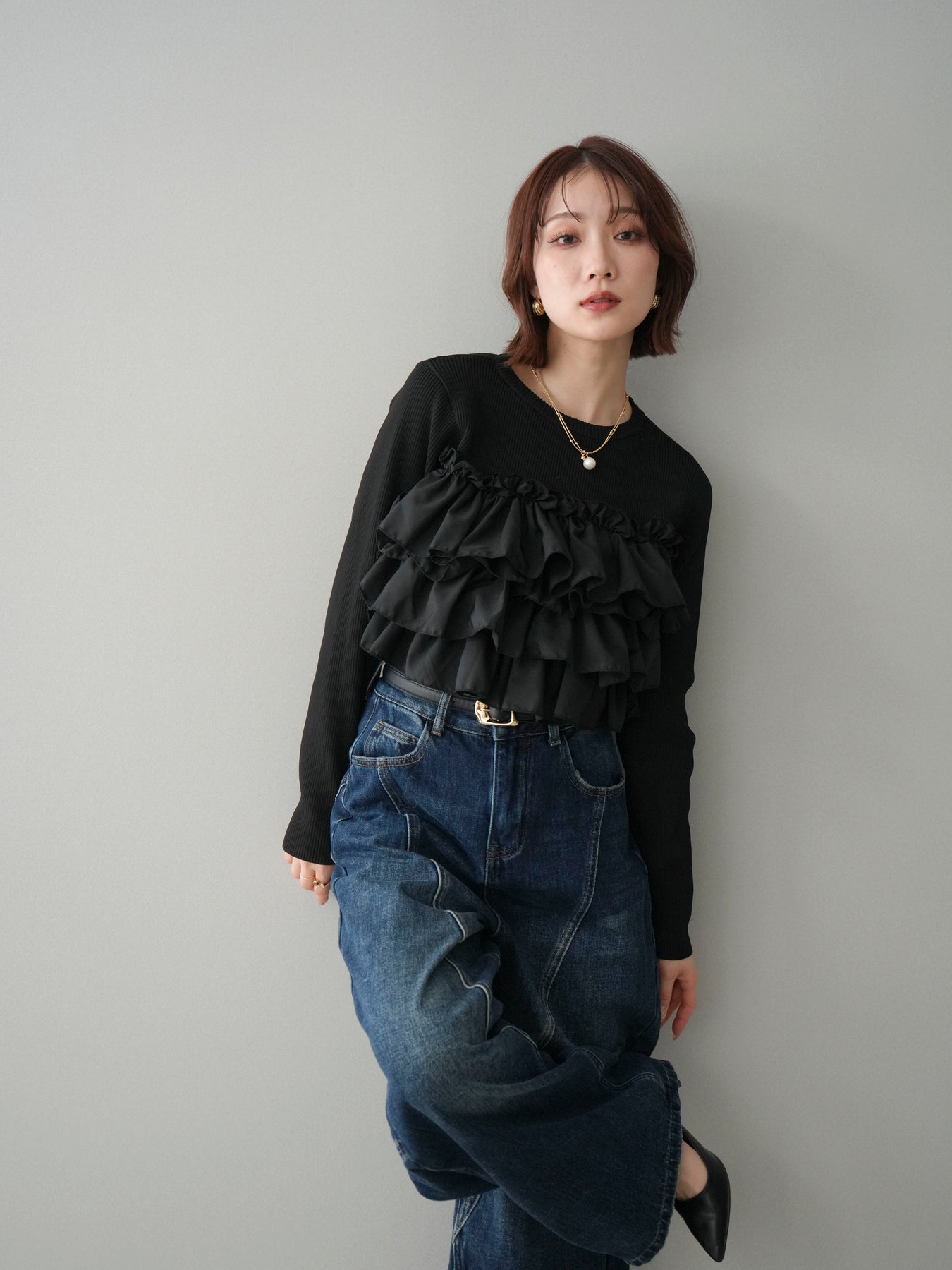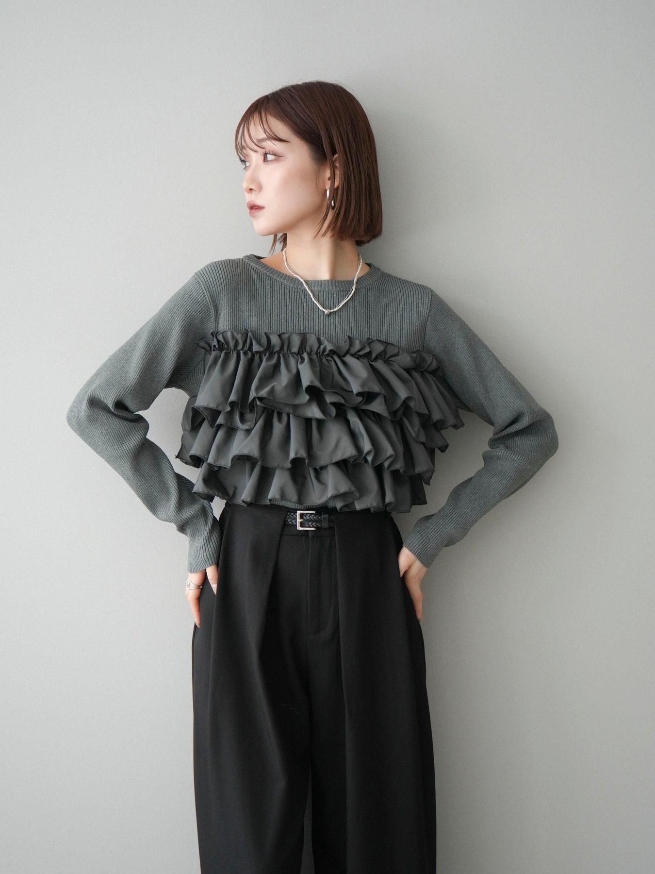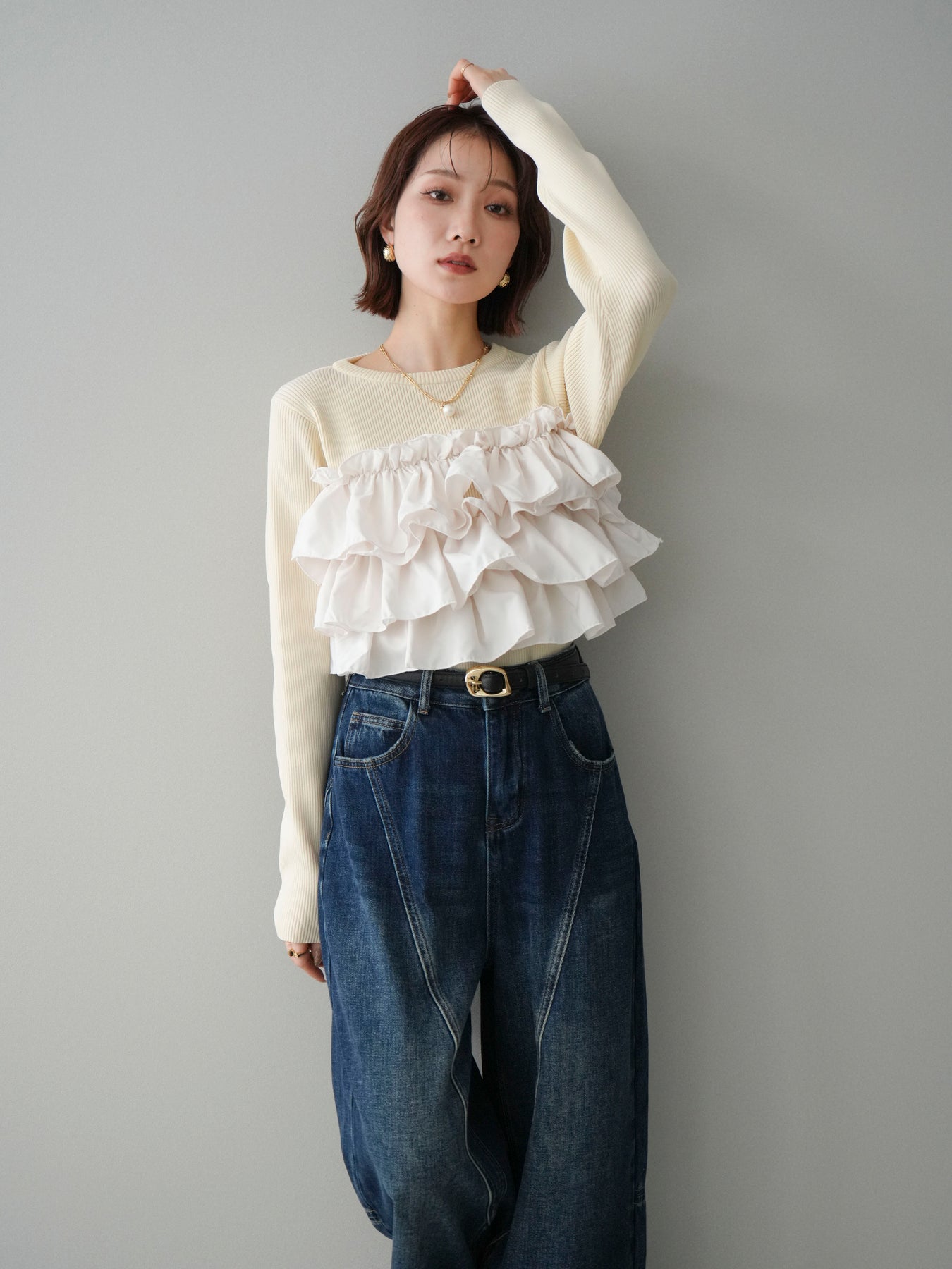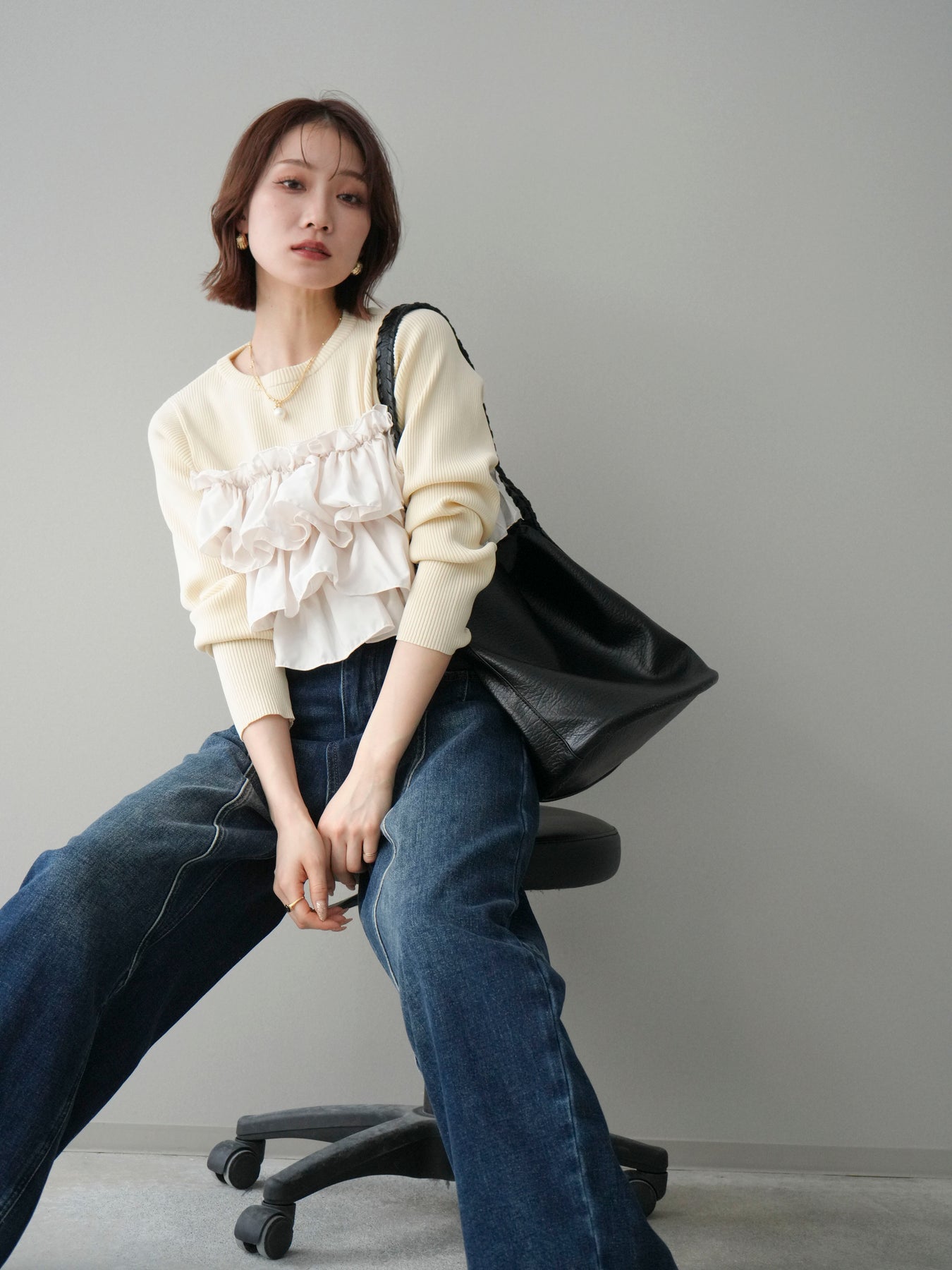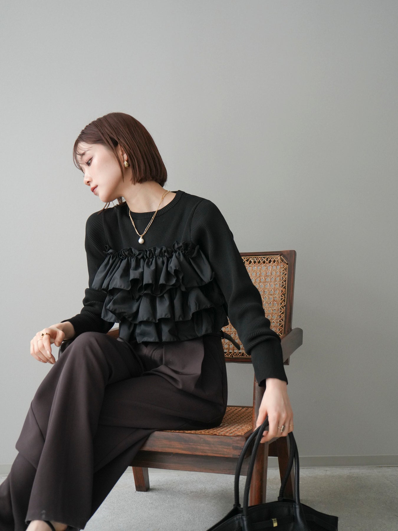 スポンジのように軽やかで弾力のあるニット素材に、フリルビスチェを重ねたようなドッキングデザインのプルオーバー。 一枚でレイヤードスタイルが完成し、立体感のあるフリルがコーディネートに華やかさを添えます。 ニット部分は程よくフィット感がありつつも柔らかな着心地で、デイリーに取り入れやすい仕上がり。 シンプルなボトムと合わせるだけで、女性らしさと存在感を兼ね備えたスタイリングが完成します。 きれいめにもカジュアルにも着回せる、主役級のトップスです。 ※ボトムス、キャミソール(インナー)以外の商品は一律でインナーは付属していません。