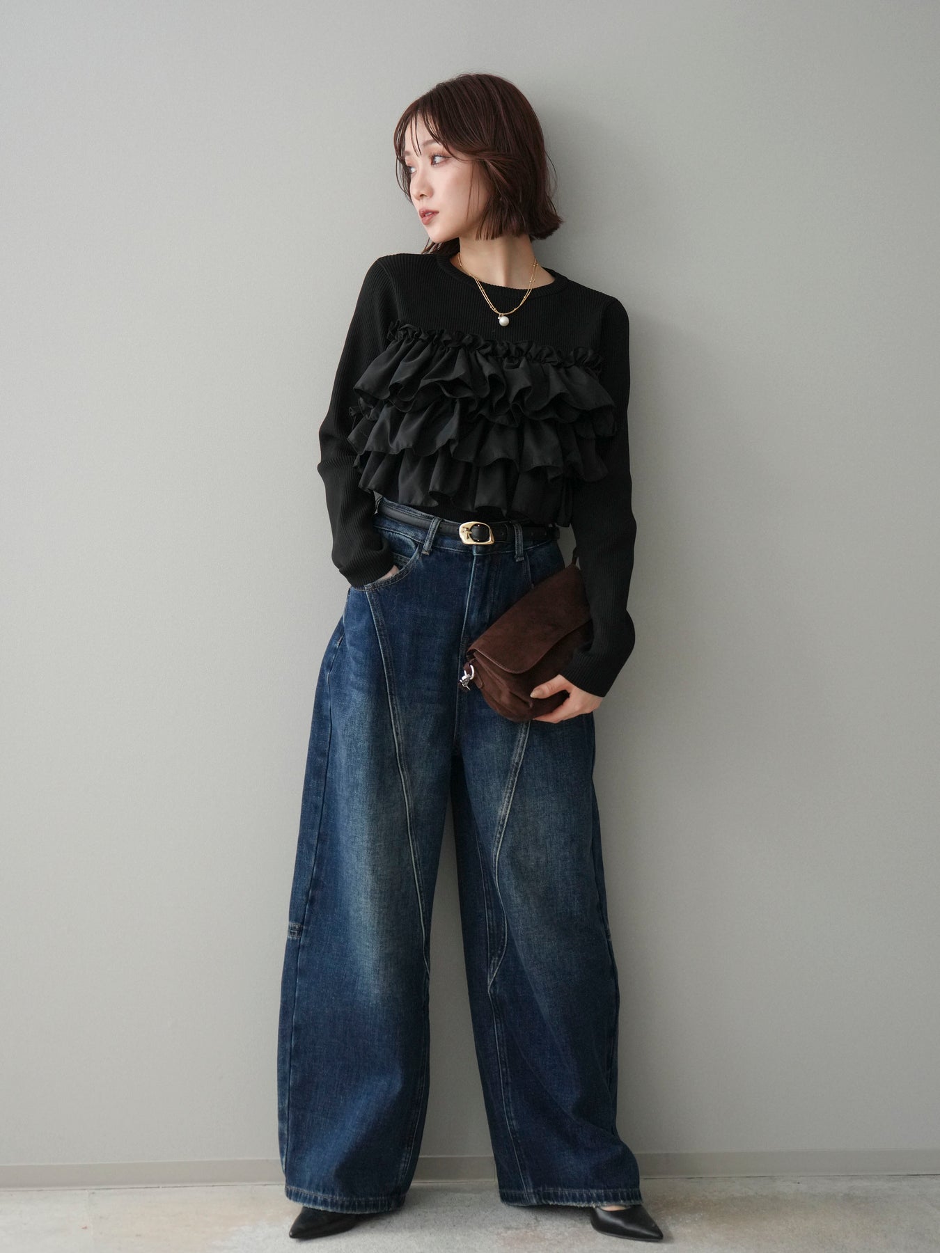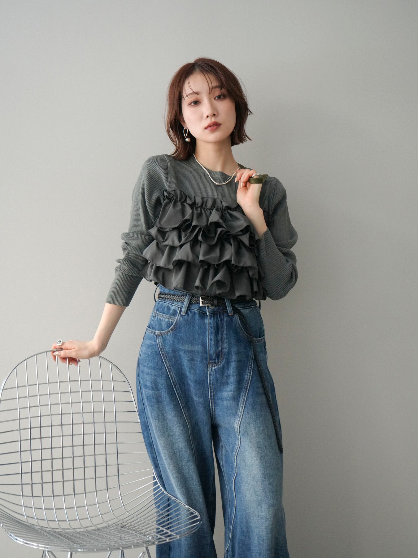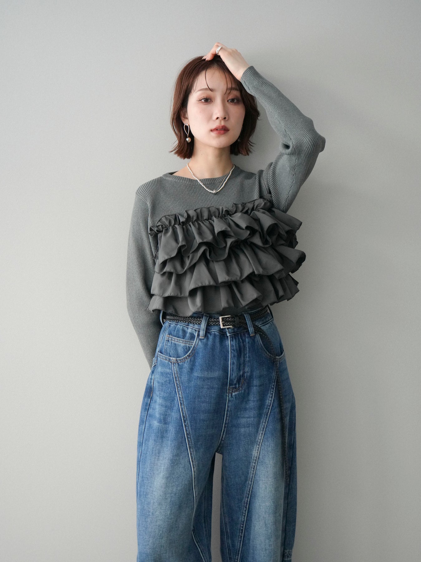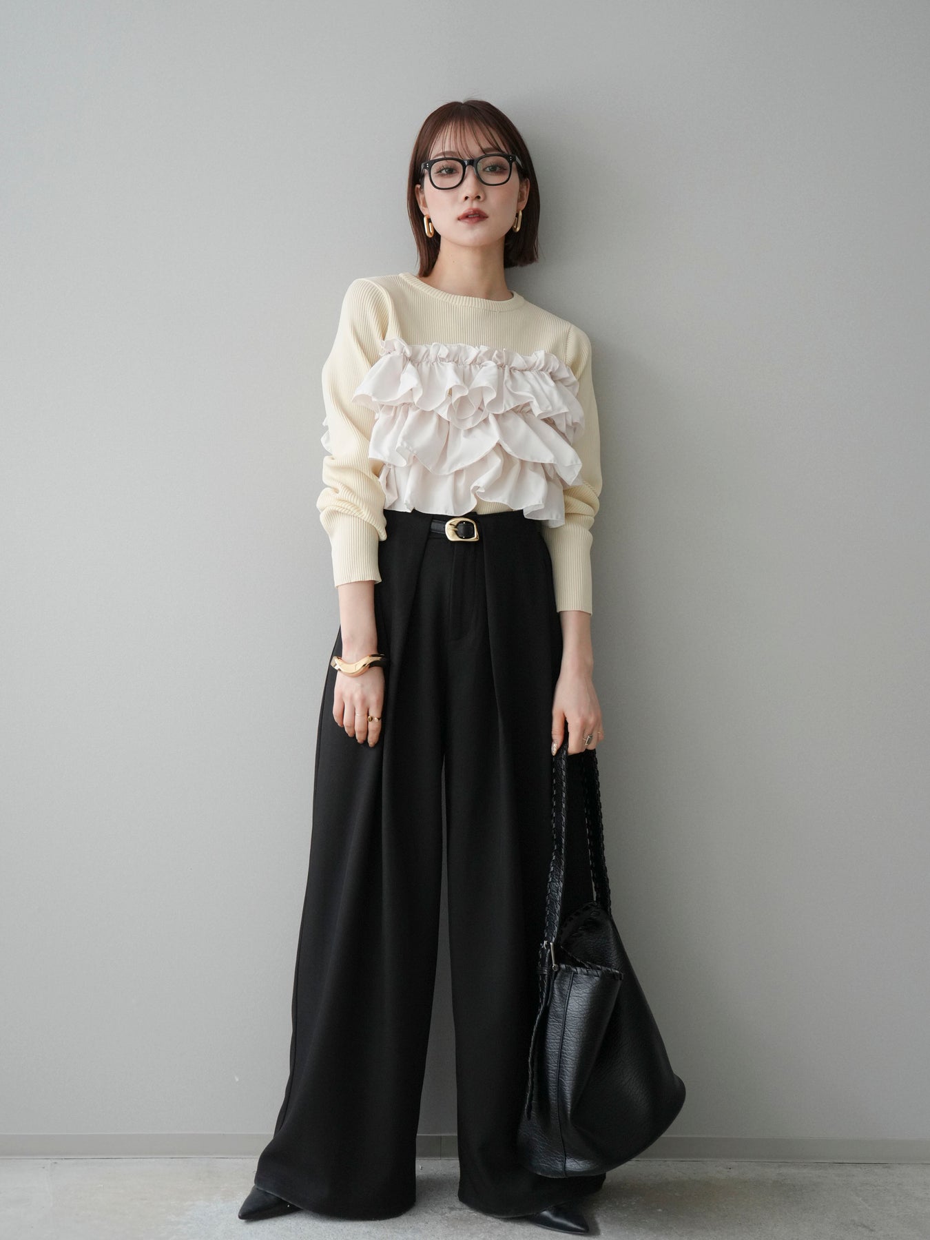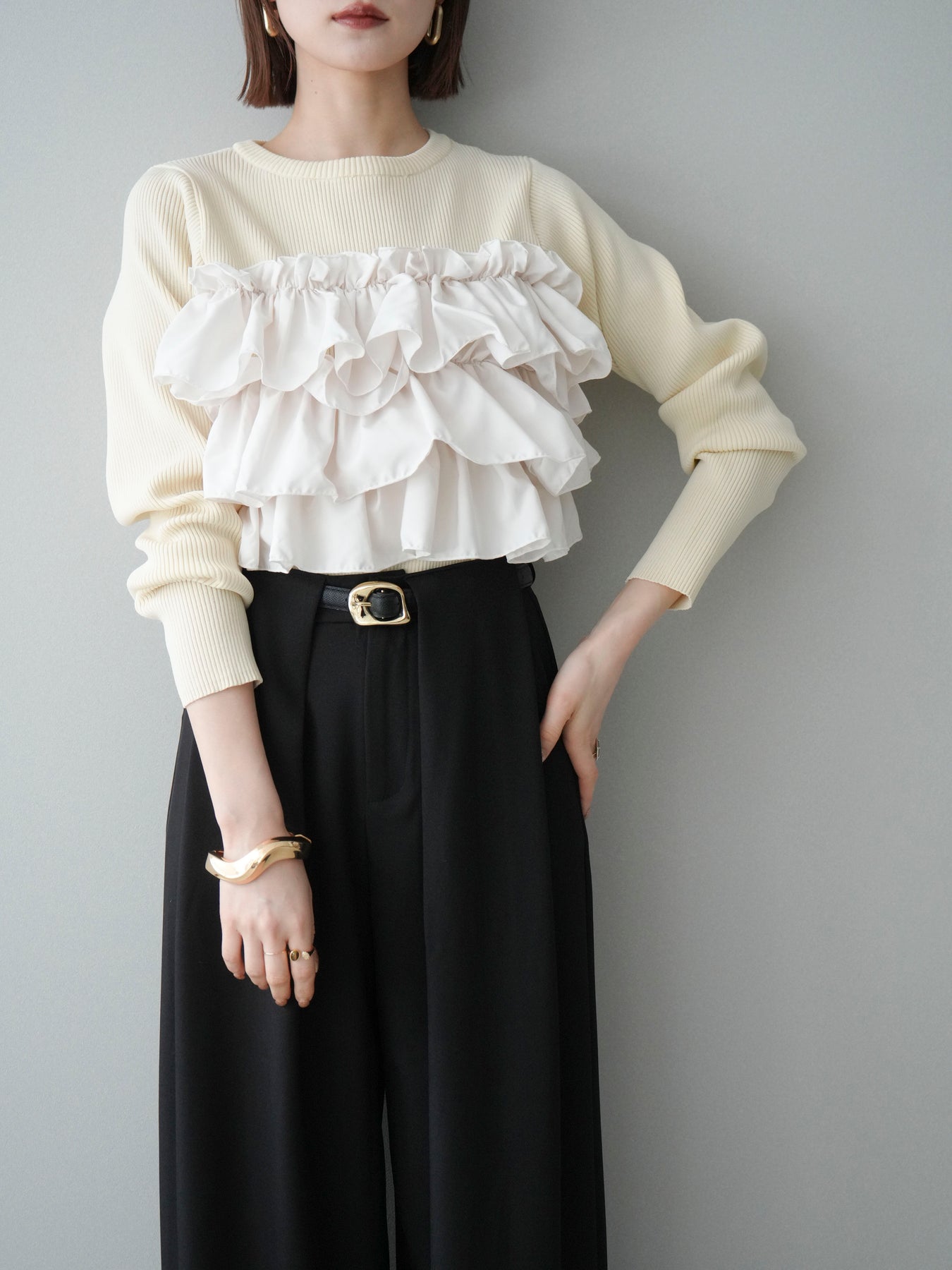 スポンジのように軽やかで弾力のあるニット素材に、フリルビスチェを重ねたようなドッキングデザインのプルオーバー。 一枚でレイヤードスタイルが完成し、立体感のあるフリルがコーディネートに華やかさを添えます。 ニット部分は程よくフィット感がありつつも柔らかな着心地で、デイリーに取り入れやすい仕上がり。 シンプルなボトムと合わせるだけで、女性らしさと存在感を兼ね備えたスタイリングが完成します。 きれいめにもカジュアルにも着回せる、主役級のトップスです。 ※ボトムス、キャミソール(インナー)以外の商品は一律でインナーは付属していません。