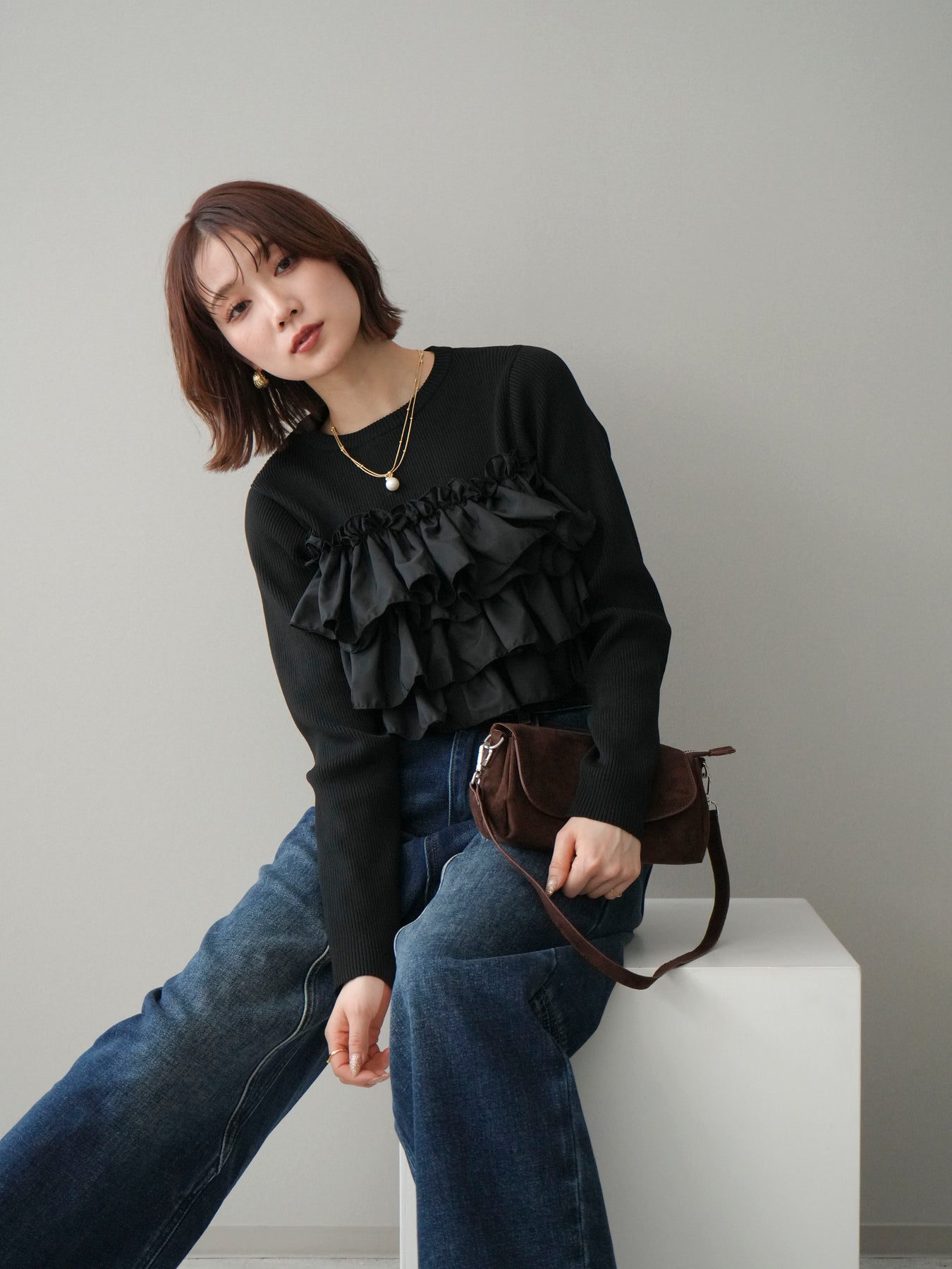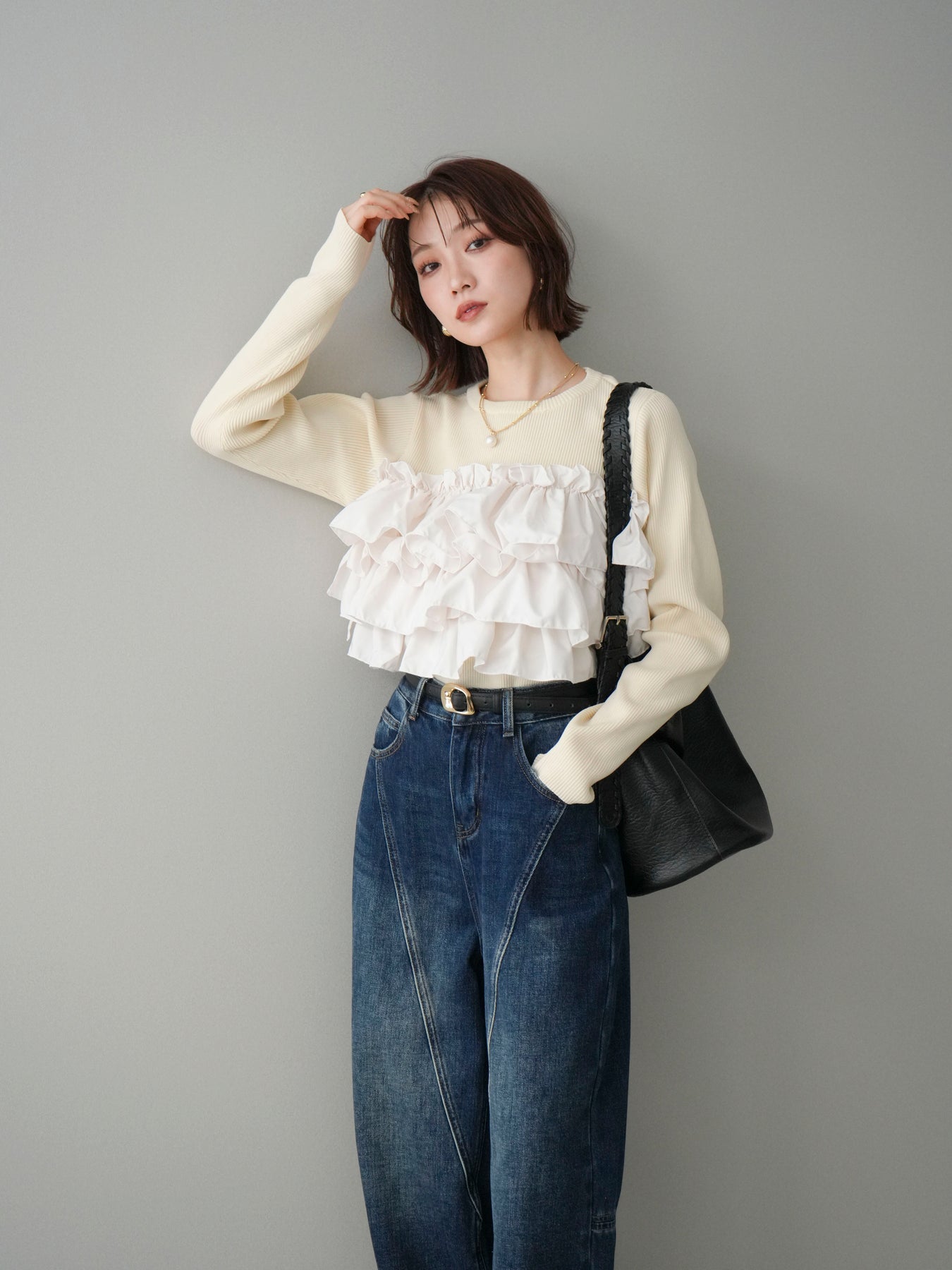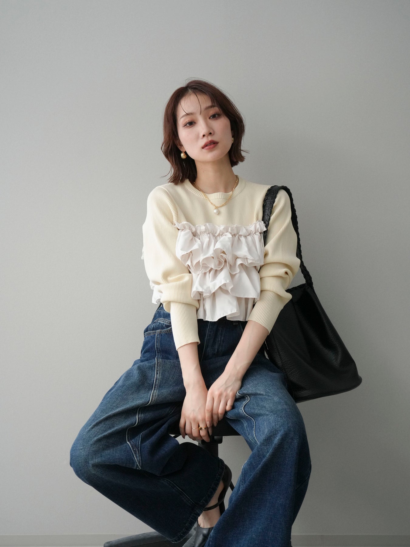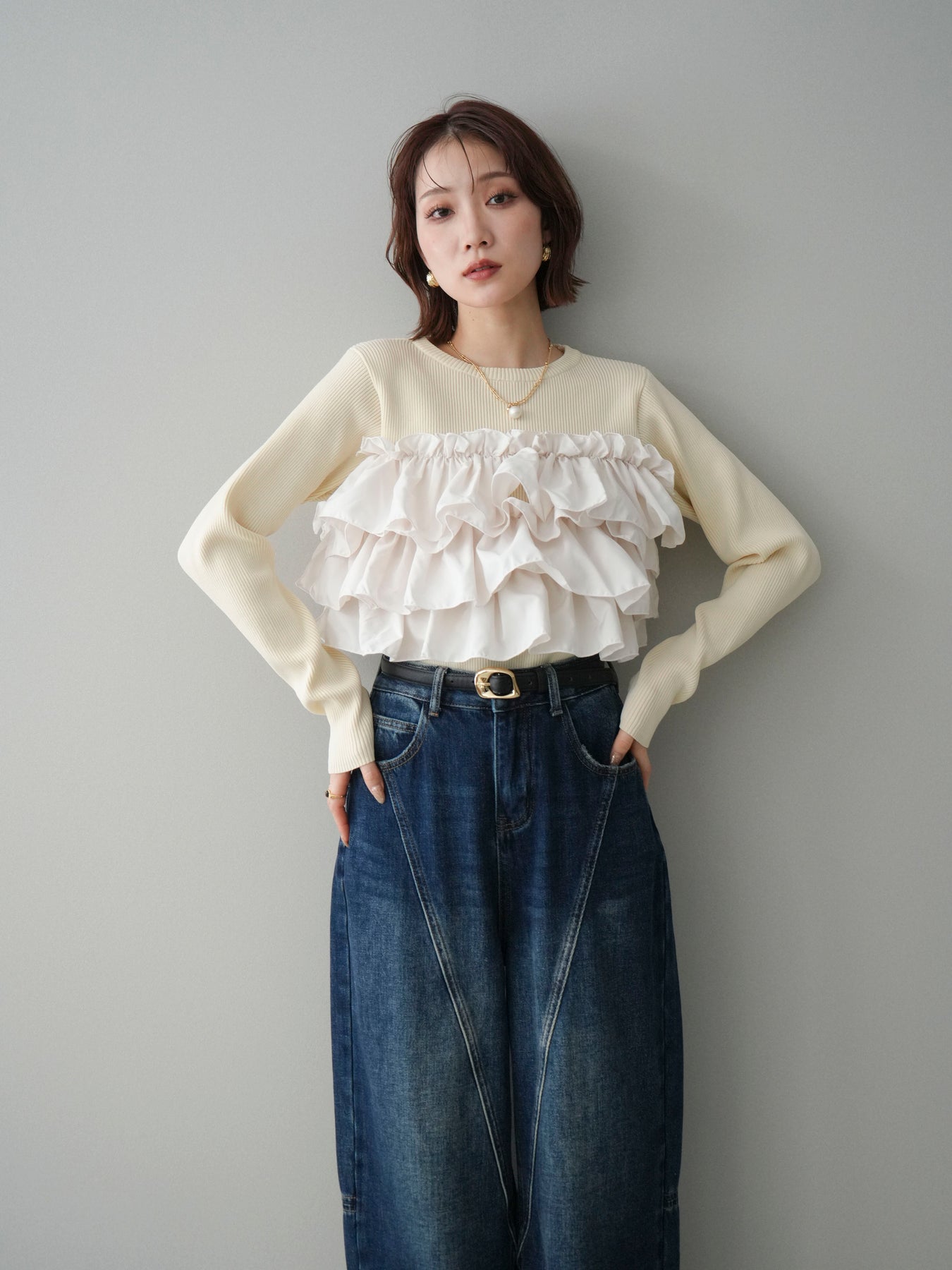 スポンジのように軽やかで弾力のあるニット素材に、フリルビスチェを重ねたようなドッキングデザインのプルオーバー。 一枚でレイヤードスタイルが完成し、立体感のあるフリルがコーディネートに華やかさを添えます。 ニット部分は程よくフィット感がありつつも柔らかな着心地で、デイリーに取り入れやすい仕上がり。 シンプルなボトムと合わせるだけで、女性らしさと存在感を兼ね備えたスタイリングが完成します。 きれいめにもカジュアルにも着回せる、主役級のトップスです。 ※ボトムス、キャミソール(インナー)以外の商品は一律でインナーは付属していません。