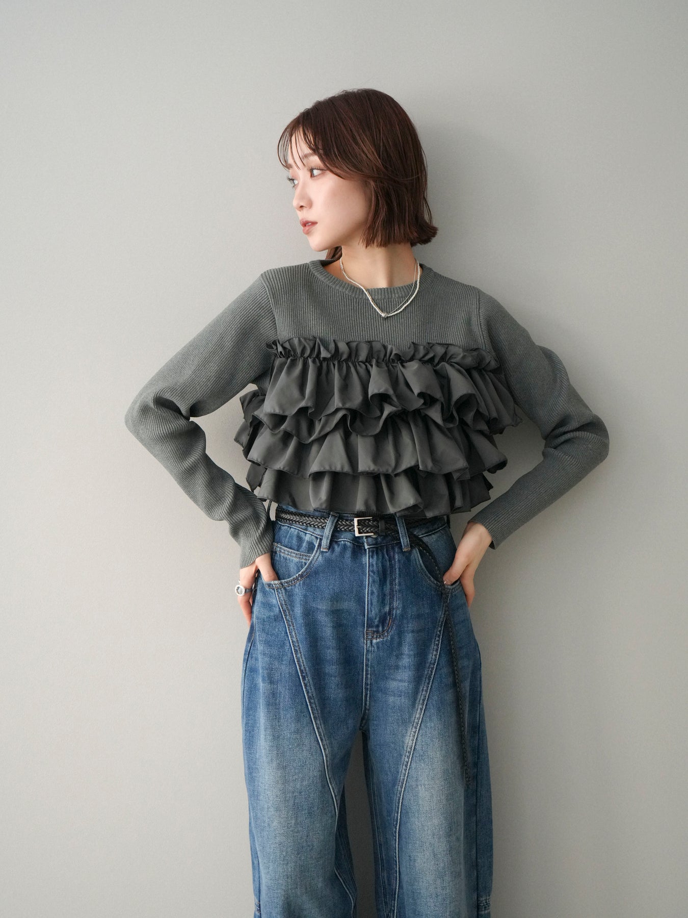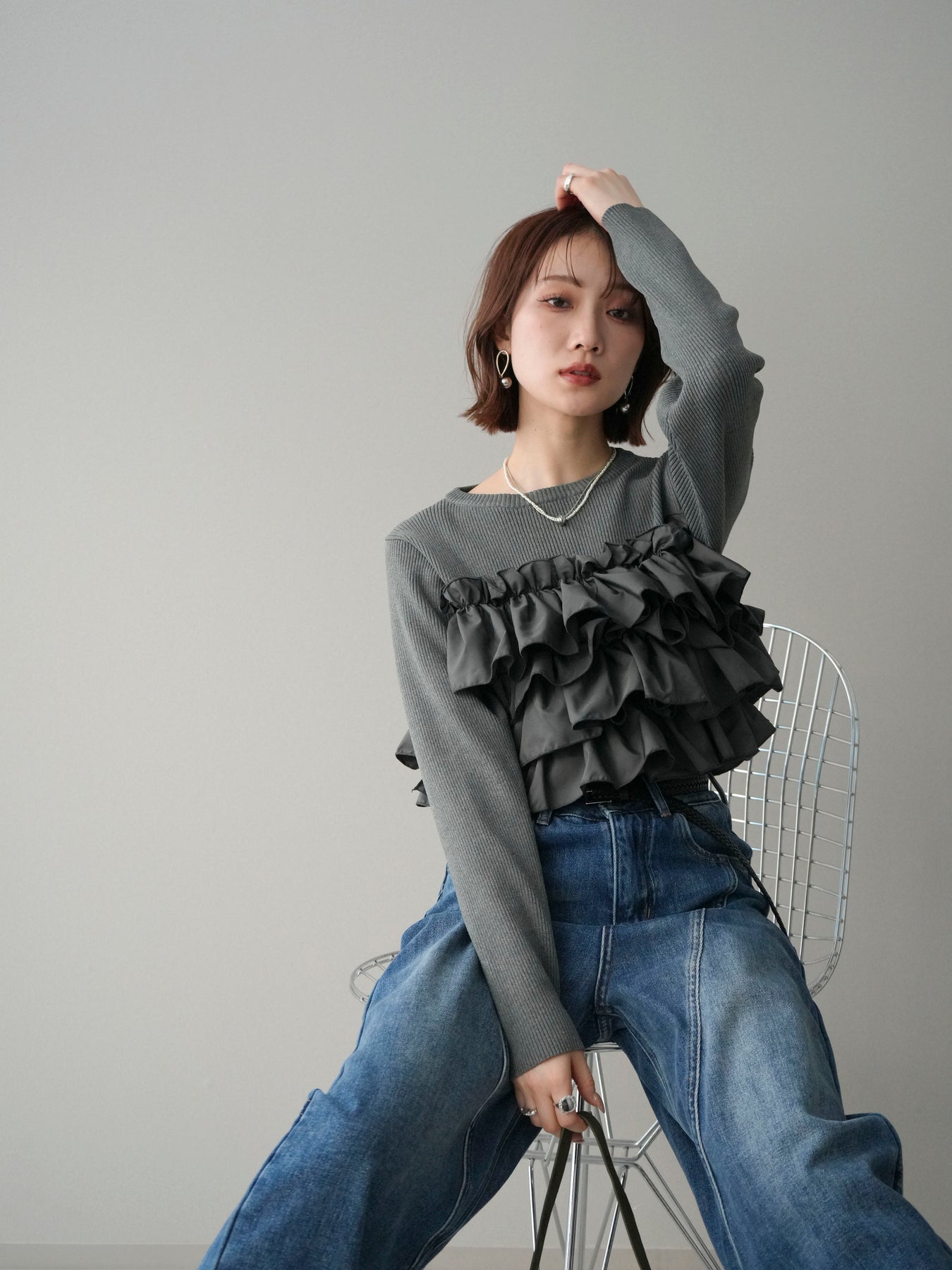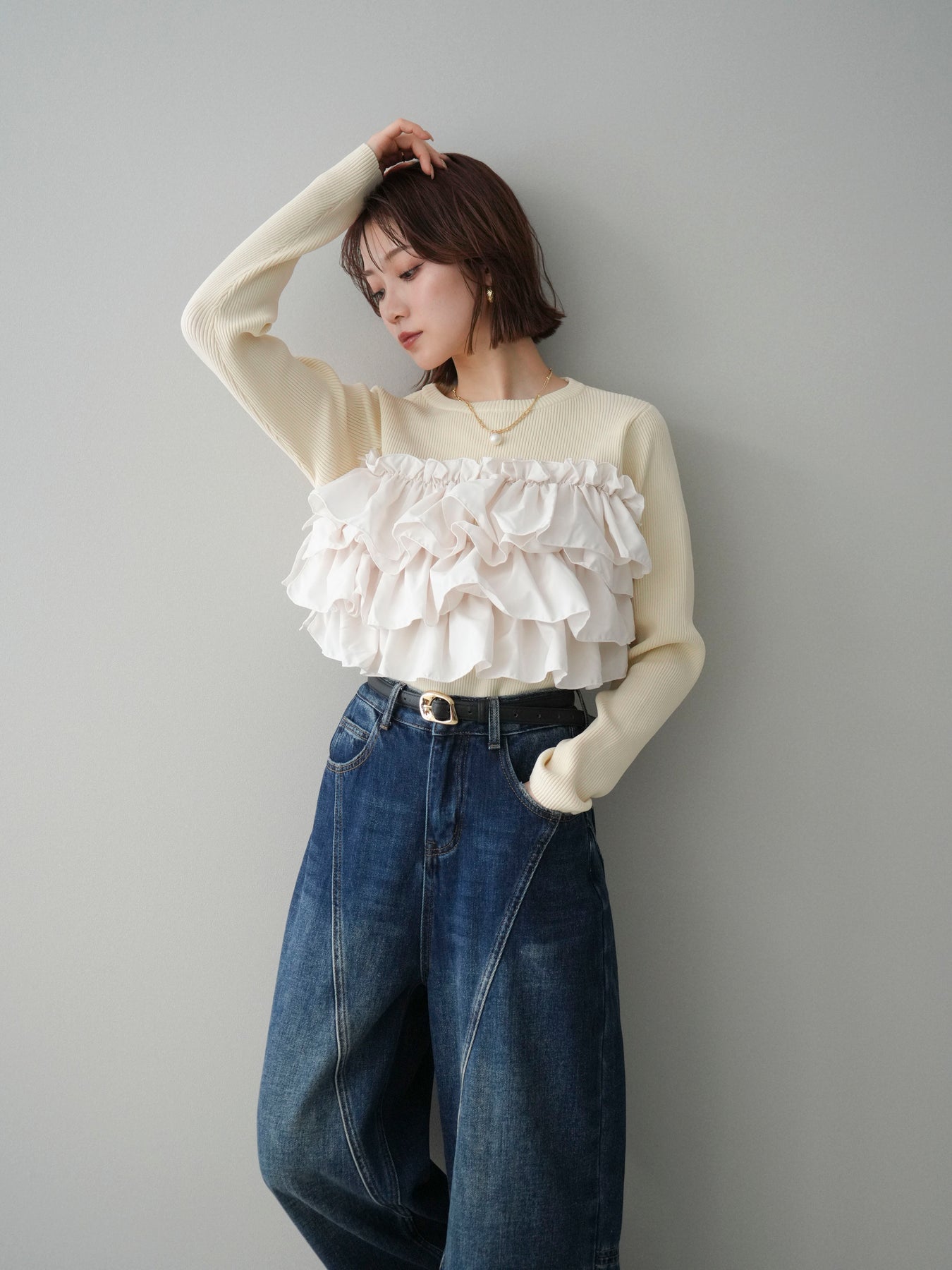 スポンジのように軽やかで弾力のあるニット素材に、フリルビスチェを重ねたようなドッキングデザインのプルオーバー。 一枚でレイヤードスタイルが完成し、立体感のあるフリルがコーディネートに華やかさを添えます。 ニット部分は程よくフィット感がありつつも柔らかな着心地で、デイリーに取り入れやすい仕上がり。 シンプルなボトムと合わせるだけで、女性らしさと存在感を兼ね備えたスタイリングが完成します。 きれいめにもカジュアルにも着回せる、主役級のトップスです。 ※ボトムス、キャミソール(インナー)以外の商品は一律でインナーは付属していません。
