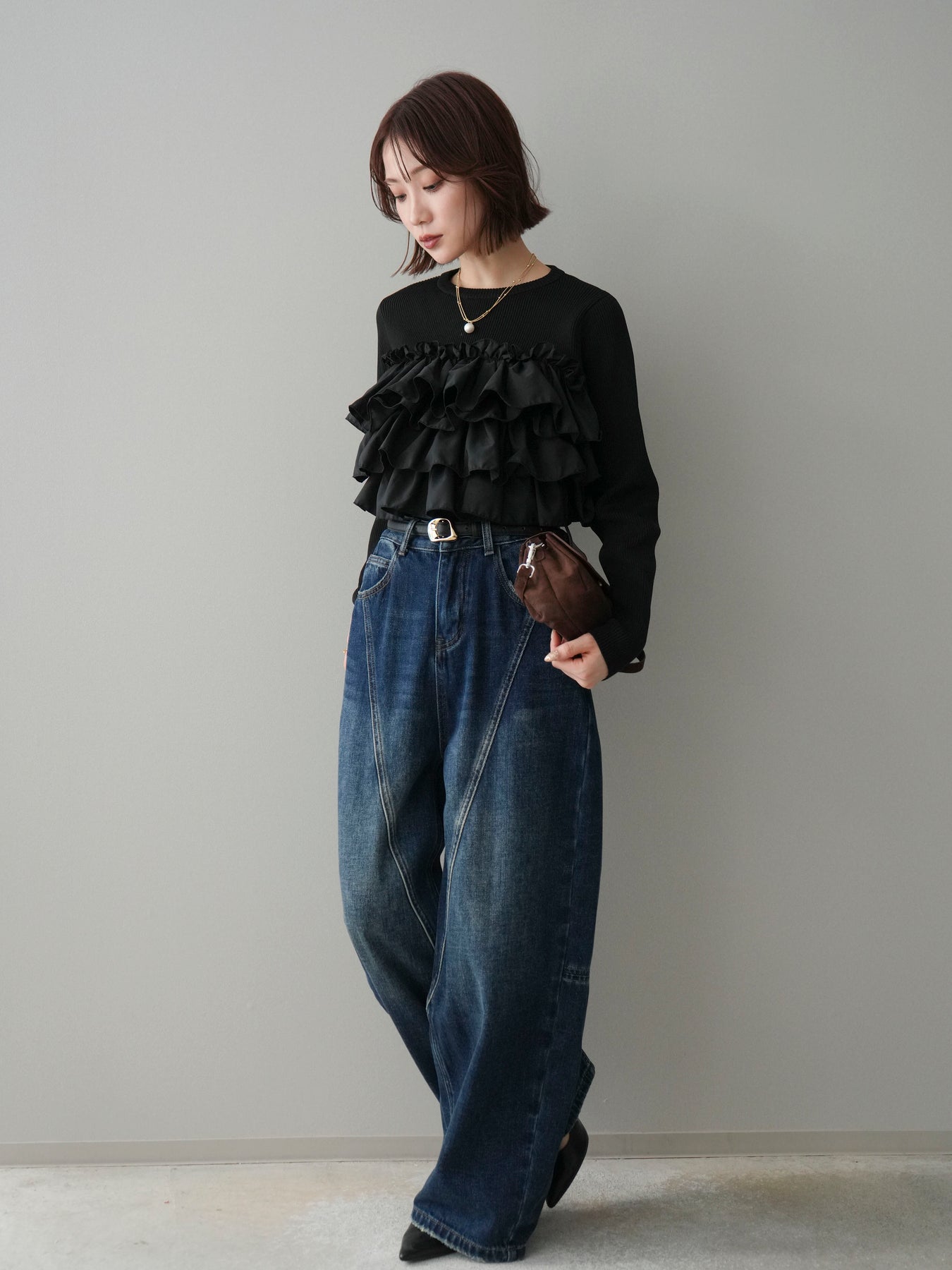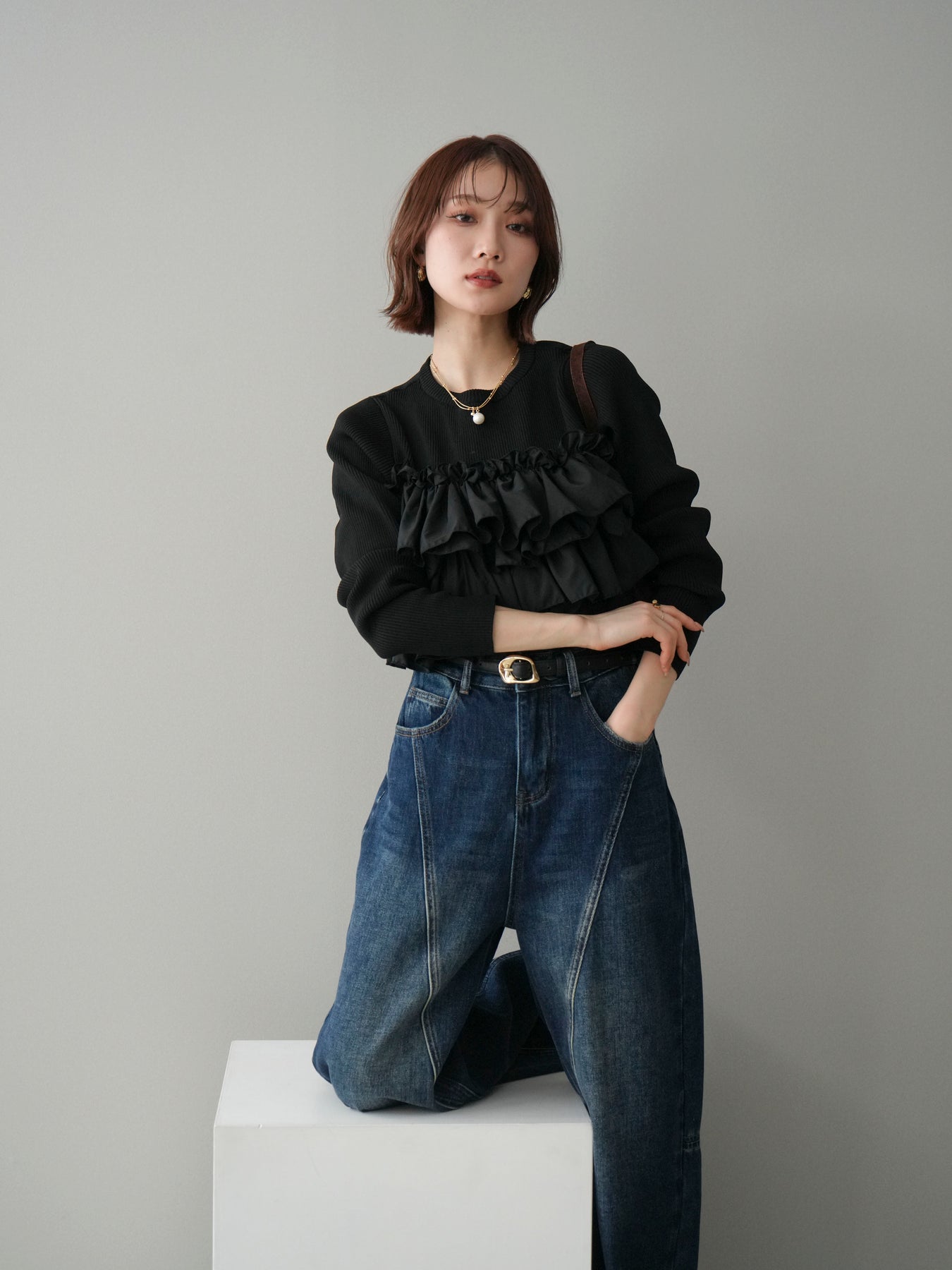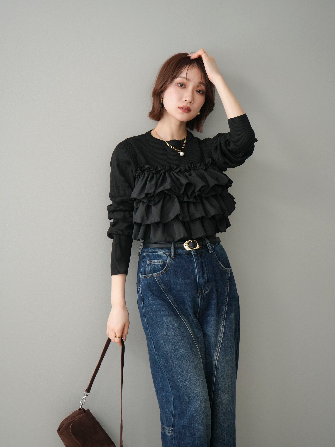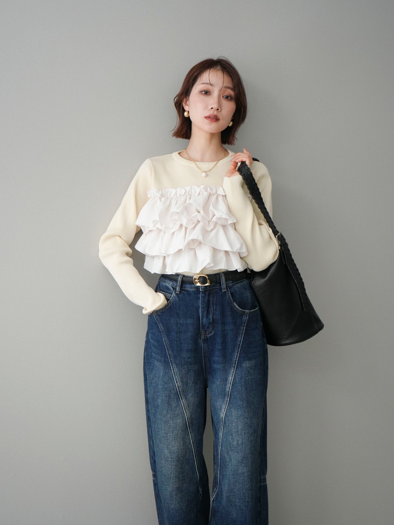 スポンジのように軽やかで弾力のあるニット素材に、フリルビスチェを重ねたようなドッキングデザインのプルオーバー。 一枚でレイヤードスタイルが完成し、立体感のあるフリルがコーディネートに華やかさを添えます。 ニット部分は程よくフィット感がありつつも柔らかな着心地で、デイリーに取り入れやすい仕上がり。 シンプルなボトムと合わせるだけで、女性らしさと存在感を兼ね備えたスタイリングが完成します。 きれいめにもカジュアルにも着回せる、主役級のトップスです。 ※ボトムス、キャミソール(インナー)以外の商品は一律でインナーは付属していません。