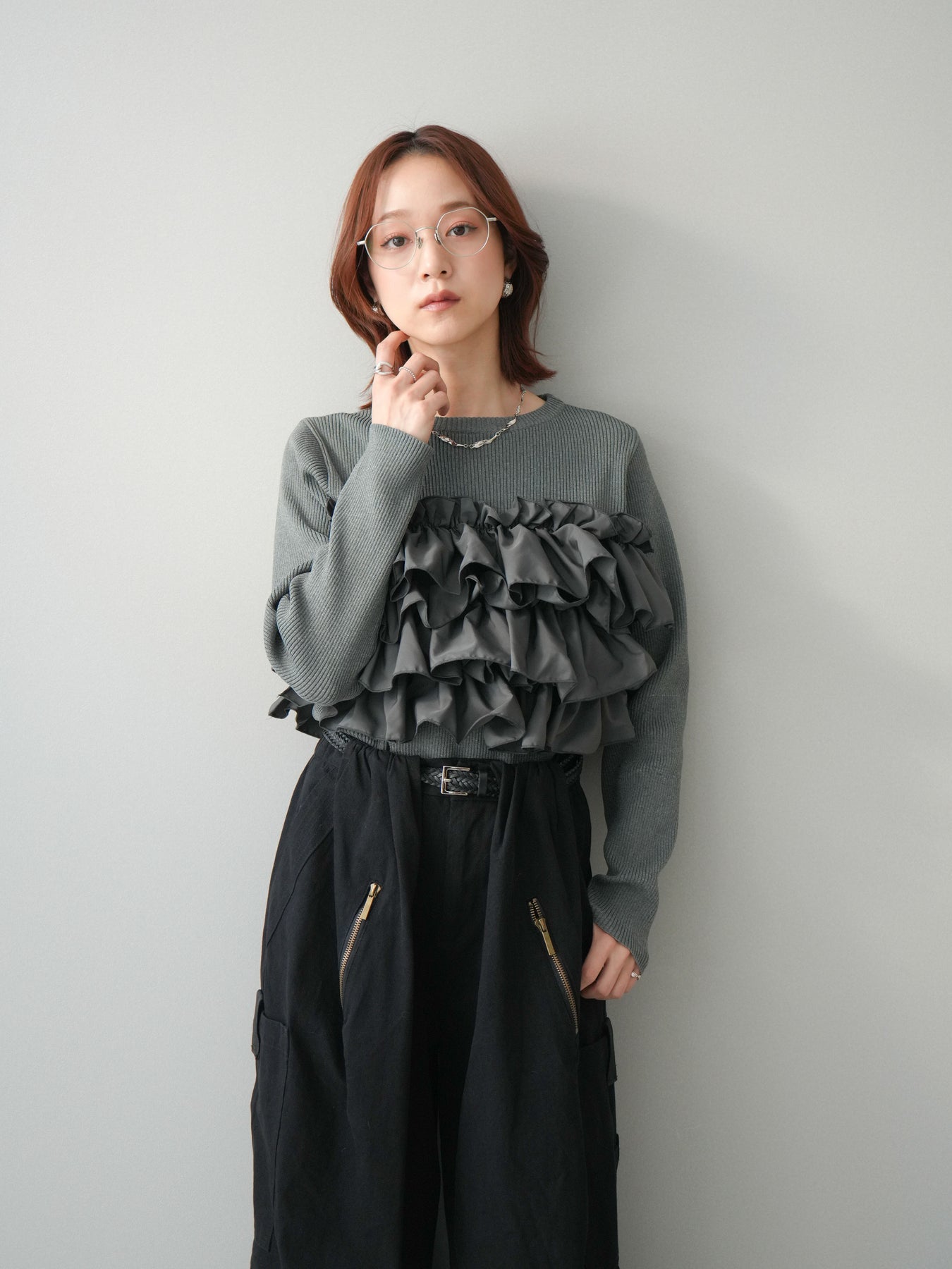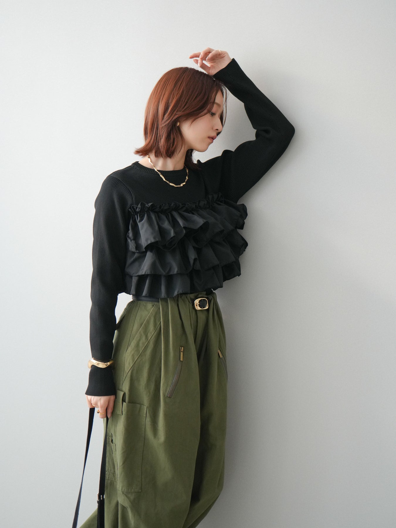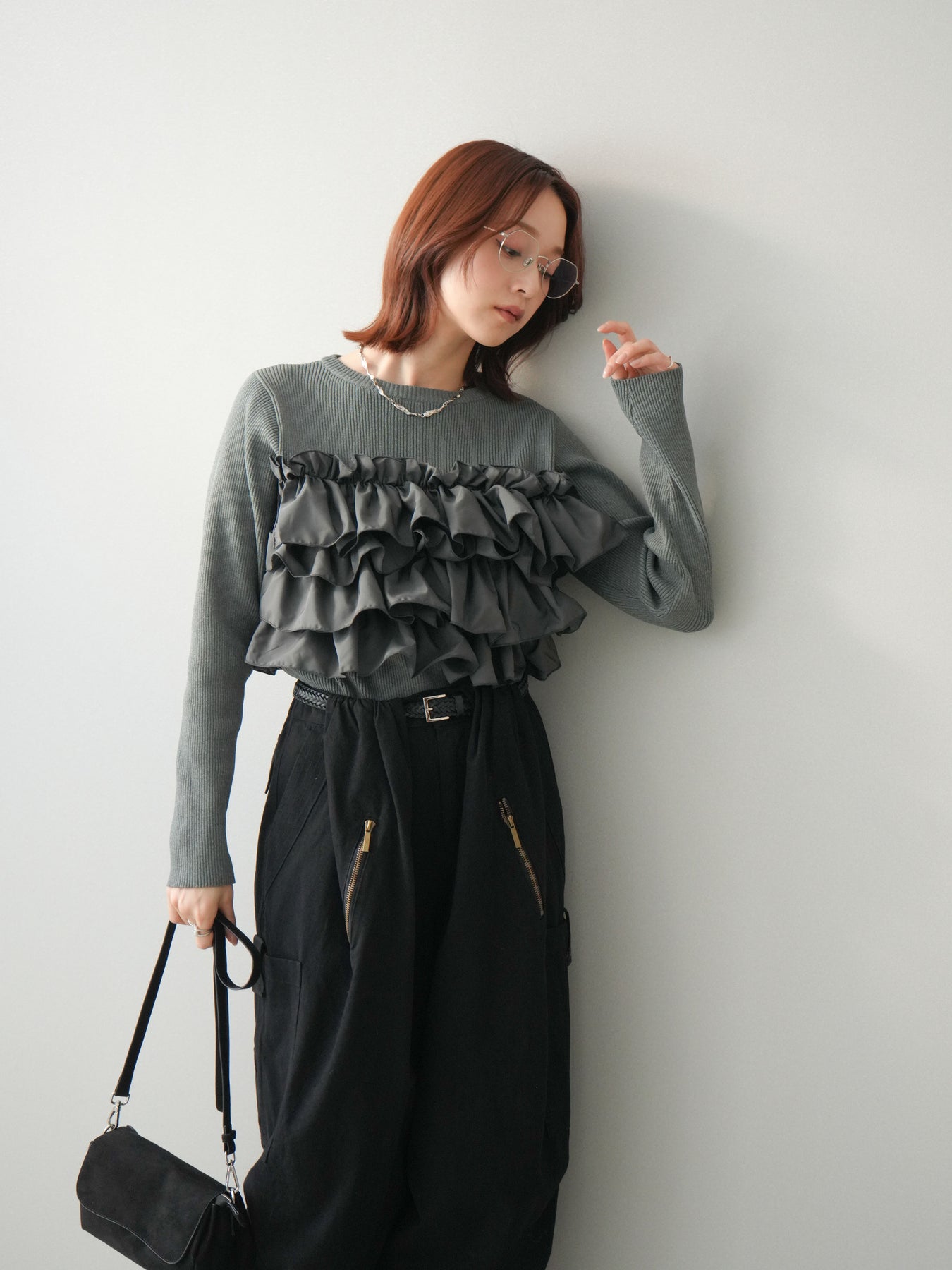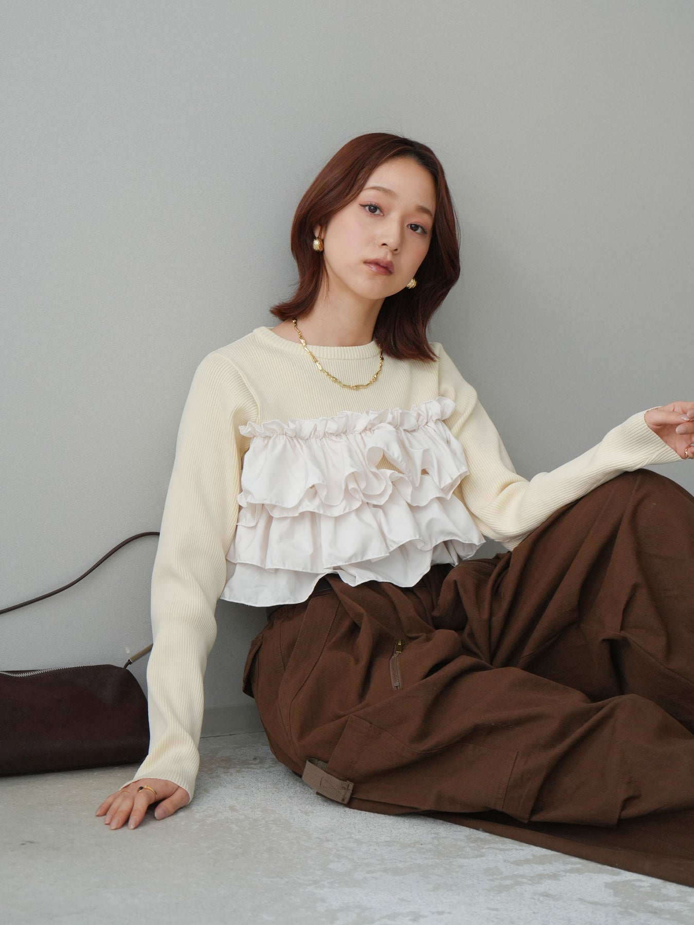 スポンジのように軽やかで弾力のあるニット素材に、フリルビスチェを重ねたようなドッキングデザインのプルオーバー。 一枚でレイヤードスタイルが完成し、立体感のあるフリルがコーディネートに華やかさを添えます。 ニット部分は程よくフィット感がありつつも柔らかな着心地で、デイリーに取り入れやすい仕上がり。 シンプルなボトムと合わせるだけで、女性らしさと存在感を兼ね備えたスタイリングが完成します。 きれいめにもカジュアルにも着回せる、主役級のトップスです。 ※ボトムス、キャミソール(インナー)以外の商品は一律でインナーは付属していません。