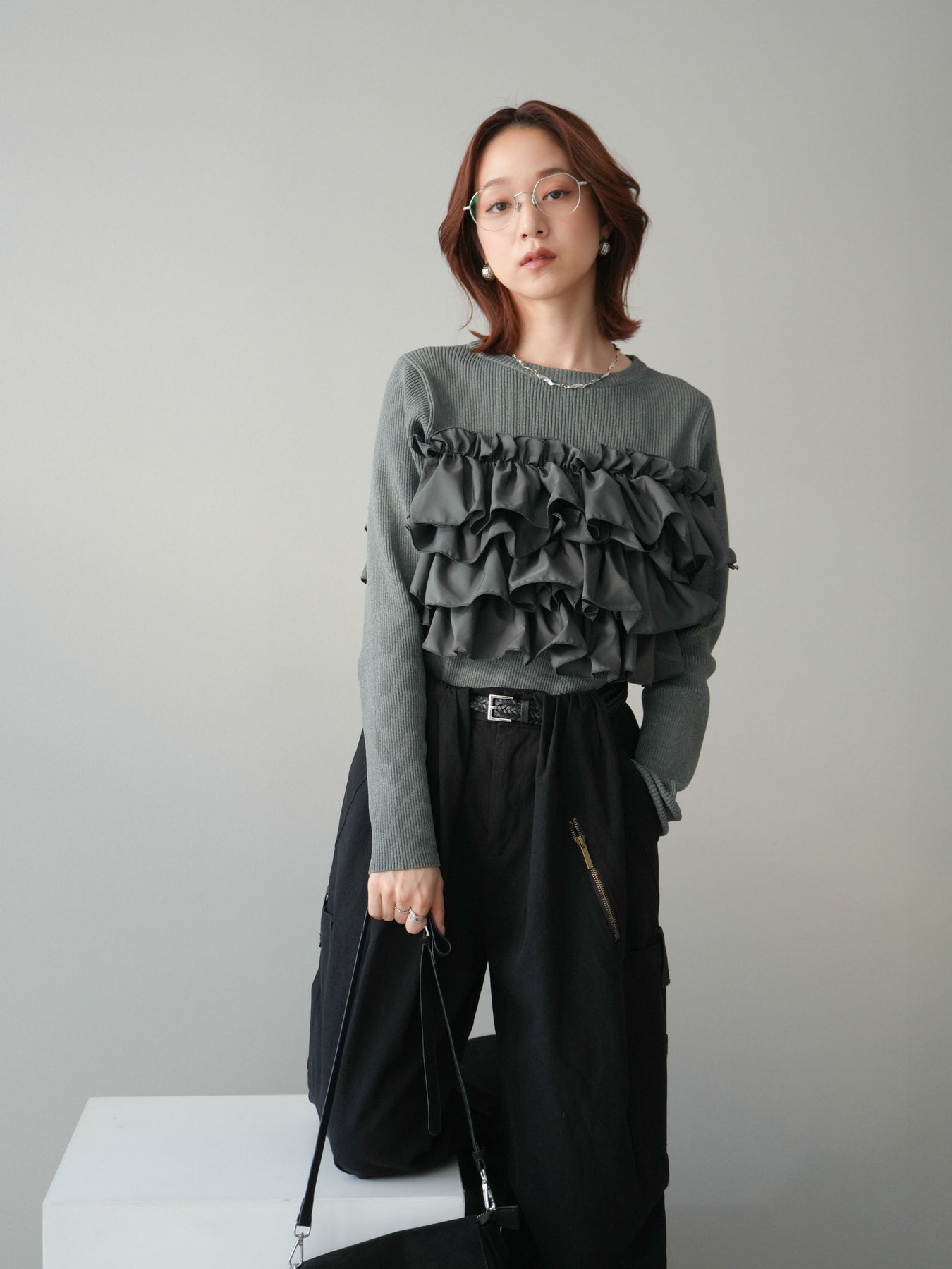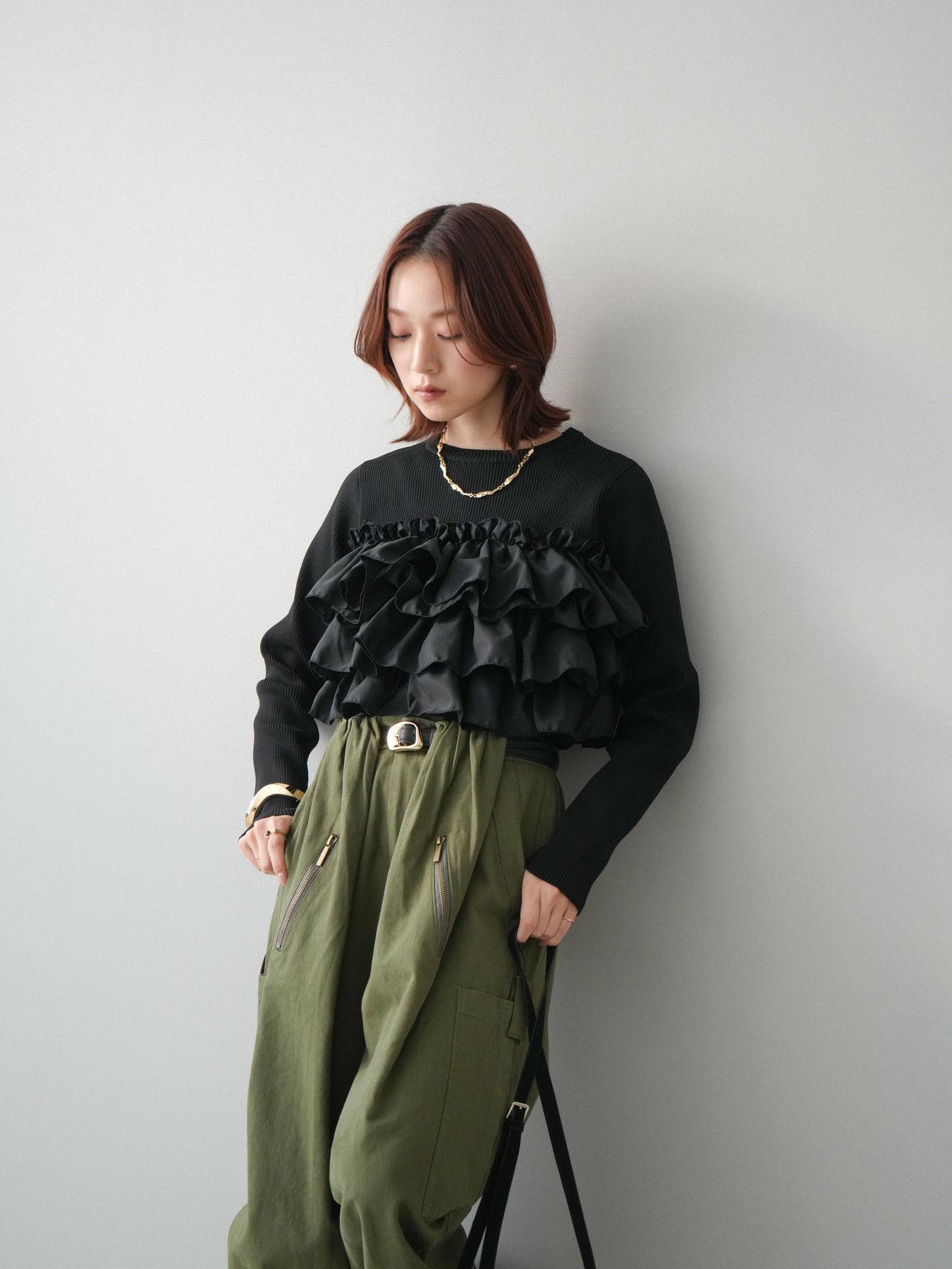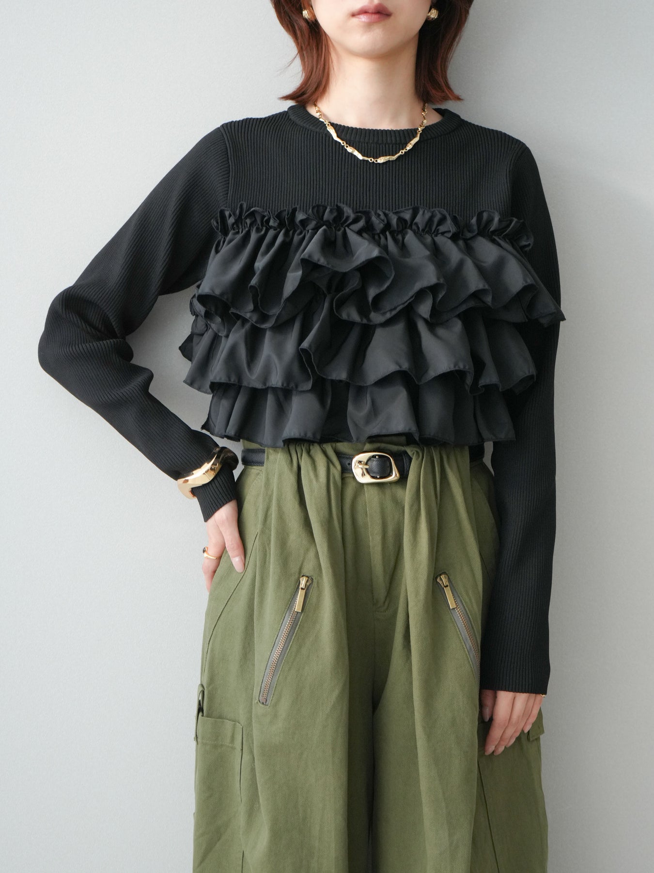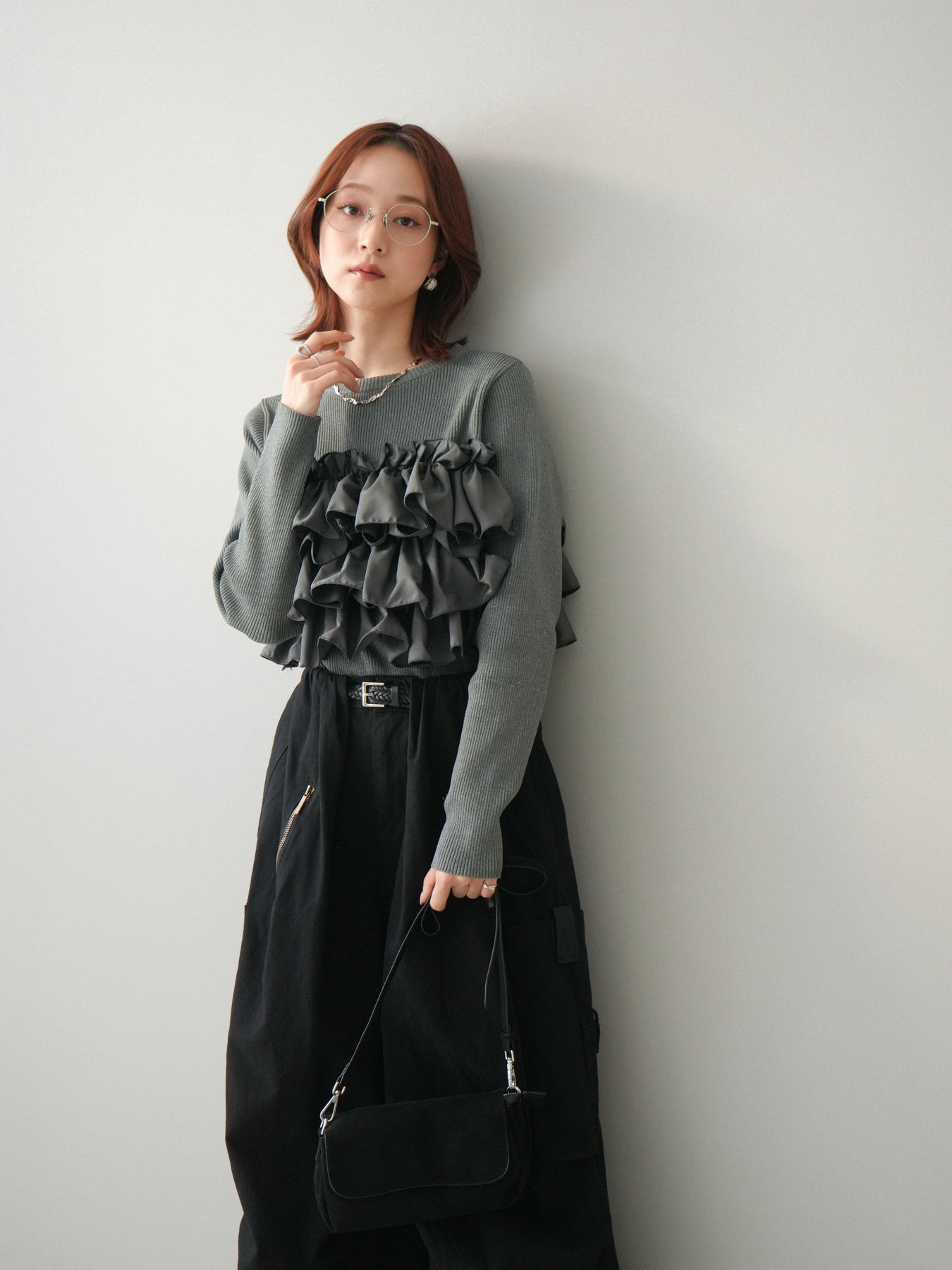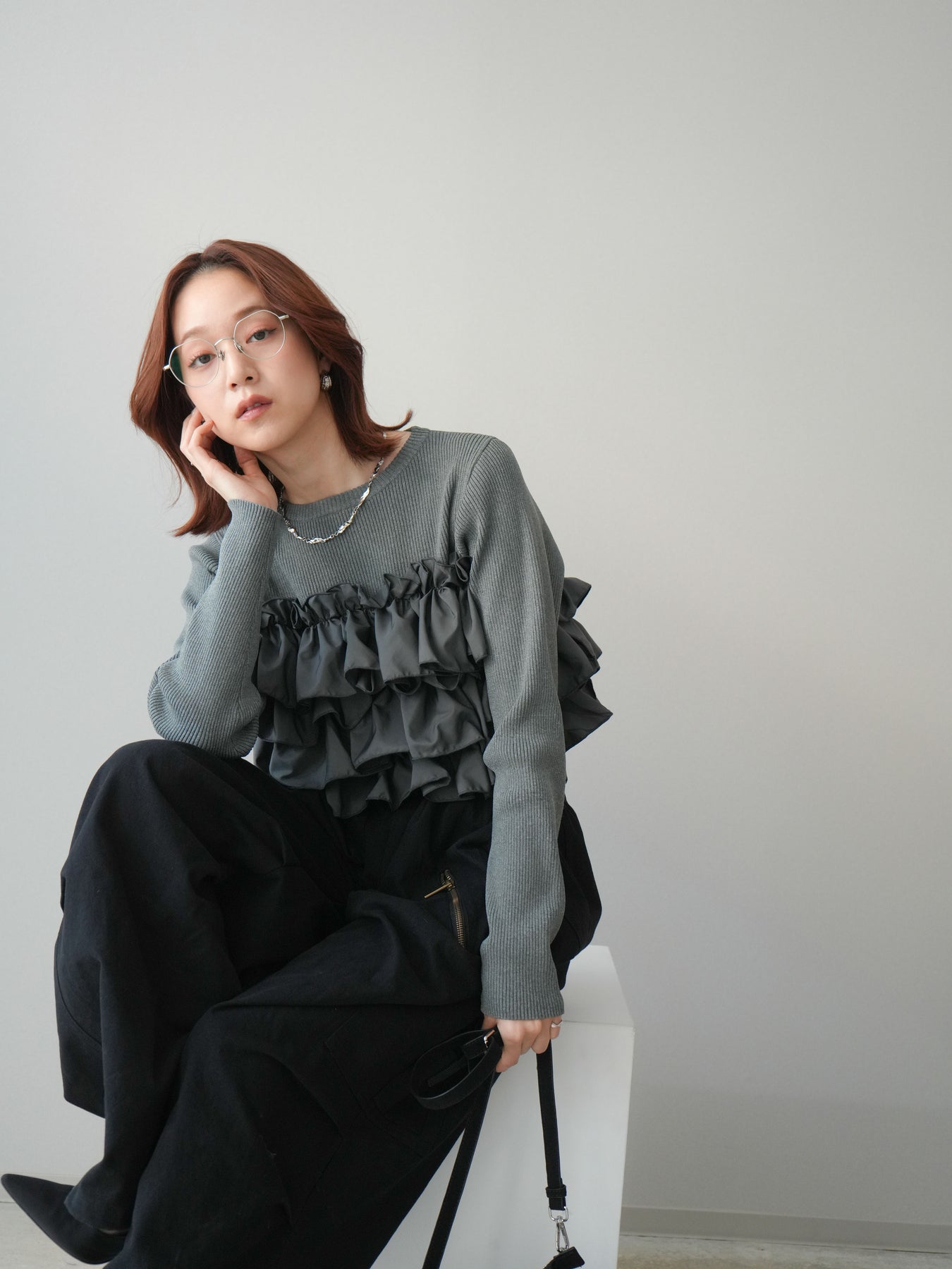 スポンジのように軽やかで弾力のあるニット素材に、フリルビスチェを重ねたようなドッキングデザインのプルオーバー。 一枚でレイヤードスタイルが完成し、立体感のあるフリルがコーディネートに華やかさを添えます。 ニット部分は程よくフィット感がありつつも柔らかな着心地で、デイリーに取り入れやすい仕上がり。 シンプルなボトムと合わせるだけで、女性らしさと存在感を兼ね備えたスタイリングが完成します。 きれいめにもカジュアルにも着回せる、主役級のトップスです。 ※ボトムス、キャミソール(インナー)以外の商品は一律でインナーは付属していません。