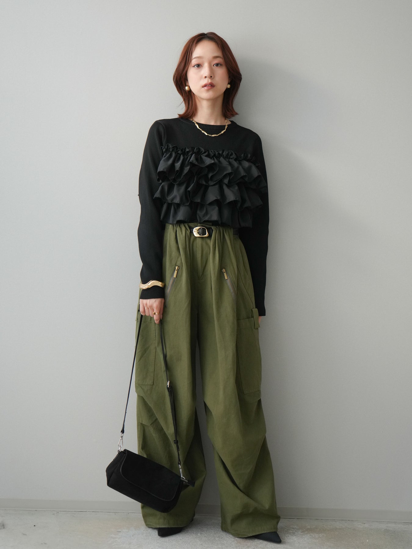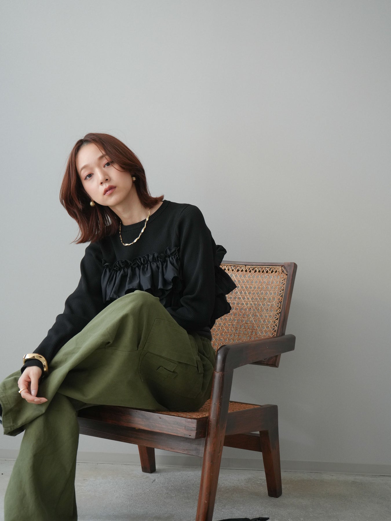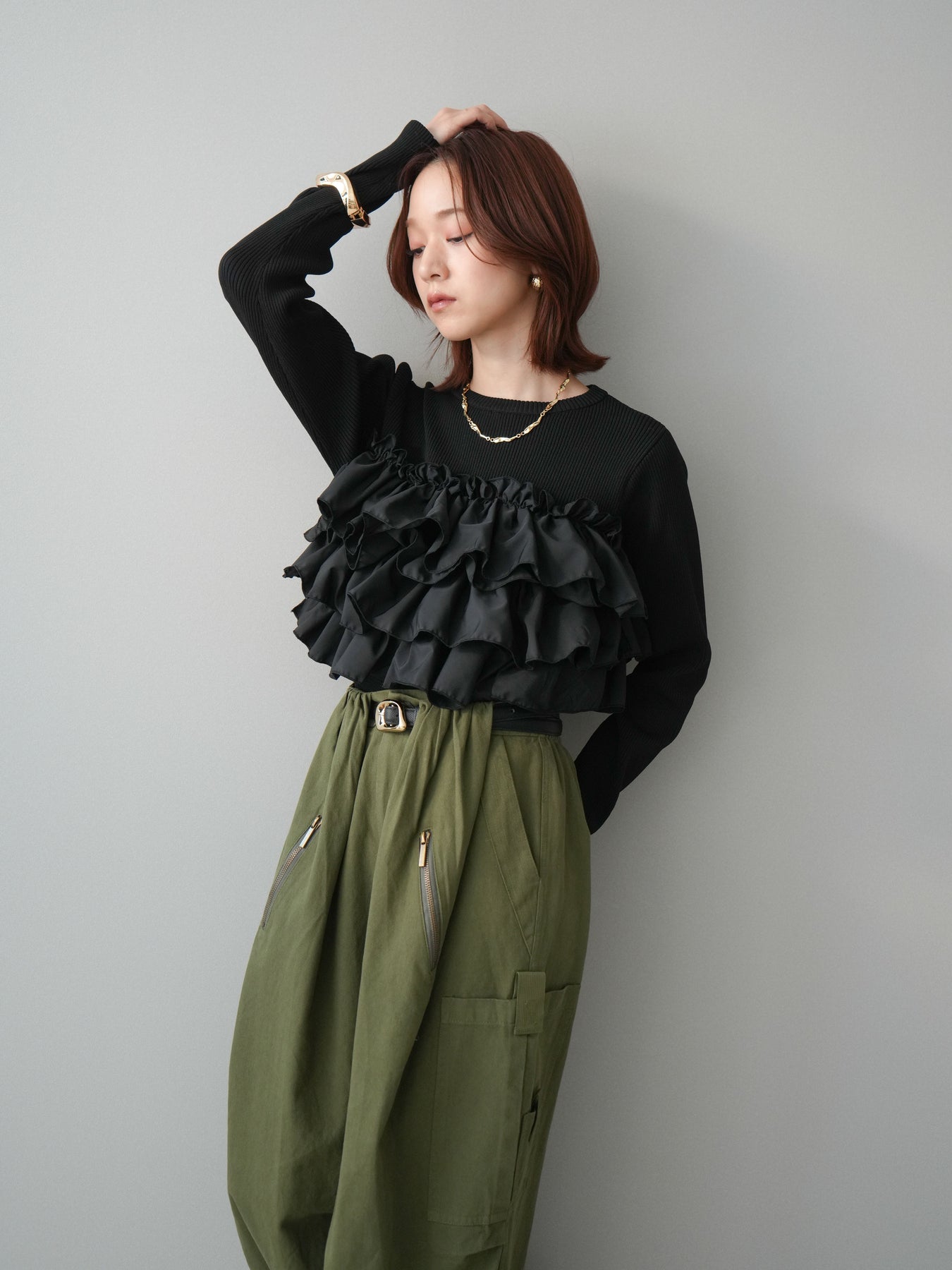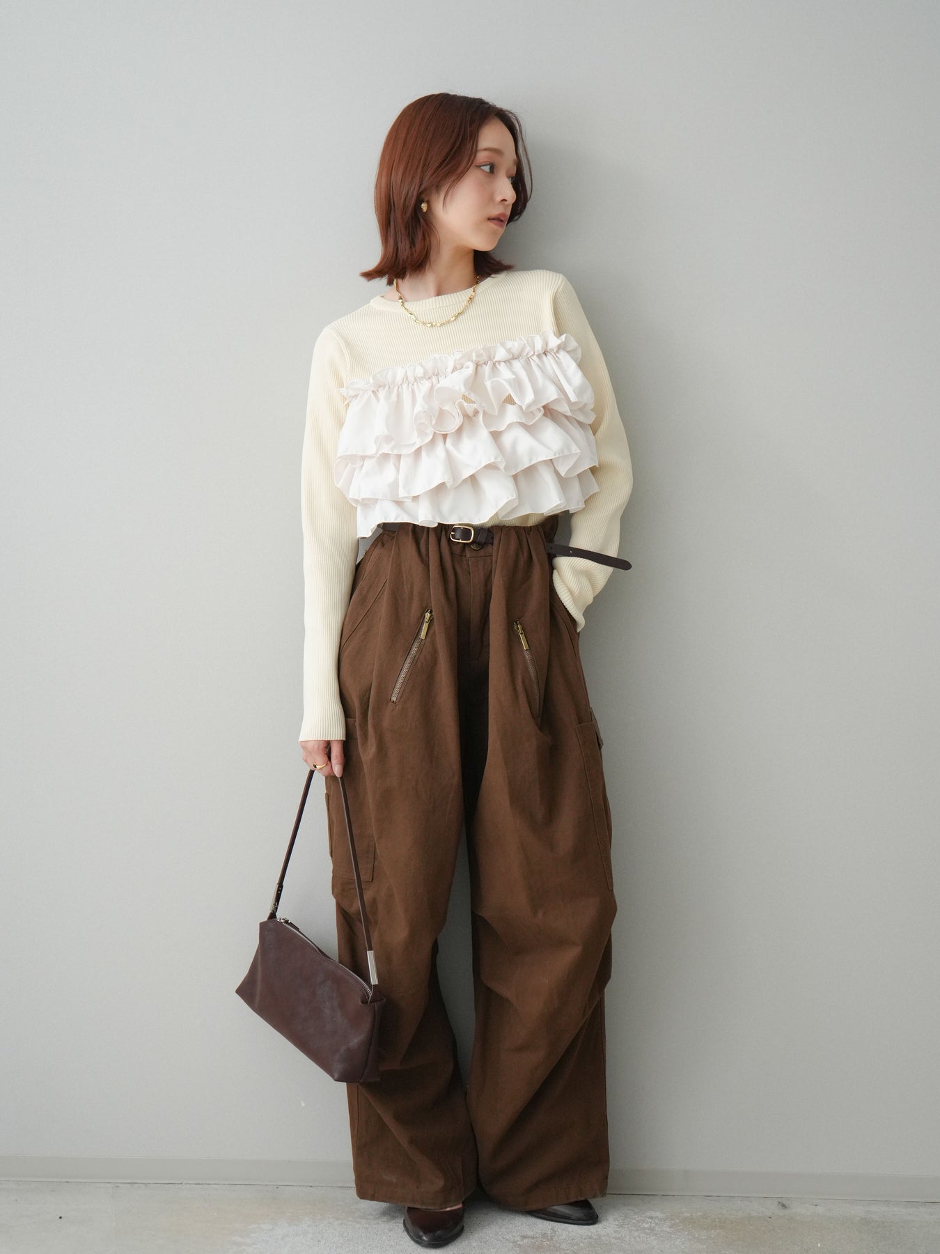 スポンジのように軽やかで弾力のあるニット素材に、フリルビスチェを重ねたようなドッキングデザインのプルオーバー。 一枚でレイヤードスタイルが完成し、立体感のあるフリルがコーディネートに華やかさを添えます。 ニット部分は程よくフィット感がありつつも柔らかな着心地で、デイリーに取り入れやすい仕上がり。 シンプルなボトムと合わせるだけで、女性らしさと存在感を兼ね備えたスタイリングが完成します。 きれいめにもカジュアルにも着回せる、主役級のトップスです。 ※ボトムス、キャミソール(インナー)以外の商品は一律でインナーは付属していません。