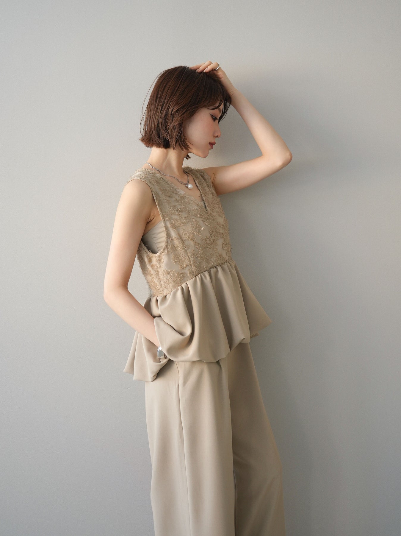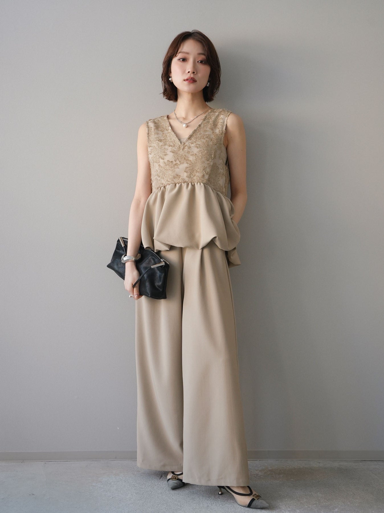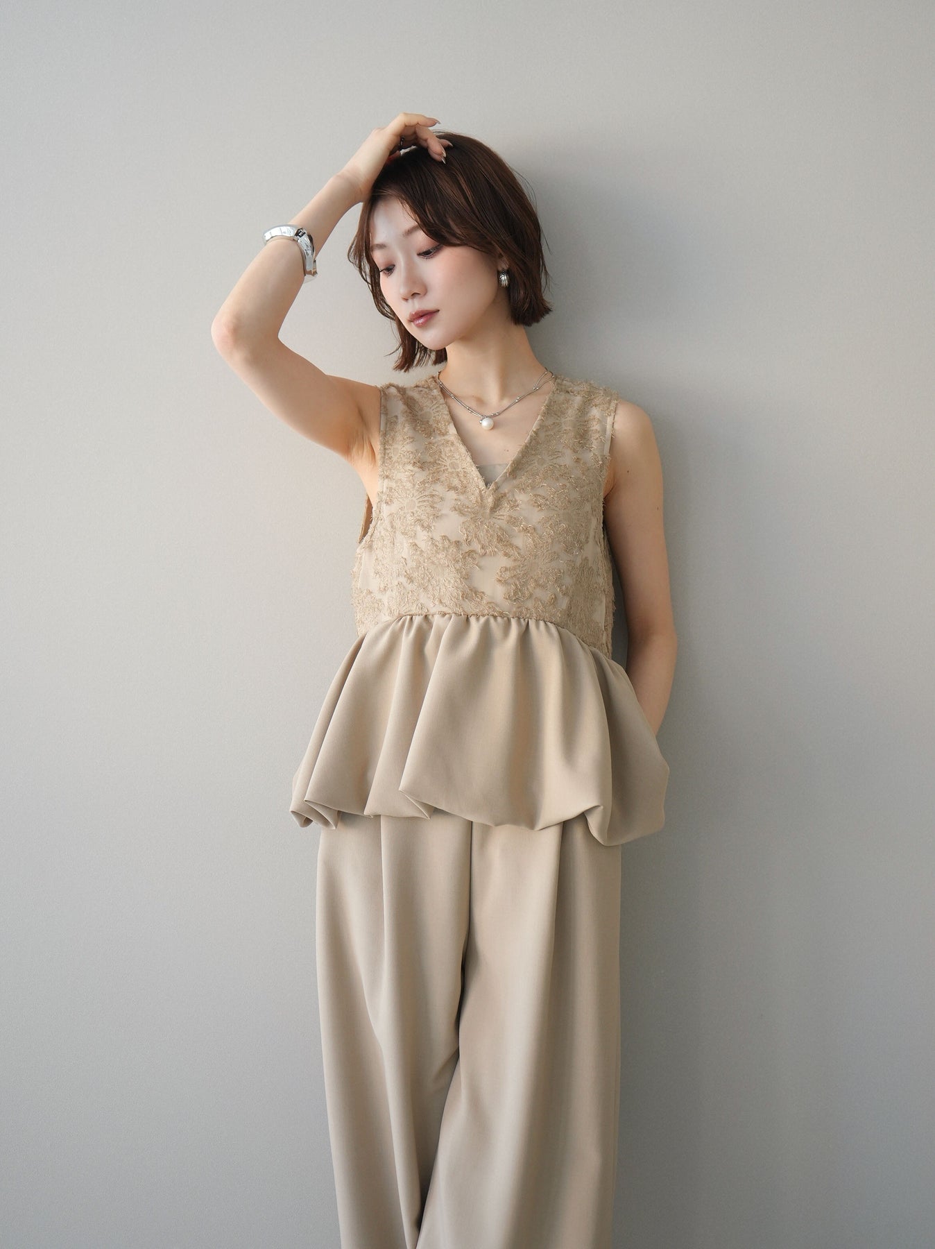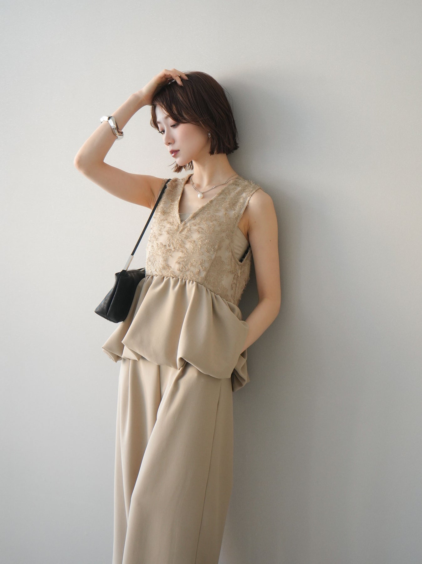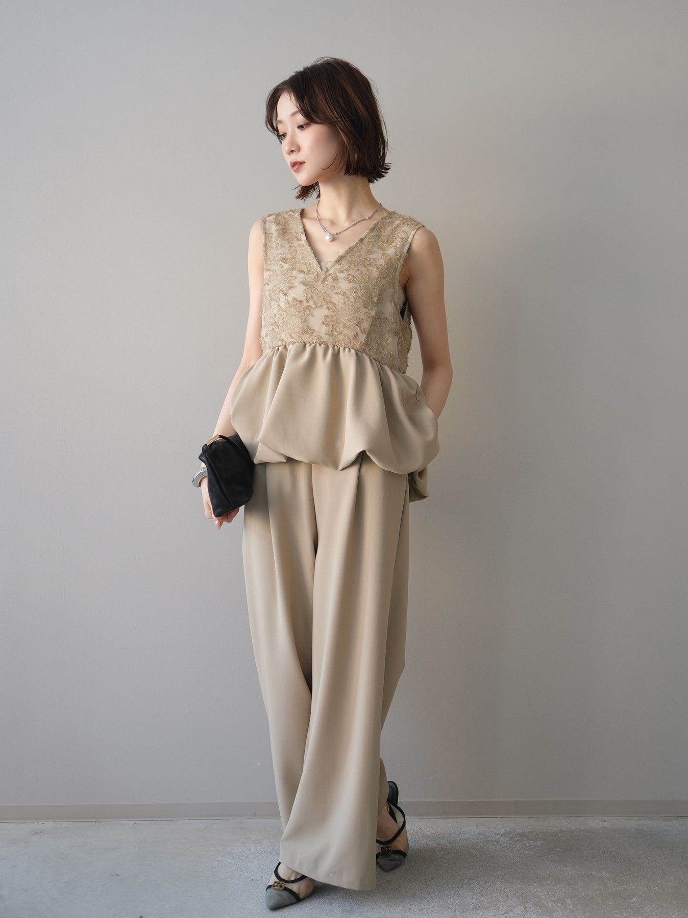 立体感のあるジャガードレースと、なめらかな素材をドッキングしたサロペット。上身頃は繊細なレースが華やかさを演出し、ウエスト切替のぺプラムデザインが自然なメリハリをプラスします。落ち感のあるワイドシルエットで縦ラインを強調し、きれいめながらもリラックス感のある着こなしに。一枚でコーデが完成し、オケージョンからデイリーまで幅広く活躍するアイテムです。 ※ボトムス、キャミソール(インナー)以外の商品は一律でインナーは付属していません
