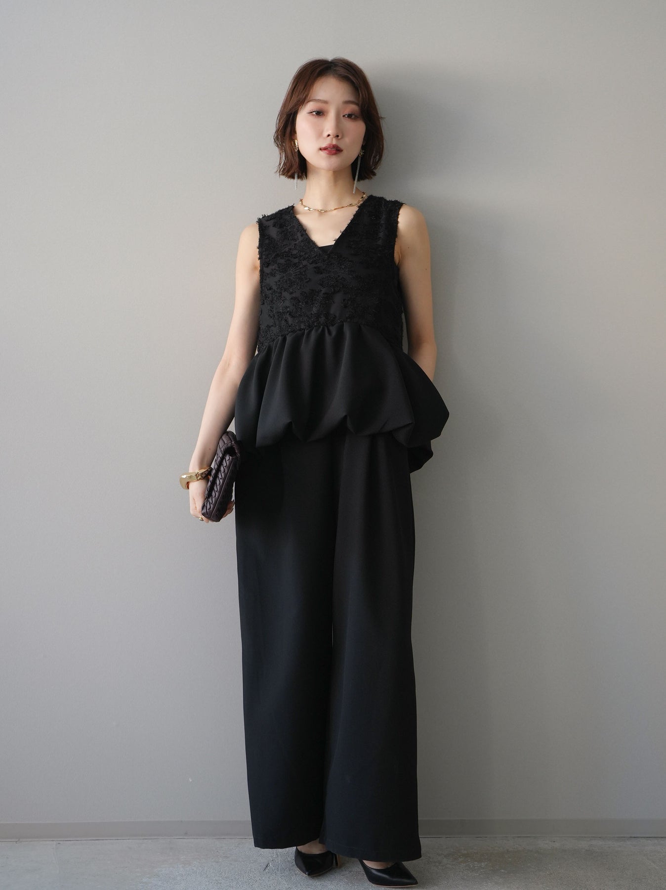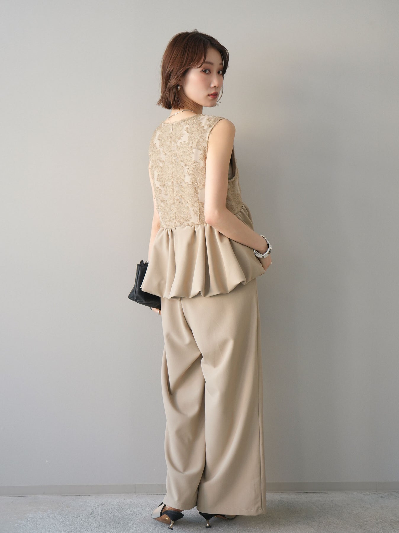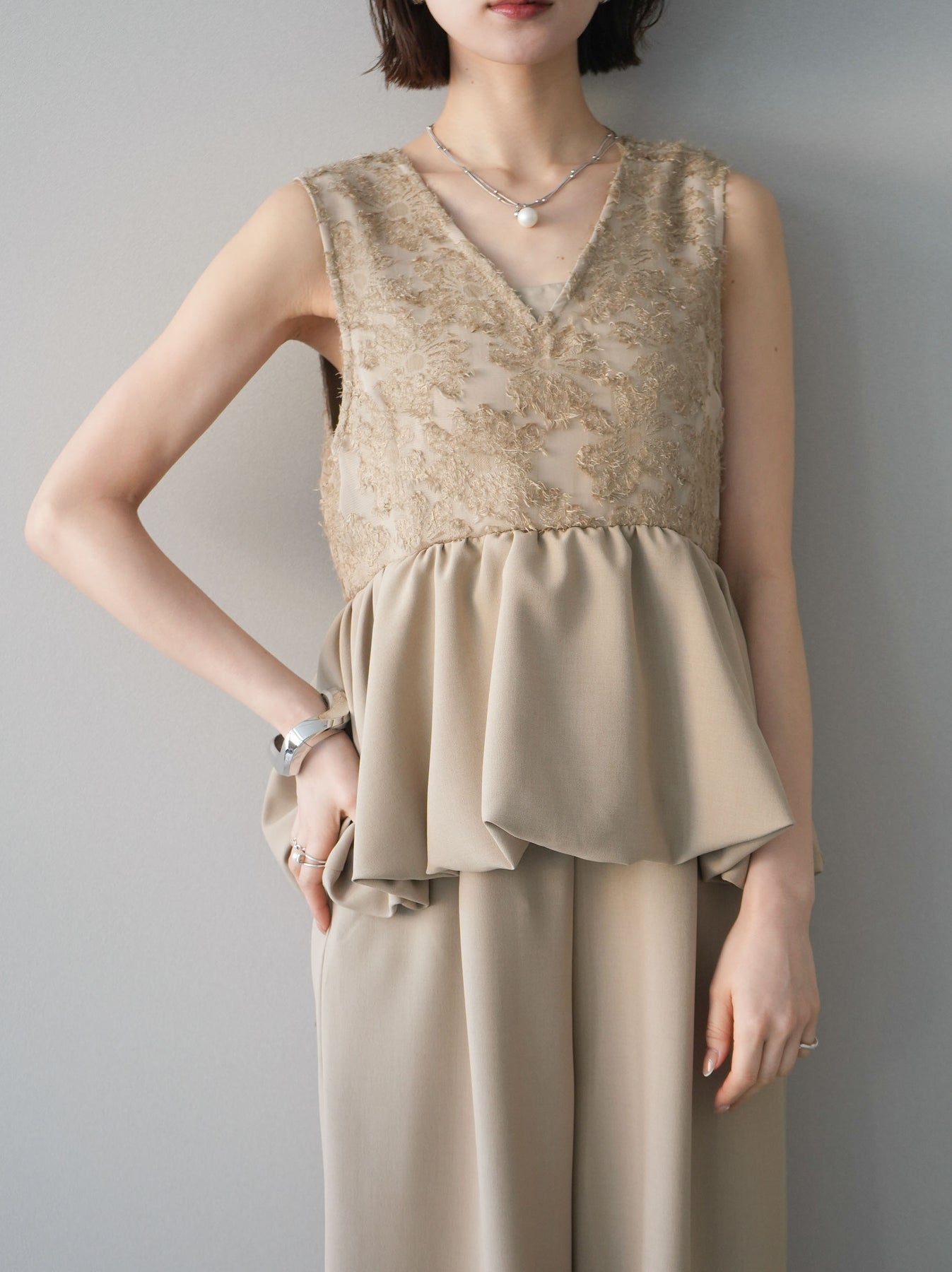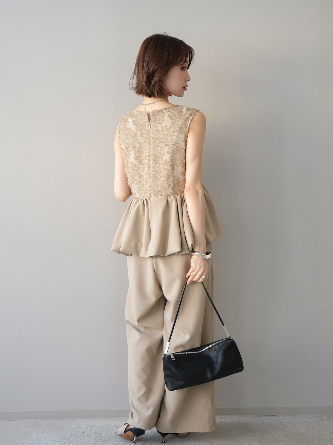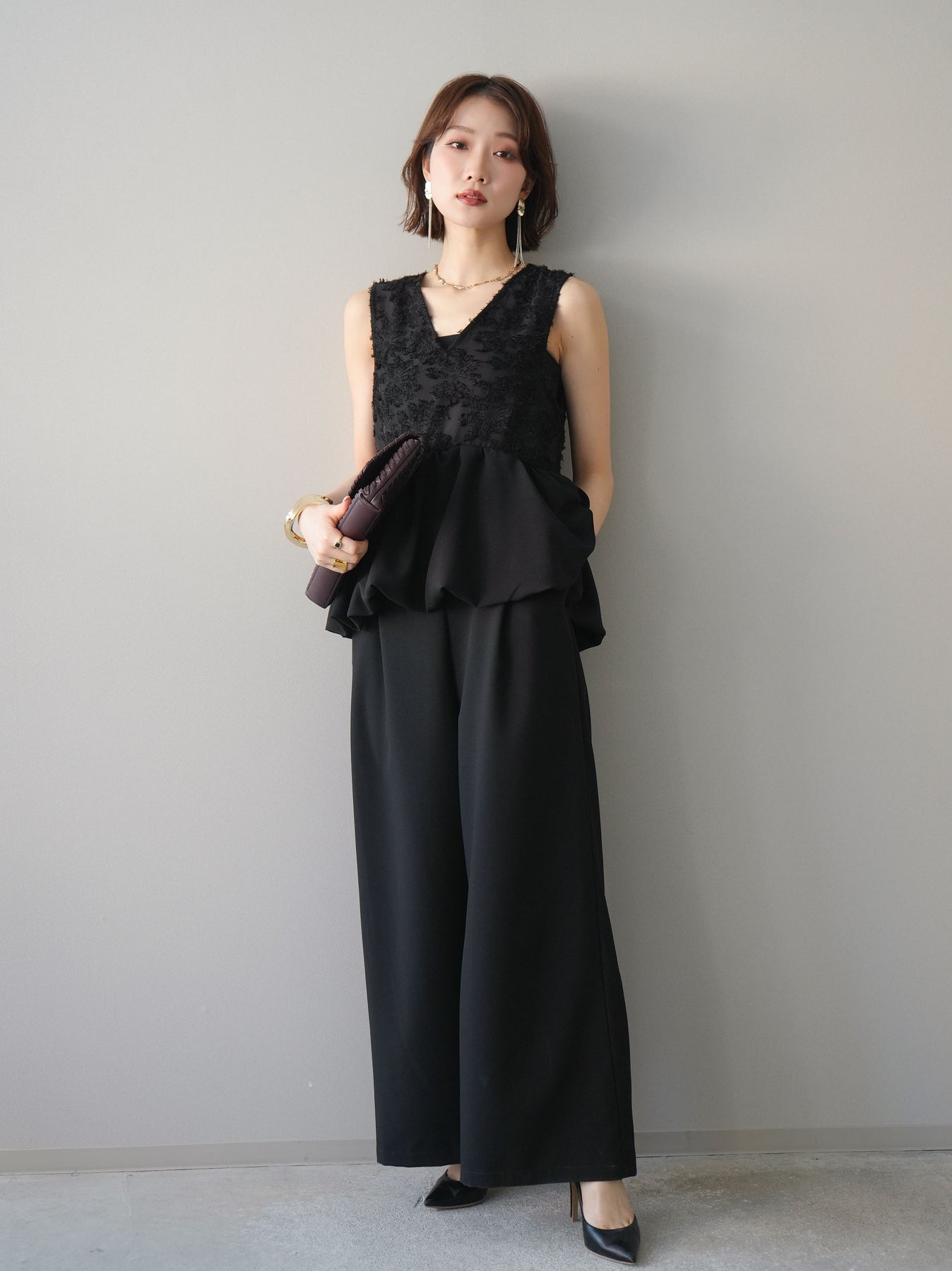 立体感のあるジャガードレースと、なめらかな素材をドッキングしたサロペット。上身頃は繊細なレースが華やかさを演出し、ウエスト切替のぺプラムデザインが自然なメリハリをプラスします。落ち感のあるワイドシルエットで縦ラインを強調し、きれいめながらもリラックス感のある着こなしに。一枚でコーデが完成し、オケージョンからデイリーまで幅広く活躍するアイテムです。 ※ボトムス、キャミソール(インナー)以外の商品は一律でインナーは付属していません