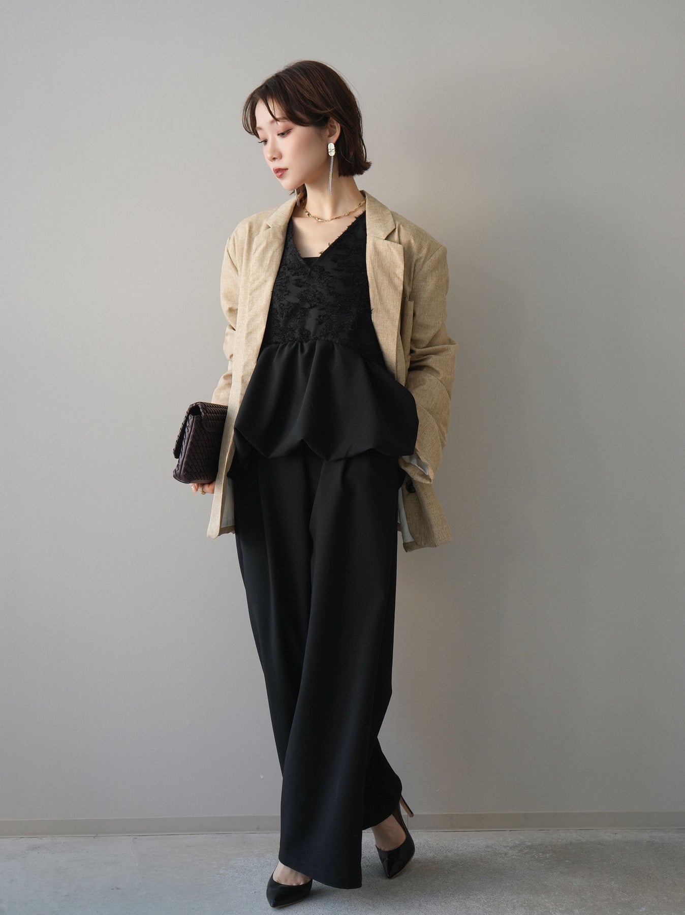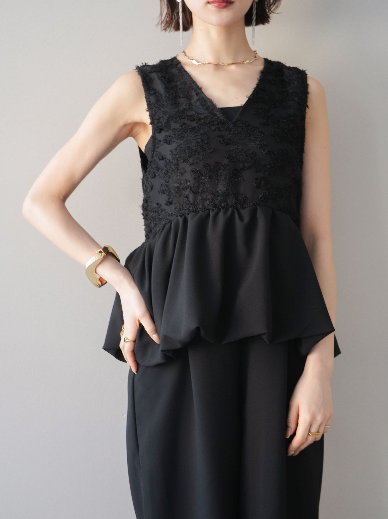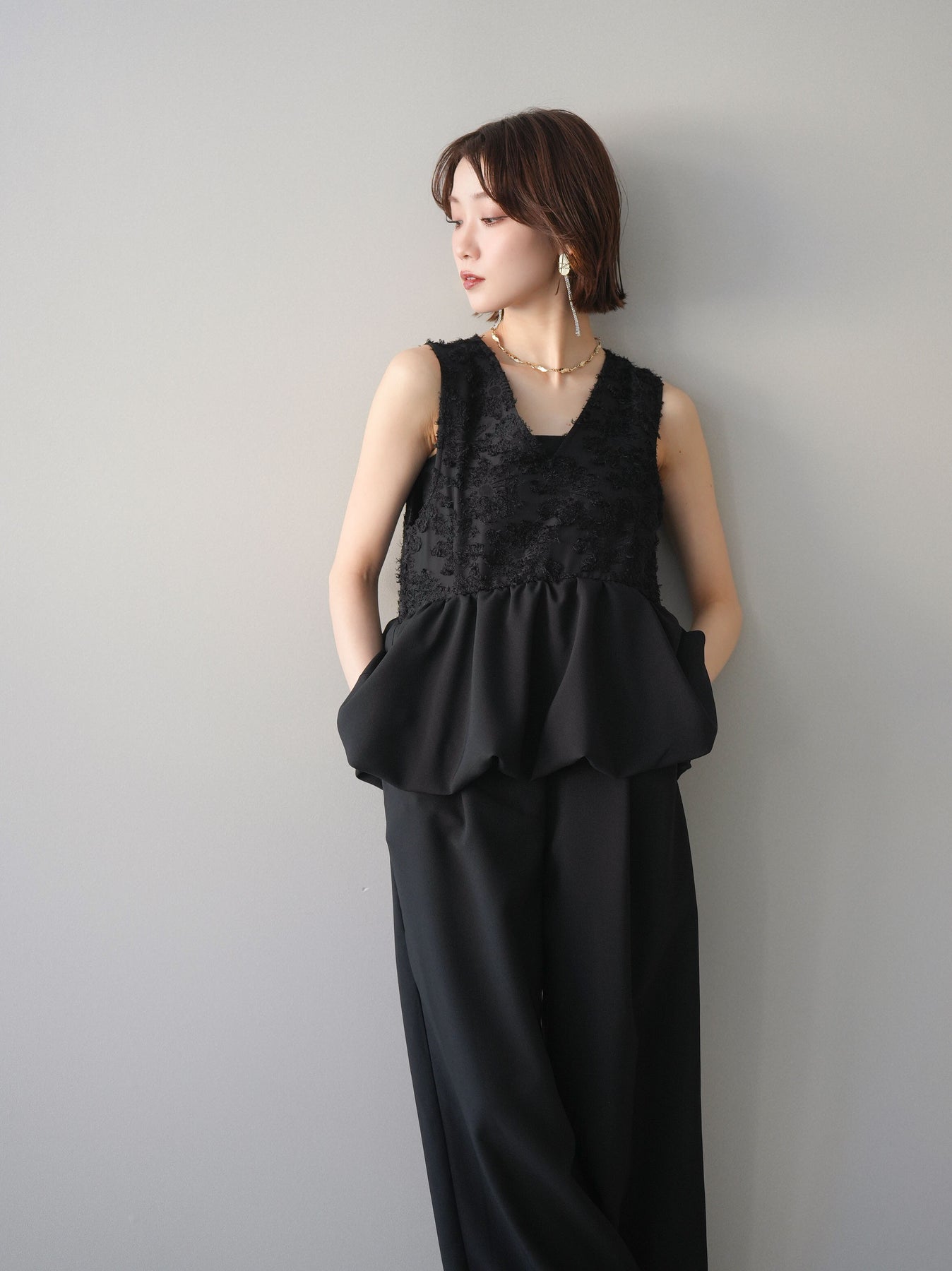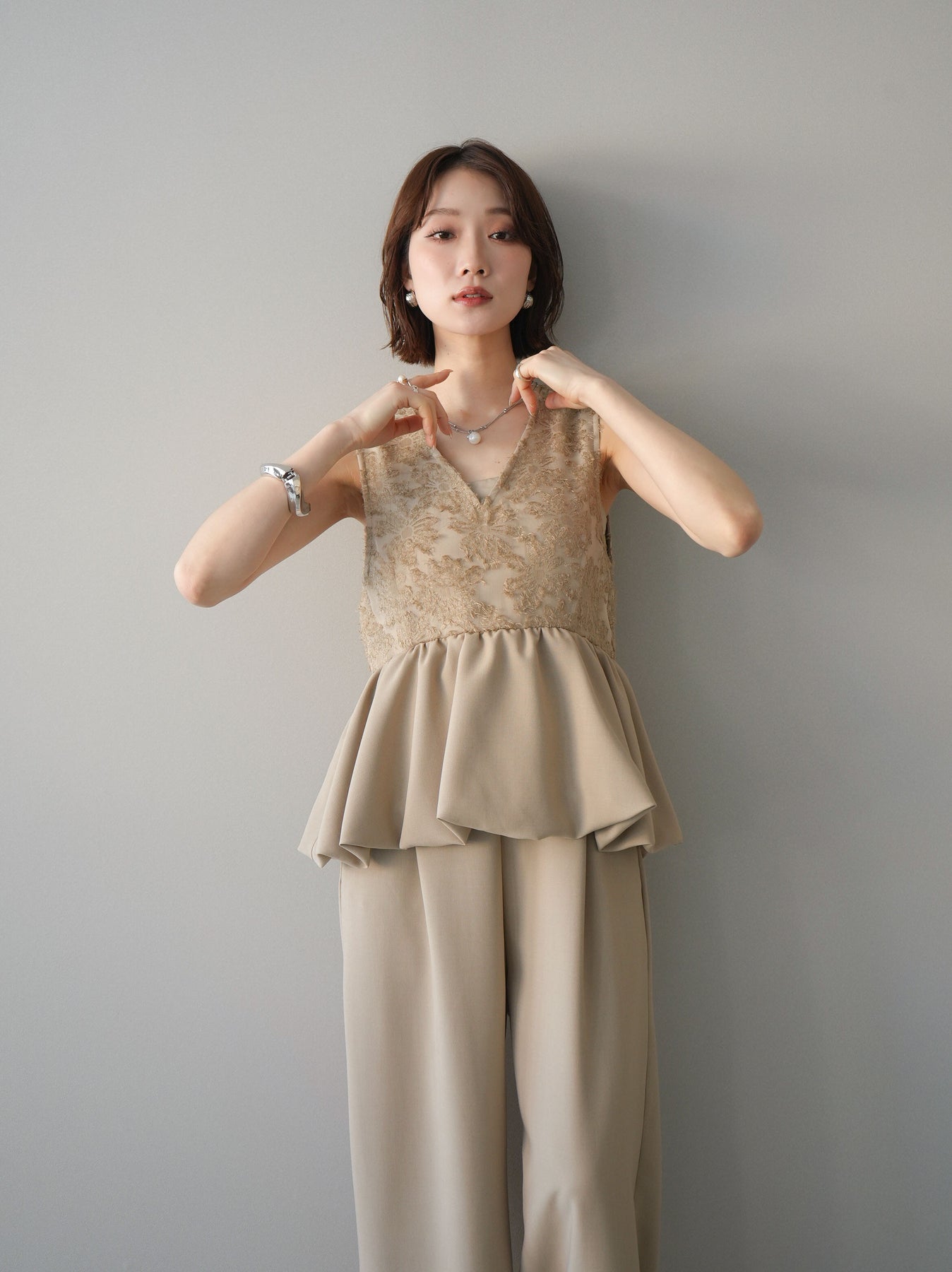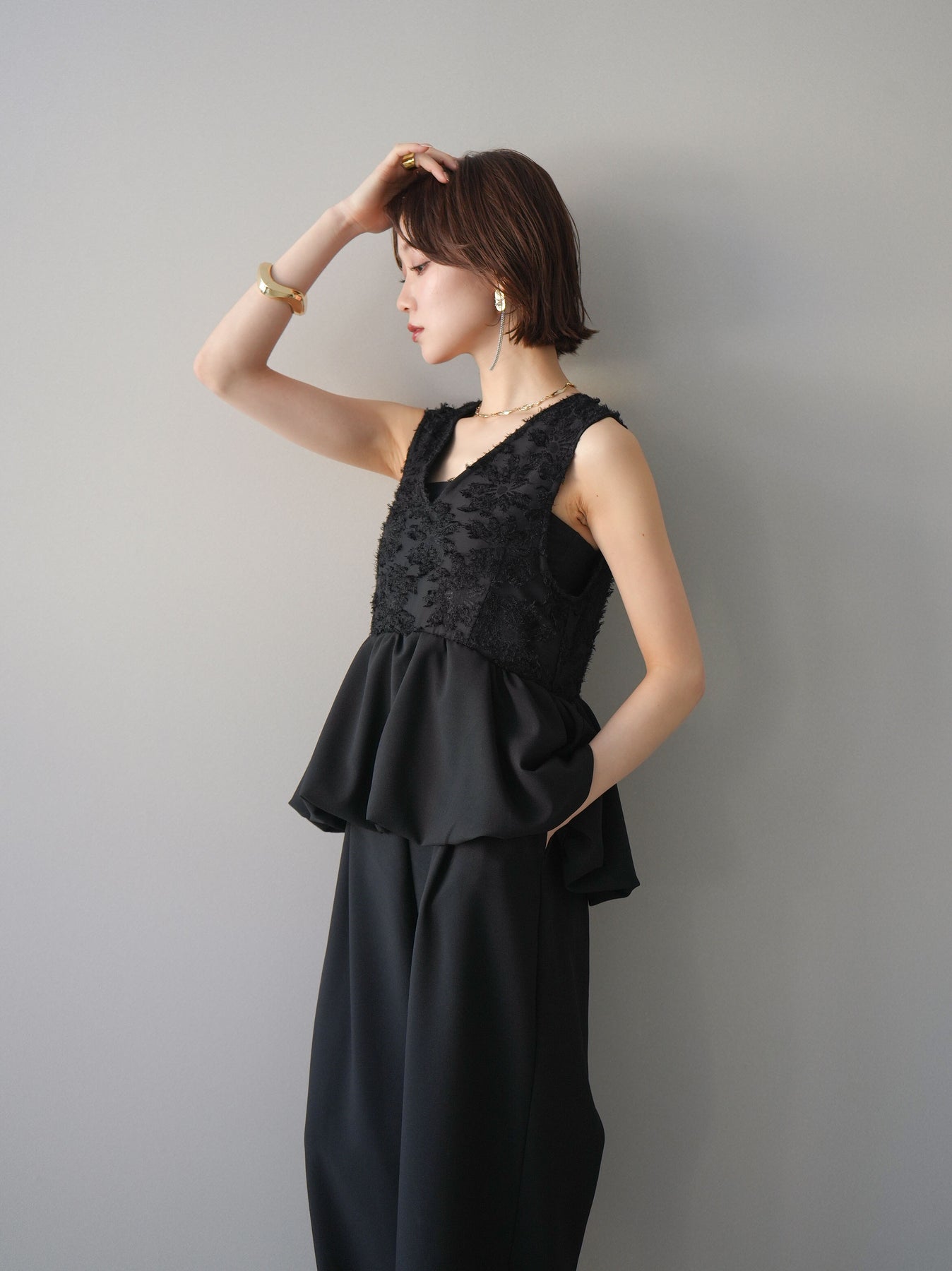 立体感のあるジャガードレースと、なめらかな素材をドッキングしたサロペット。上身頃は繊細なレースが華やかさを演出し、ウエスト切替のぺプラムデザインが自然なメリハリをプラスします。落ち感のあるワイドシルエットで縦ラインを強調し、きれいめながらもリラックス感のある着こなしに。一枚でコーデが完成し、オケージョンからデイリーまで幅広く活躍するアイテムです。 ※ボトムス、キャミソール(インナー)以外の商品は一律でインナーは付属していません