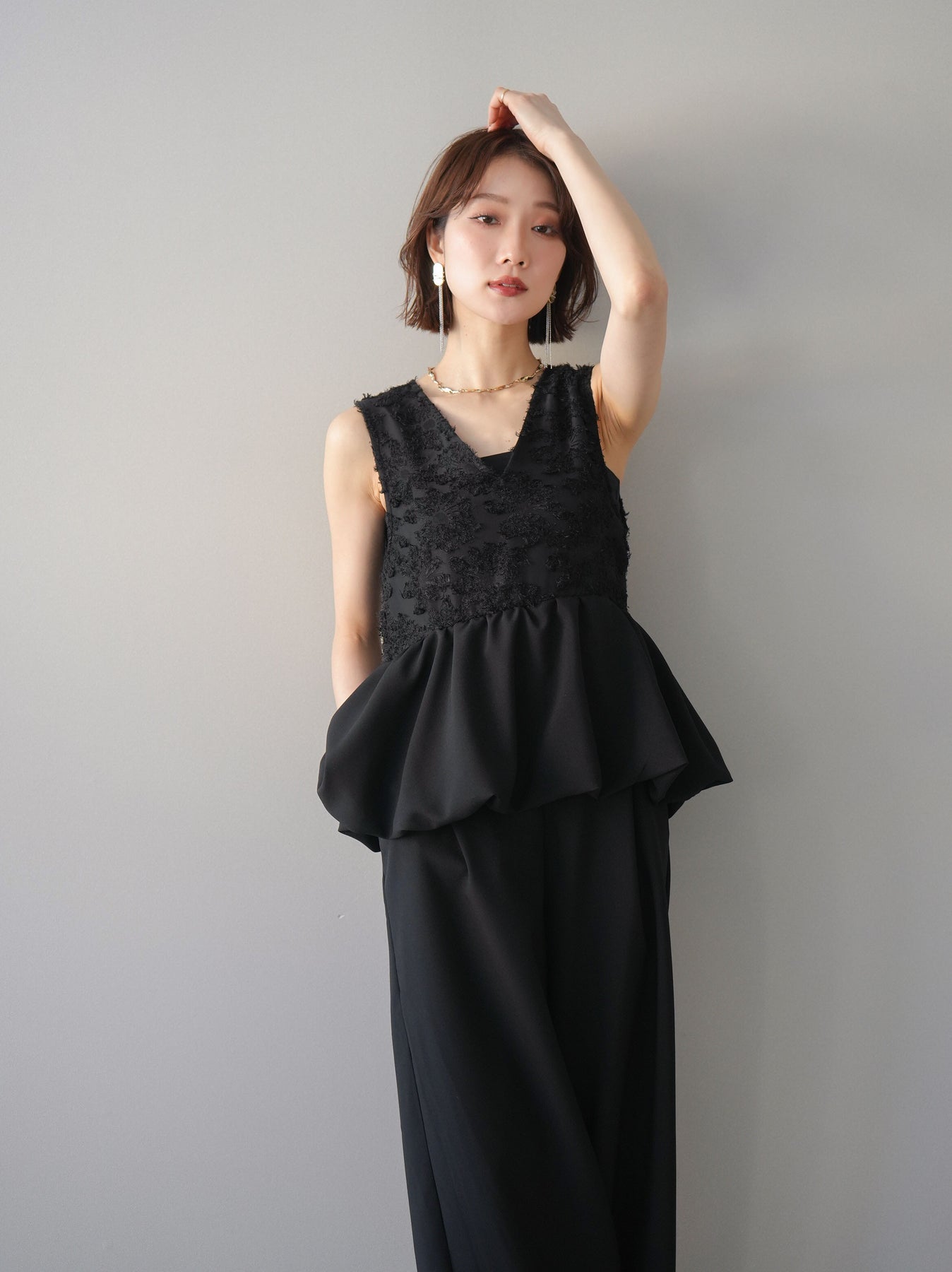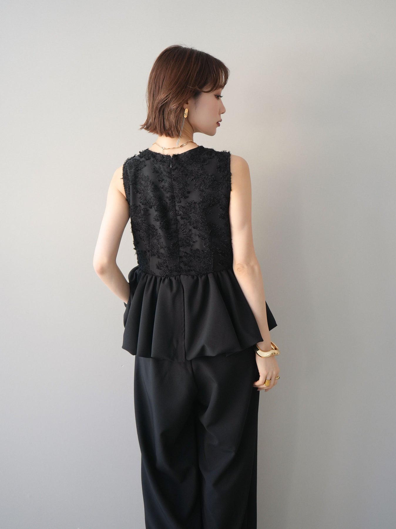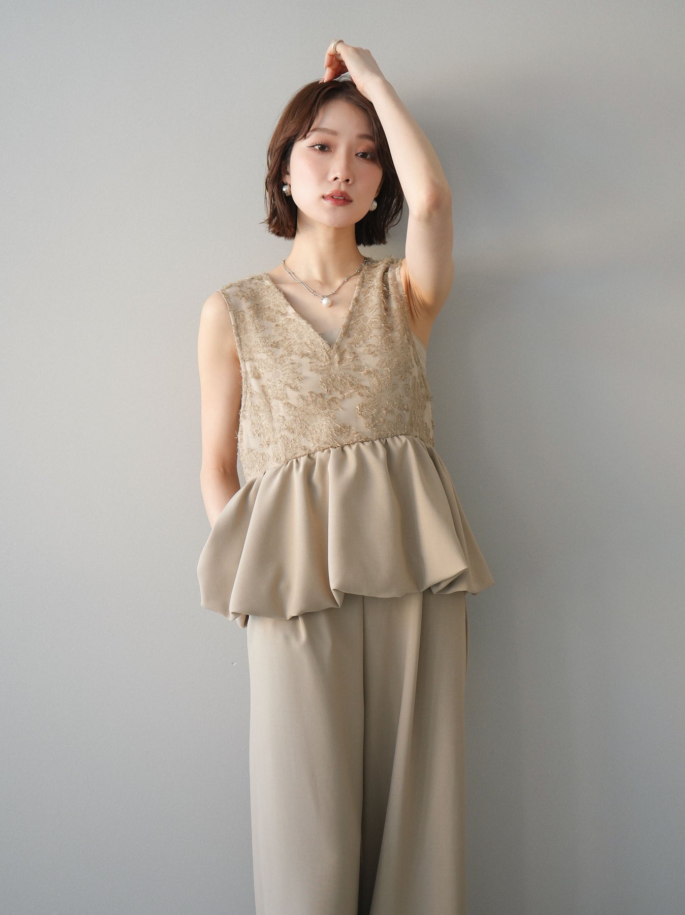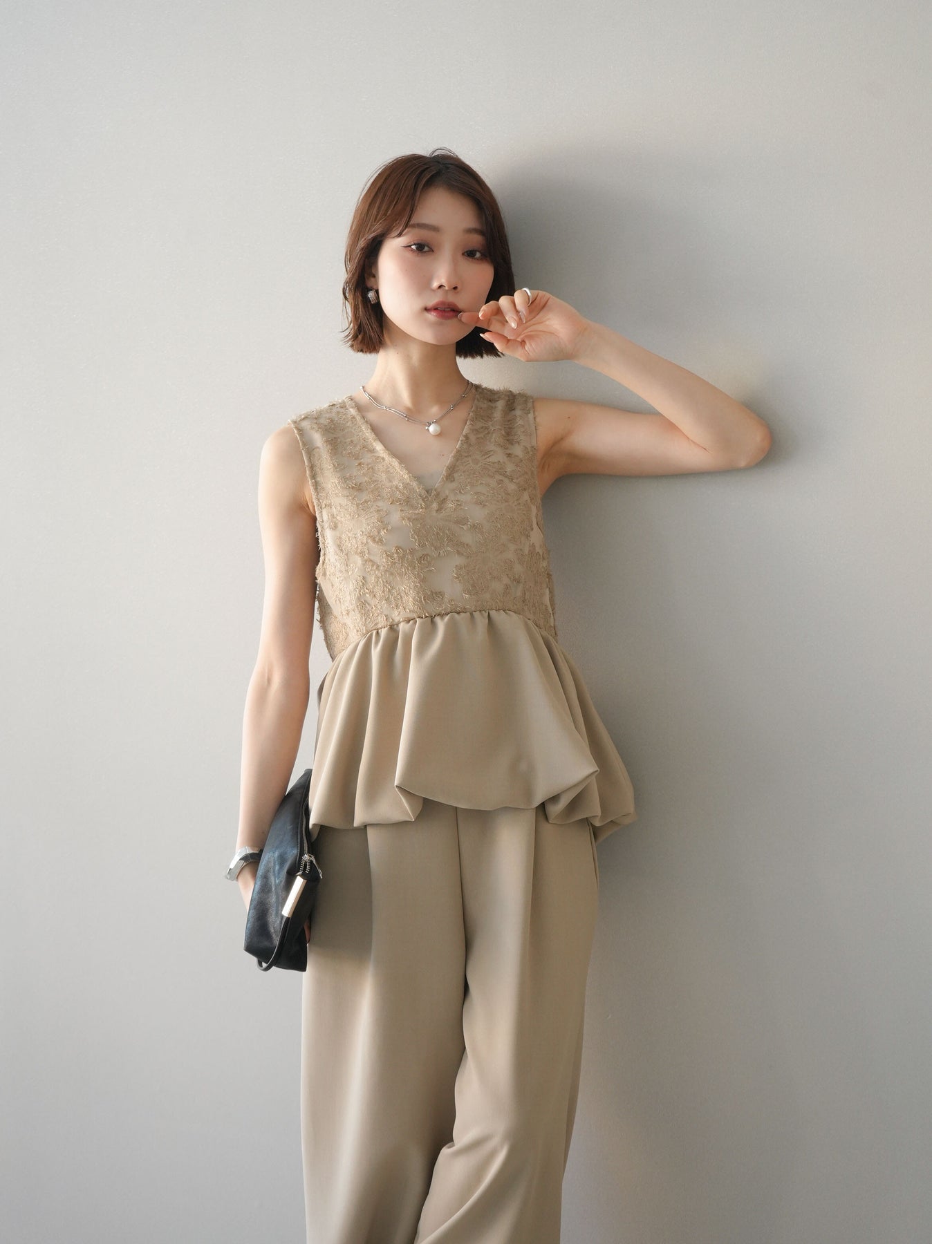 立体感のあるジャガードレースと、なめらかな素材をドッキングしたサロペット。上身頃は繊細なレースが華やかさを演出し、ウエスト切替のぺプラムデザインが自然なメリハリをプラスします。落ち感のあるワイドシルエットで縦ラインを強調し、きれいめながらもリラックス感のある着こなしに。一枚でコーデが完成し、オケージョンからデイリーまで幅広く活躍するアイテムです。 ※ボトムス、キャミソール(インナー)以外の商品は一律でインナーは付属していません