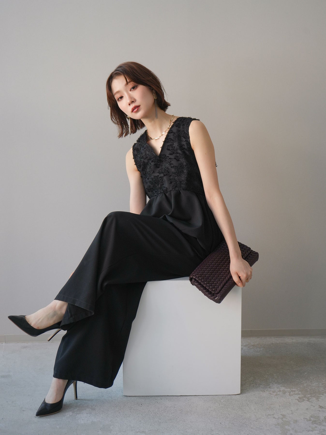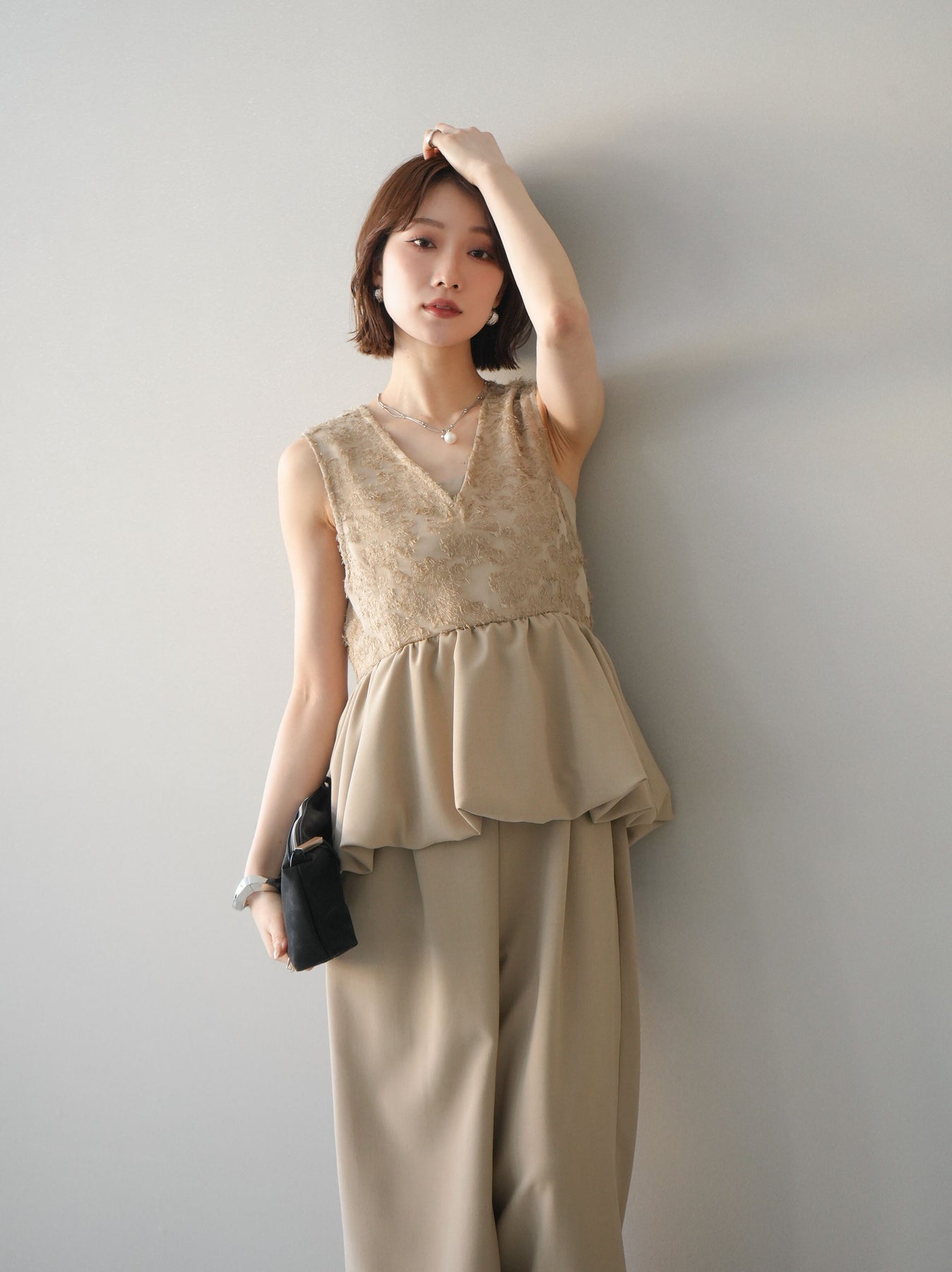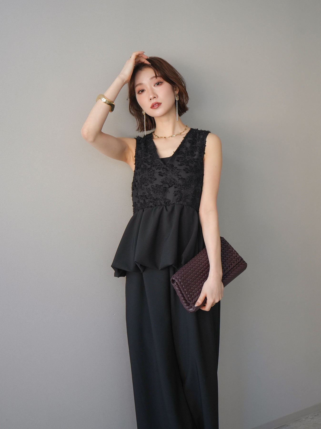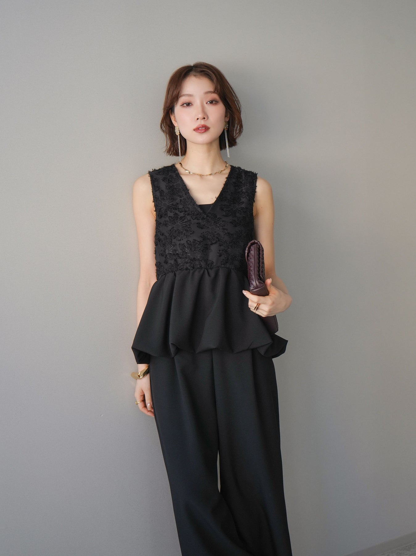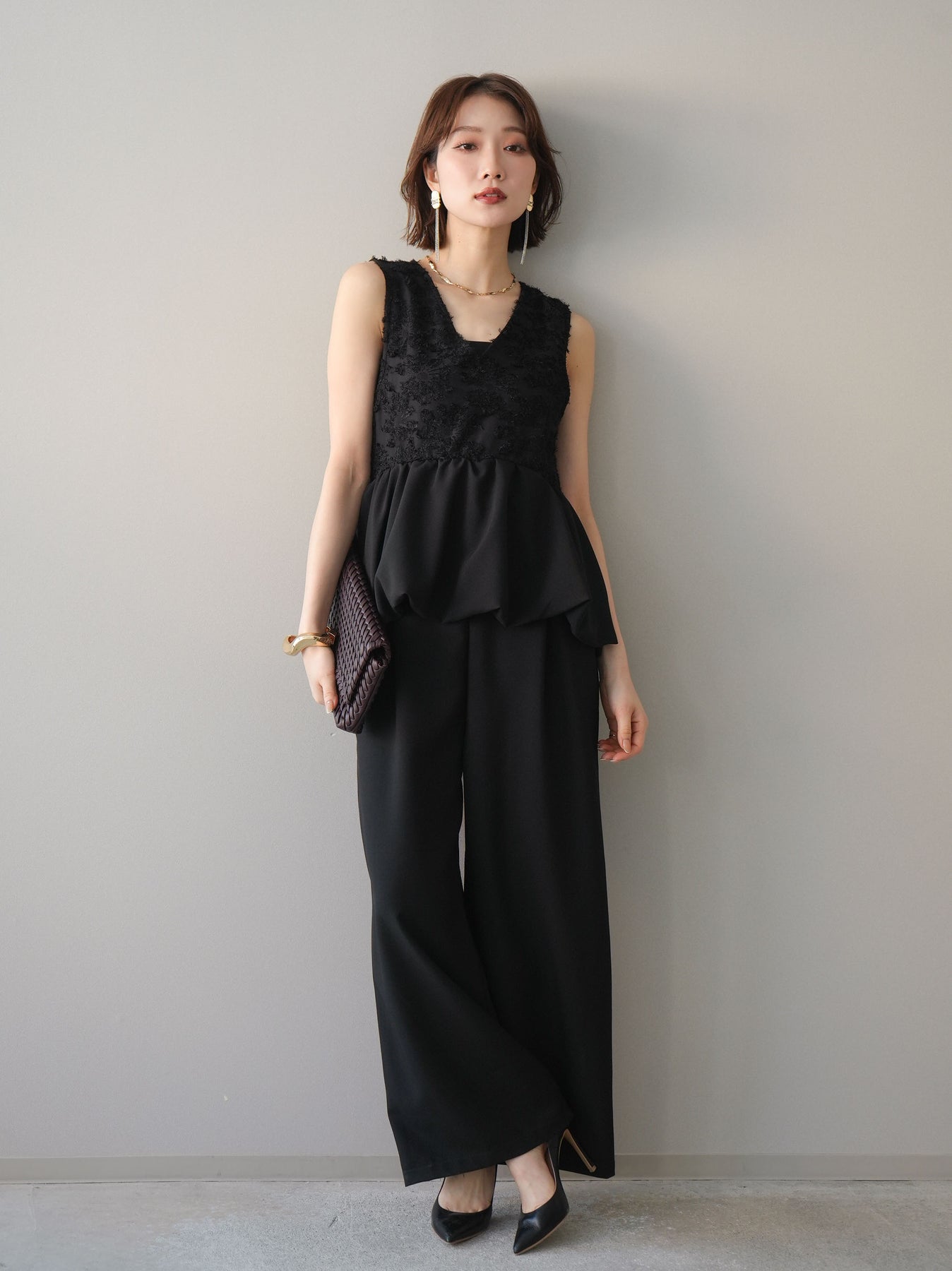 立体感のあるジャガードレースと、なめらかな素材をドッキングしたサロペット。上身頃は繊細なレースが華やかさを演出し、ウエスト切替のぺプラムデザインが自然なメリハリをプラスします。落ち感のあるワイドシルエットで縦ラインを強調し、きれいめながらもリラックス感のある着こなしに。一枚でコーデが完成し、オケージョンからデイリーまで幅広く活躍するアイテムです。 ※ボトムス、キャミソール(インナー)以外の商品は一律でインナーは付属していません