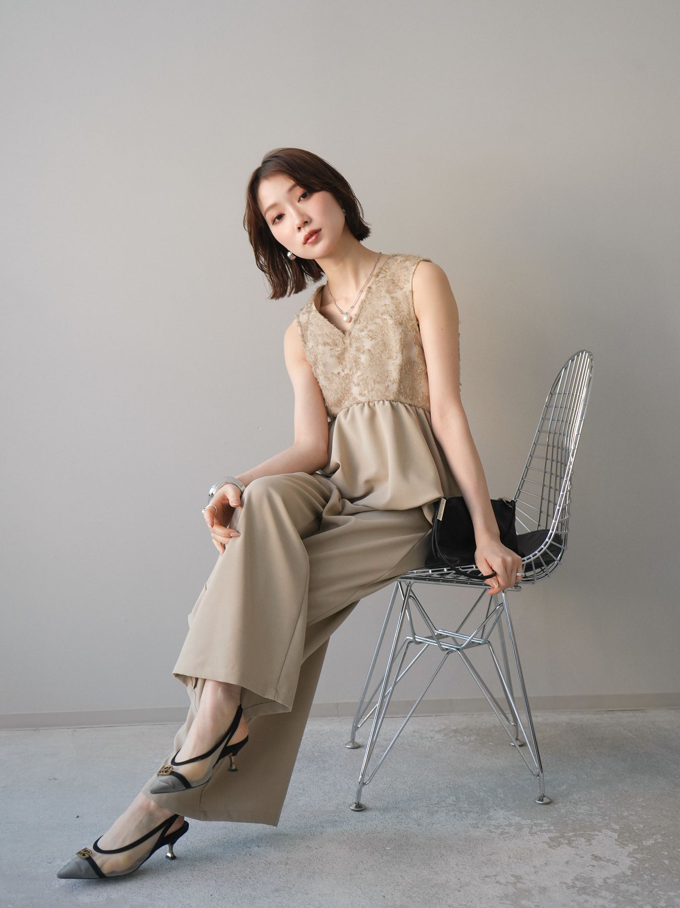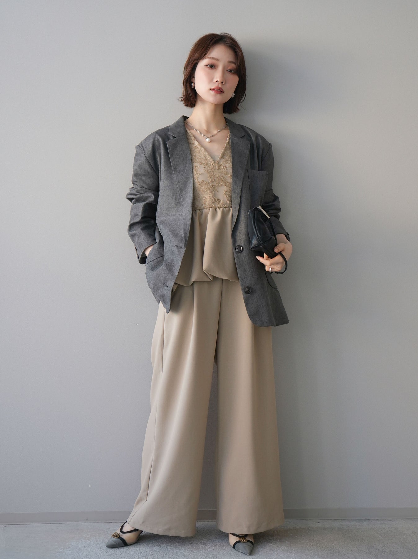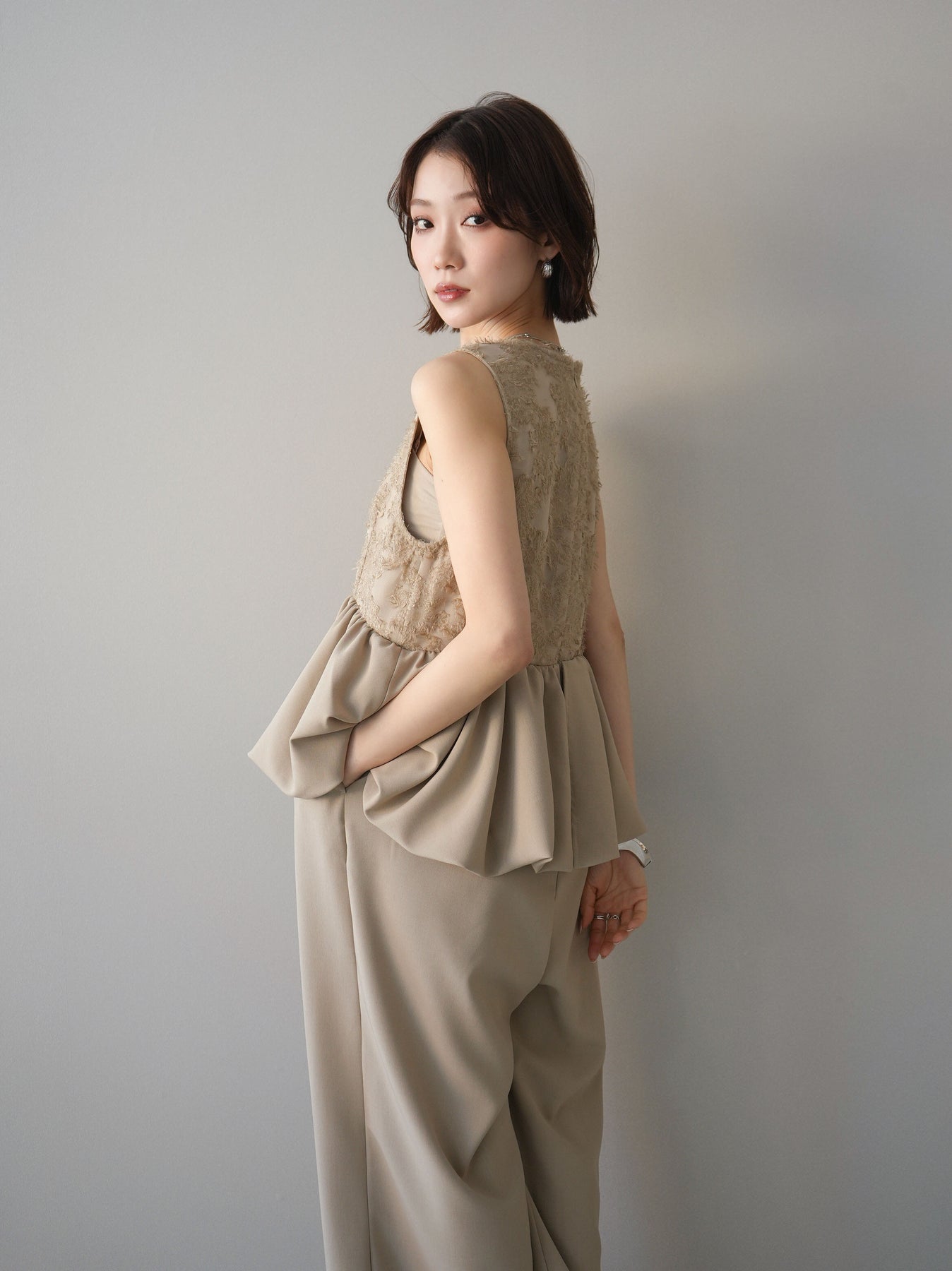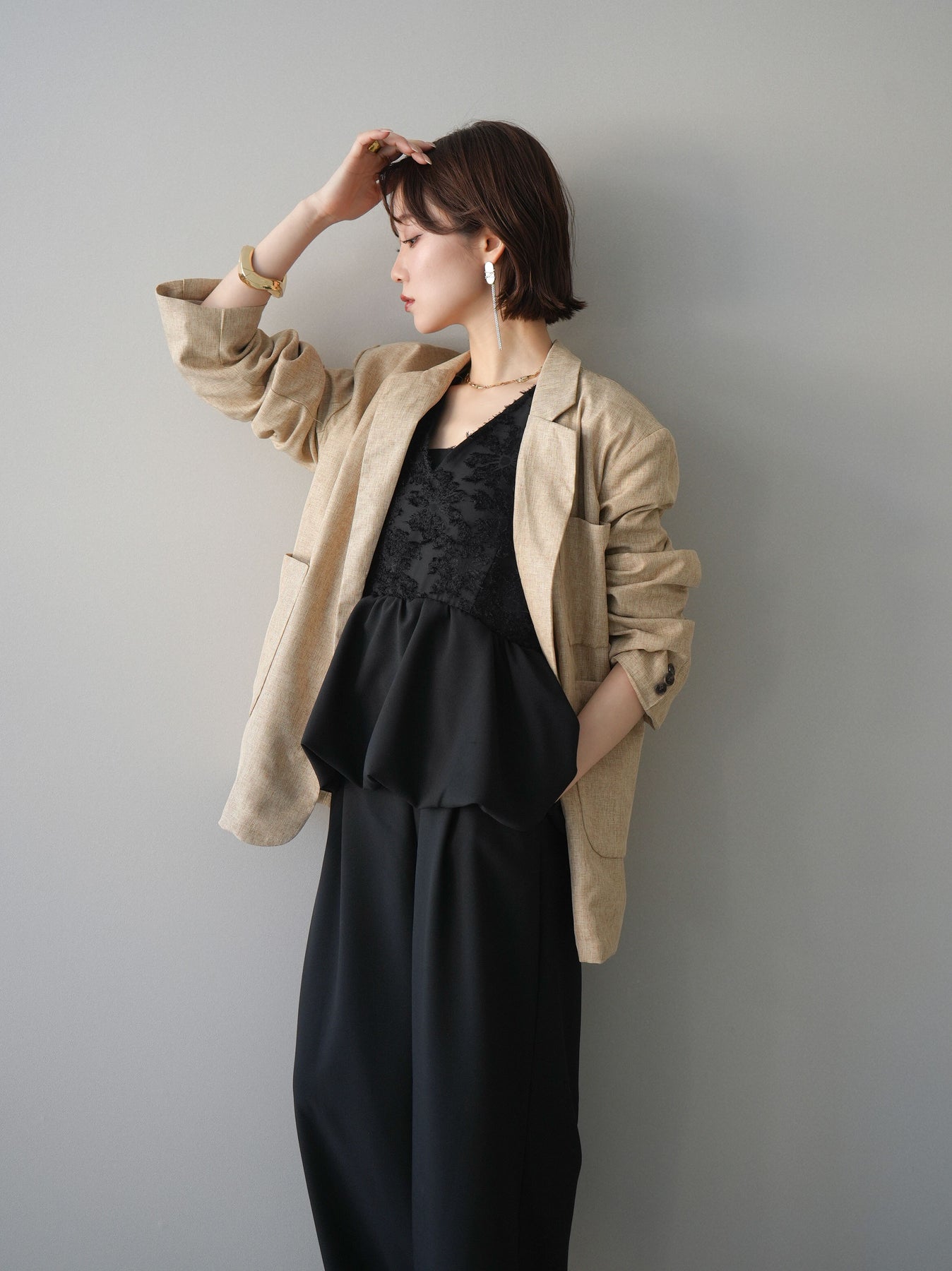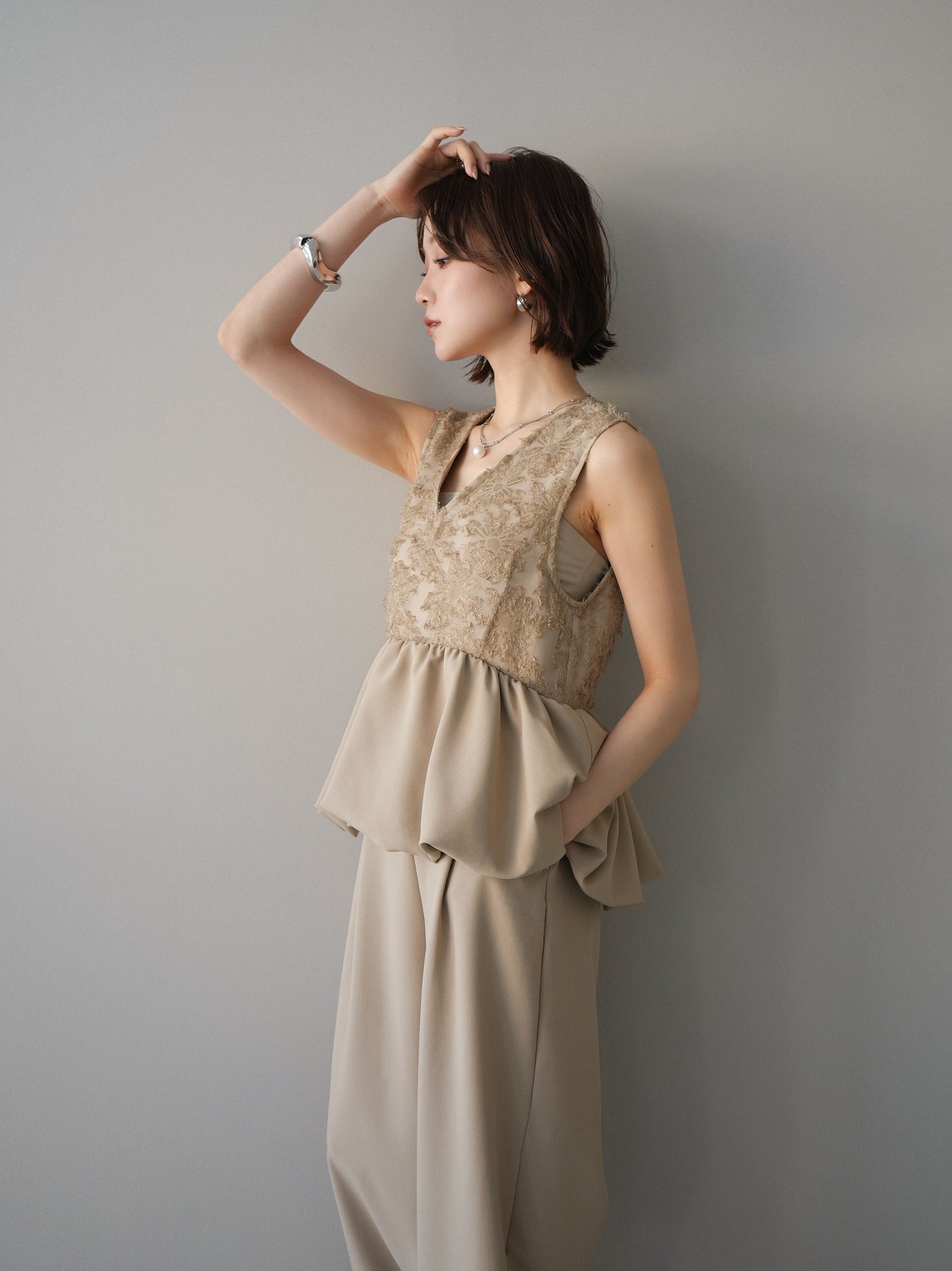 立体感のあるジャガードレースと、なめらかな素材をドッキングしたサロペット。上身頃は繊細なレースが華やかさを演出し、ウエスト切替のぺプラムデザインが自然なメリハリをプラスします。落ち感のあるワイドシルエットで縦ラインを強調し、きれいめながらもリラックス感のある着こなしに。一枚でコーデが完成し、オケージョンからデイリーまで幅広く活躍するアイテムです。 ※ボトムス、キャミソール(インナー)以外の商品は一律でインナーは付属していません