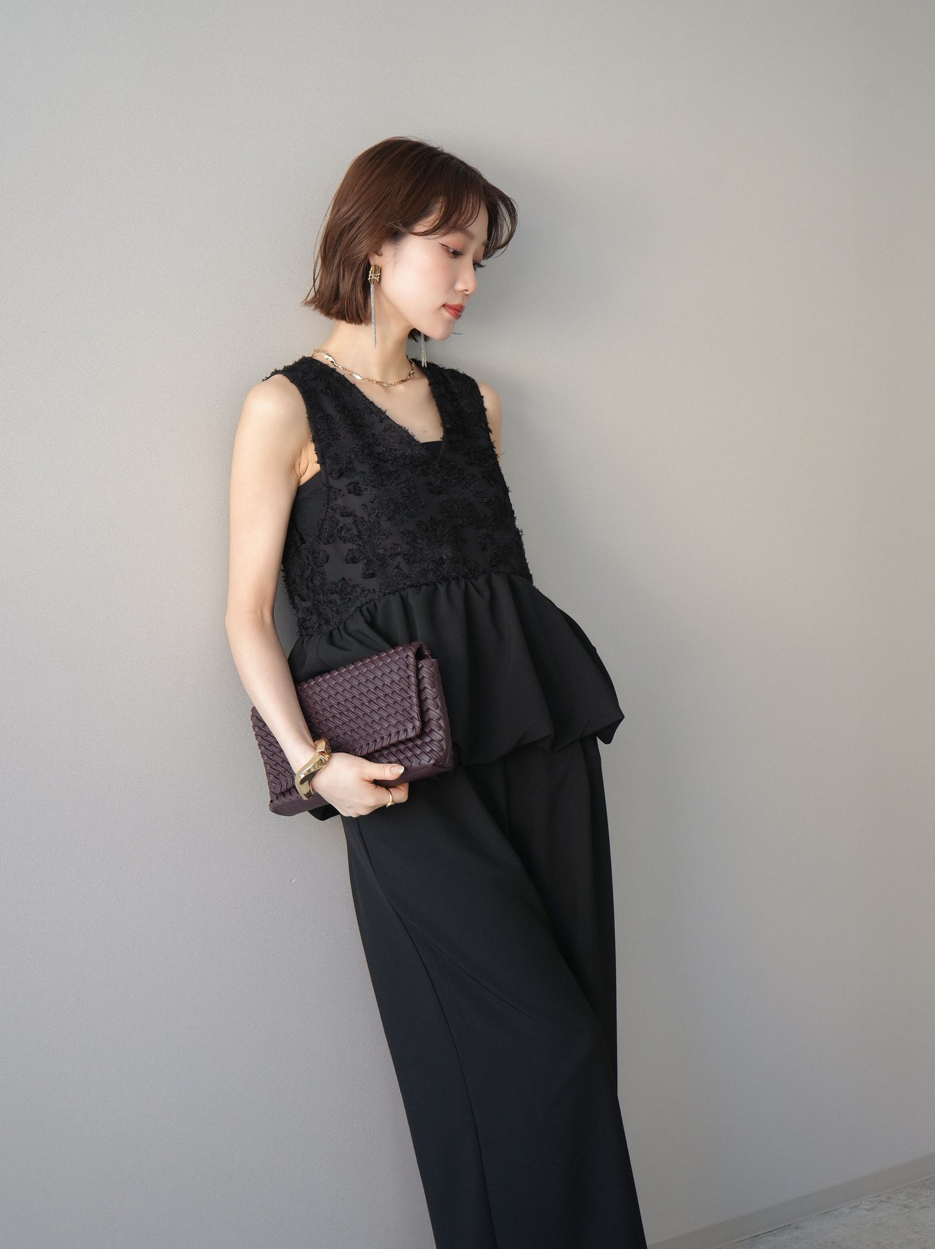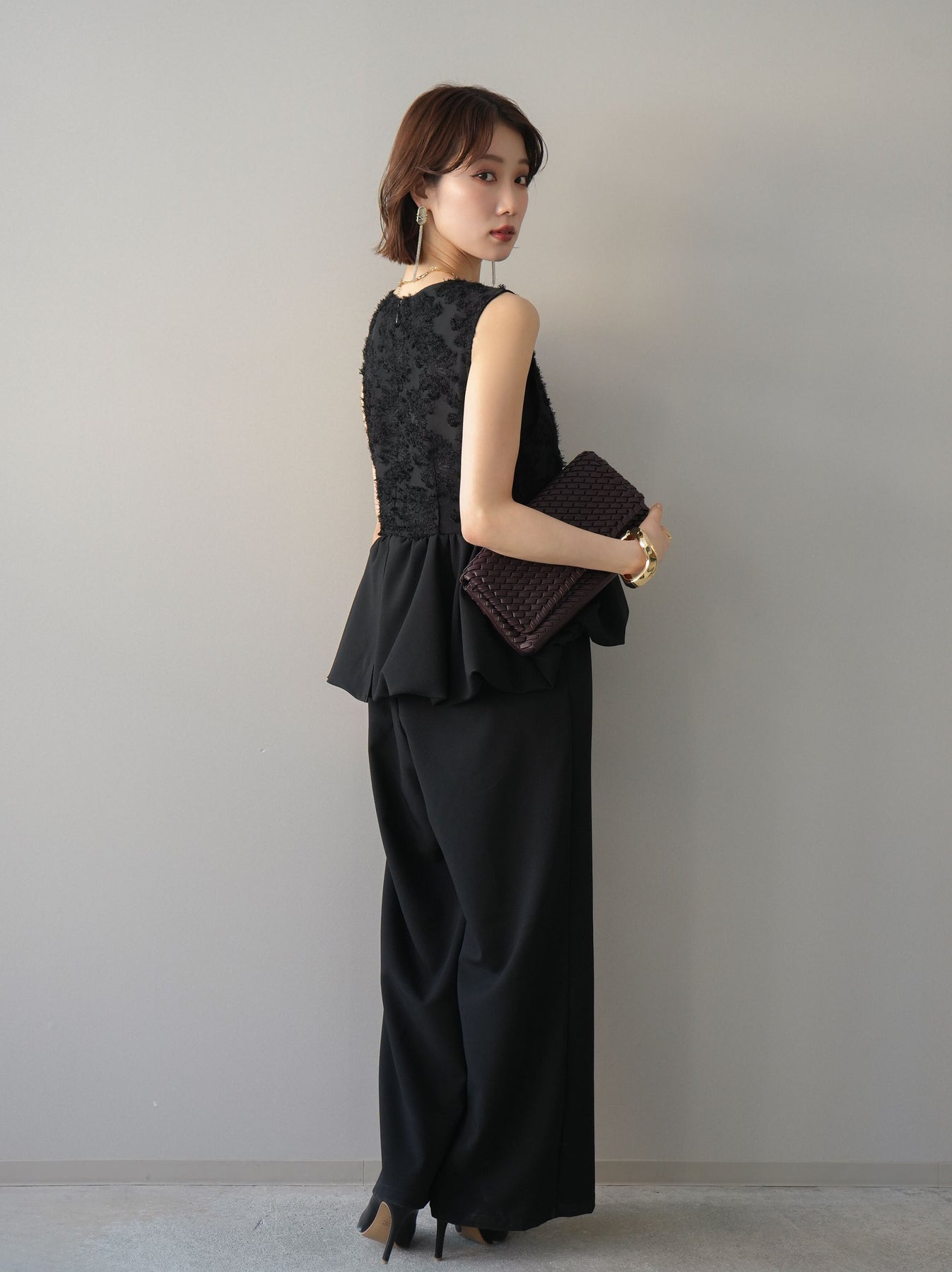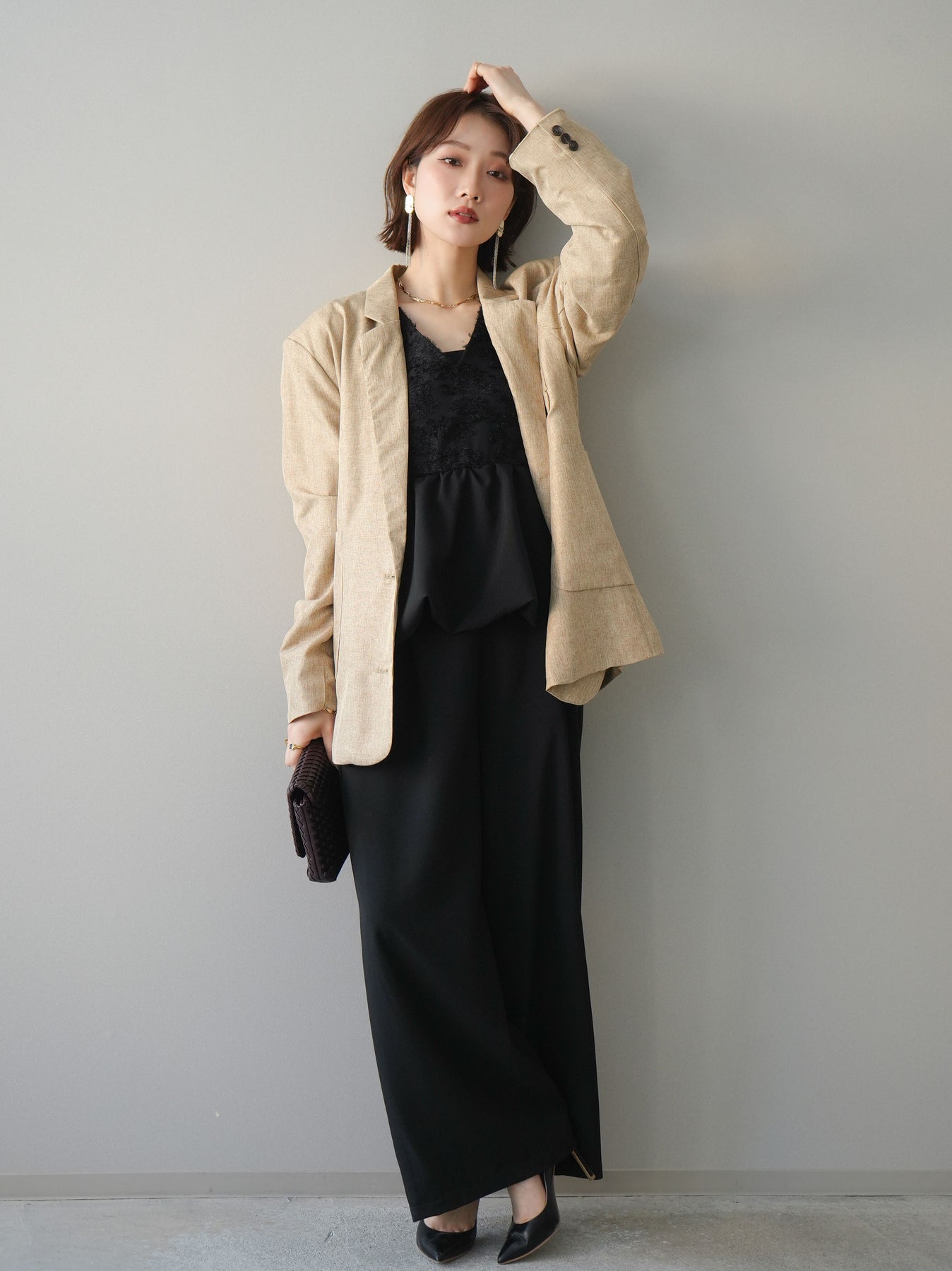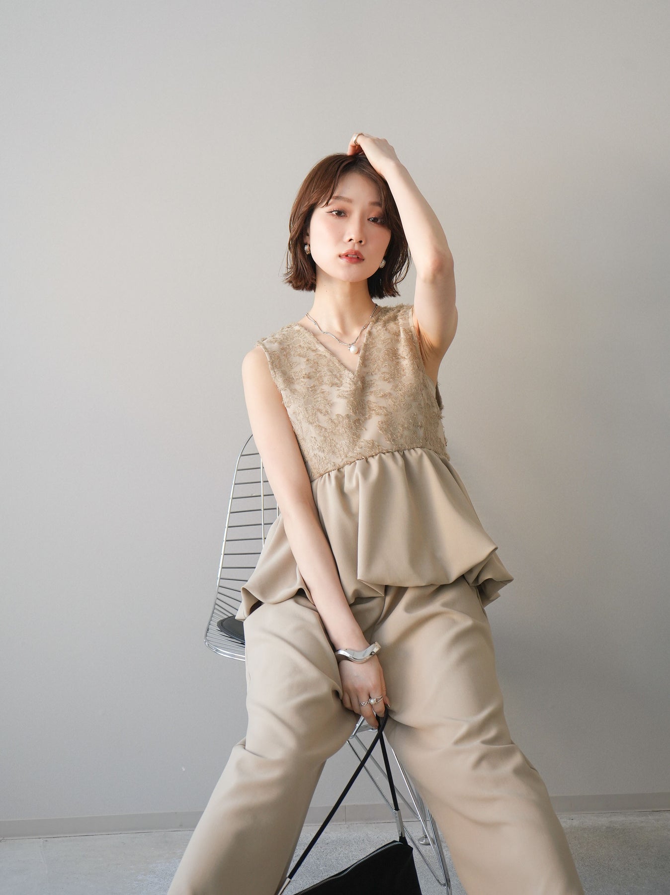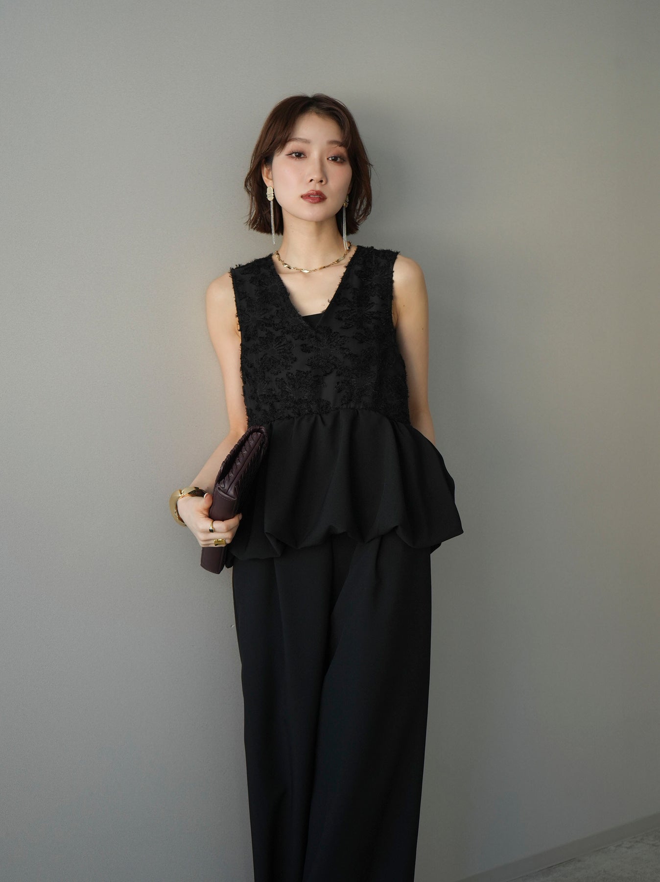 立体感のあるジャガードレースと、なめらかな素材をドッキングしたサロペット。上身頃は繊細なレースが華やかさを演出し、ウエスト切替のぺプラムデザインが自然なメリハリをプラスします。落ち感のあるワイドシルエットで縦ラインを強調し、きれいめながらもリラックス感のある着こなしに。一枚でコーデが完成し、オケージョンからデイリーまで幅広く活躍するアイテムです。 ※ボトムス、キャミソール(インナー)以外の商品は一律でインナーは付属していません